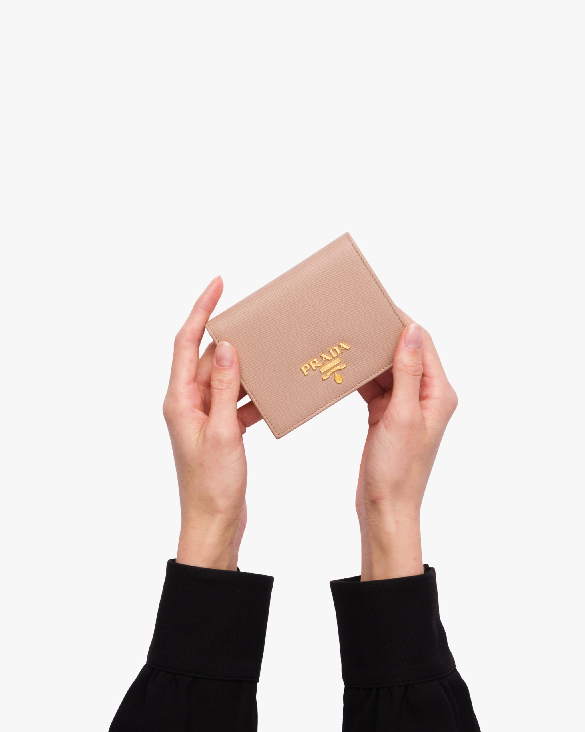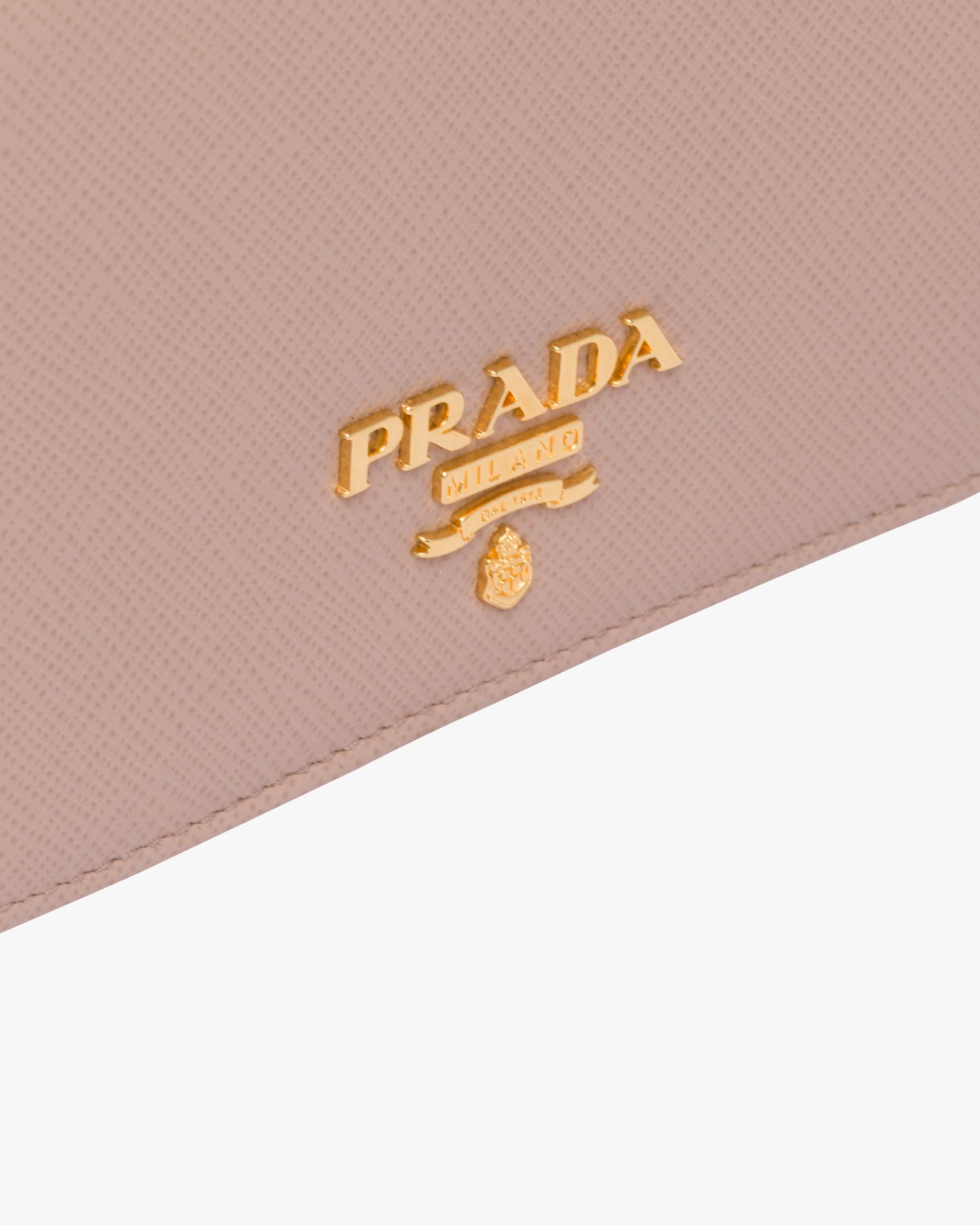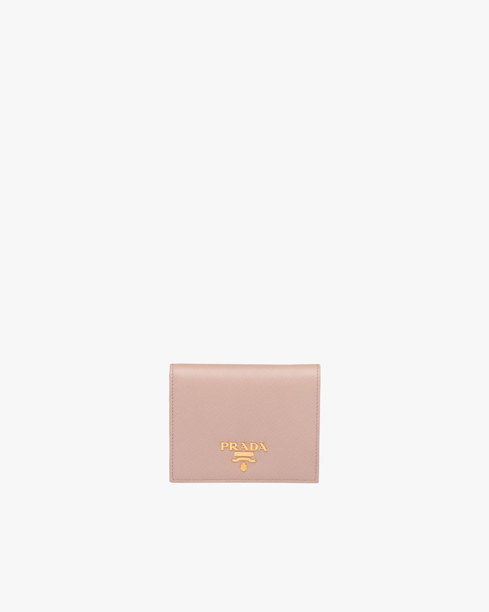 A Saffiano leather bi-fold wallet embellished with gold-toned Prada lettering. The snap closure reveals card slots, a bill compartment and coin compartment, all decorated with a colorful design.