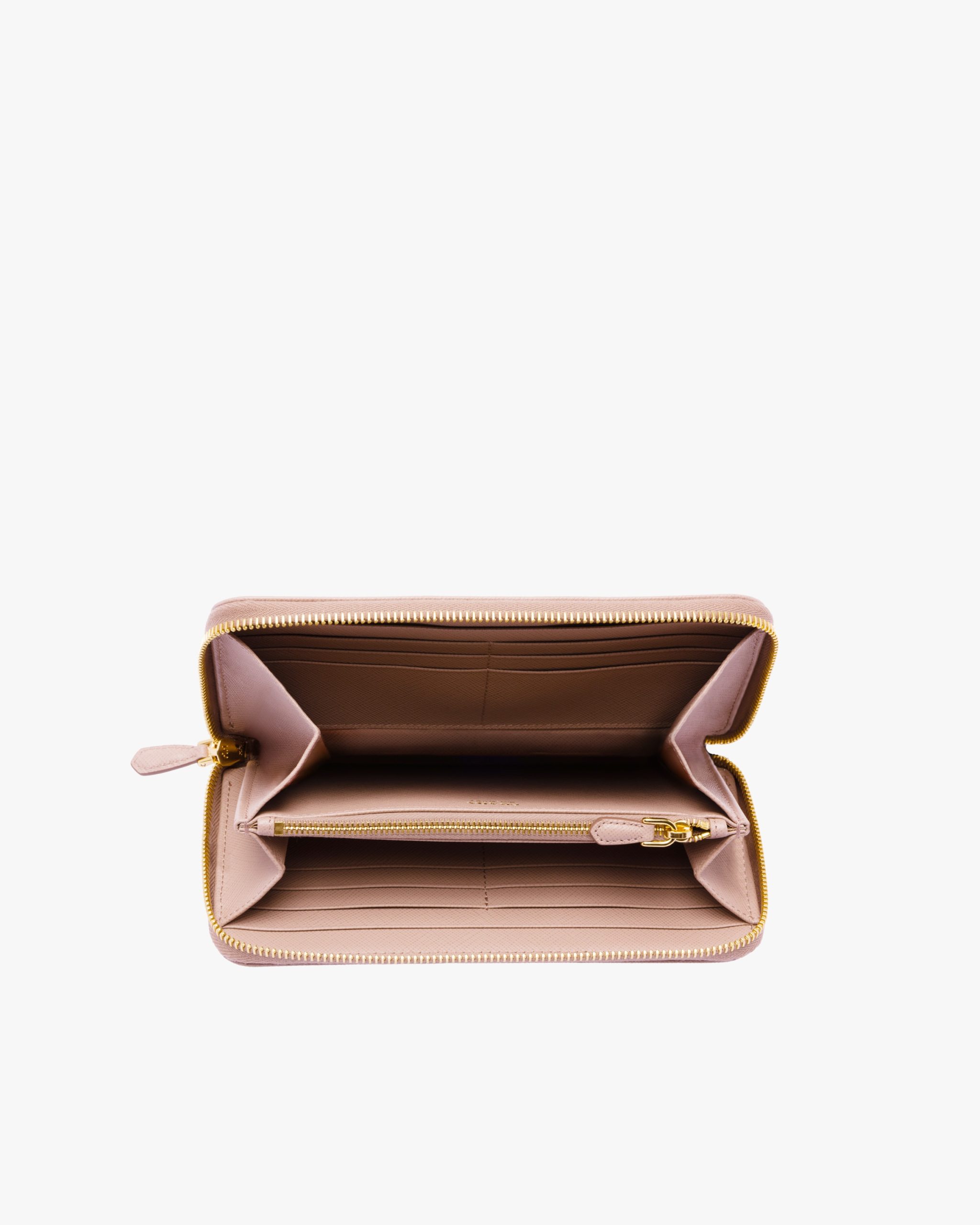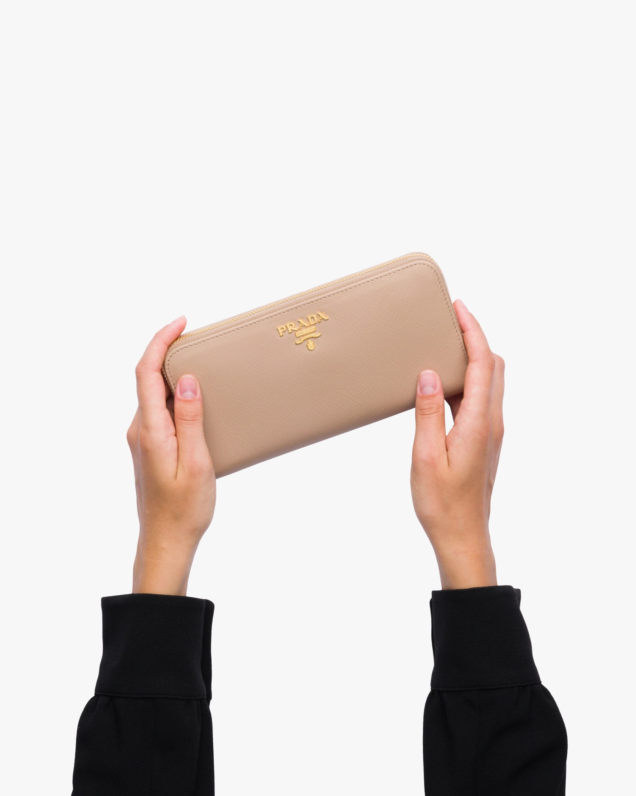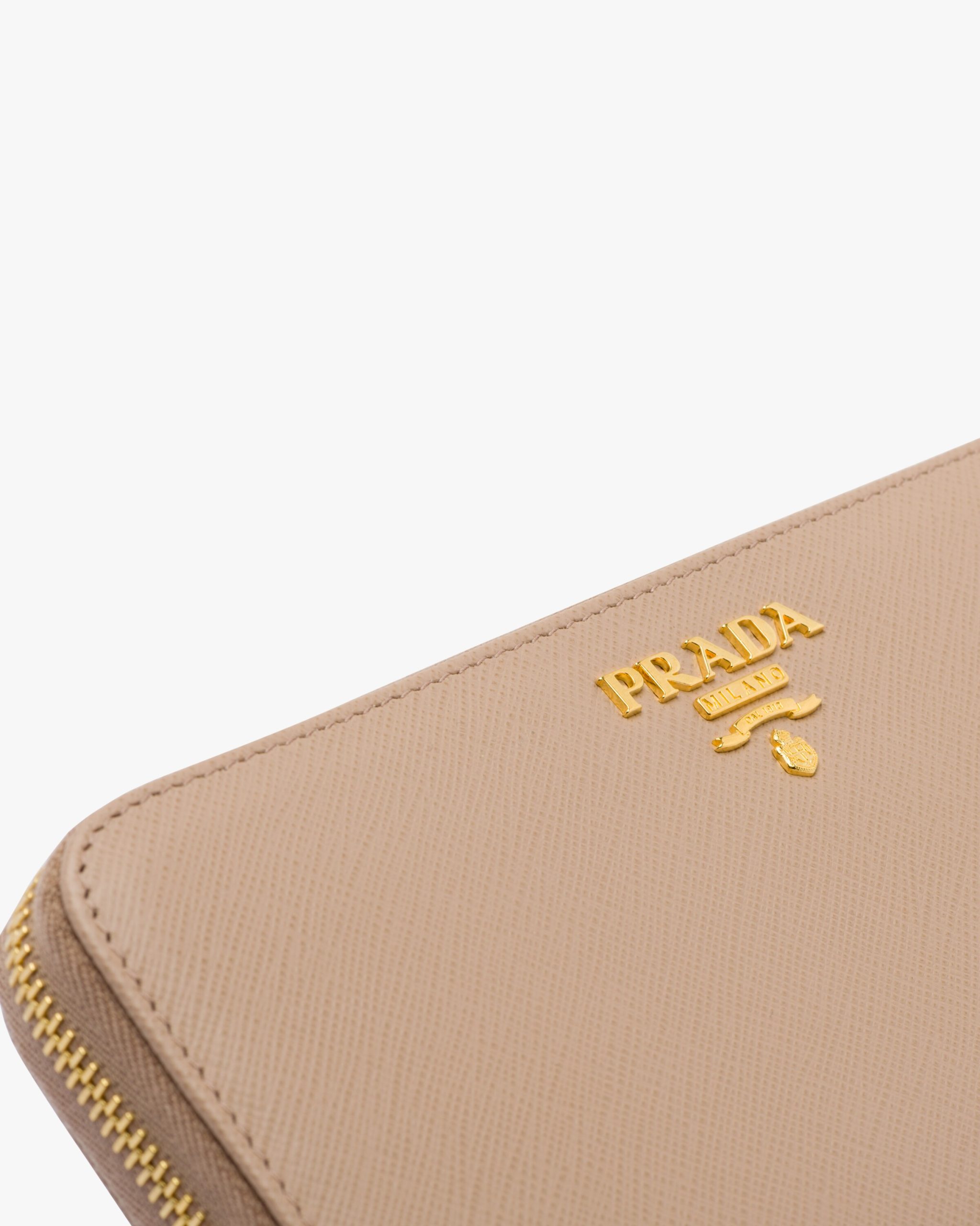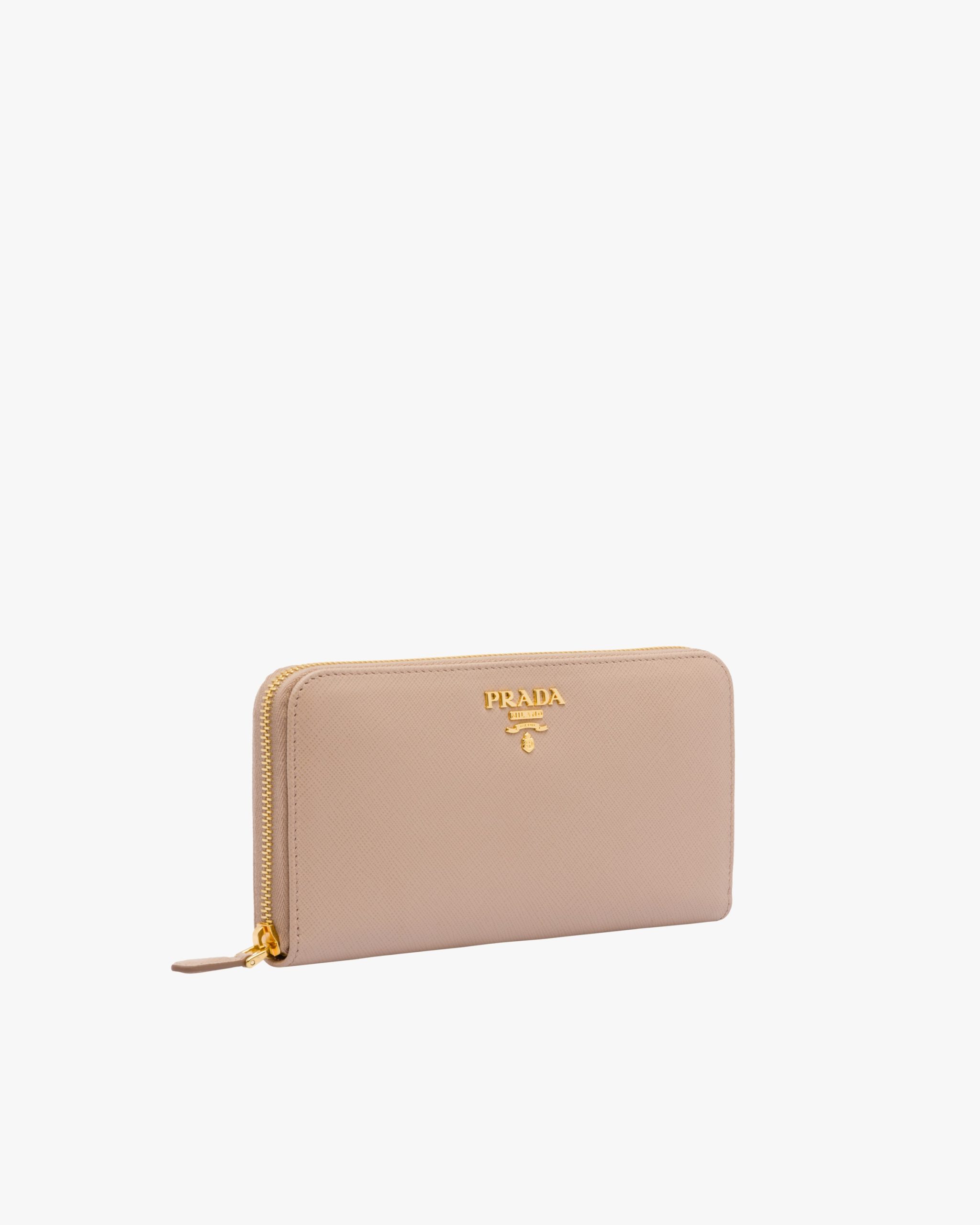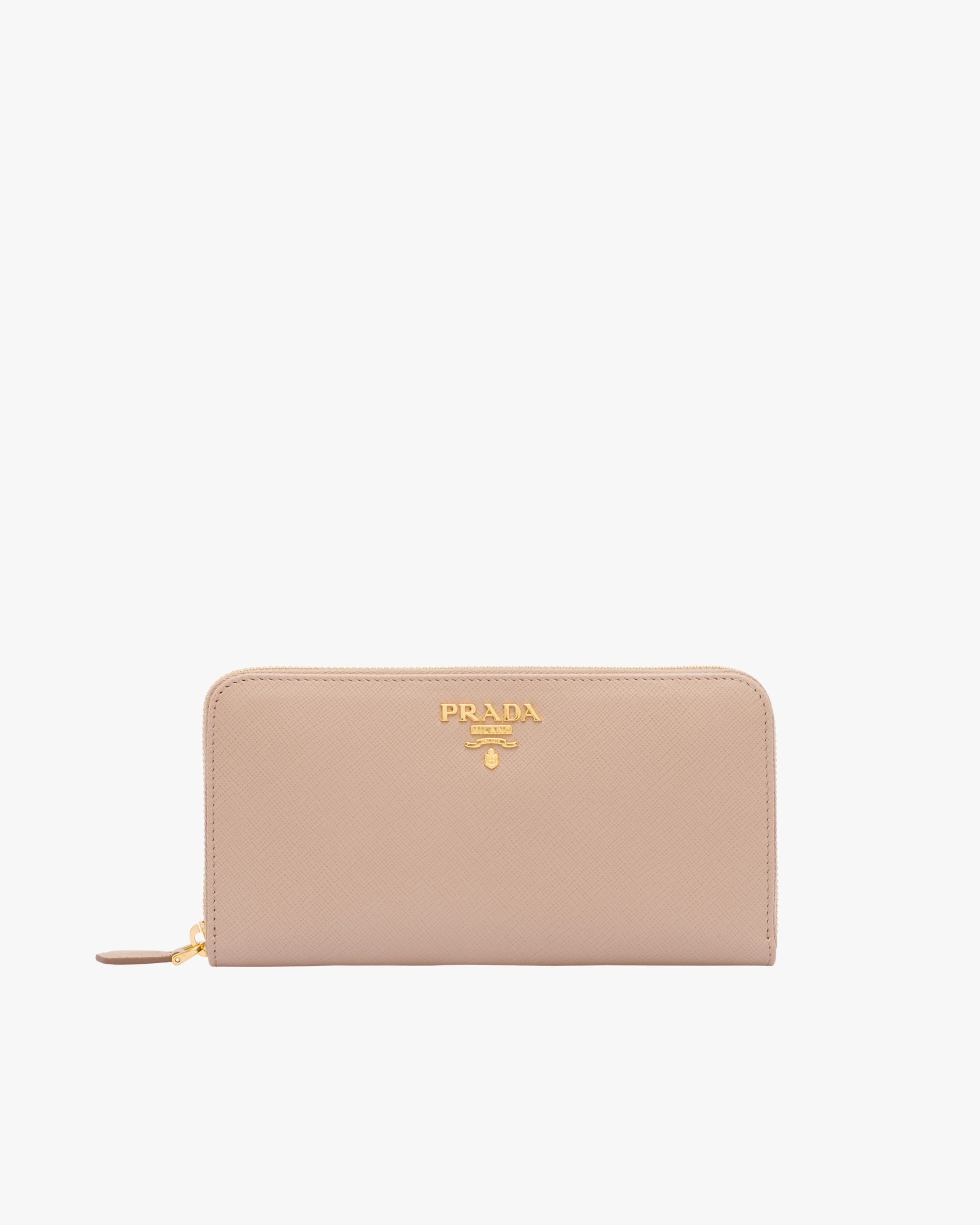 This Saffiano leather wallet is decorated with Prada lettering. The all-round zipper reveals plenty of card slots, pockets and a zippered compartment for coins.