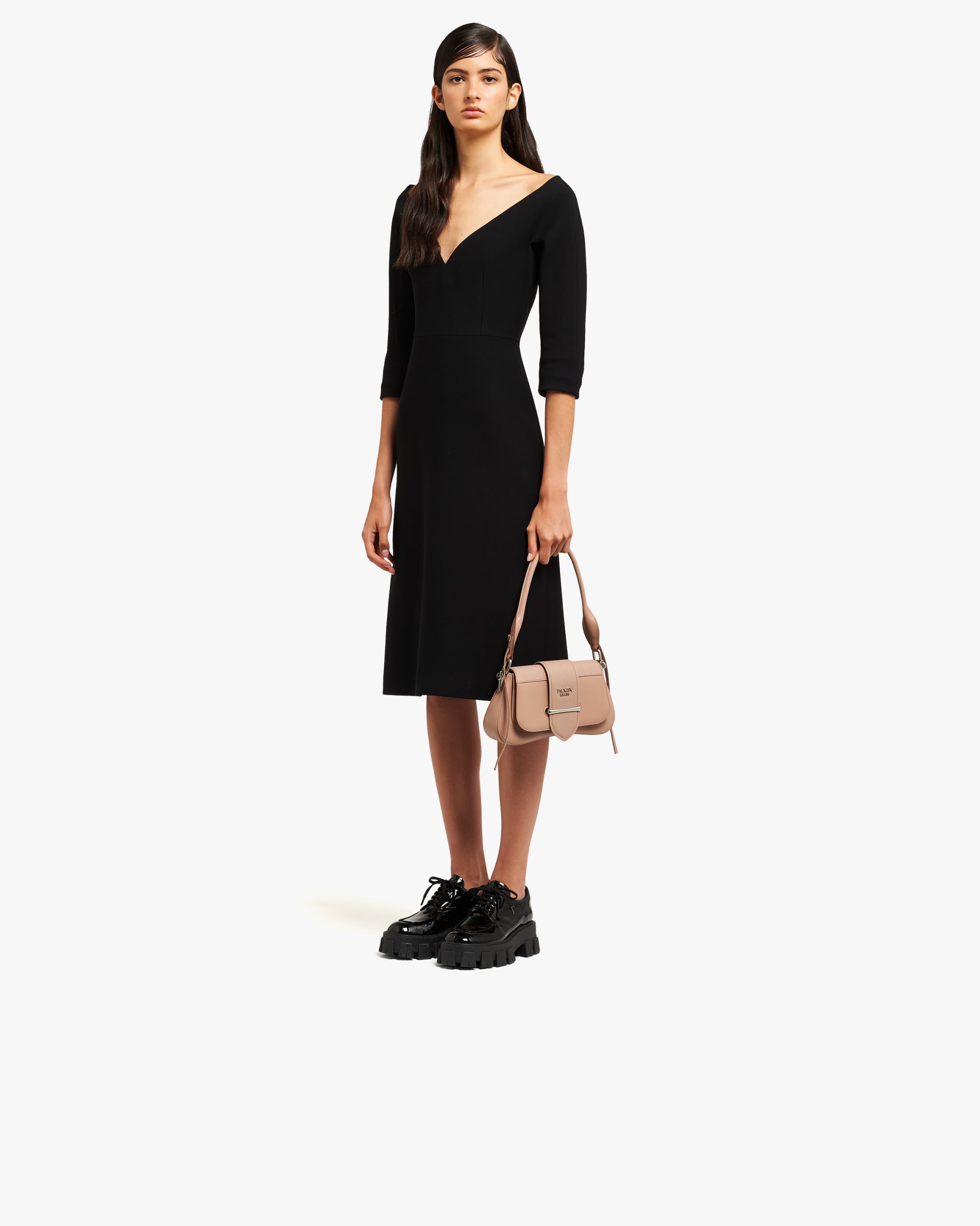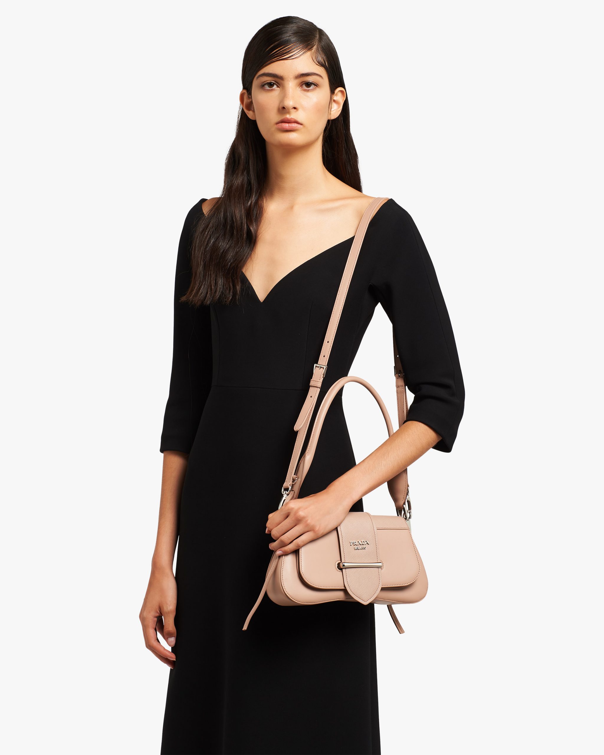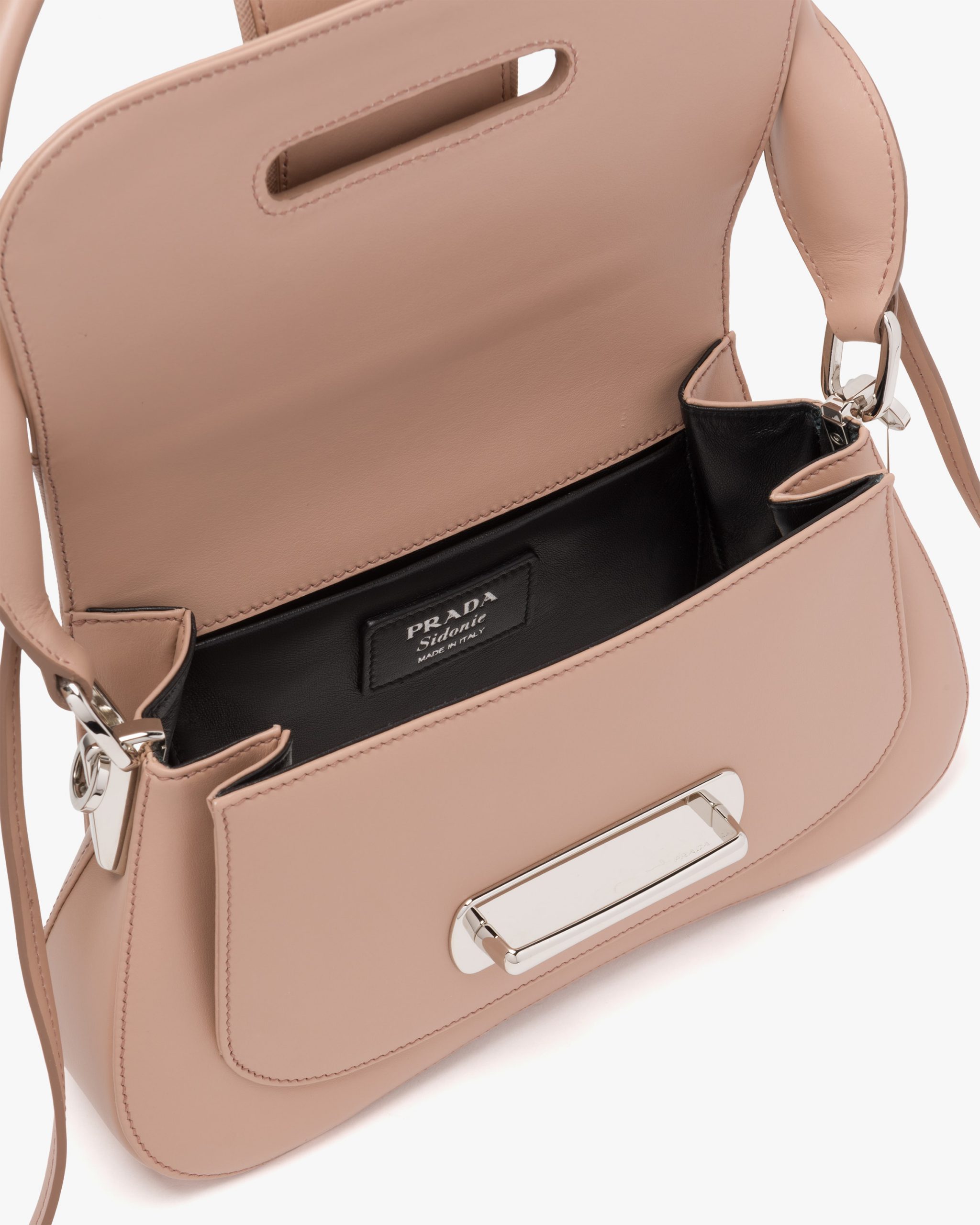 A sinuous line designs the silhouette of the Prada Sidonie bag. Made of leather, it is characterized by the front strap.