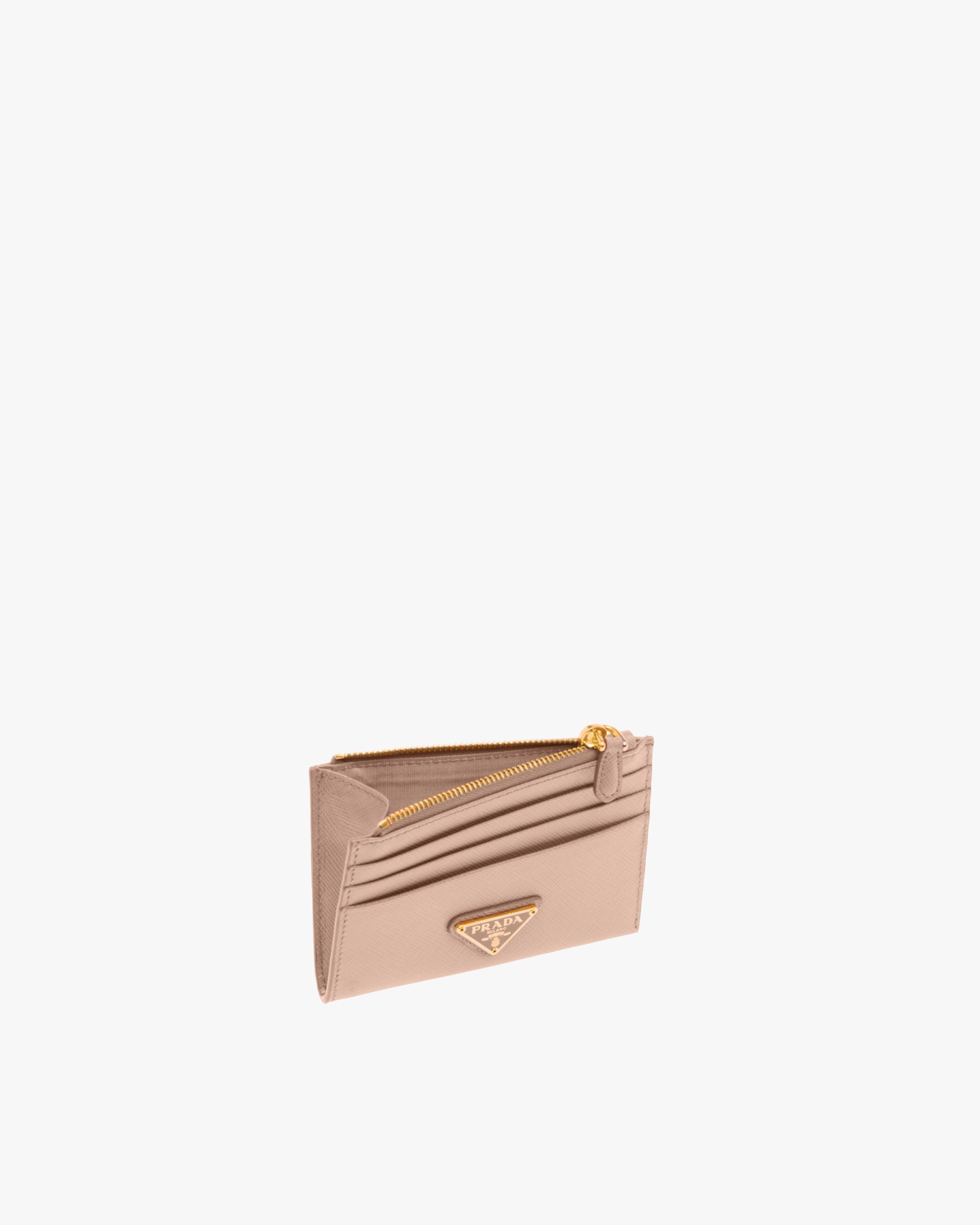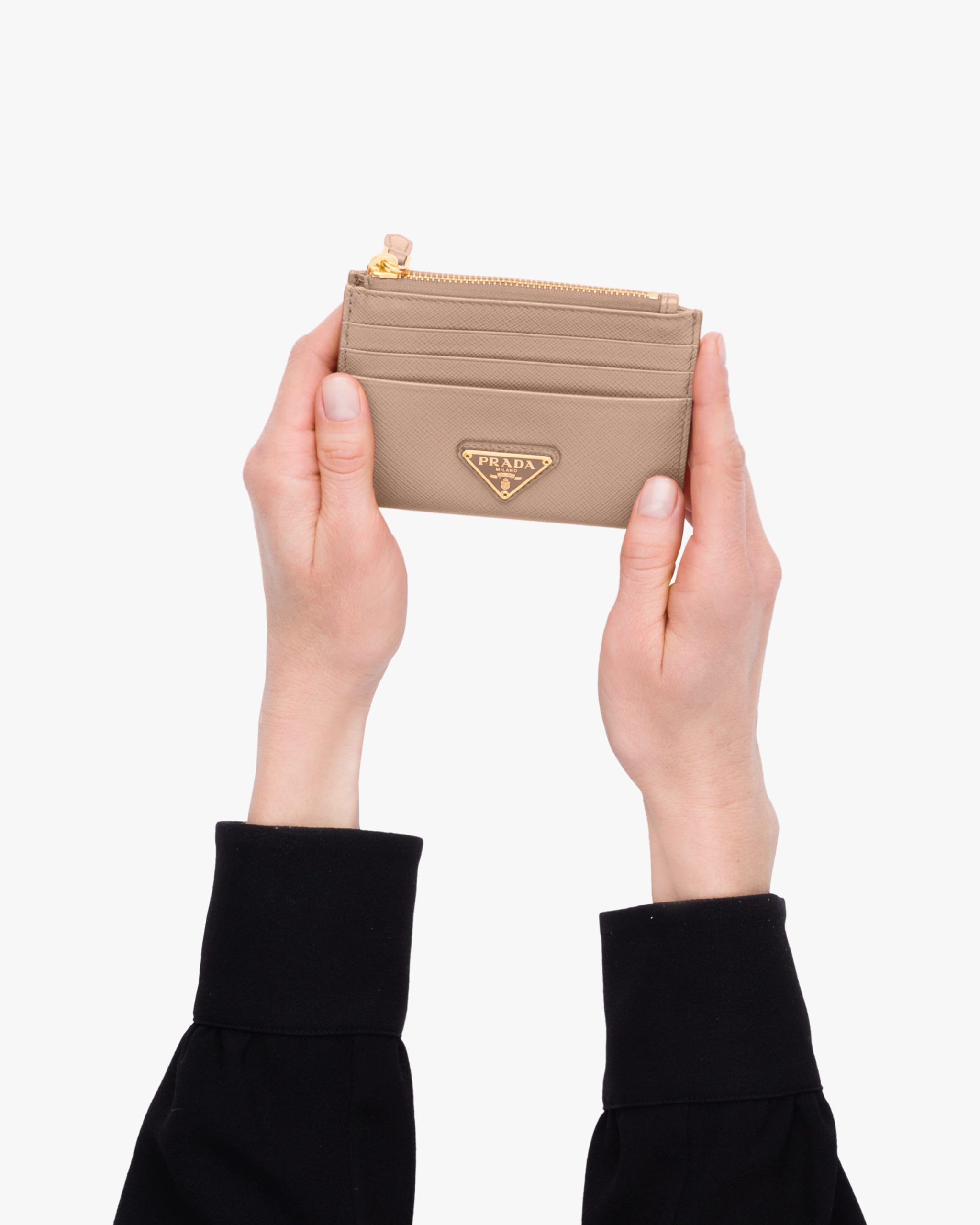 Small and handy, this sophisticated Saffiano leather credit card holder is decorated with the iconic enameled metal triangle logo2.