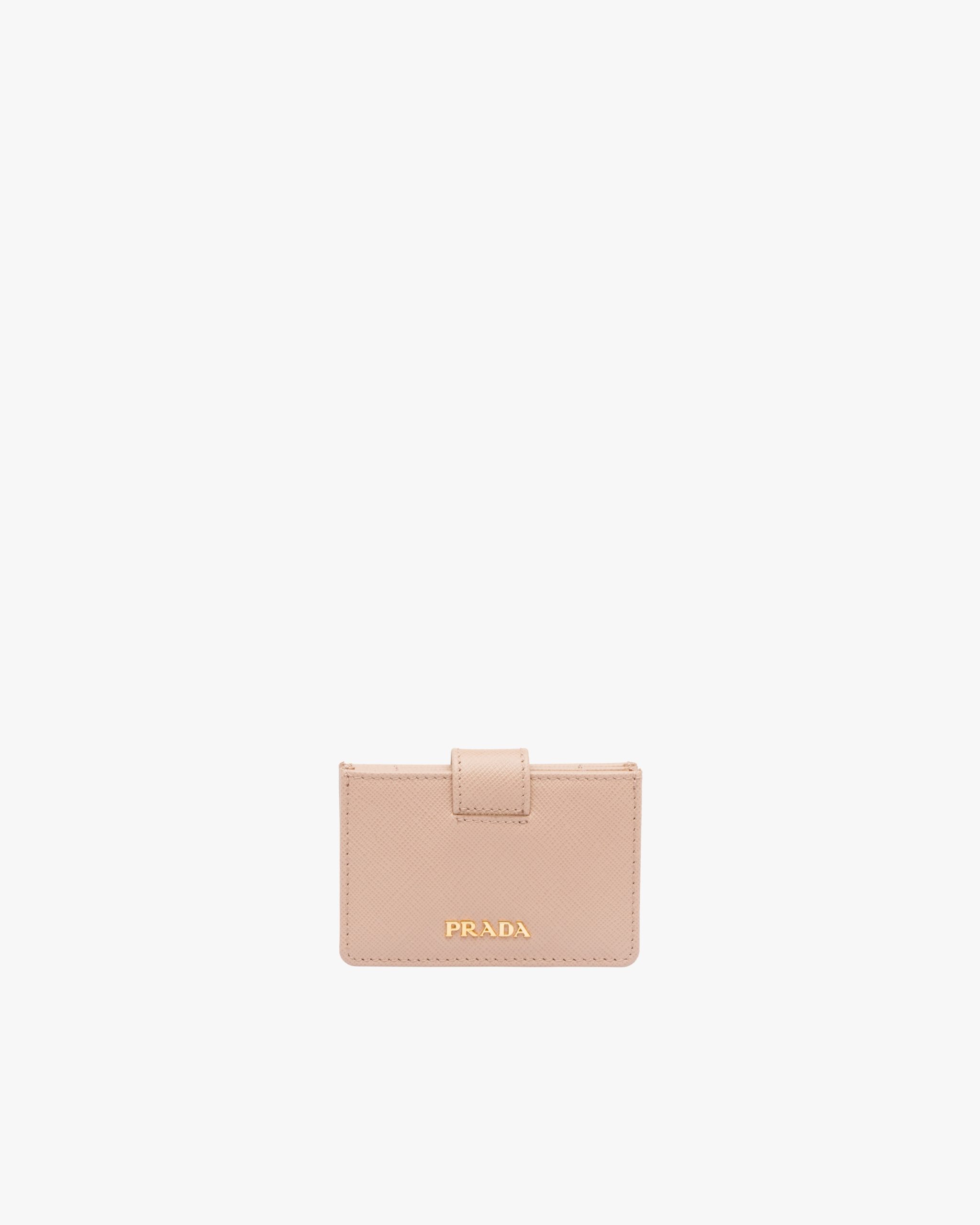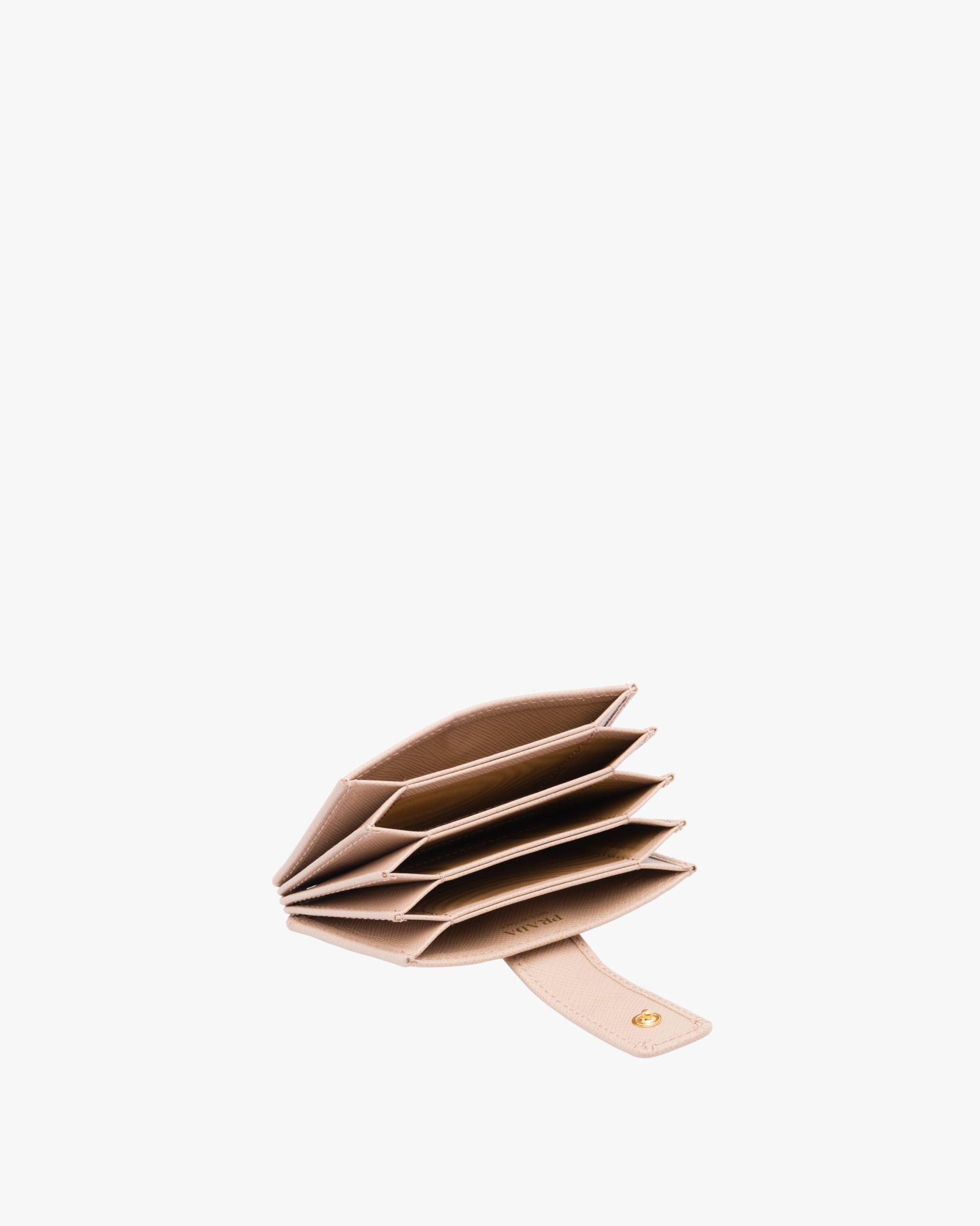A Saffiano leather wallet with gold-finish Prada lettering. The snap closure releases from the back, giving way to five slots with bellow sides for credit cards or tickets.