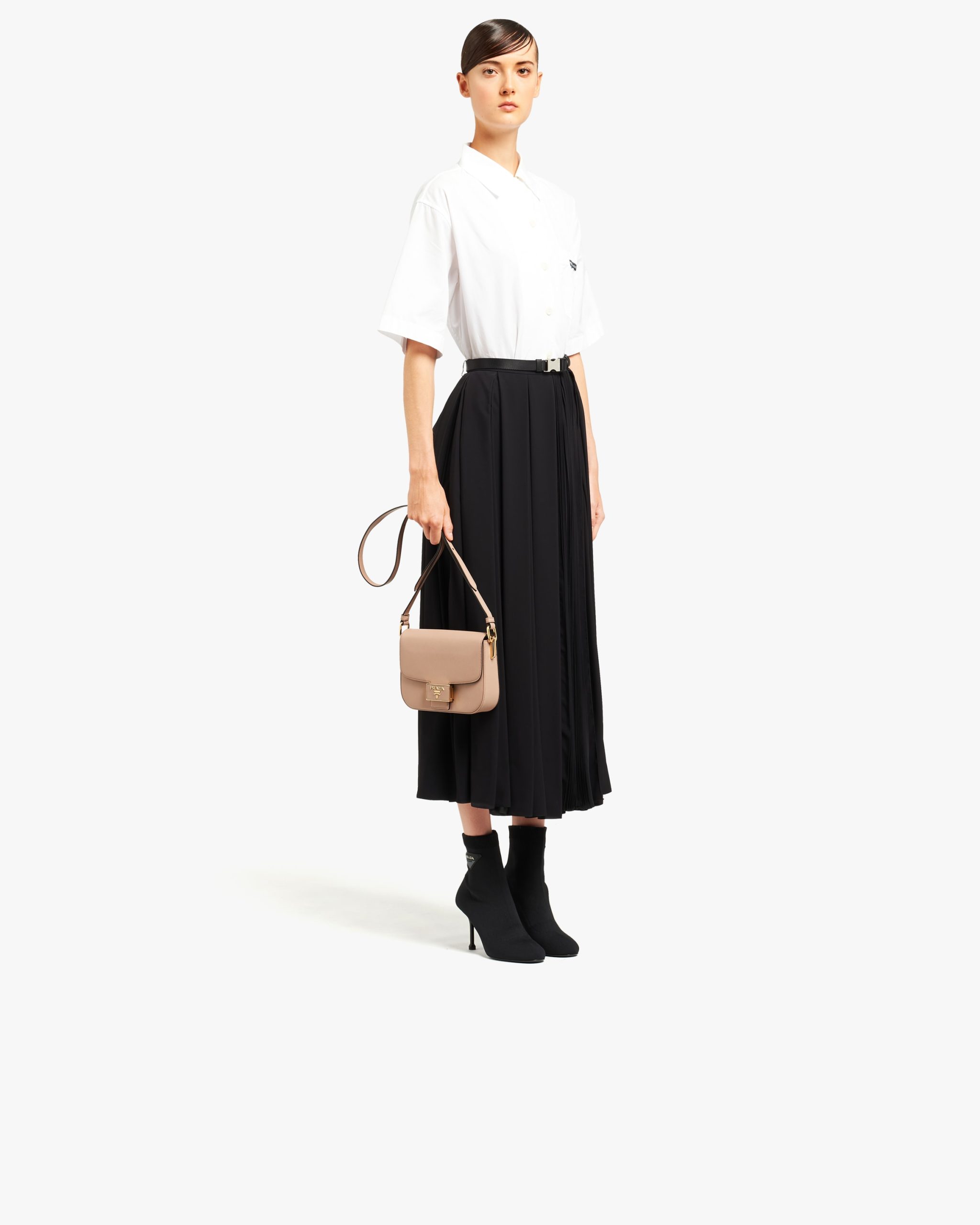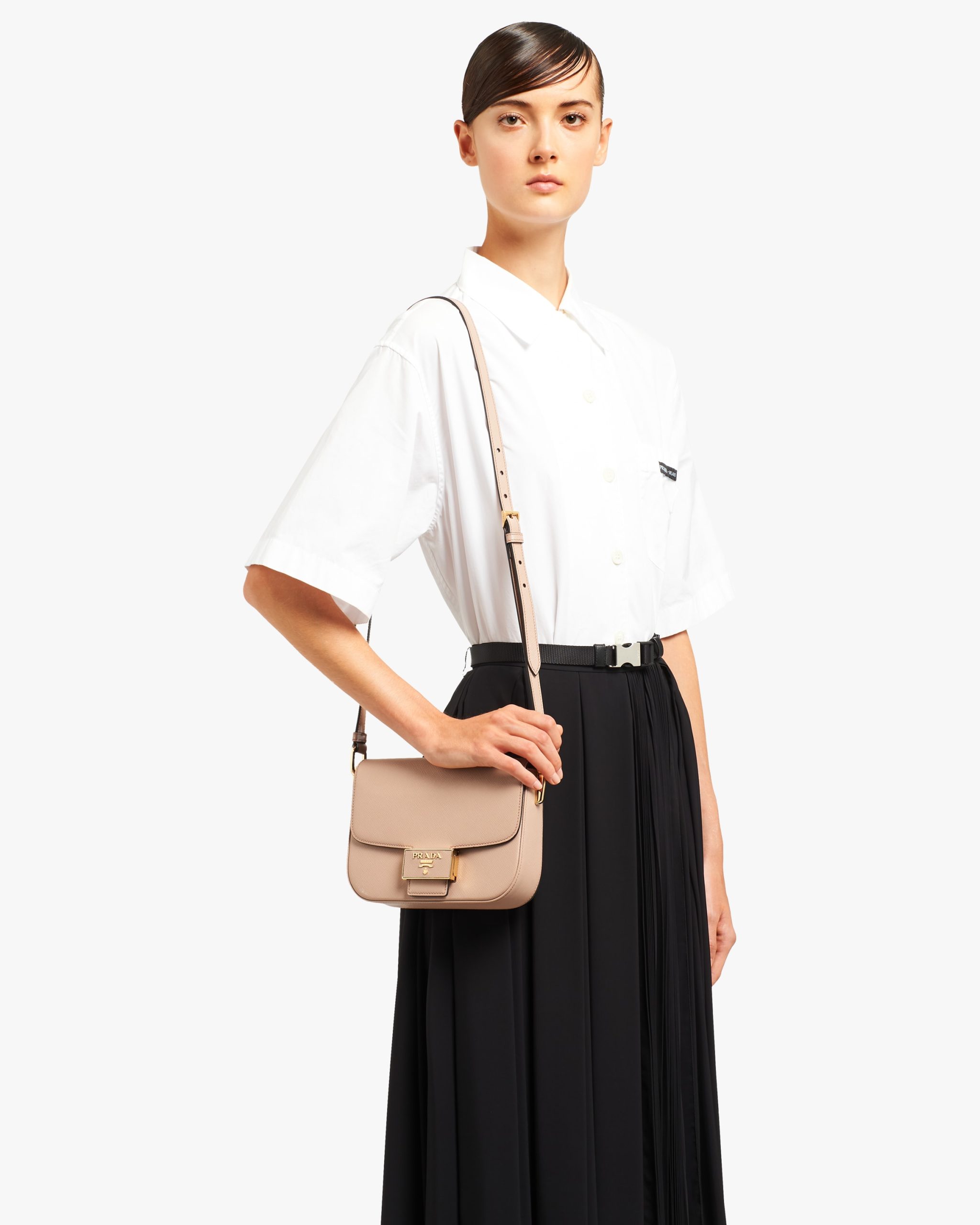 This sophisticated Saffiano leather shoulder bag with minimalist elegance has a distinctive push-lock clasp decorated with the lettering logo2.