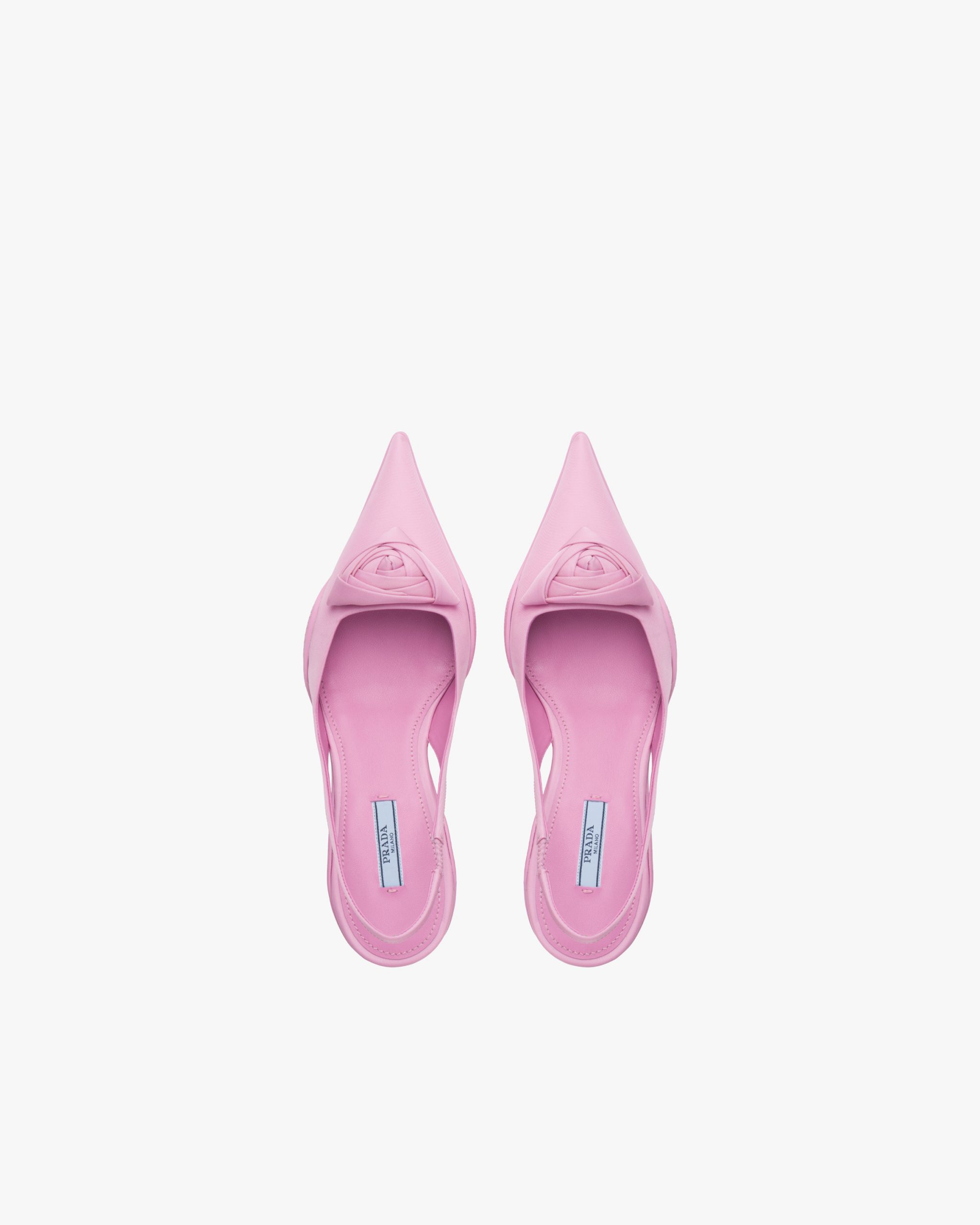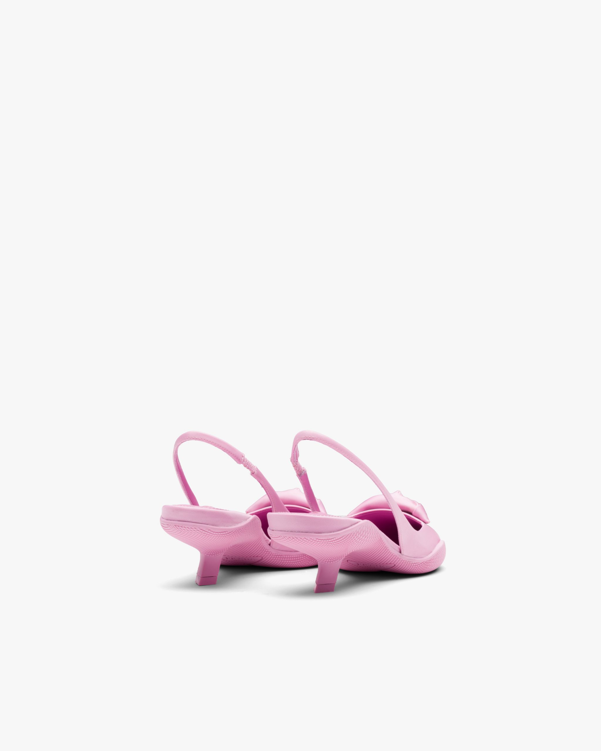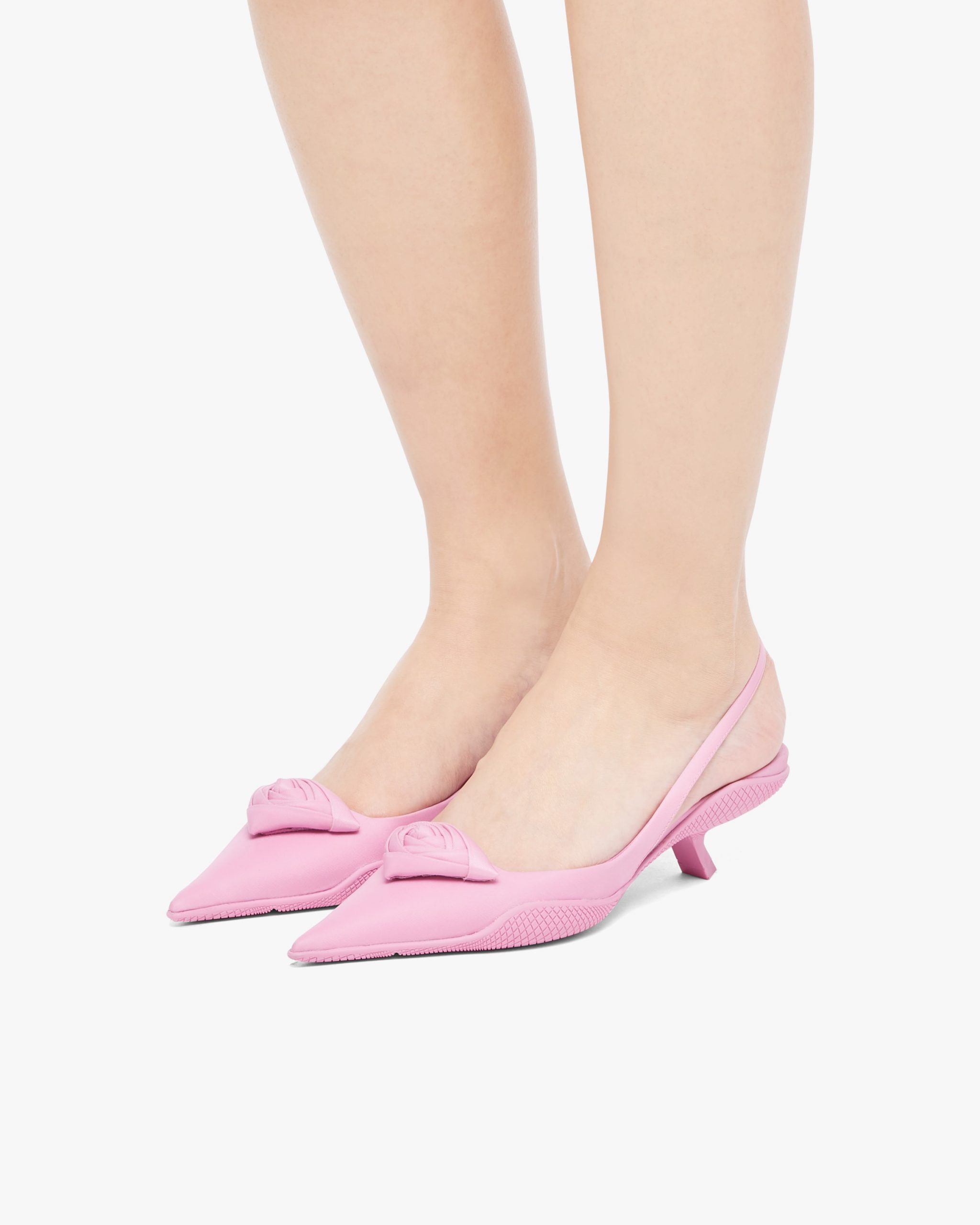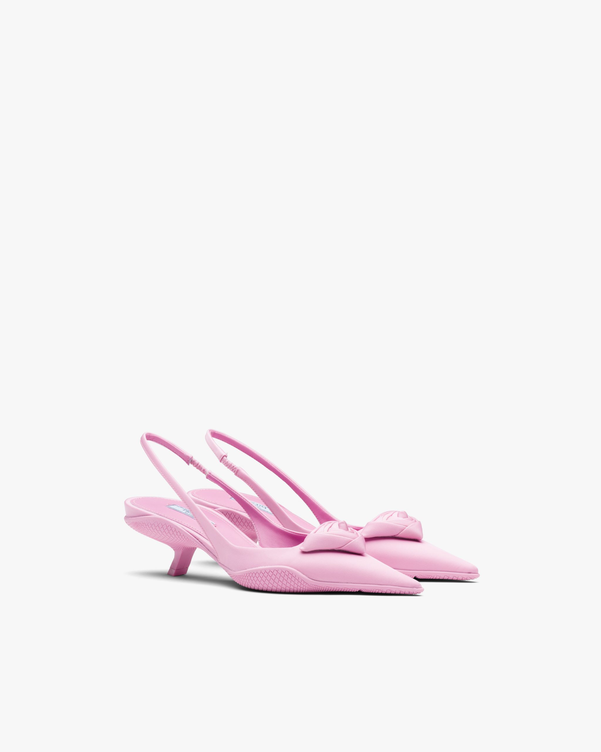 New variations arrive for the iconic triangle, which turns into a handmade rose that is a contemporary take on refined shoe ornaments of the fifties. Revisiting a design from the Prada archives of the ’90s, the rubber shell sole envelops the upper of these nylon gabardine slingback pumps, creating a hybrid silhouette that blends a feminine pointy shape and sporty references. A distinctive element of the Spring Summer 2021 collectsion is the comma heel, inspired by styles from the same decade.