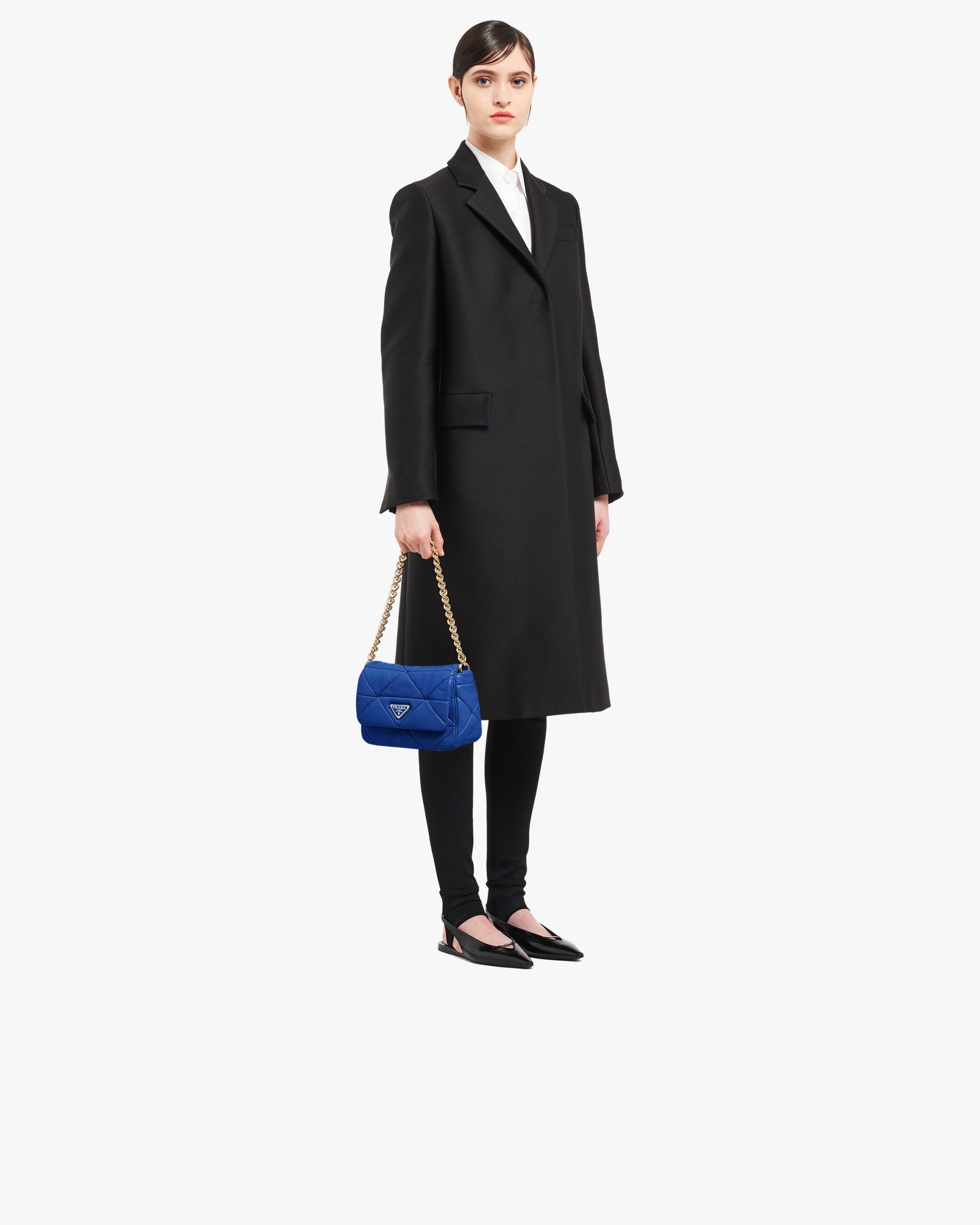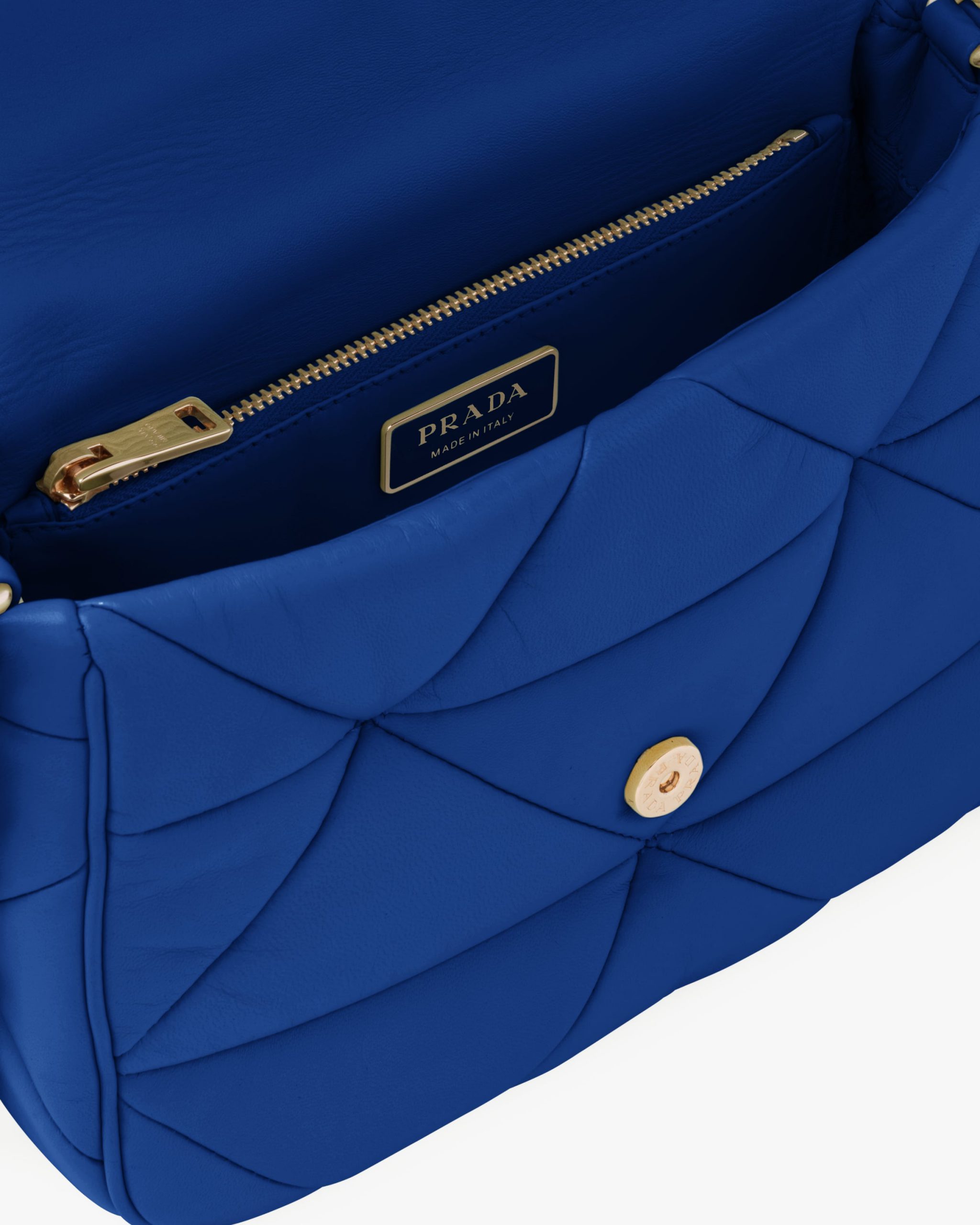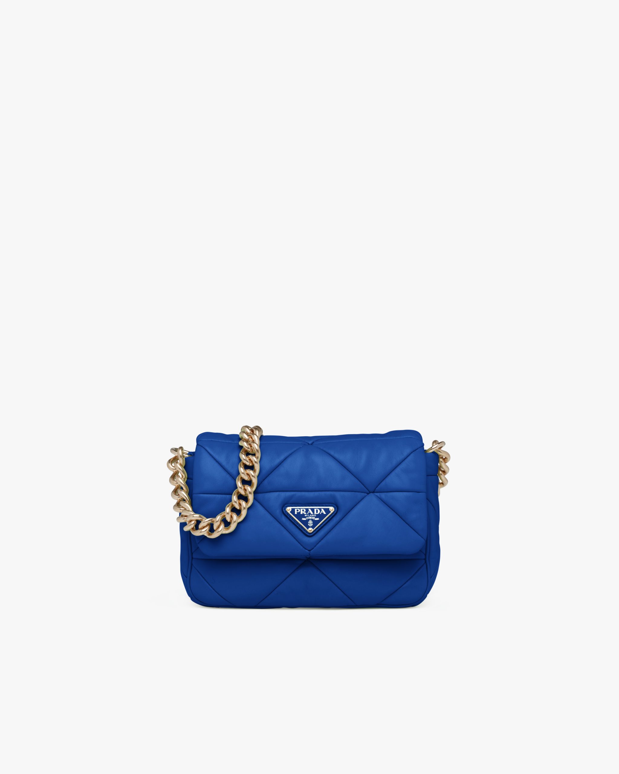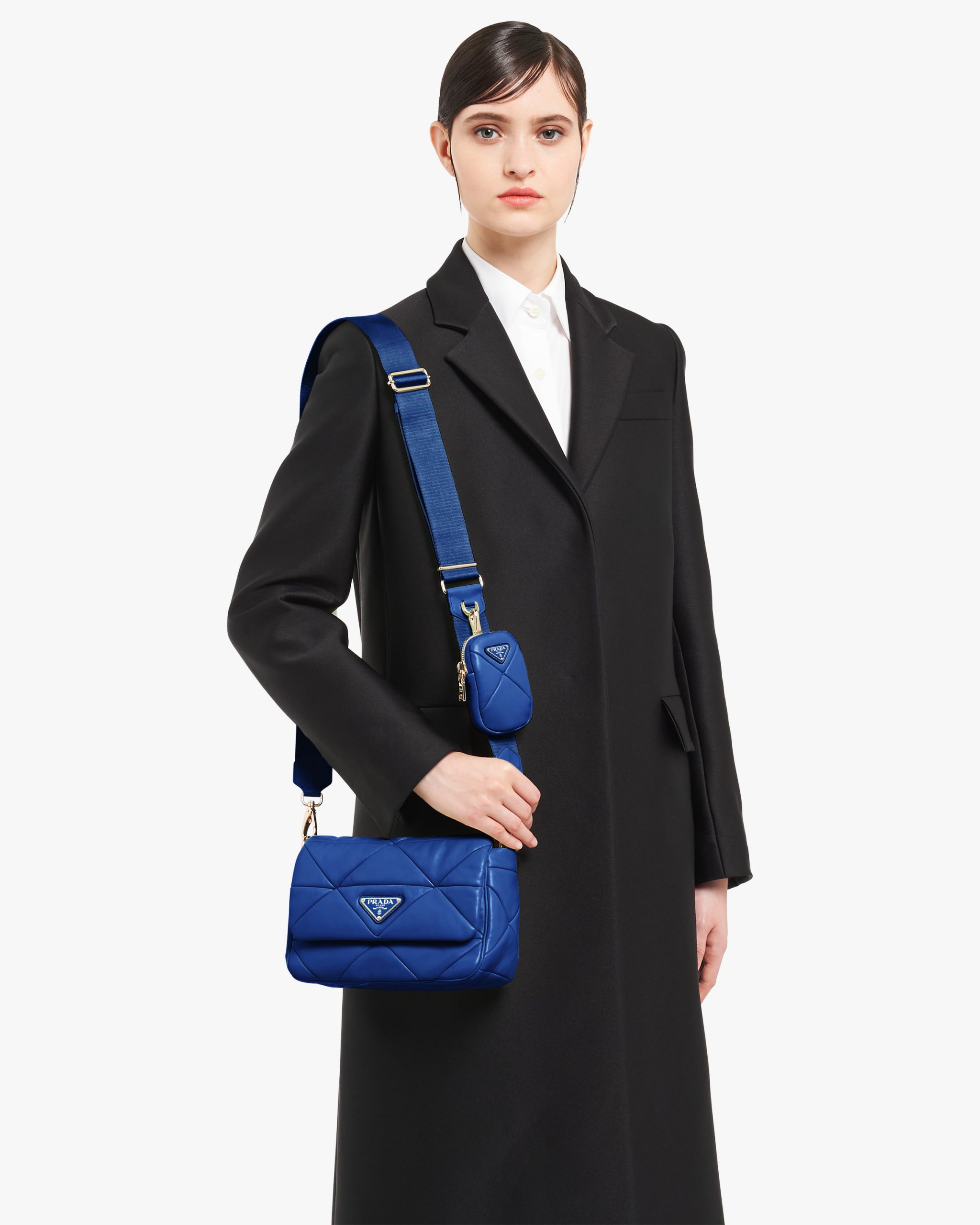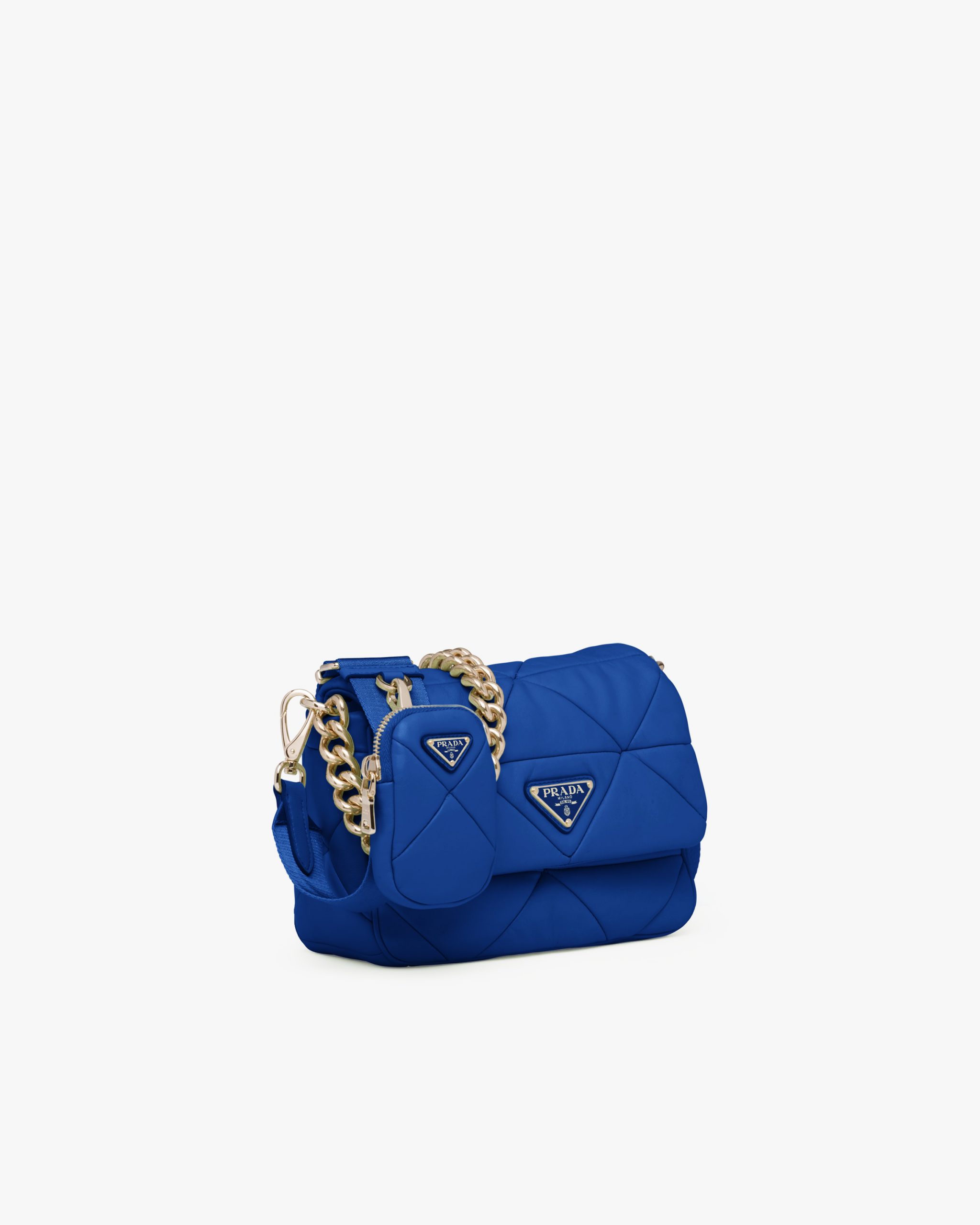 Reinterpreted in always new ways, Prada’s iconic triangle appears in the stitched perforated motif of this shoulder bag in soft leather, creating a patchwork pattern. A removable mini-pouch, a distinctive element among the brand’s accessories, completes the shoulder bag and adds a contemporary, versatile note to the style.