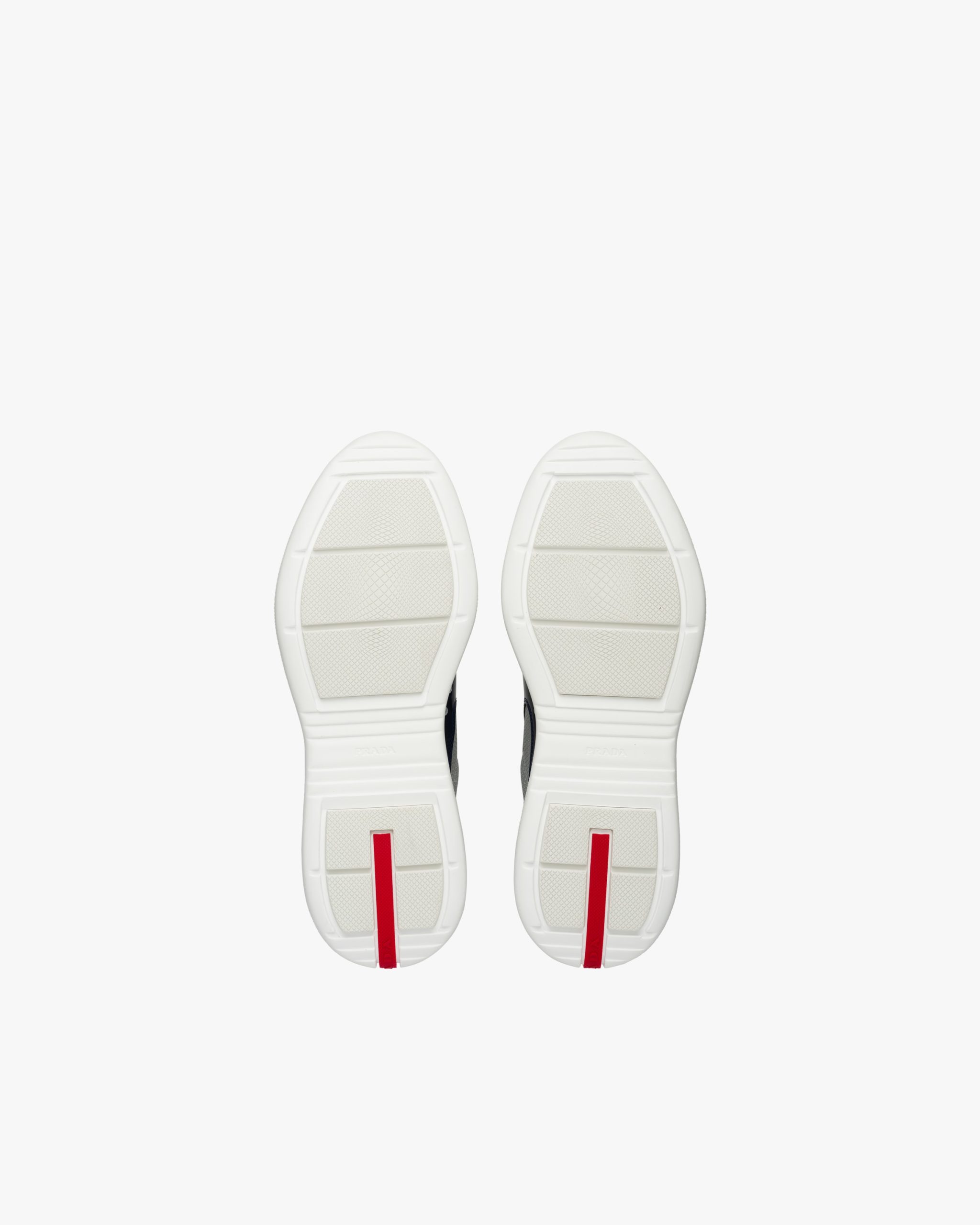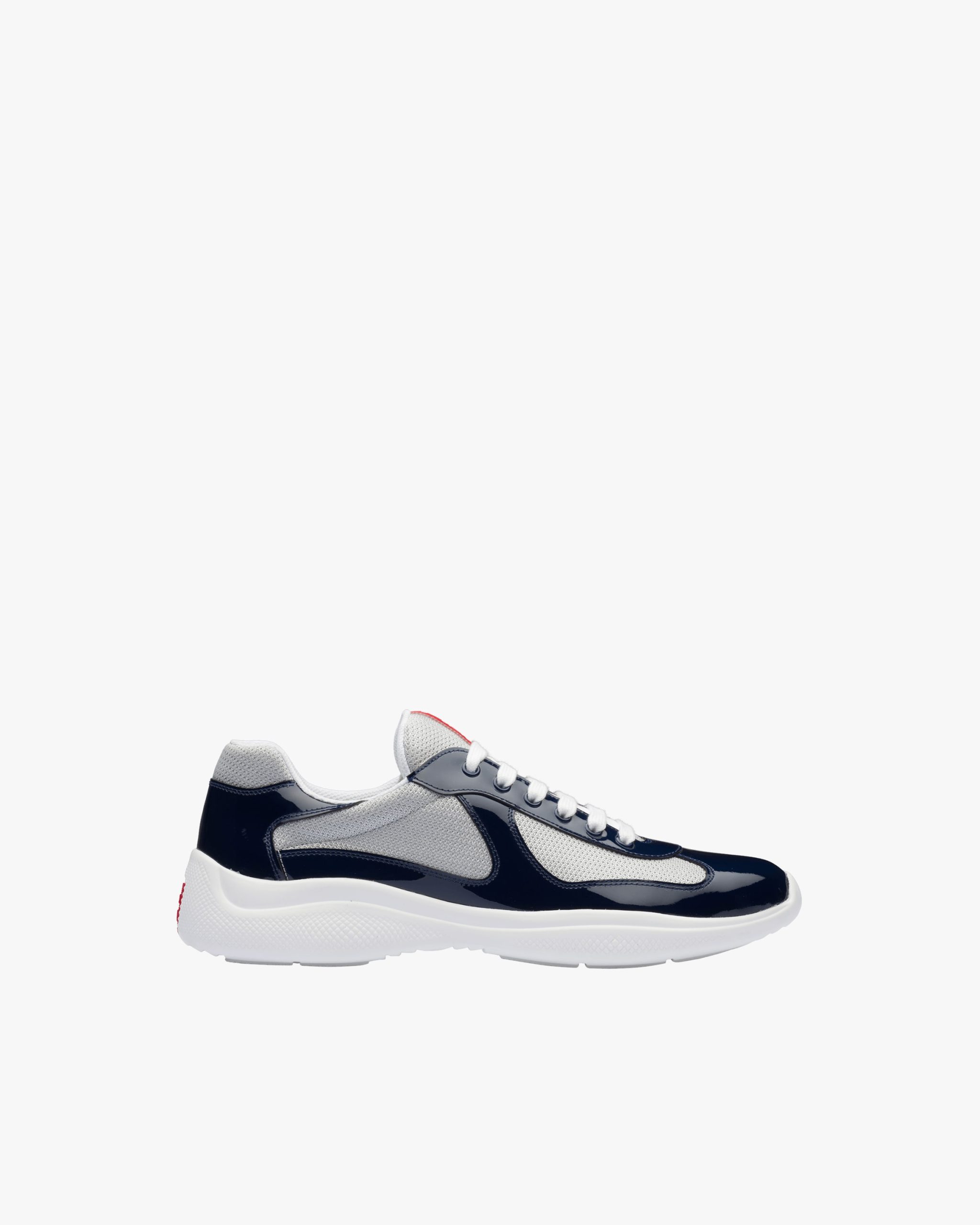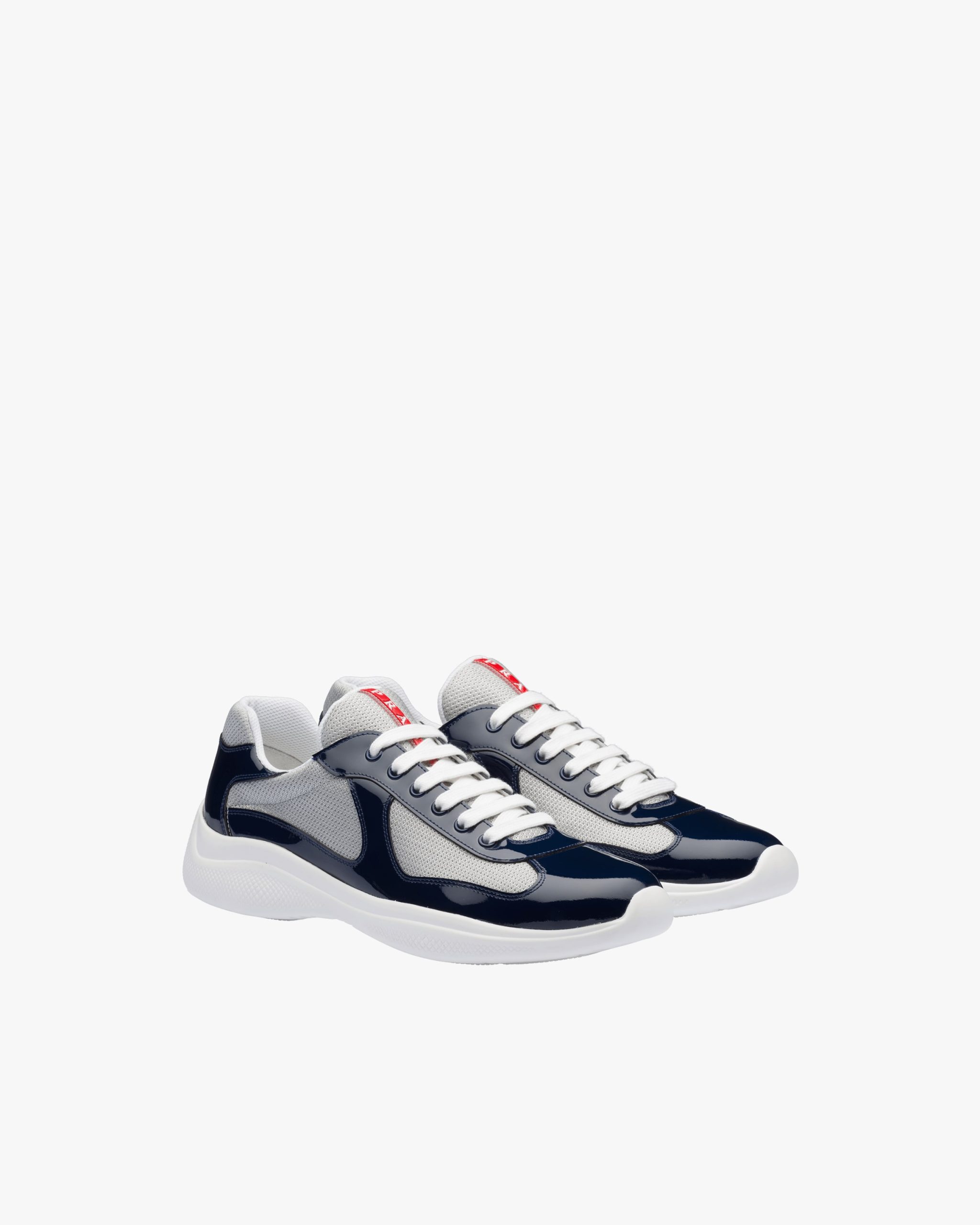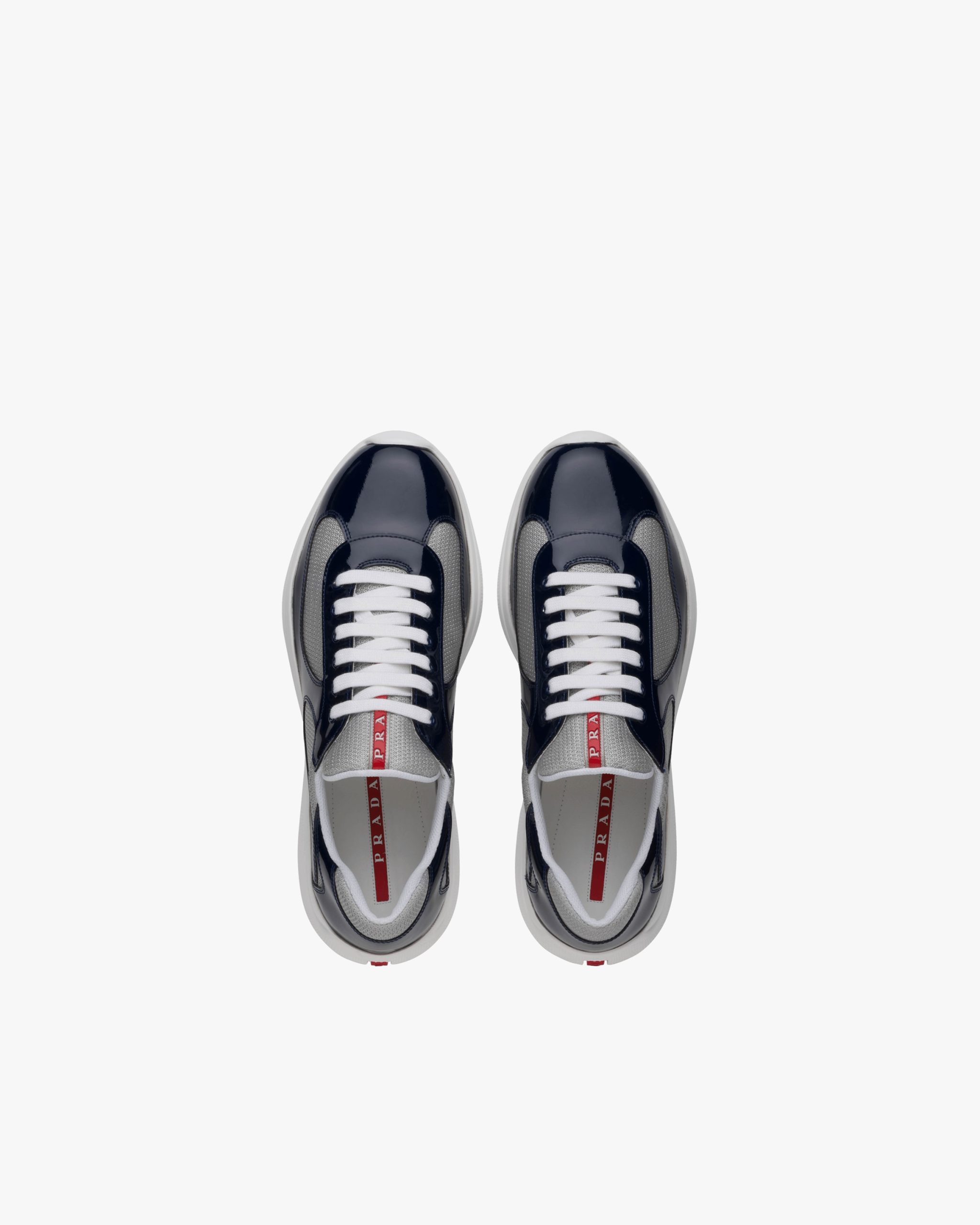 These patent leather sneakers with bike fabric inserts are inspired by an iconic aesthetic. The unmistakable Prada Linea Rossa logo2 on the tongue and sole enhances the design.