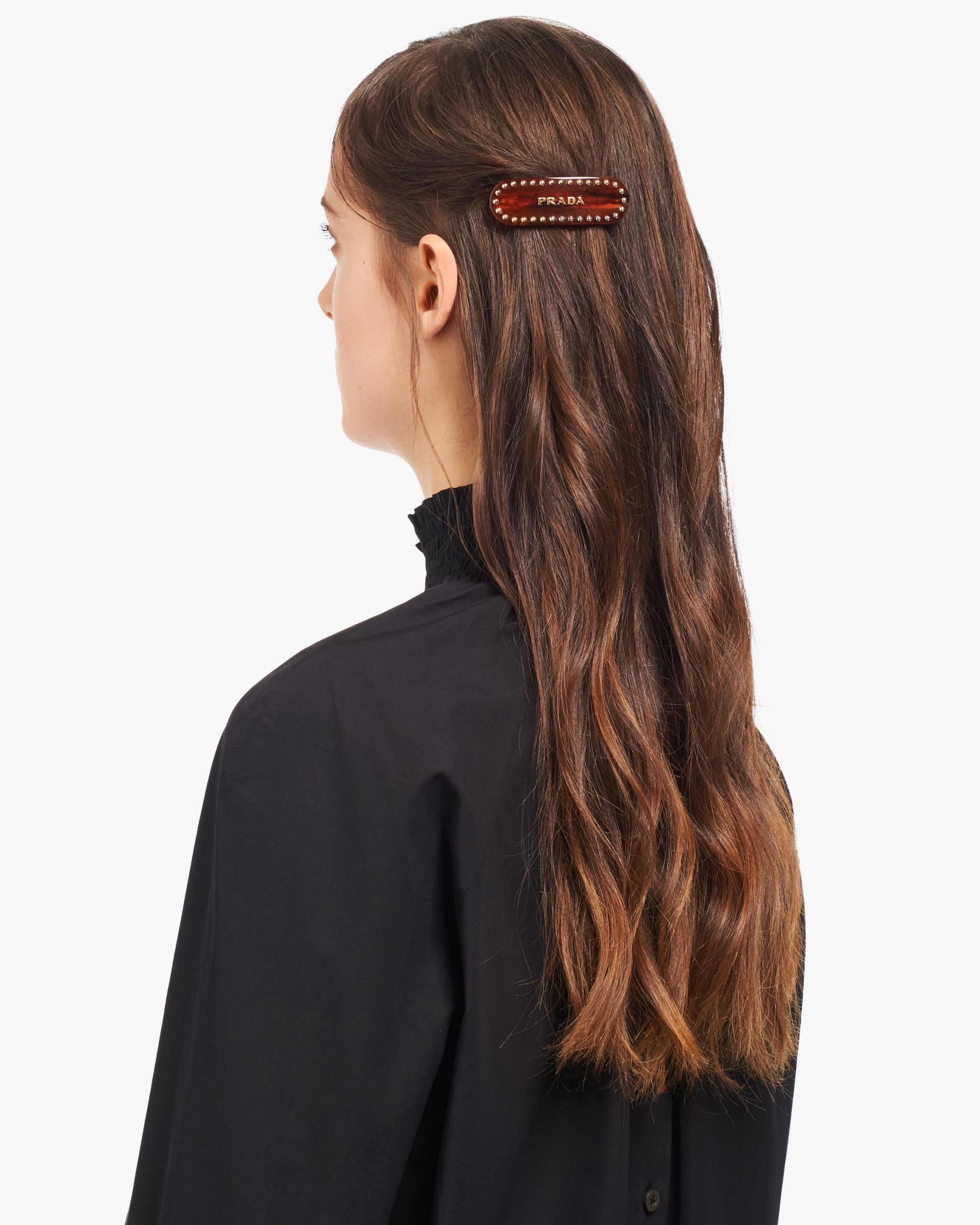 This hair clip is decorated with the Prada logo2 and has metal studs.