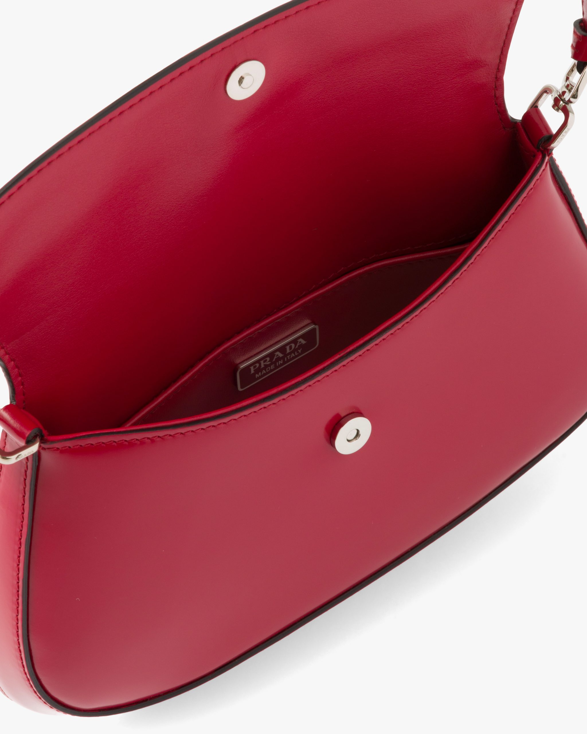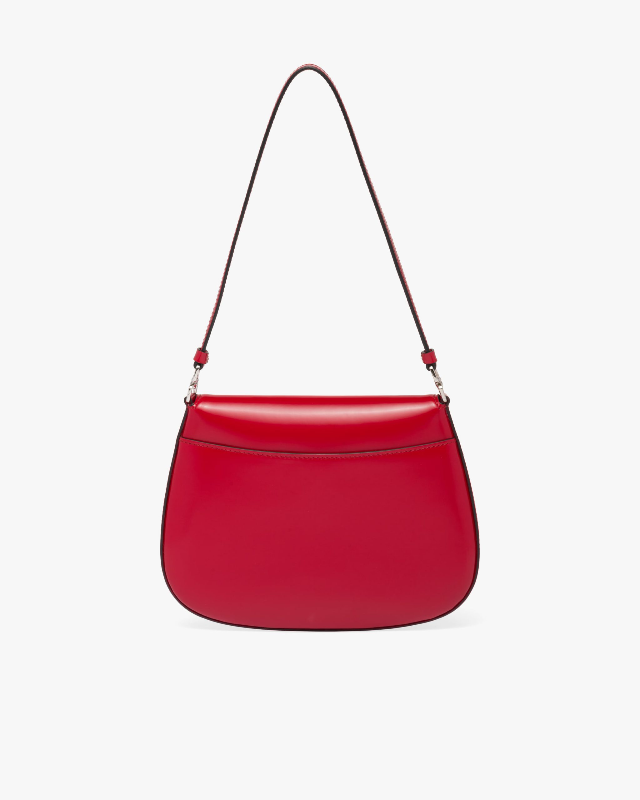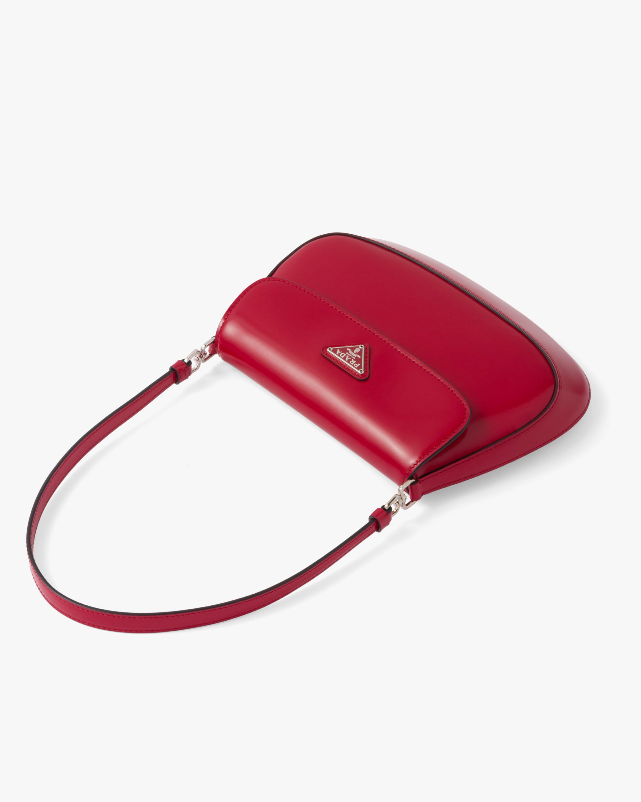 The Prada Cleo bag with sophisticated allure reinterprets an iconic design of the brand from the 1990’s. Sleek curved lines emphasized by the particular construction rounded on the bottom and sides give this flap bag a soft, light look. Brushed leather, a modern and versatile material that is distinctive in Prada collectsions, is ideal for creating always new combinations and contrasts. The enamel triangle logo2 decorates the silhouette.