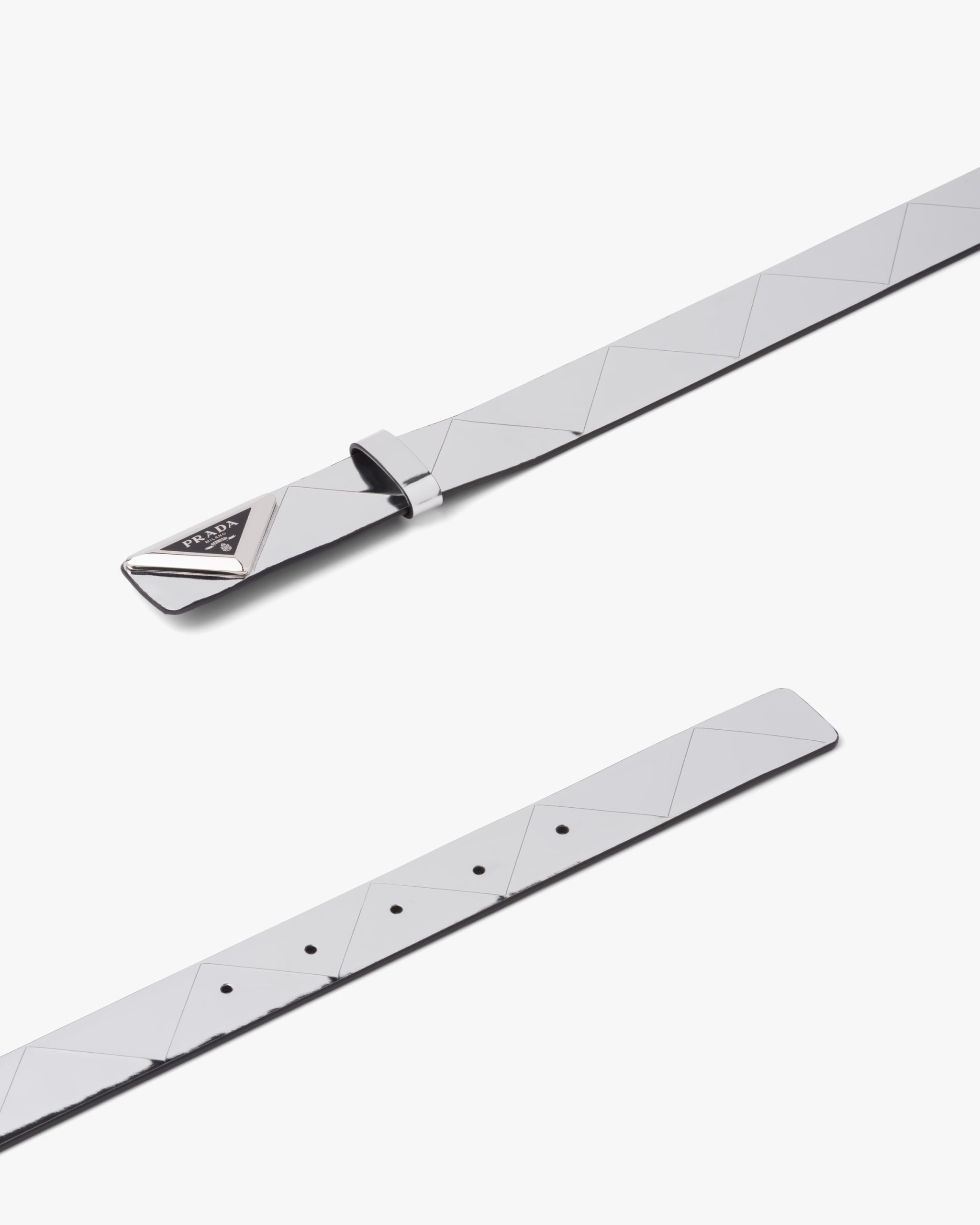 A mix of stylistic codes comes together in this belt with modern allure. A new triangle motif enhances the iconic brushed leather, creating elegant reflections. The refined buckle with enameled metal logo2 decorates the accessory.
