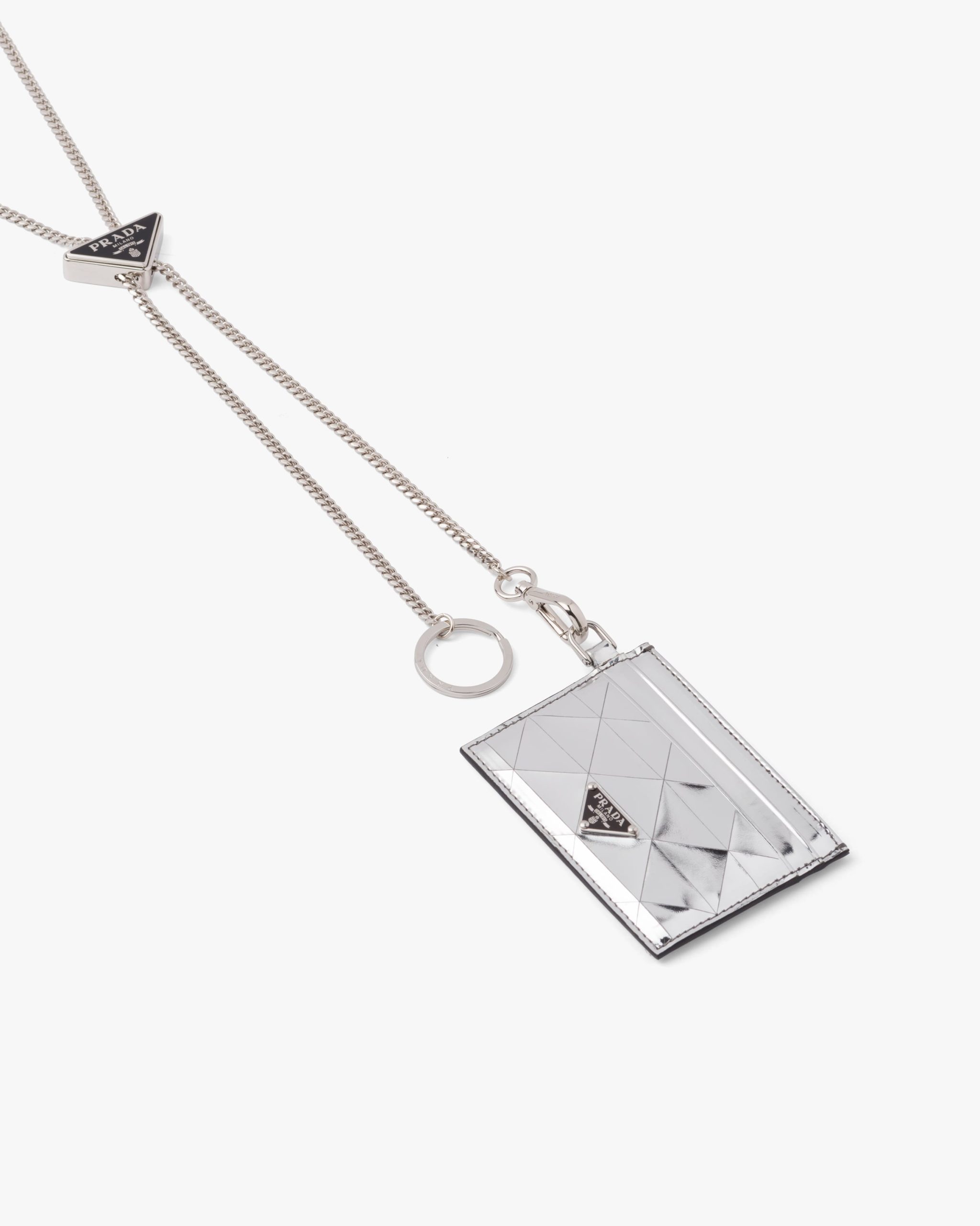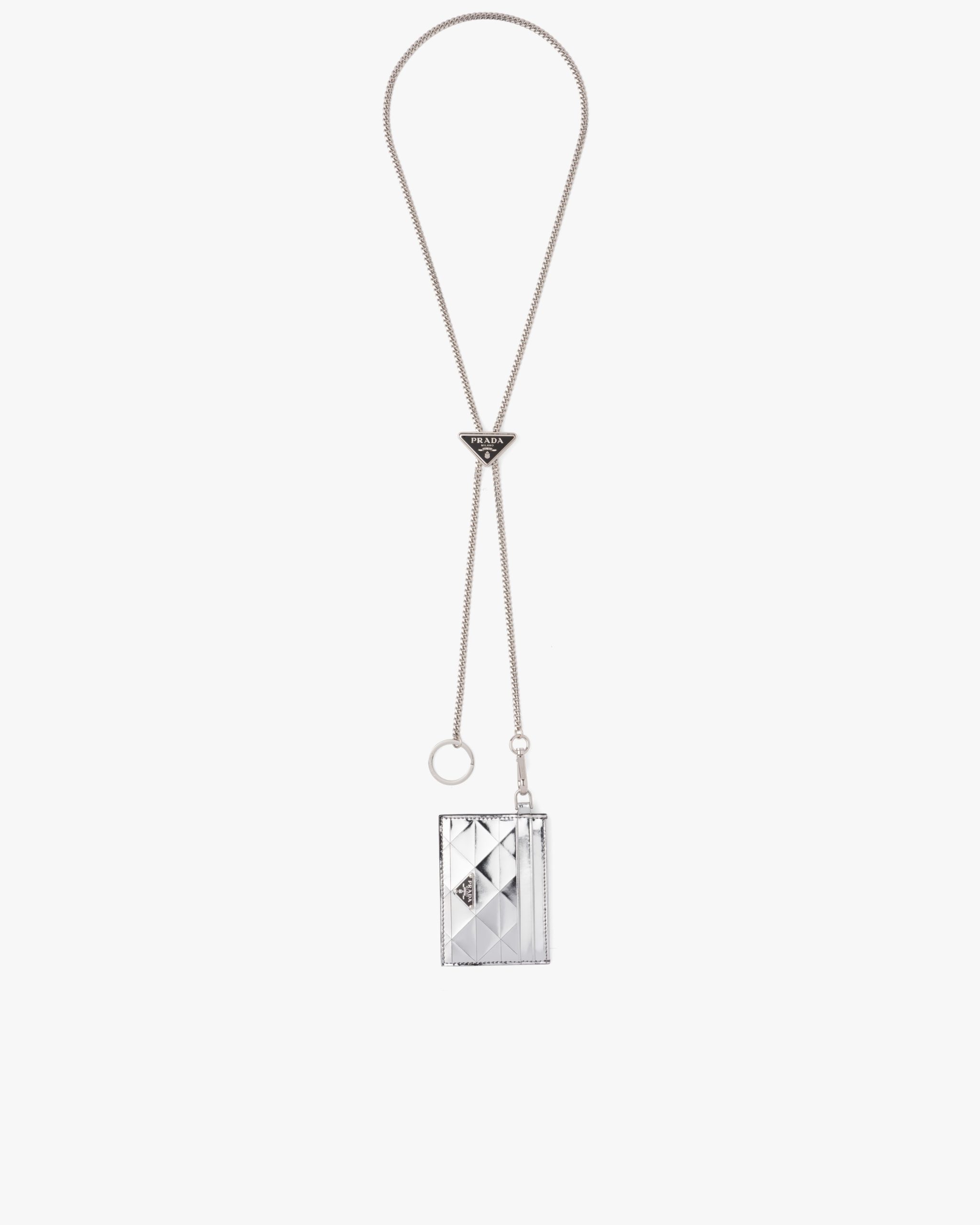This refined, modern card holder is characterized by the geometric motif that emphasizes the leather with a metallic sheen. The accessory stands out for its versatile allure, completed by a removable chain worn around the neck and decorated with the enameled metal triangle logo2.
