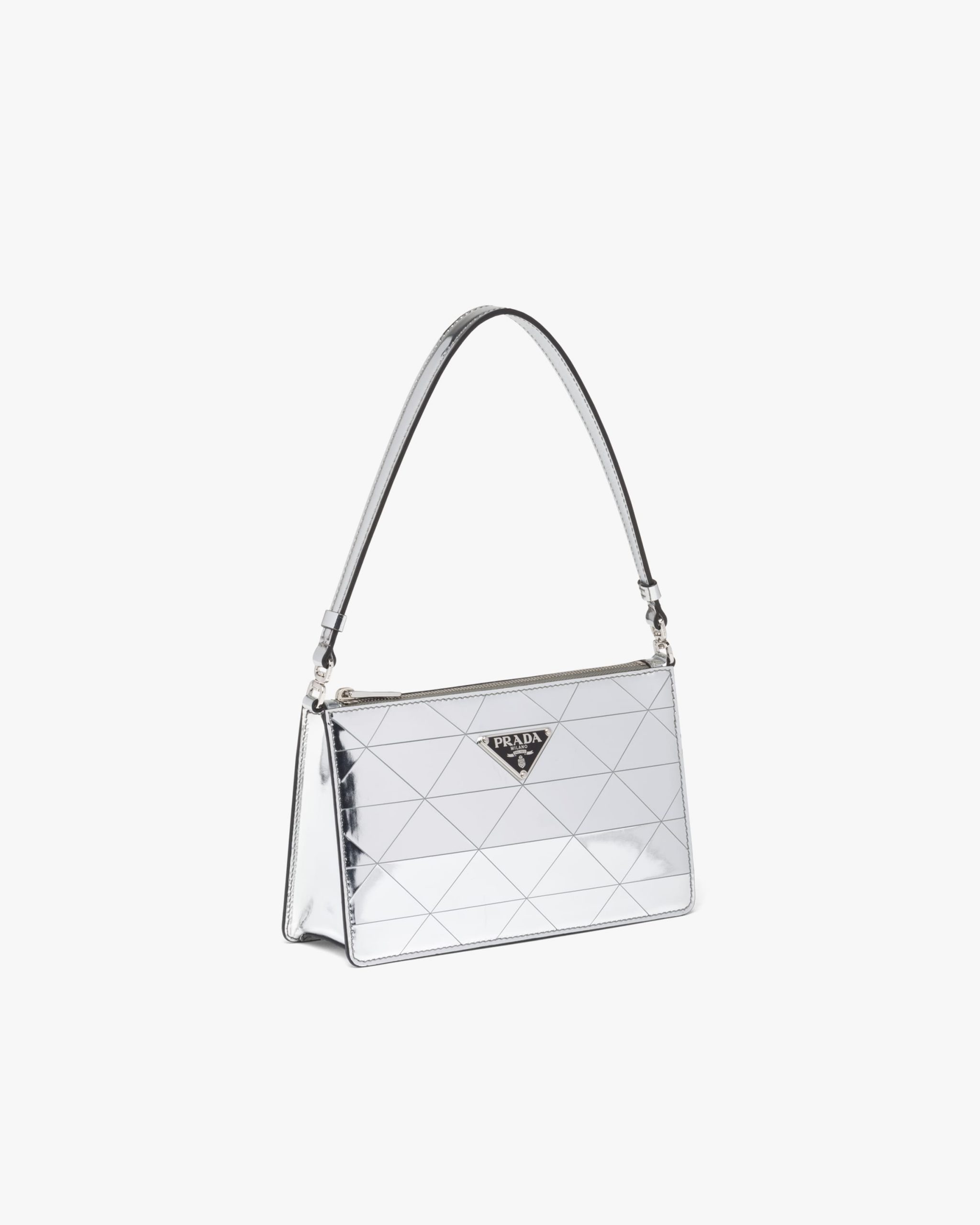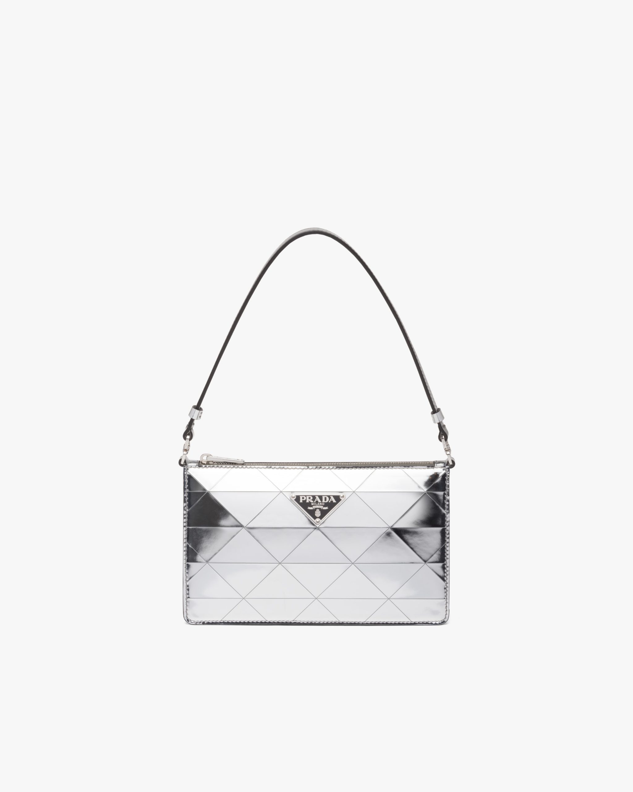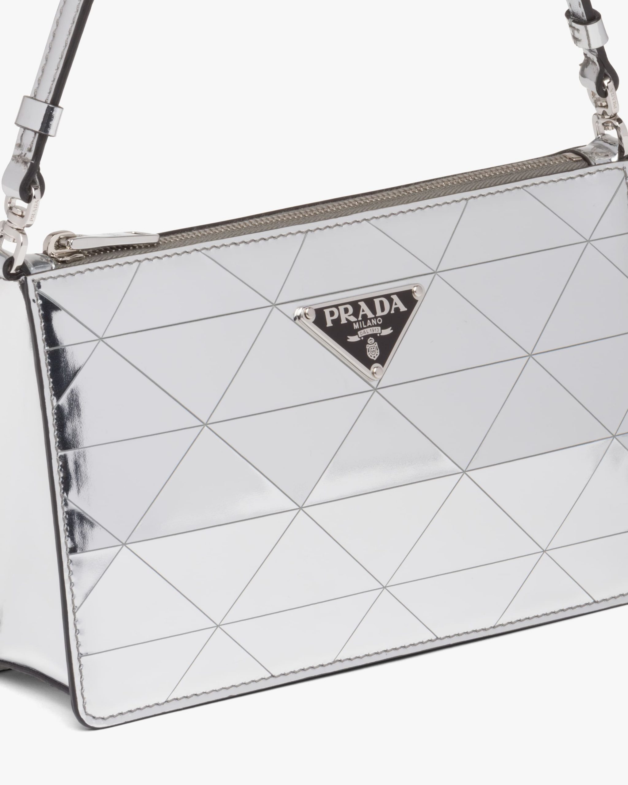 This mini-bag decorated with the enameled triangle logo2 and defined by its structured design comes in metallic leather featuring fine workmanship. A study of the triangle inspires new geometric shapes and unique interpretations of Prada’s historic code. The iconic shape is echoed in the motif that decorates the surface for a faceted and luminous effect.