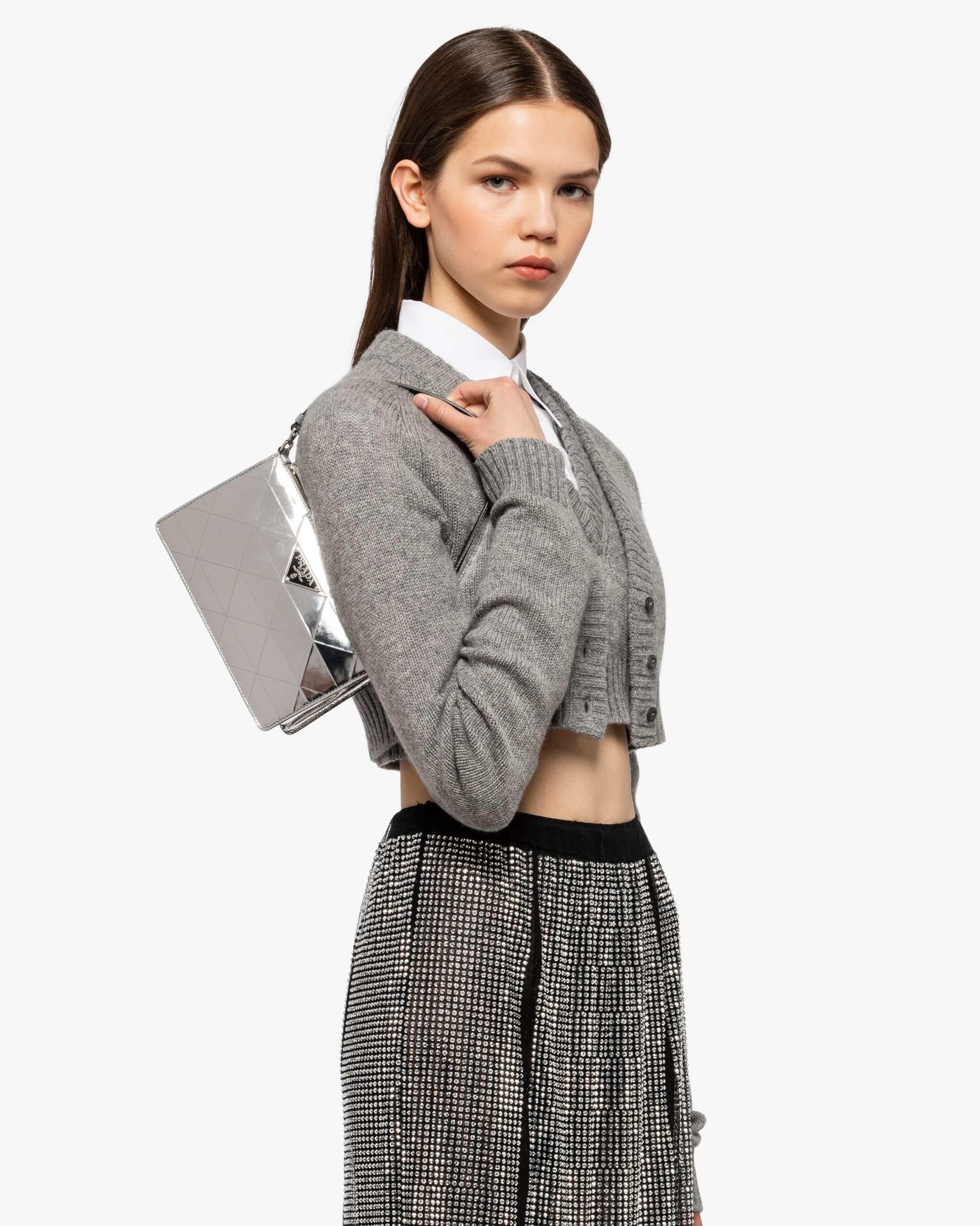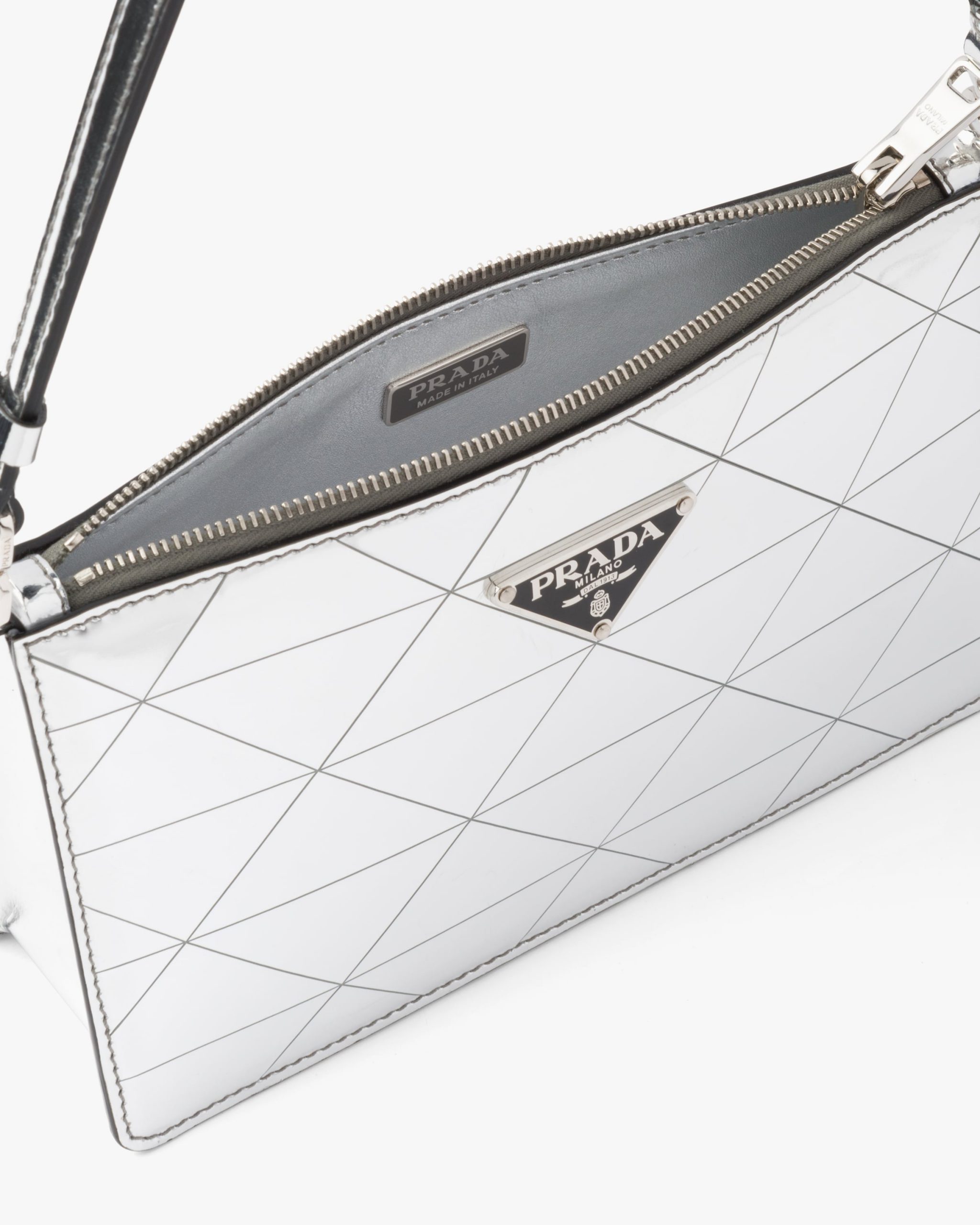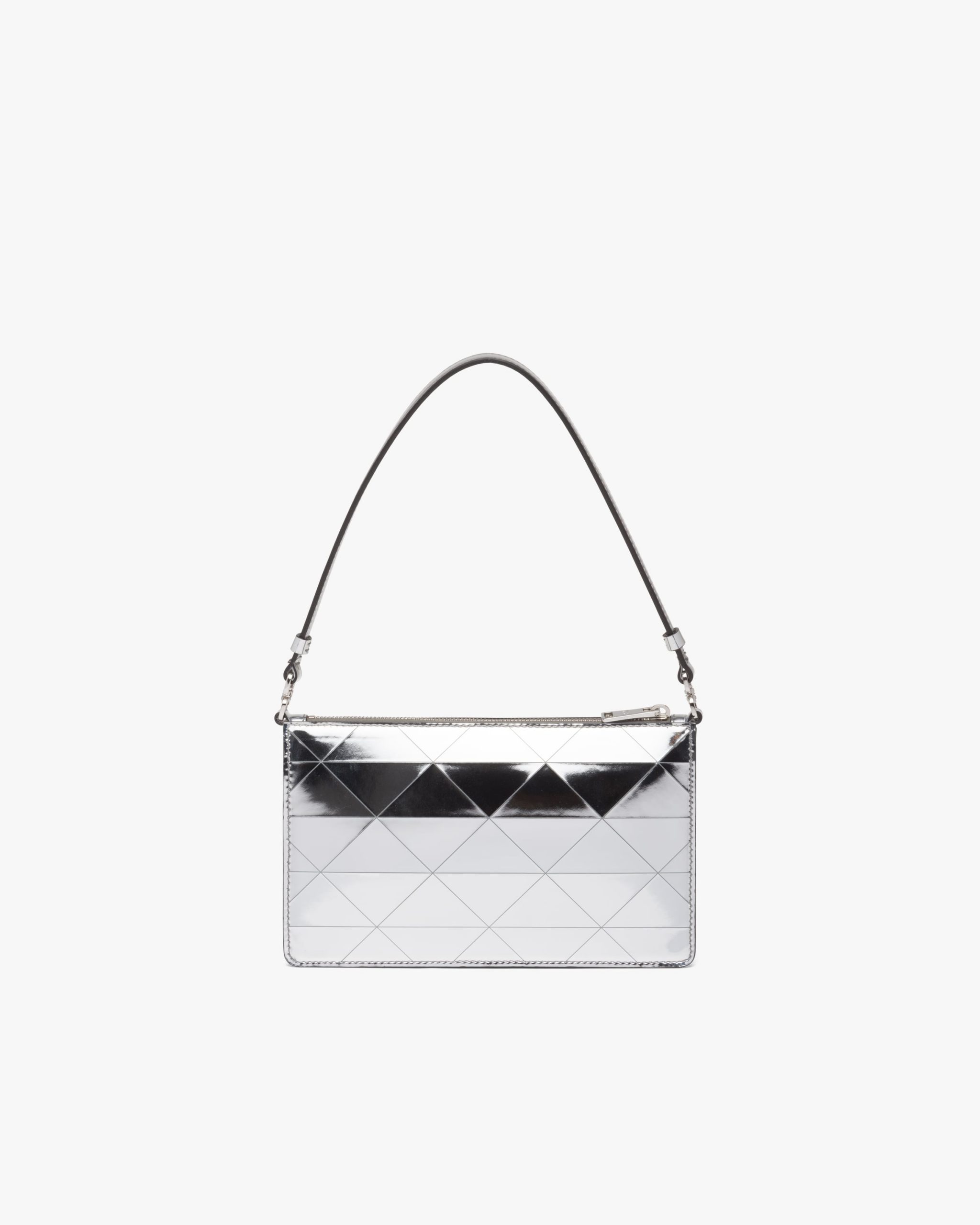 This mini-bag decorated with the enameled triangle logo2 and defined by its structured design comes in metallic leather featuring fine workmanship. A study of the triangle inspires new geometric shapes and unique interpretations of Prada’s historic code. The iconic shape is echoed in the motif that decorates the surface for a faceted and luminous effect.