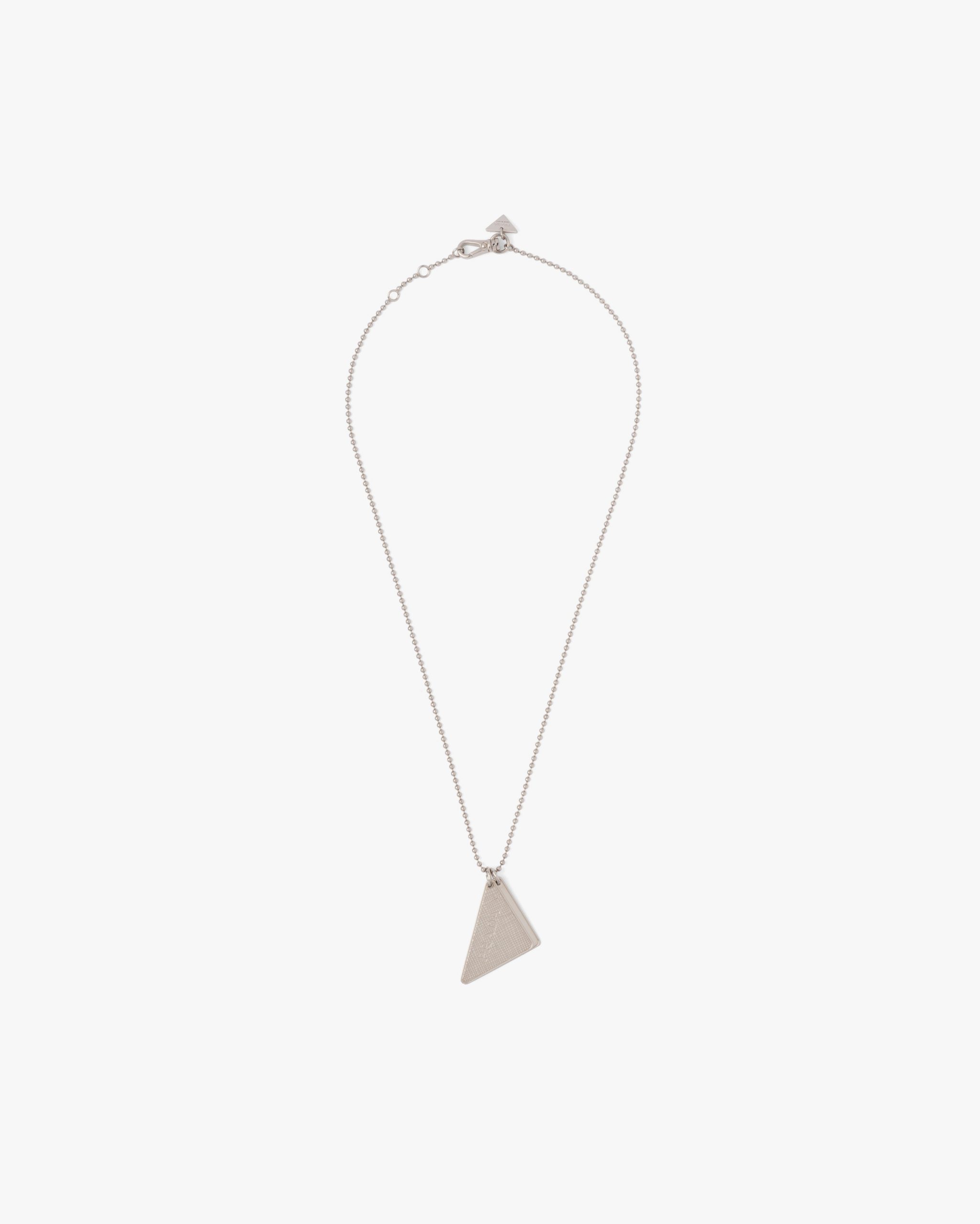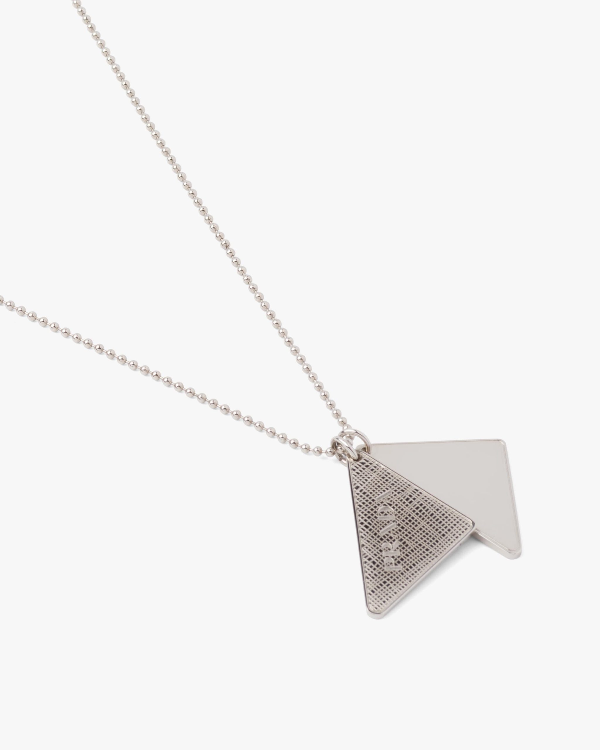 Prada’s iconic triangle logo2 transforms into a double pendant that decorates this chain necklace, creating a dynamic play of layering and texture. Iconic and essential in form, the triangle is the protagonist of a new line of jewelry made of 925 sterling silver.