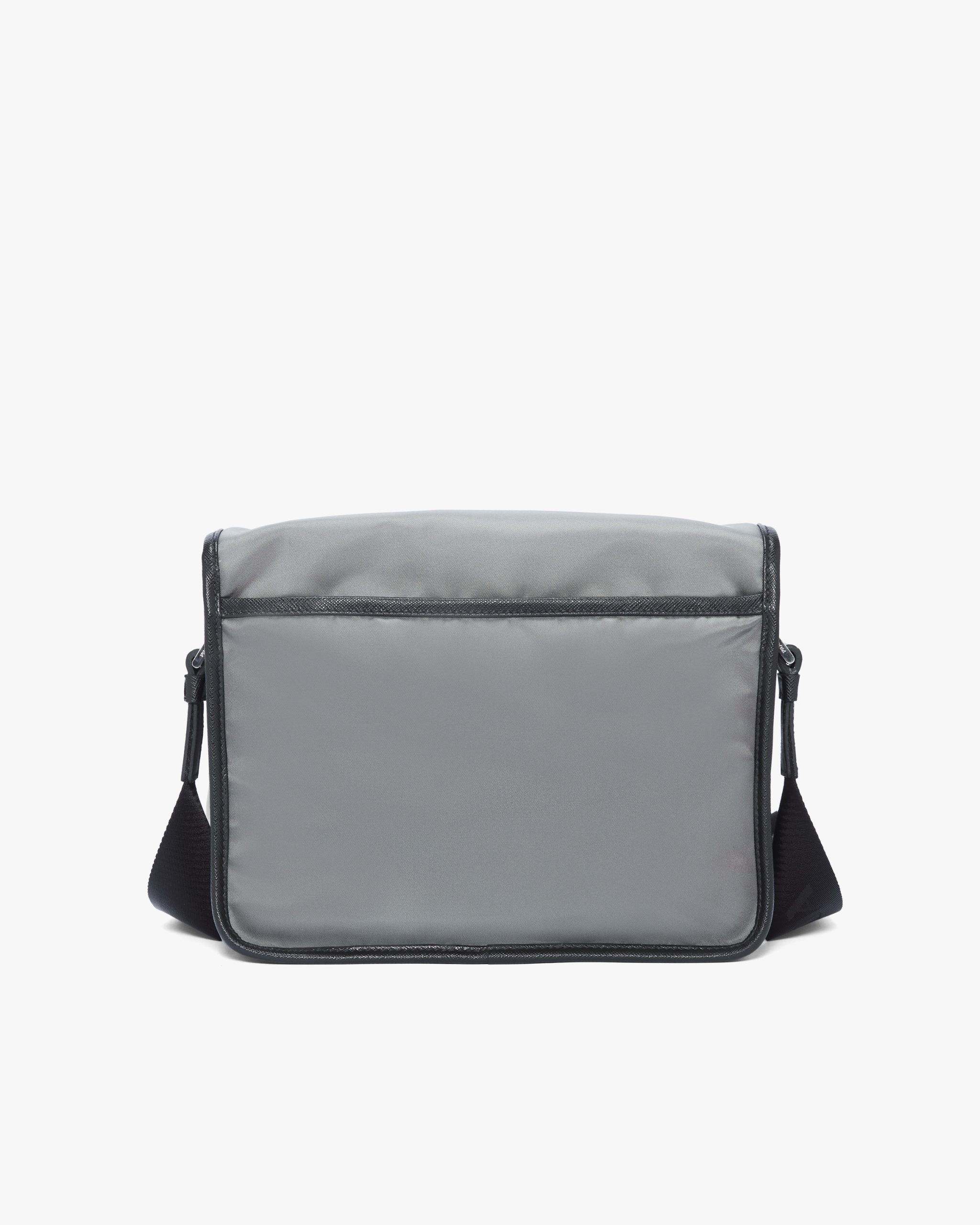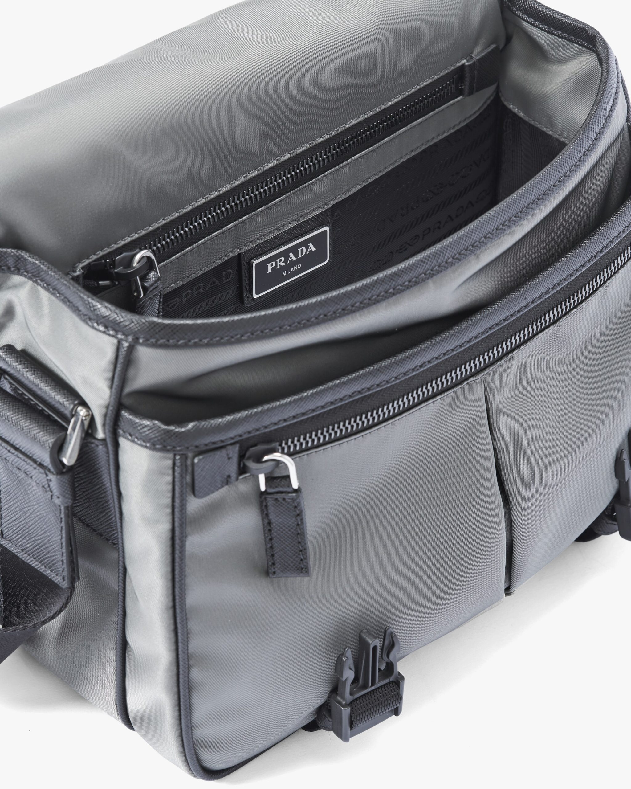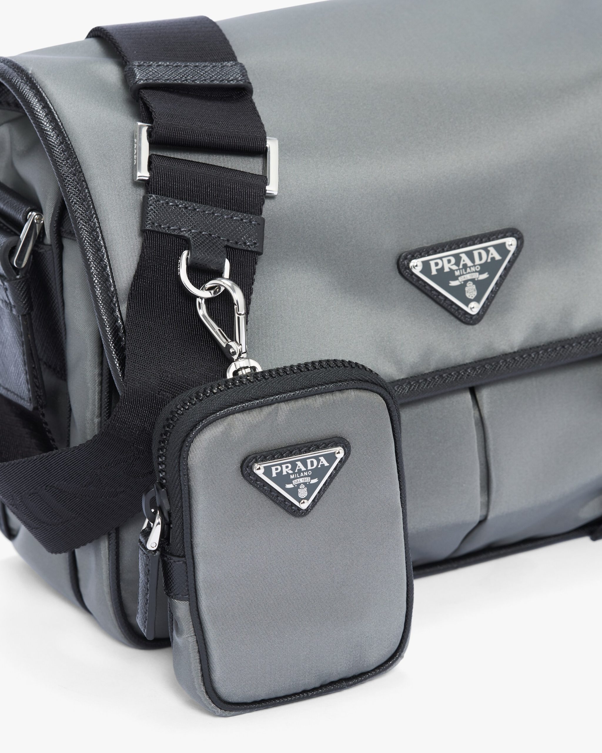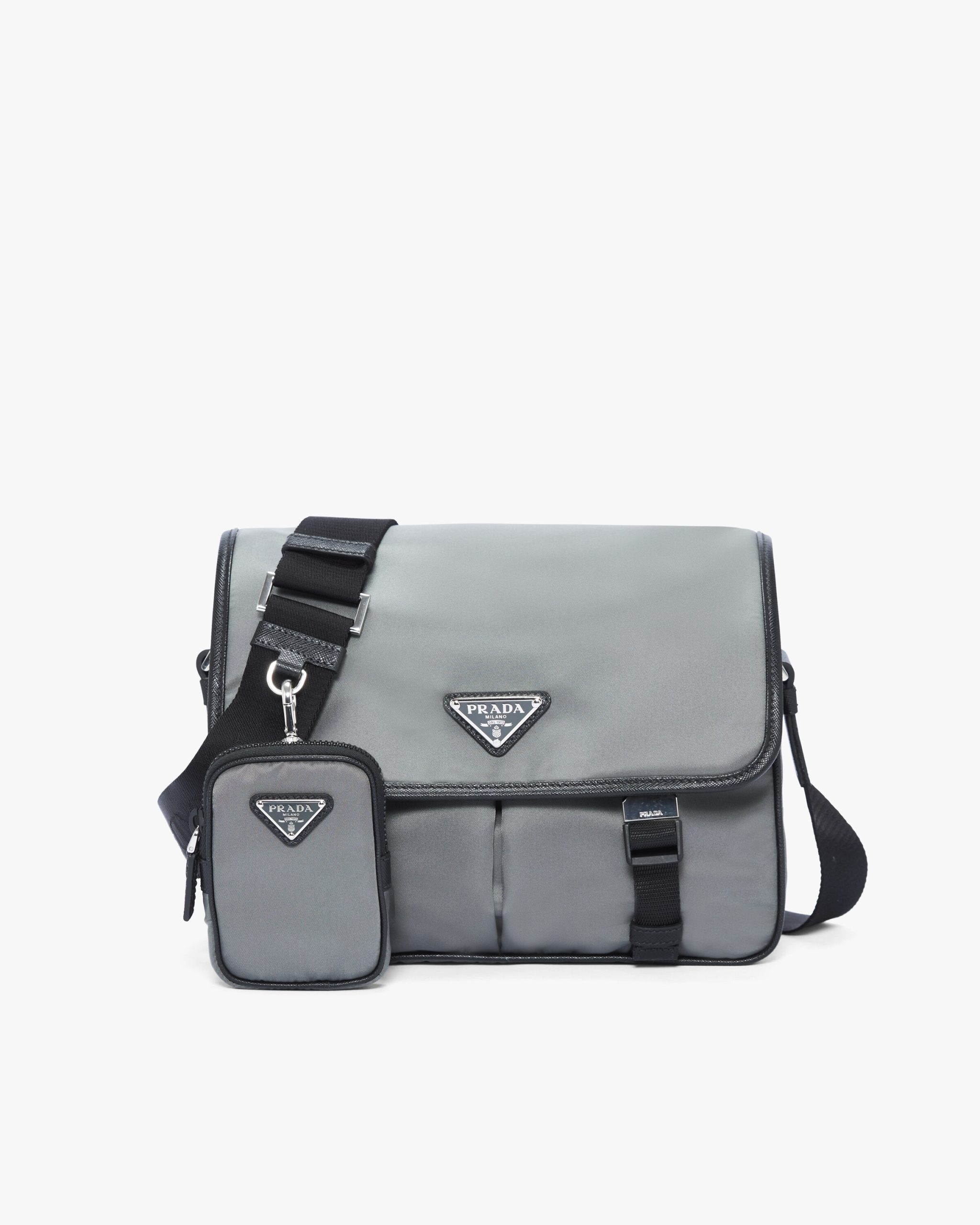 This nylon shoulder bag is characterized by its functional, masculine design. The bag, with flap and two side-release buckles, has a removable pouch and is decorated with the metal triangle logo2.
