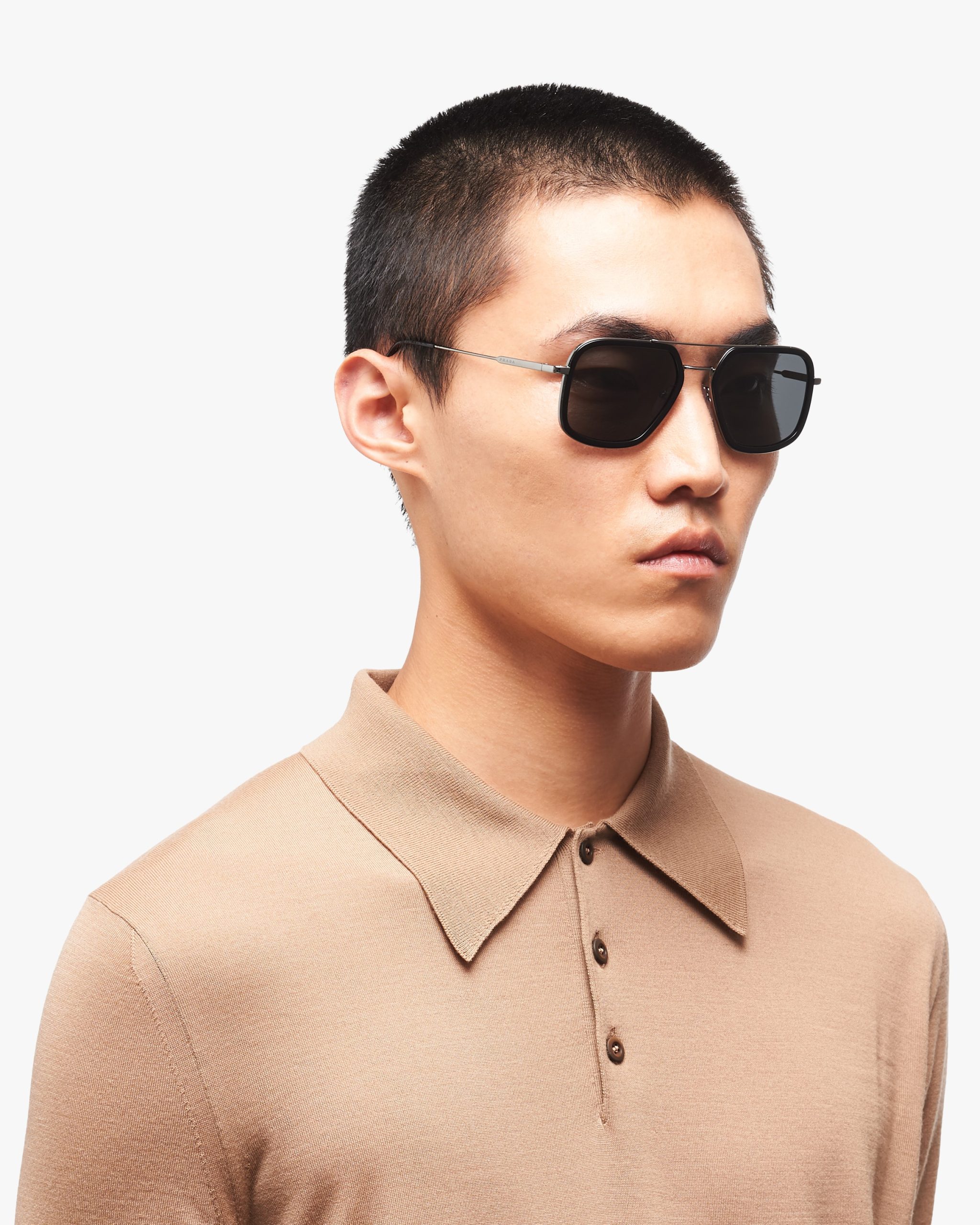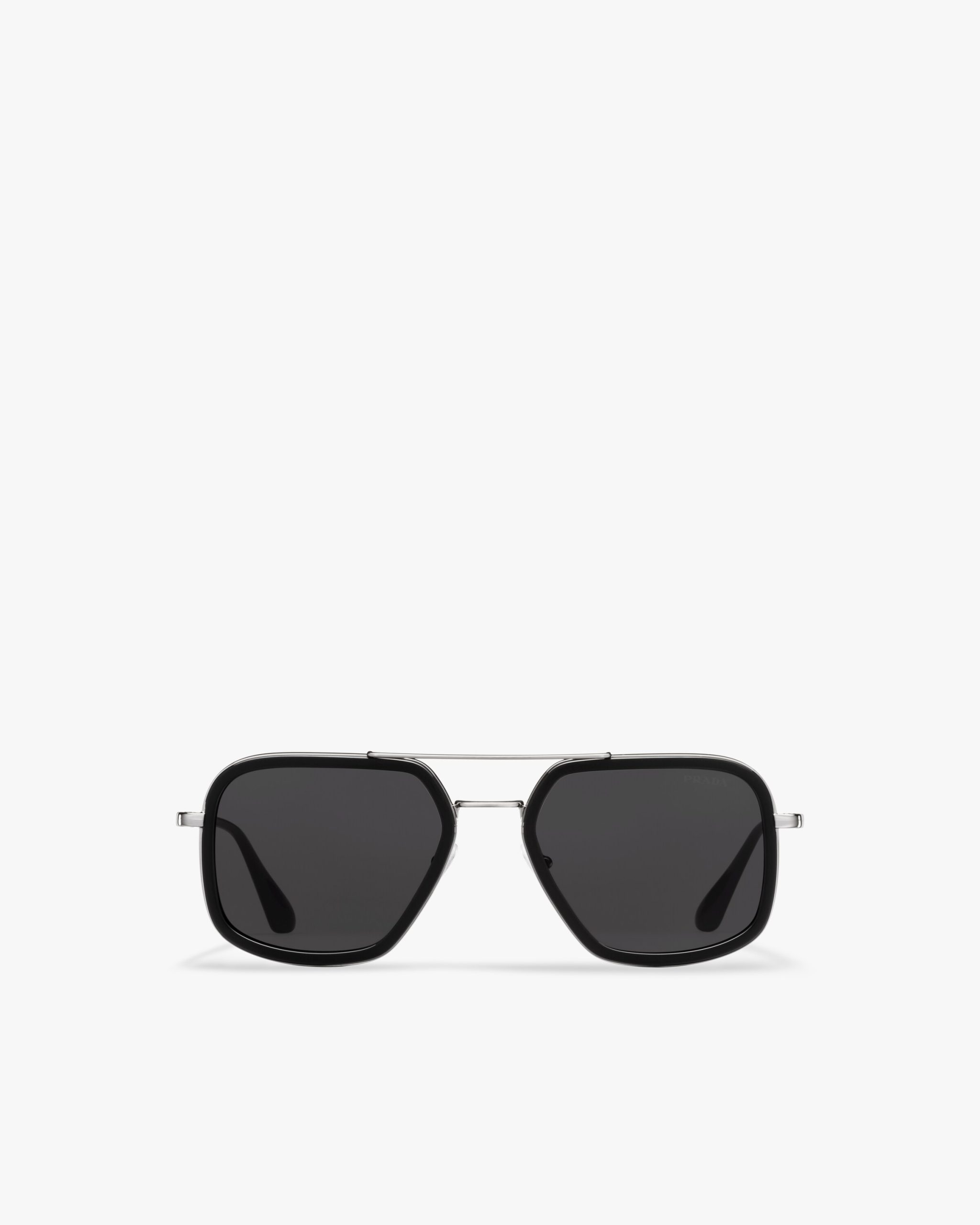 These sunglasses are defined by their rectangular silhouette elegant acetate rims and a double metal bridge with a contemporary touch. Prada lettering logo2.