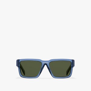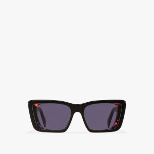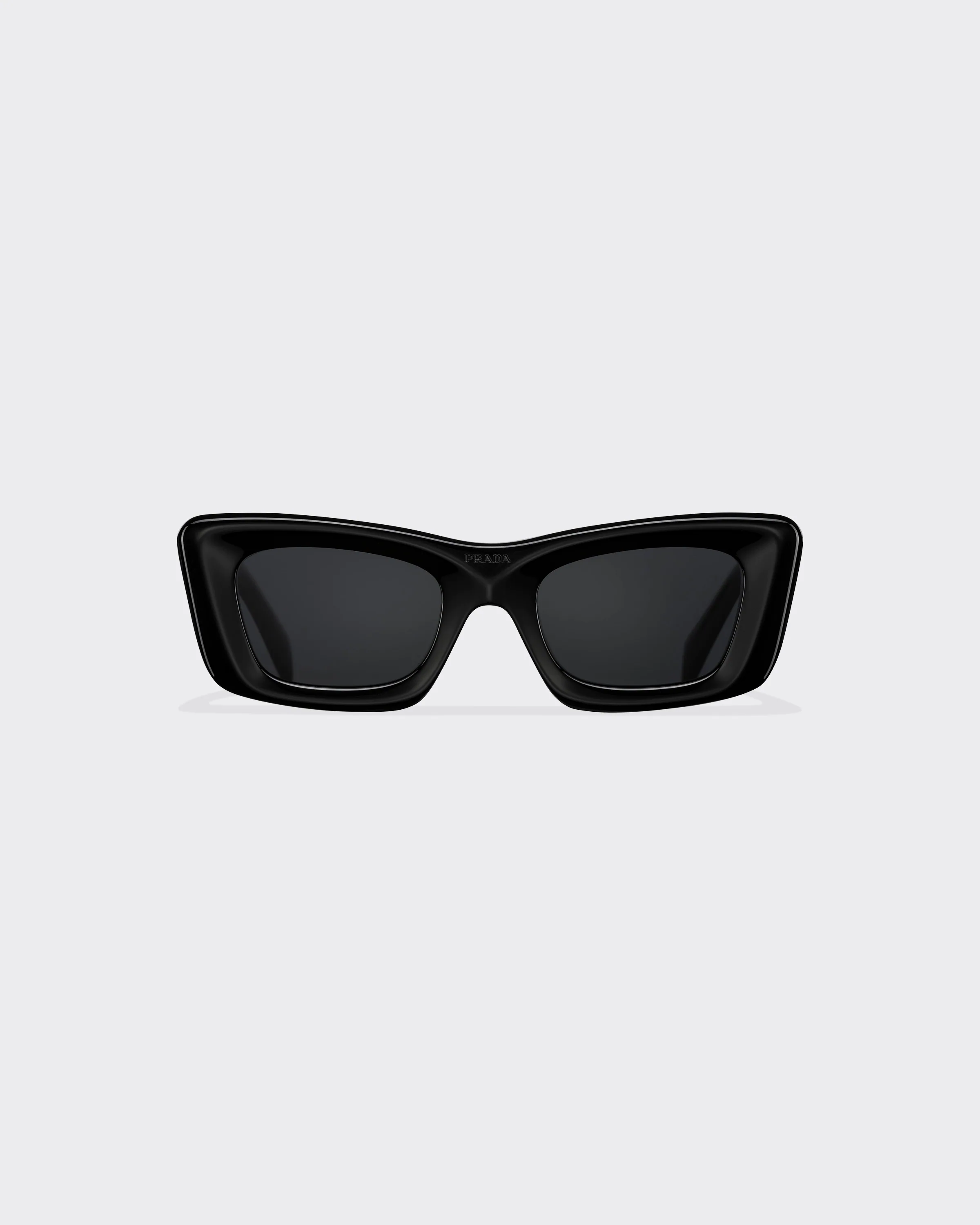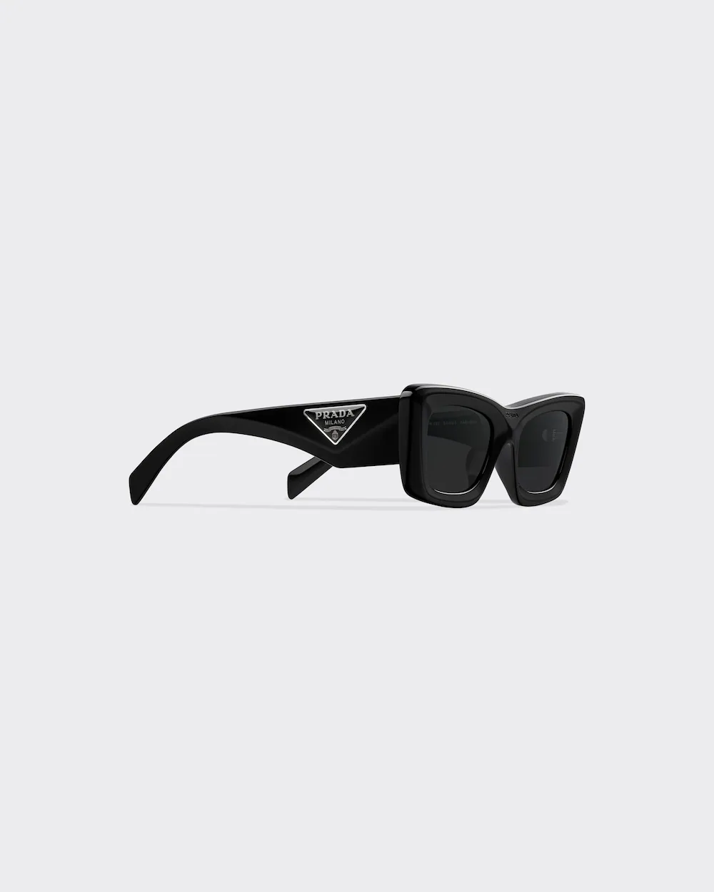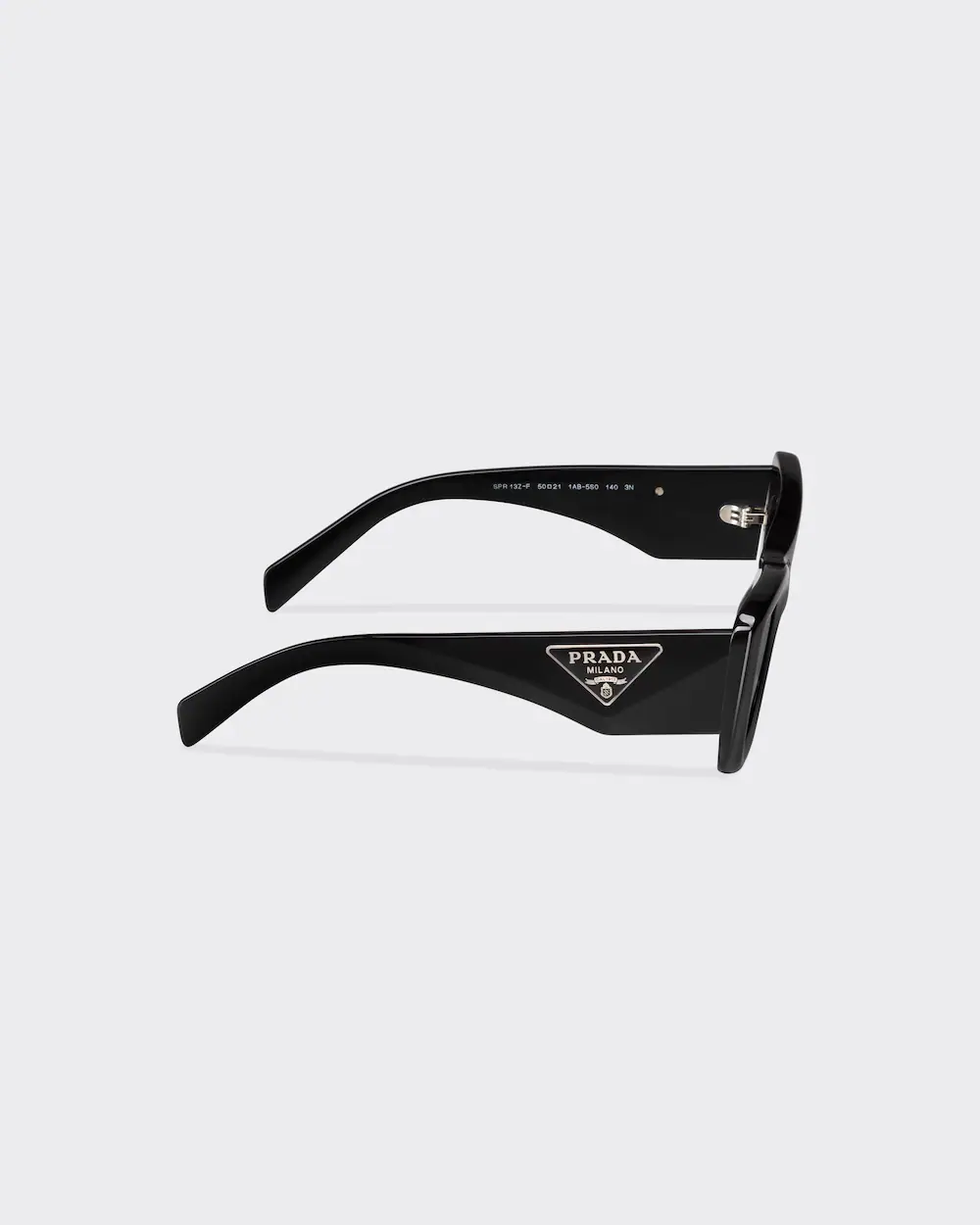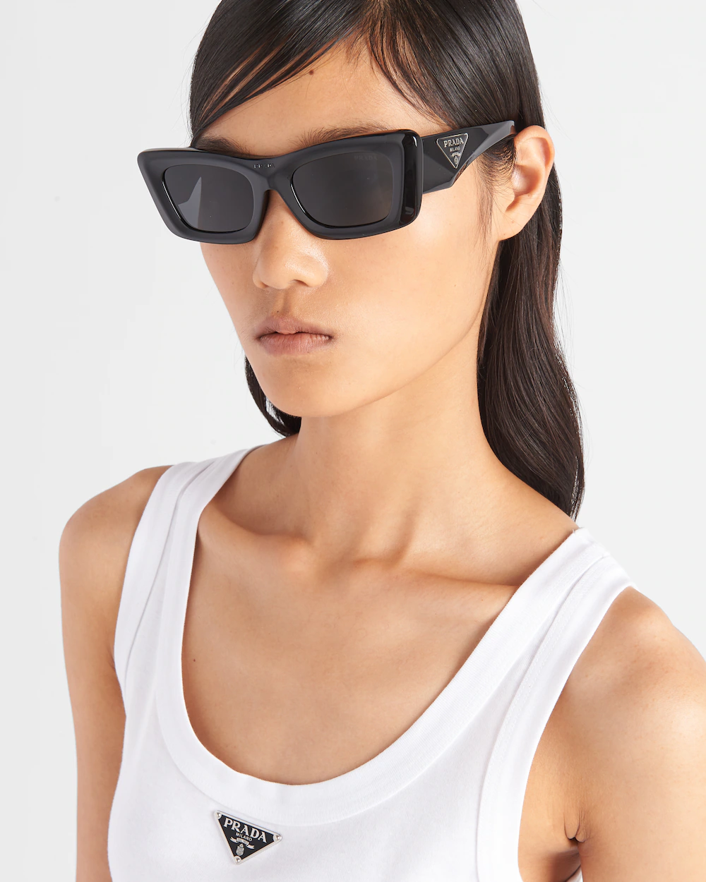 Acetate replica sunglasses with a sophisticated design and important volumes. The bold frame with slightly rounded edges expresses contemporary femininity. The temples are decorated with an exclusive metal plaque featuring the iconic triangle logo2 of the maison.