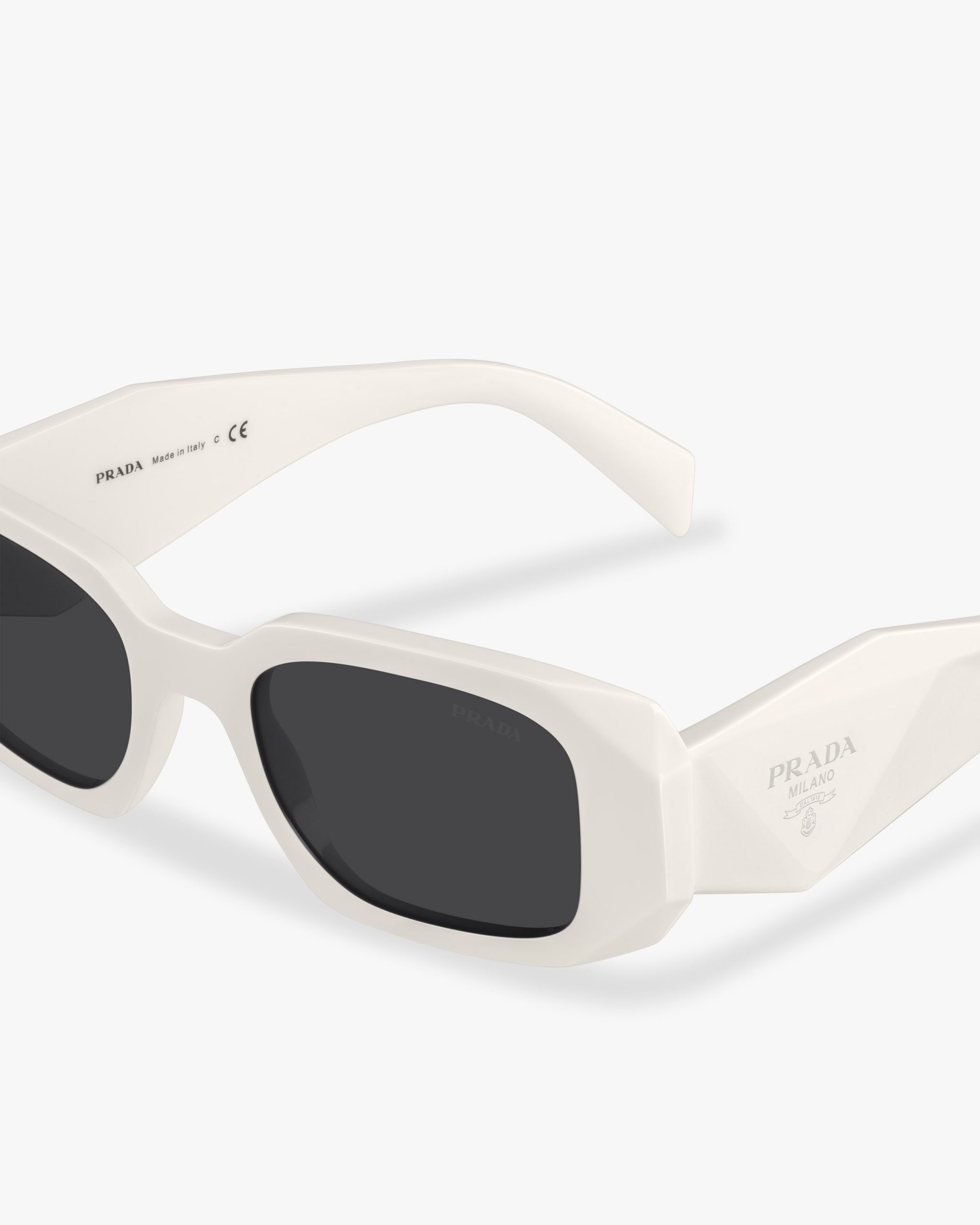 Acetate sunglasses with an oversized, geometric design. The bold frame front has an avant-garde silhouette defined by the extreme angled cut of the outer corners. The three-dimensional design of the temples is decorated with an iconographic interpretation of the traditional Prada triangle logo2.