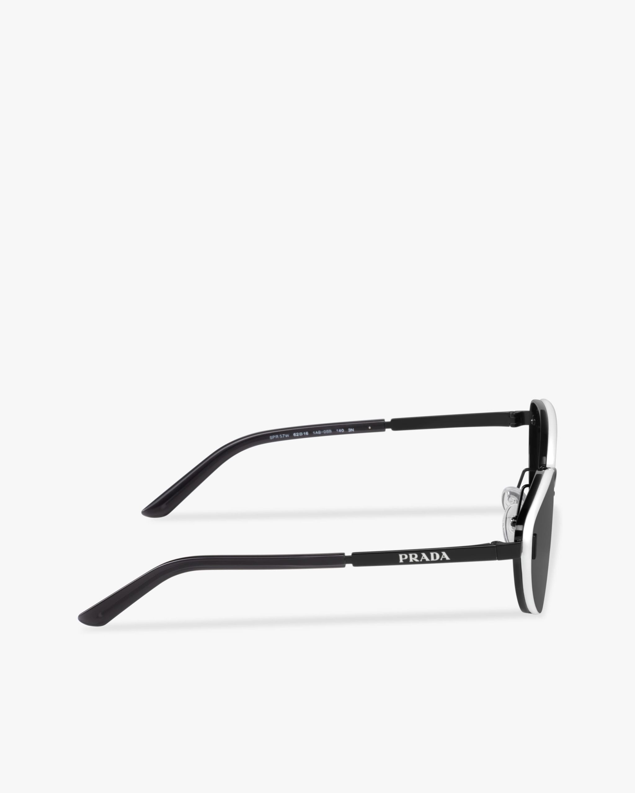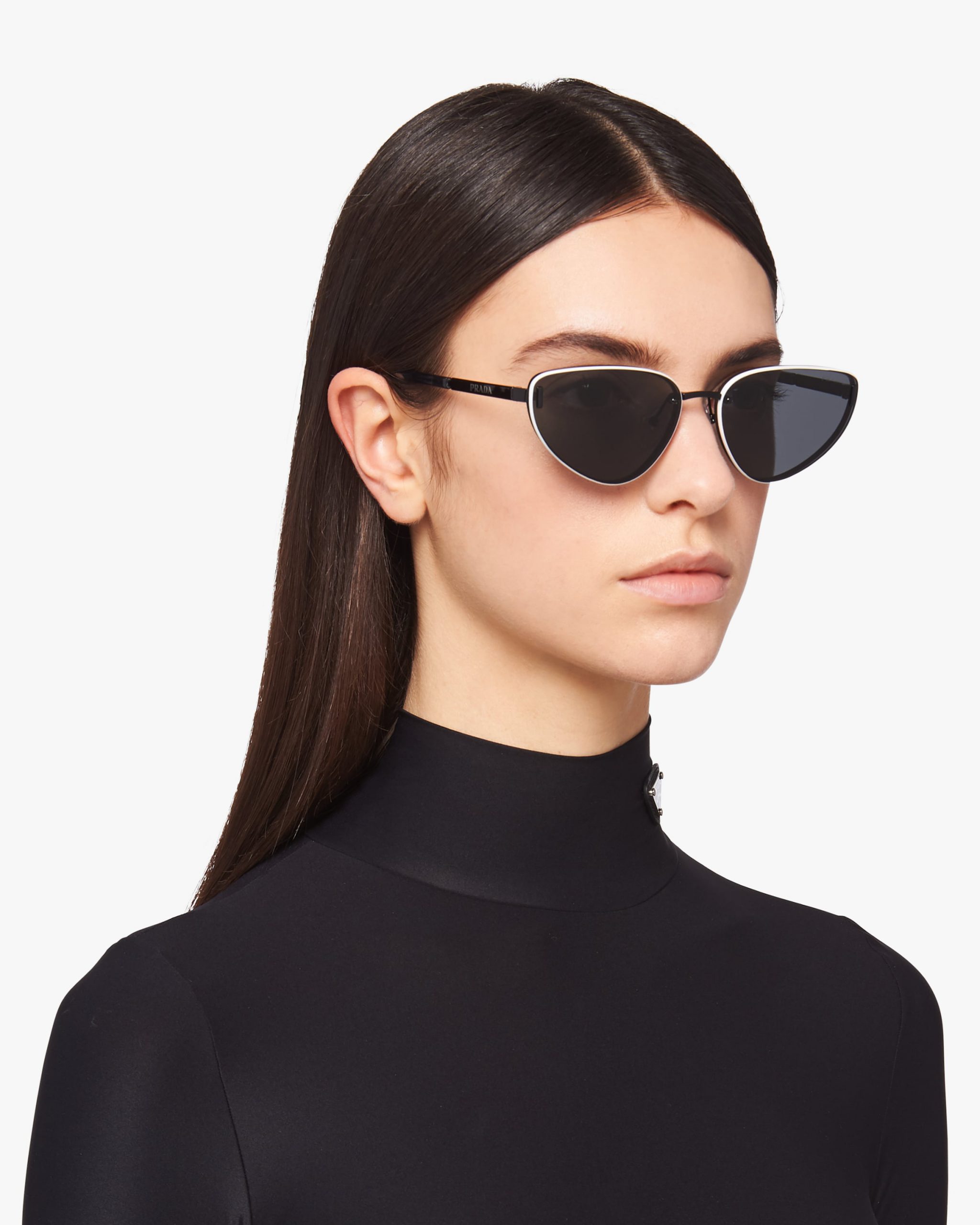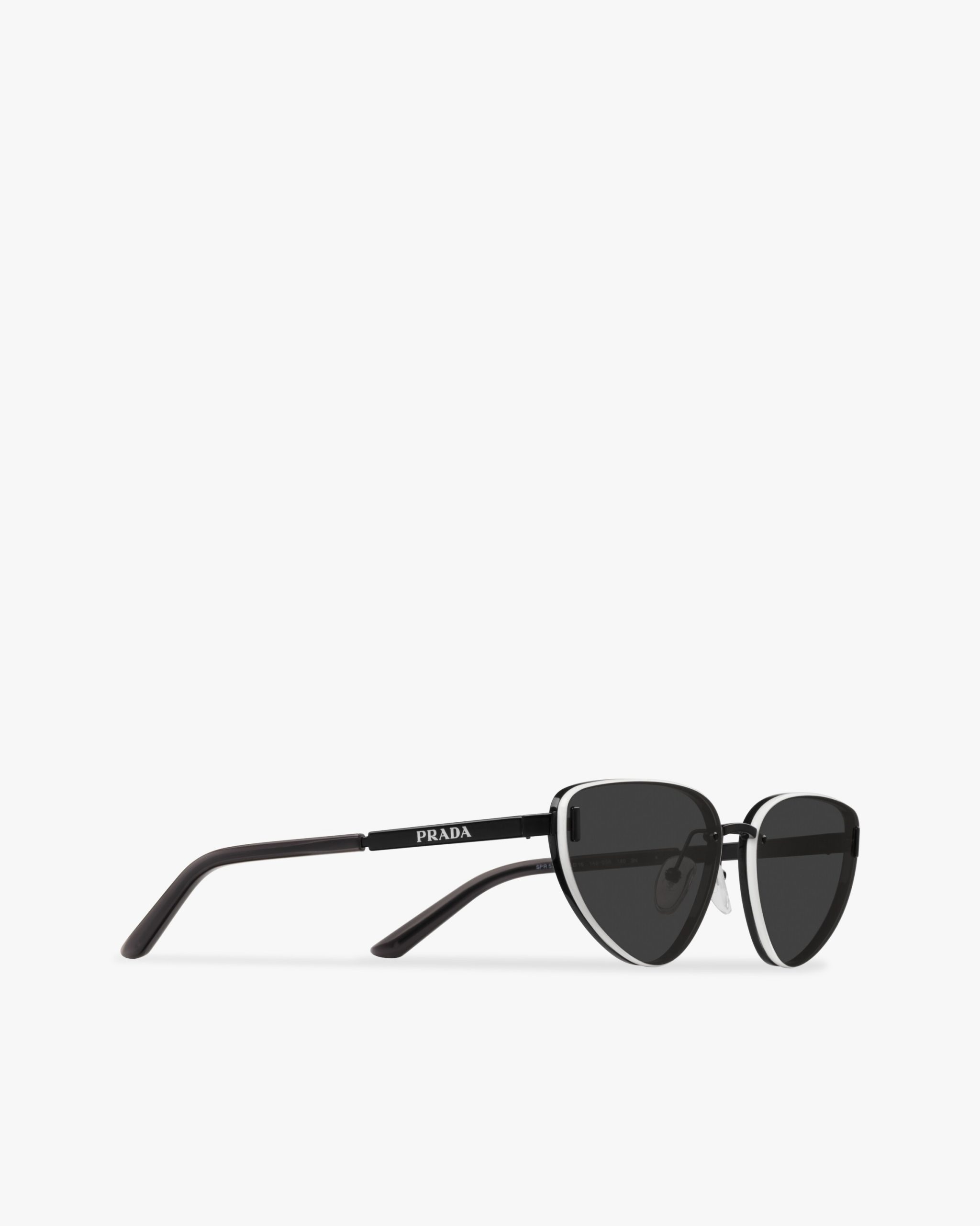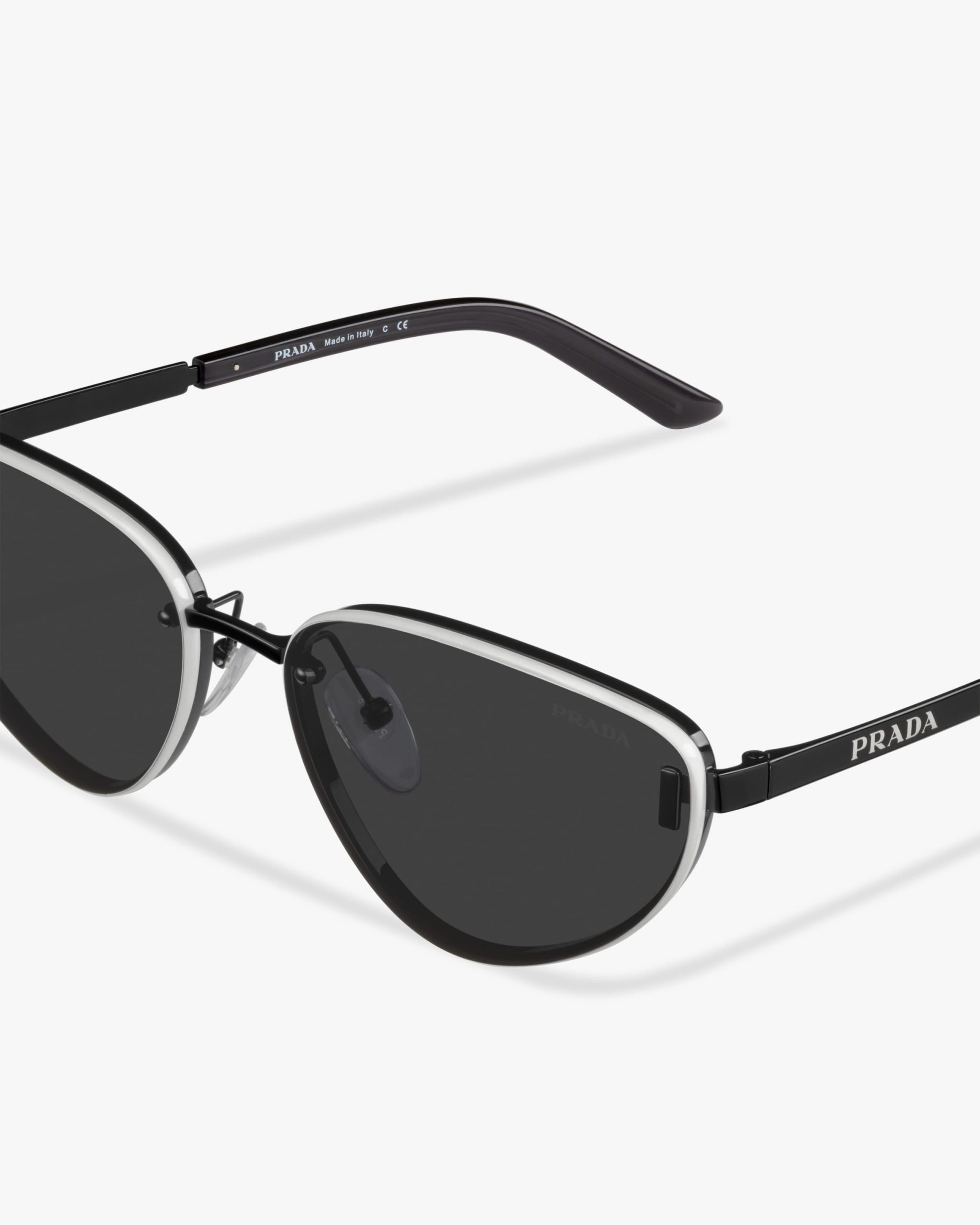 Metal sunglasses from the Prada Duple collectsion. The cat-eye frame front has enameled trim on the outside rims of the ultra-flat lenses that highlight the refined construction. Metal details interrupt the linearity of the temples decorated with the Prada metal lettering logo2.