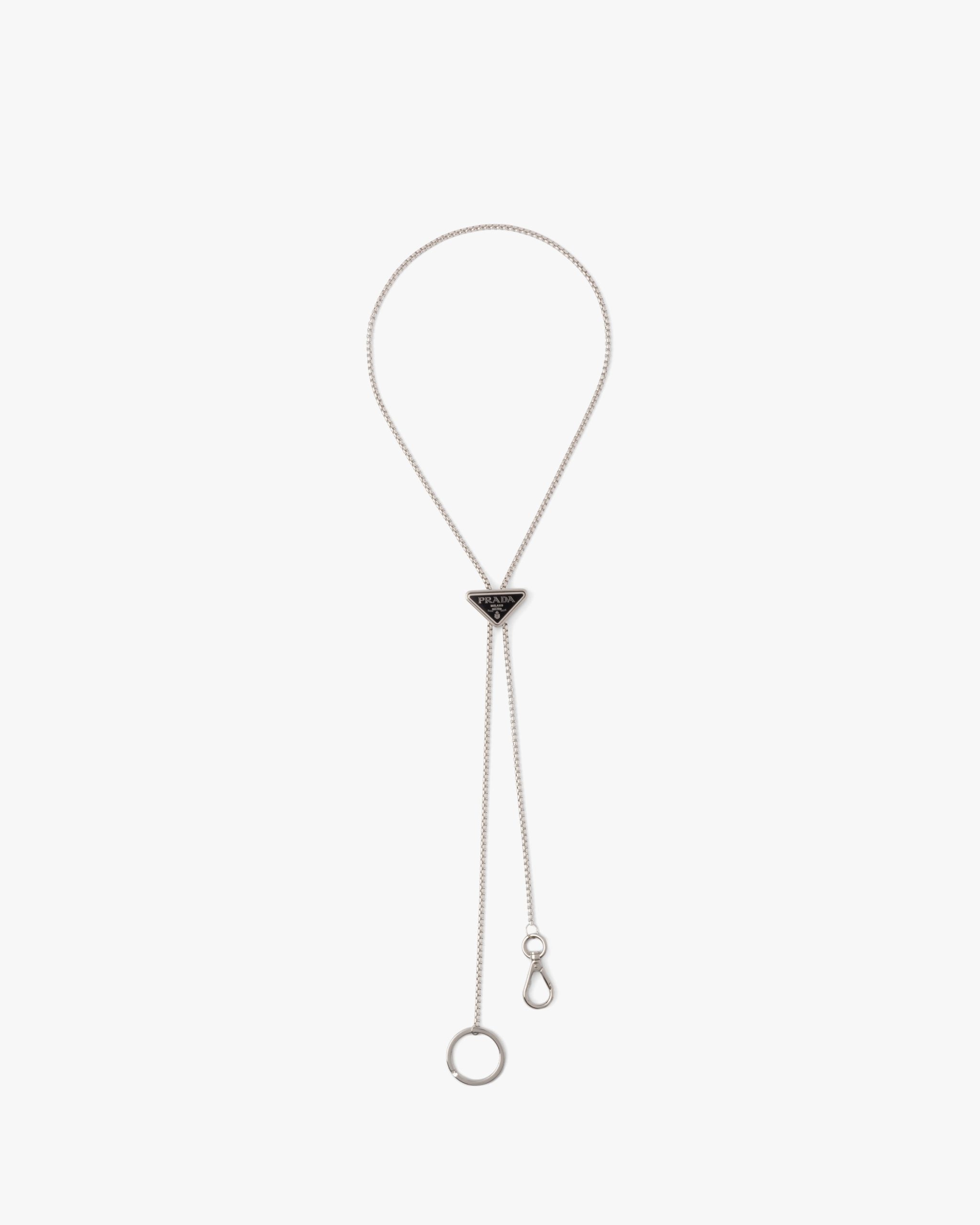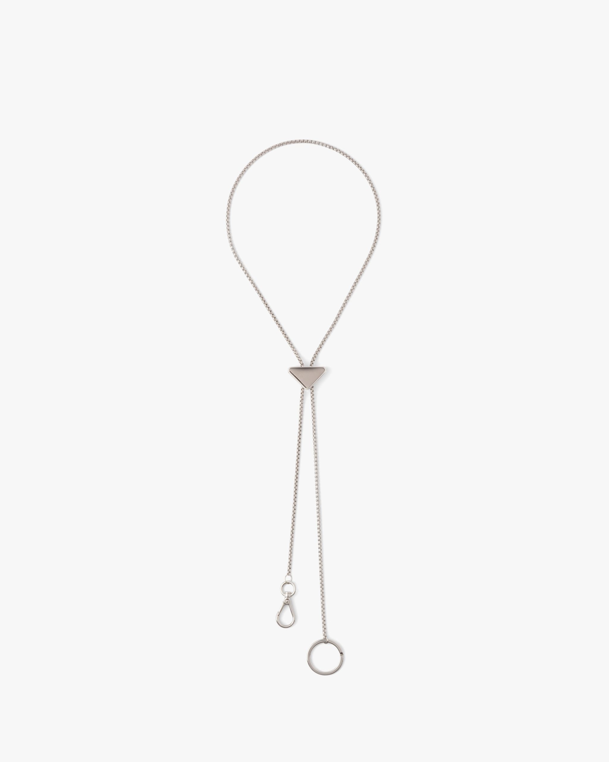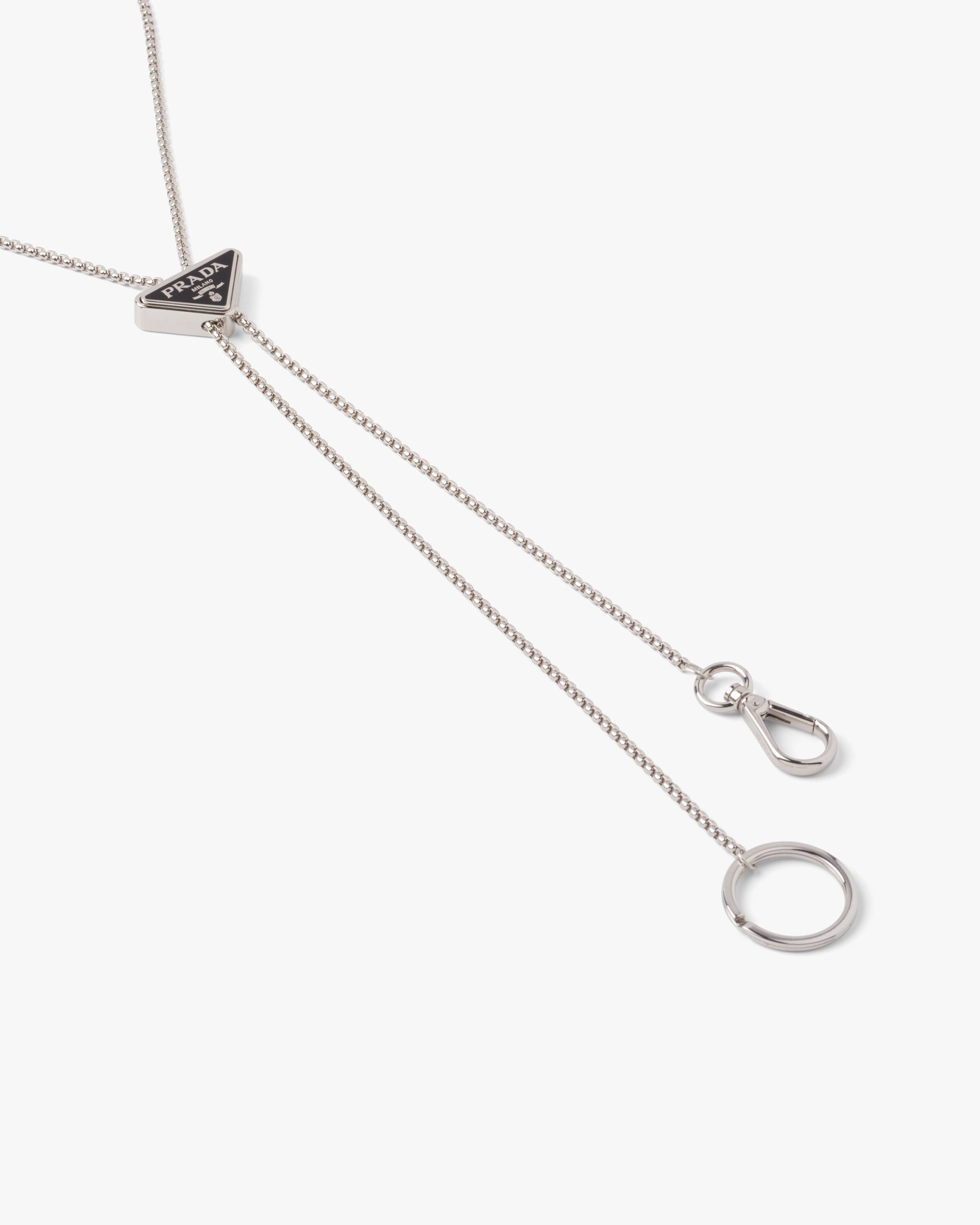 Presented in new versions each season, the emblematic enameled triangle logo2 that first appeared on Prada trunks in 1913 is transformed into a precious detail that decorates this metal keychain.