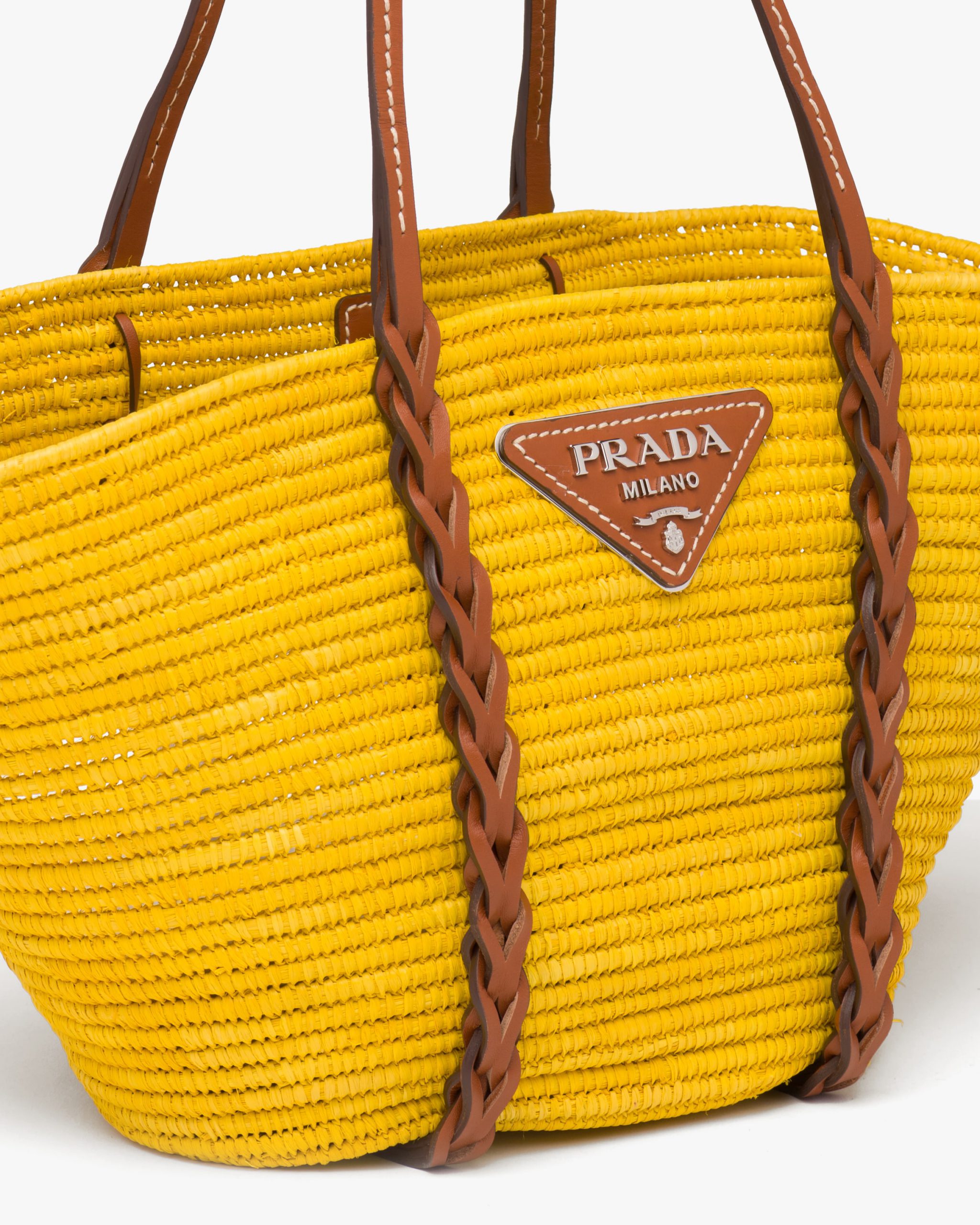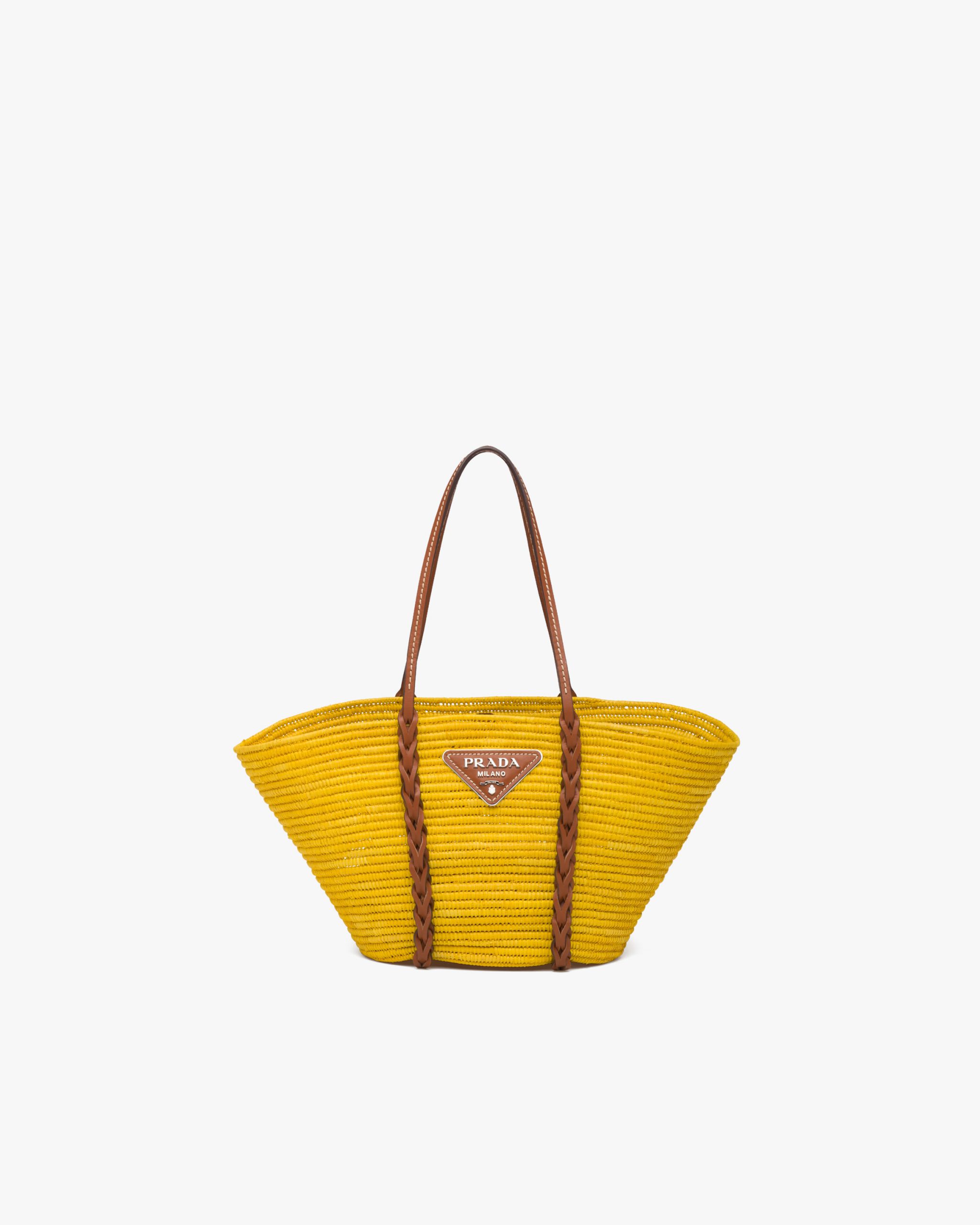 This raffia bag with characteristic basket shape features a distinctive multicolored motif. The braided leather inserts that start at the handles and travel down the bag add a sophisticated touch.