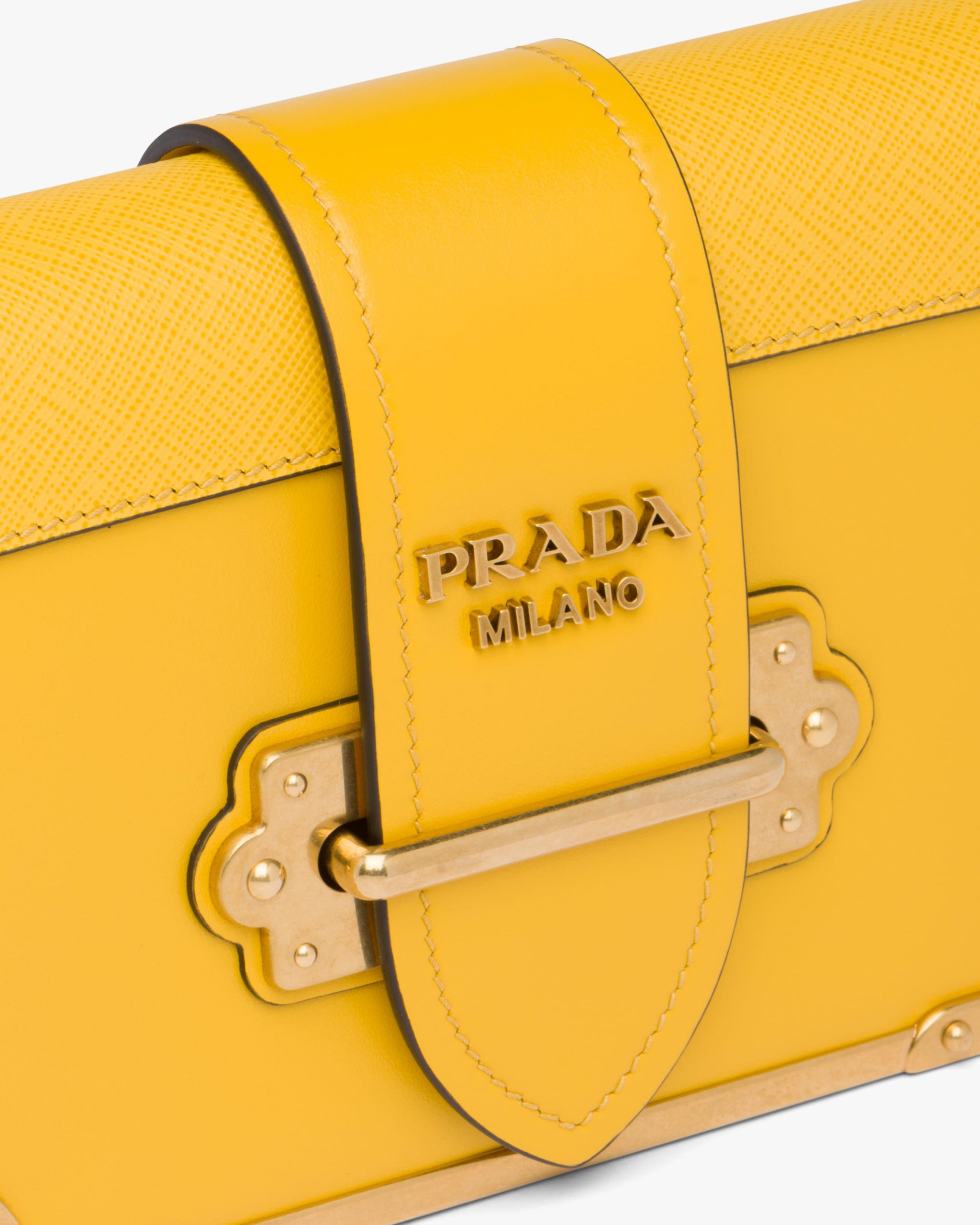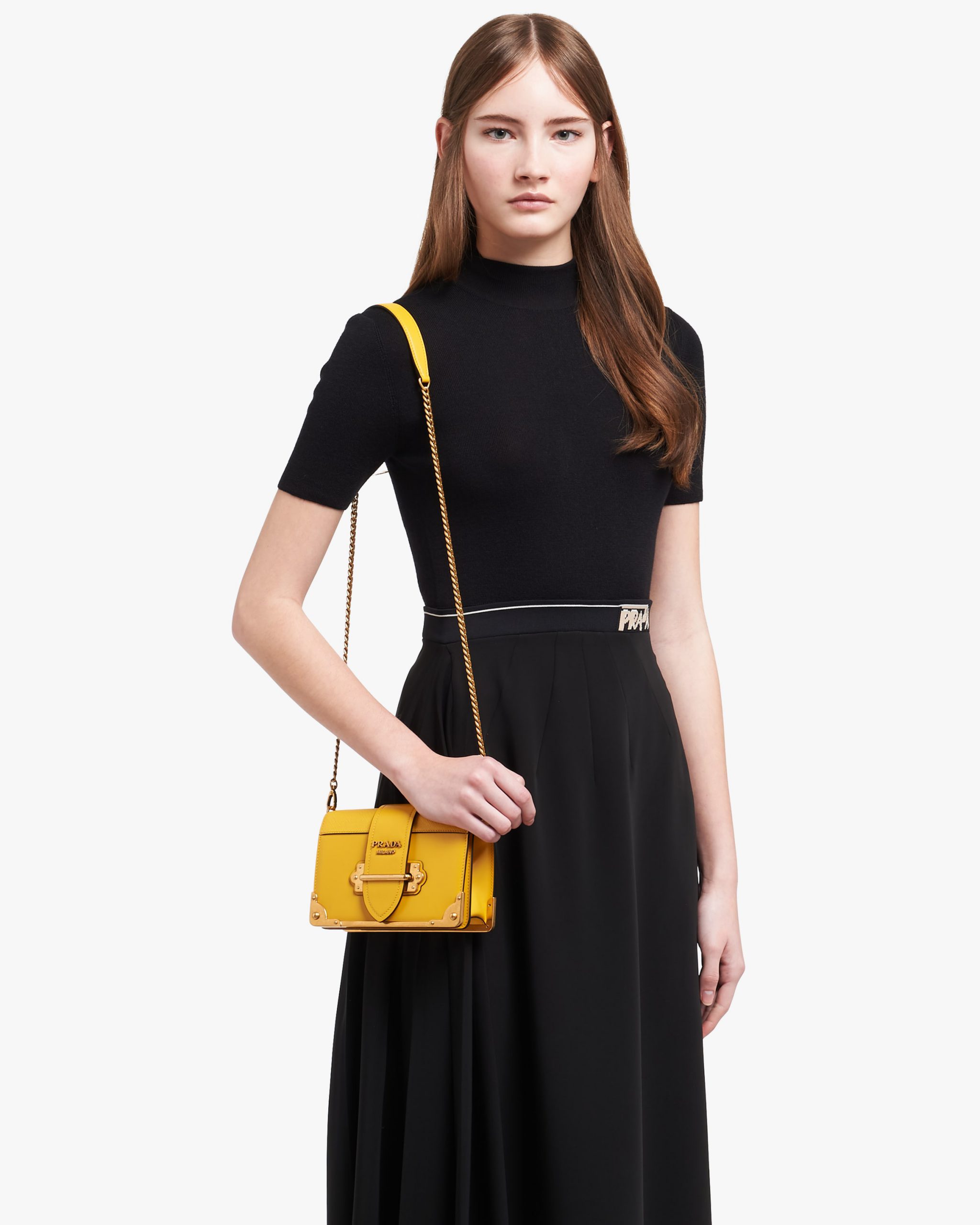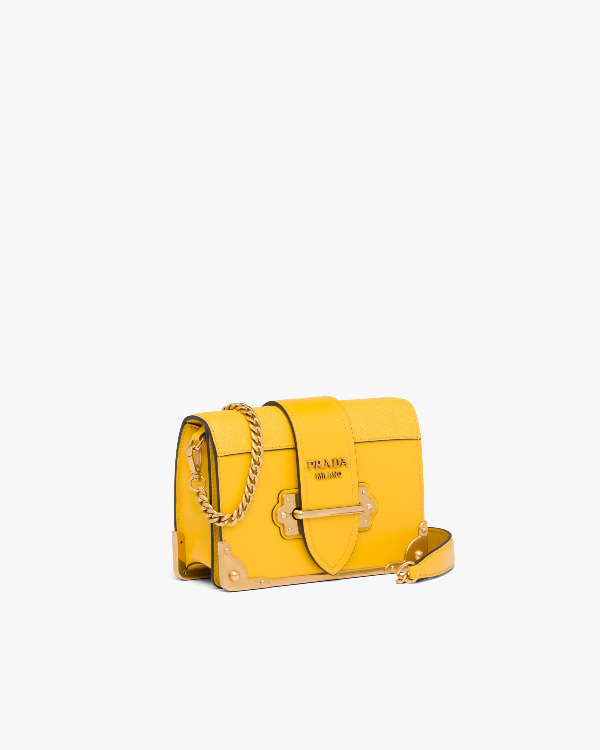 Made of calf leather, it is defined by the metal hardware decorating the front and shoulder strap.