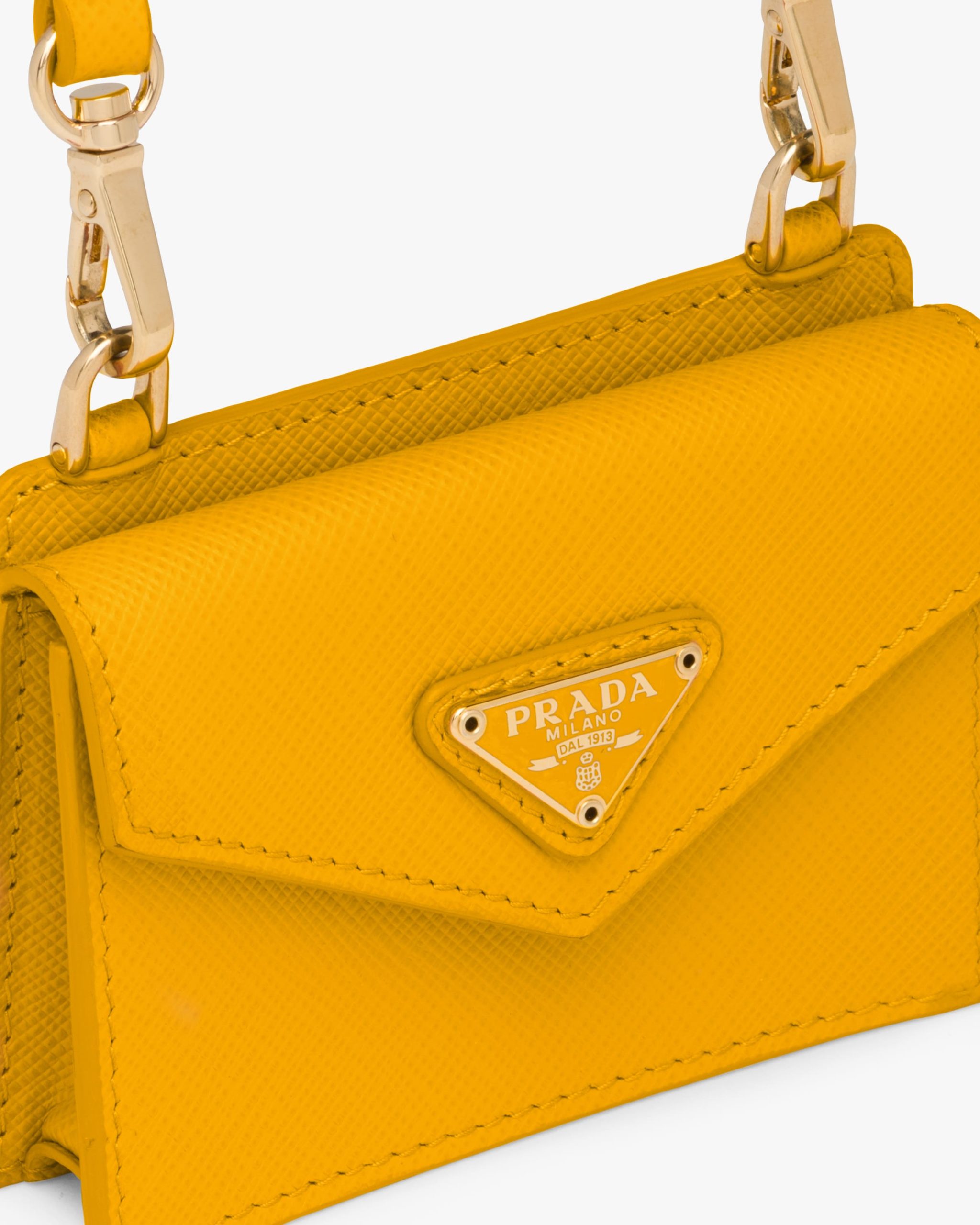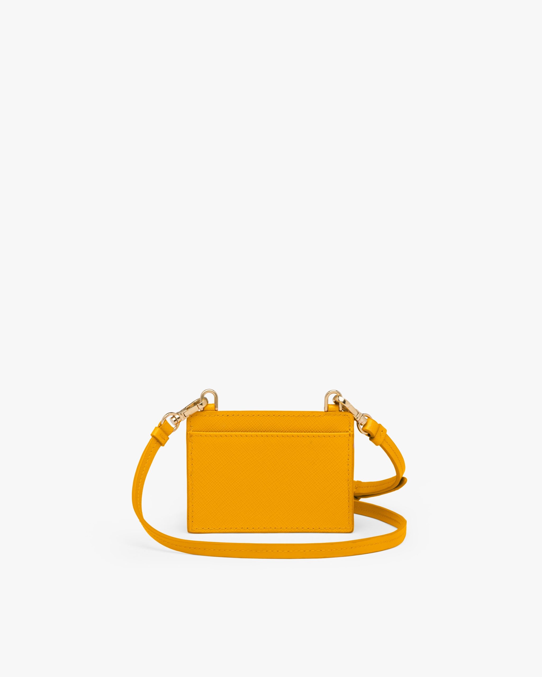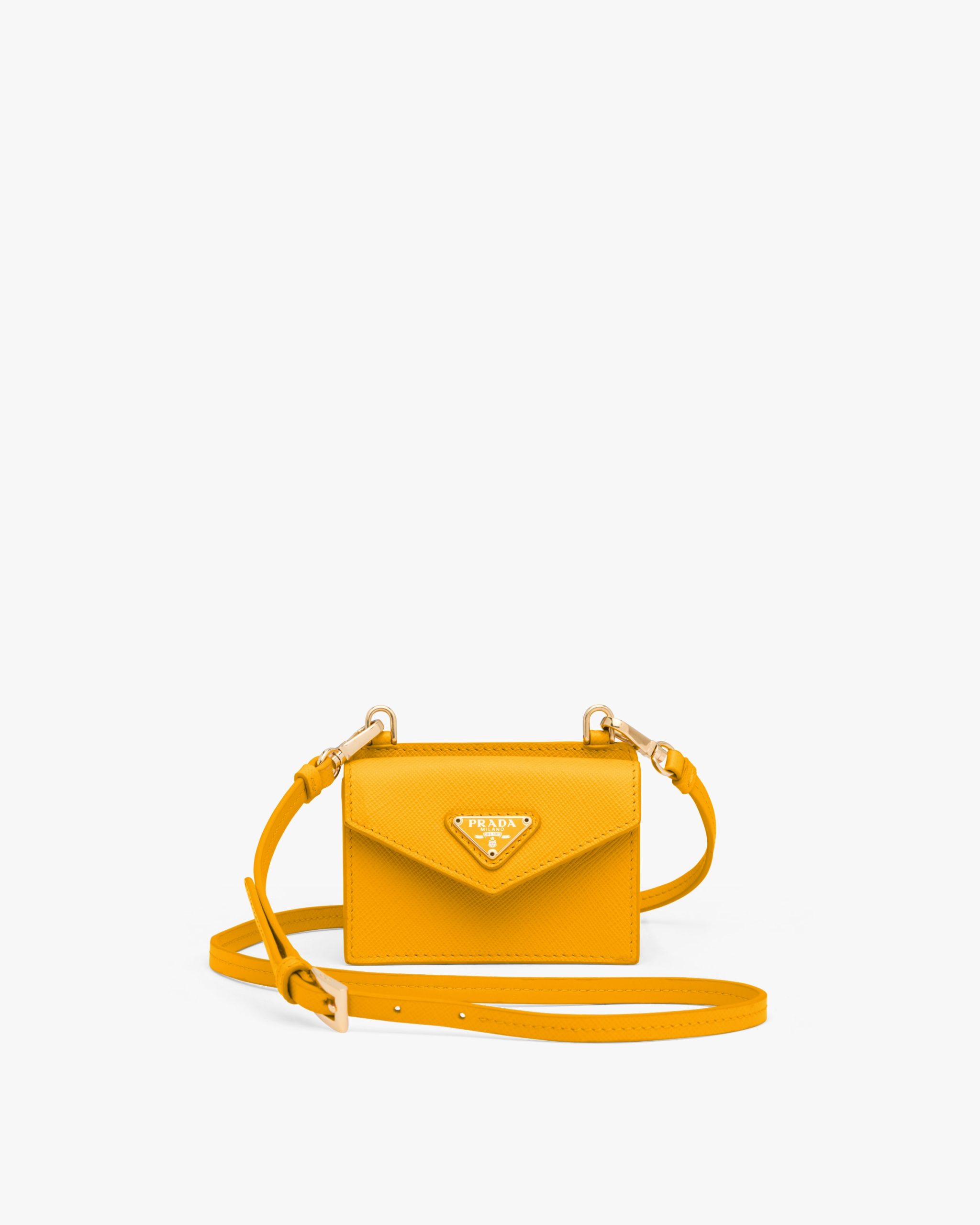 This Saffiano leather card holder comes with a shoulder strap. The triangle logo2 decorates the accessory.