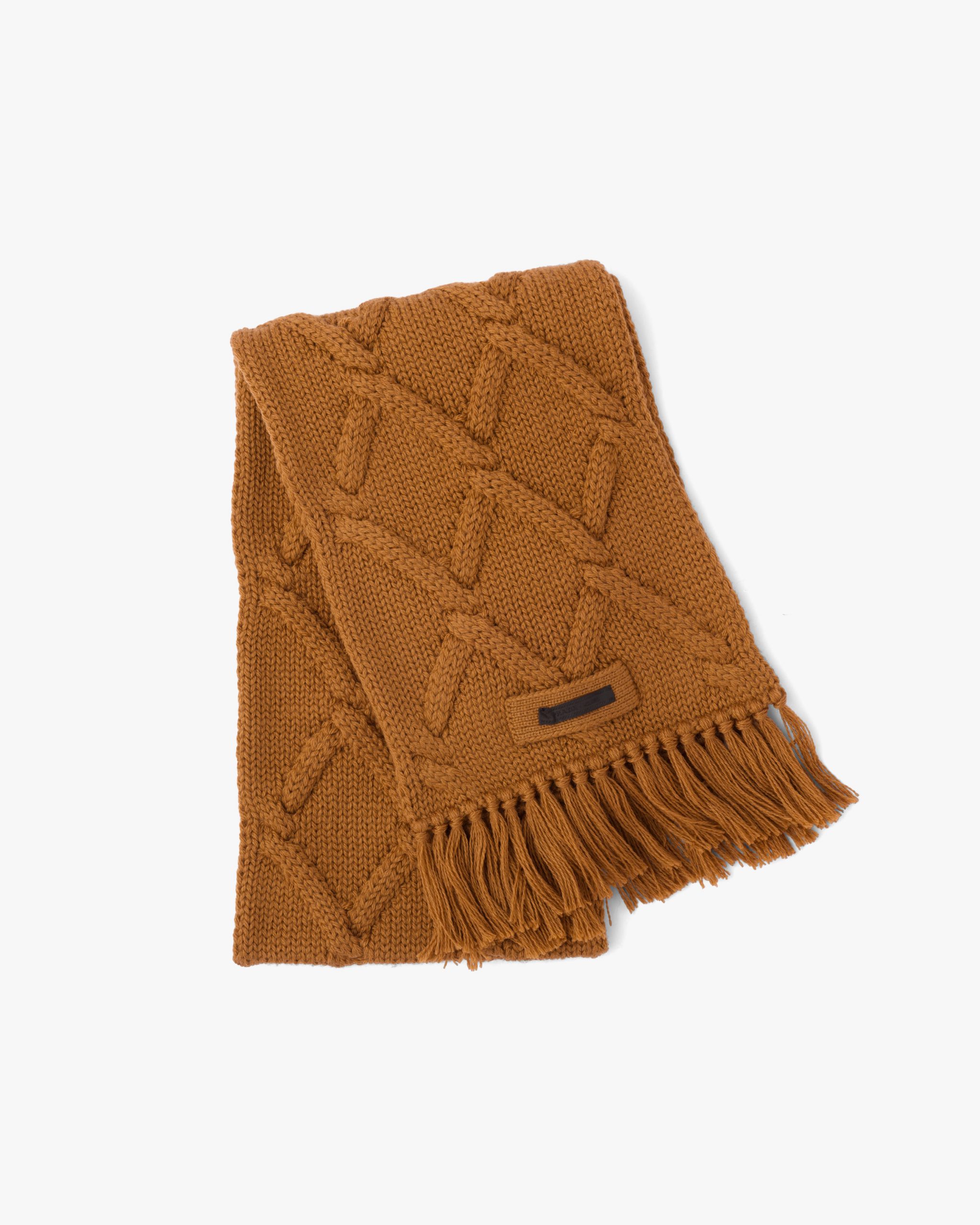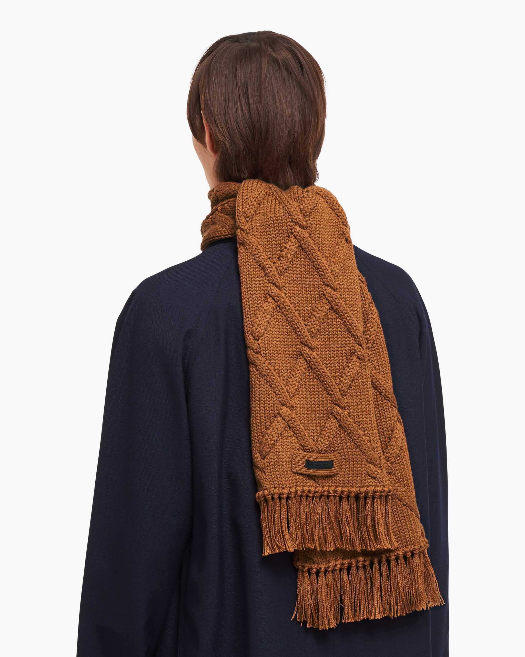 This scarf made of soft wool with a jacquard motif is decorated with the sartorial label and has fringe on the edges.