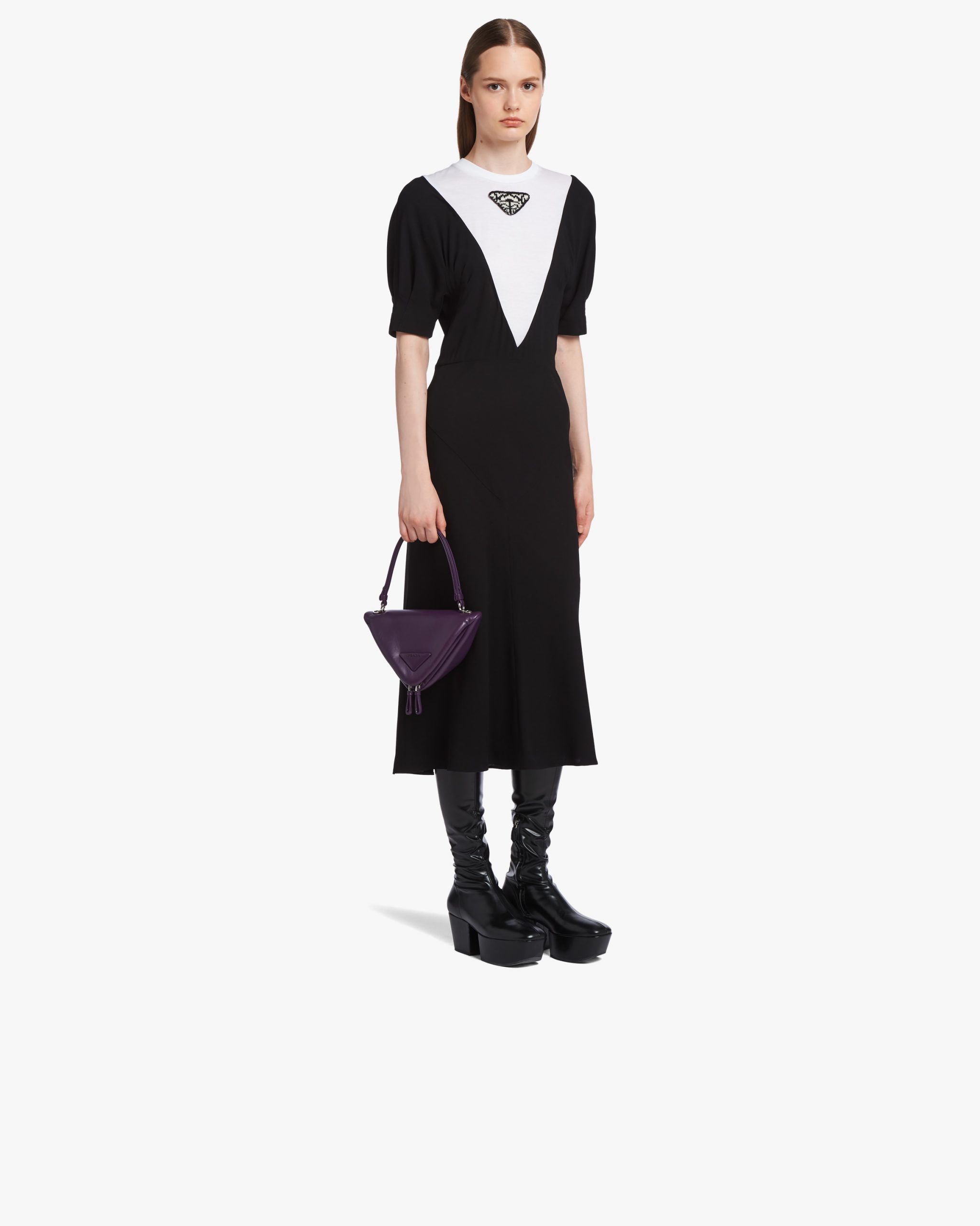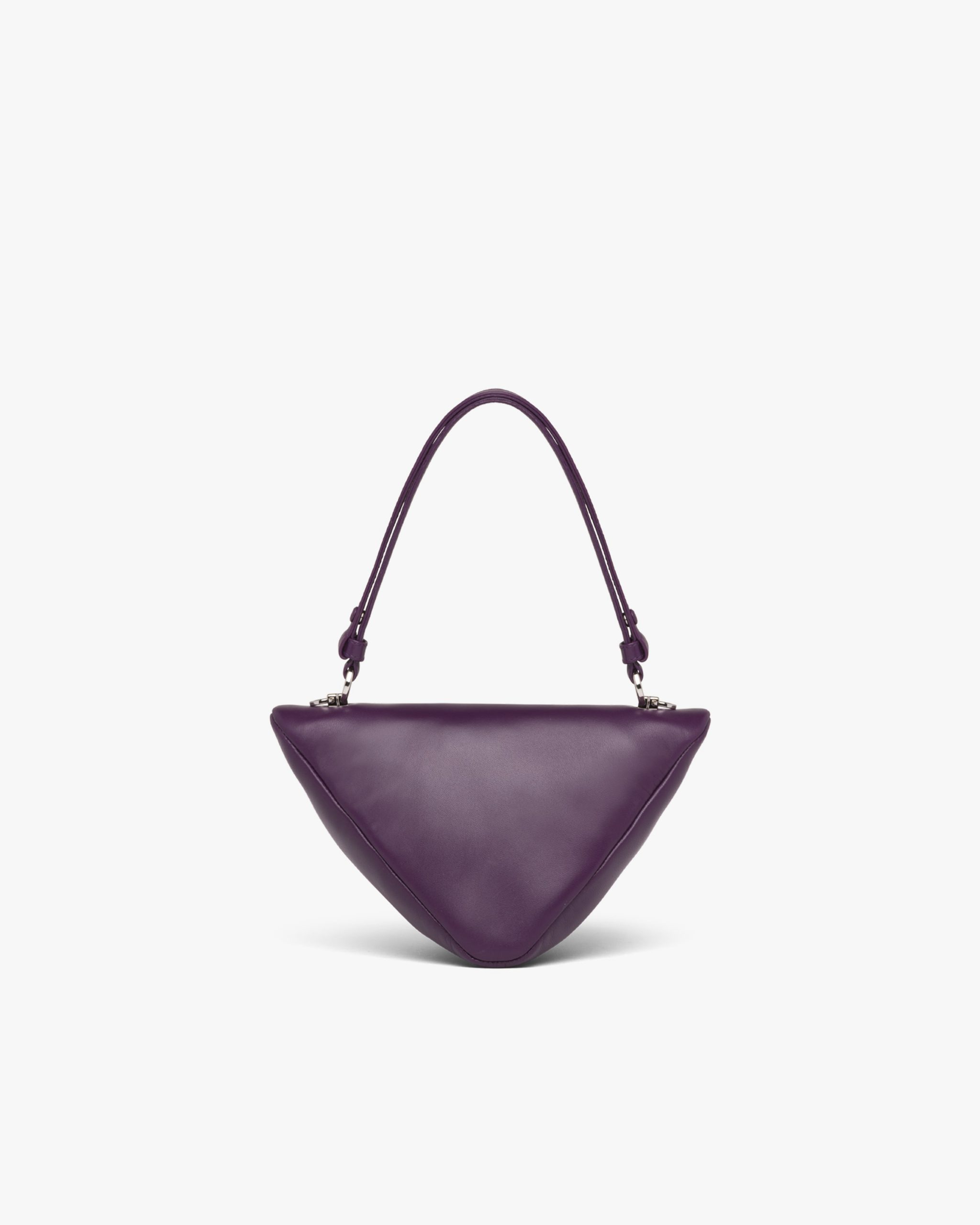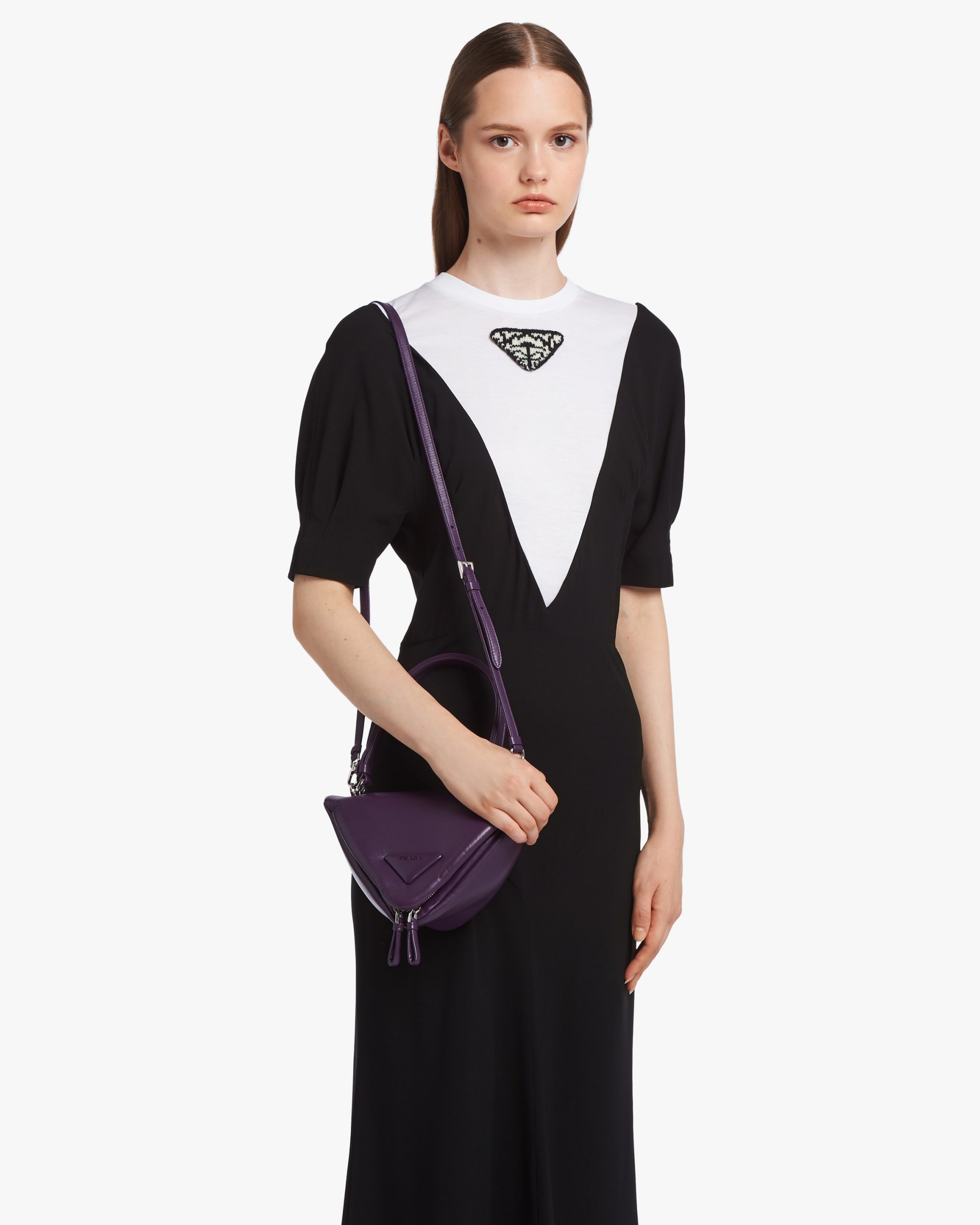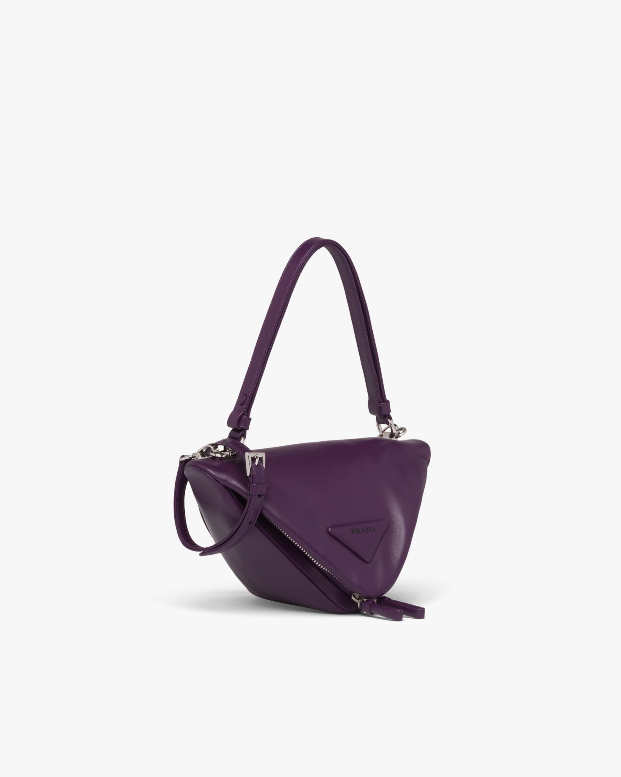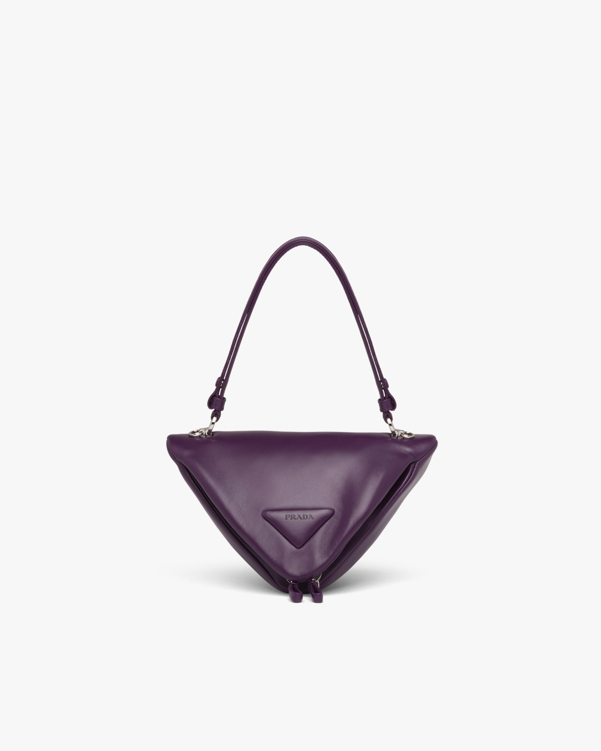 A study of the triangle inspires new geometric details and unique interpretations of the historic Prada logo2. The iconic shape is reworked in the design of this handbag with soft reverse stitch construction, completed by a handle and detachable shoulder strap that lets it be worn in different ways.
