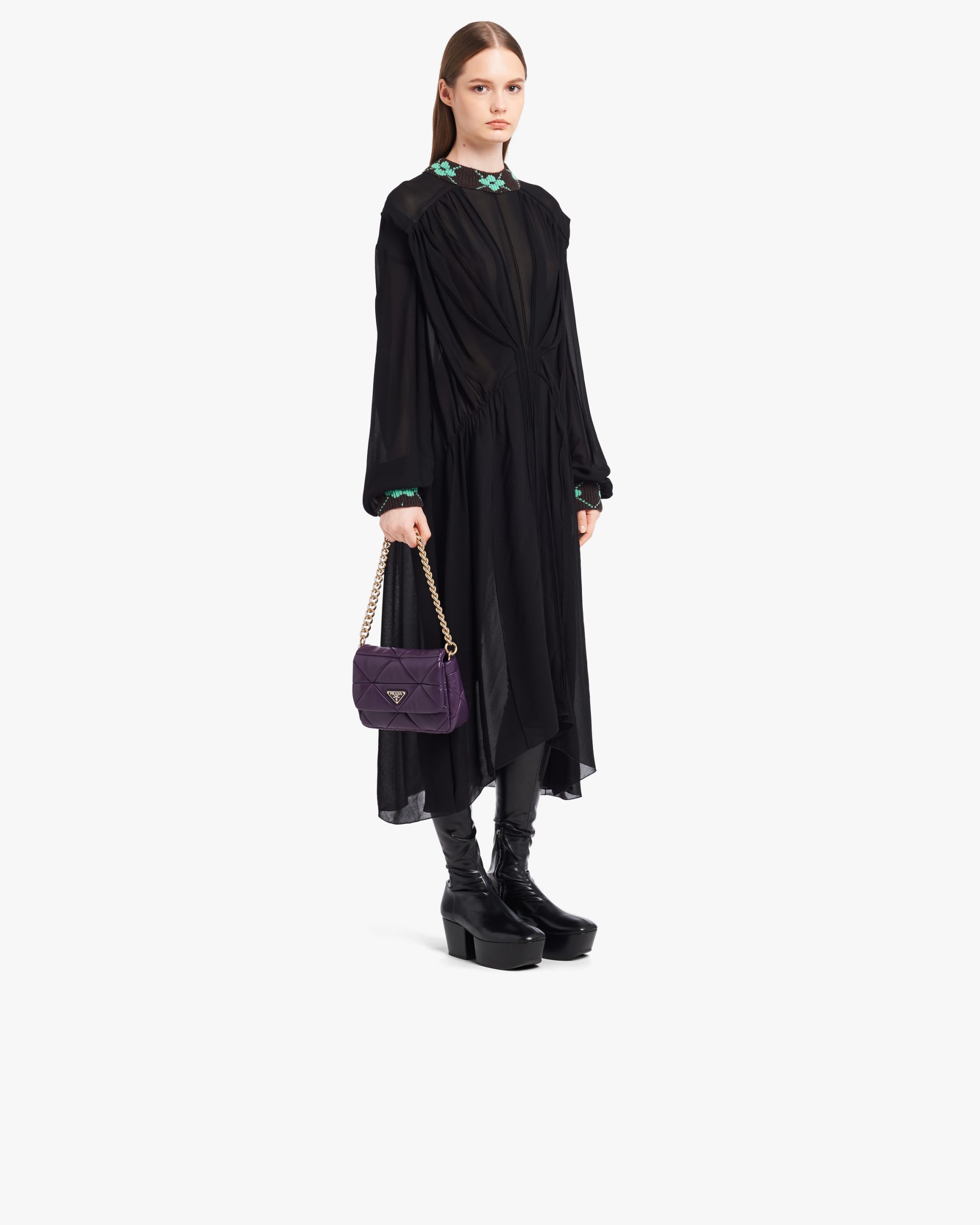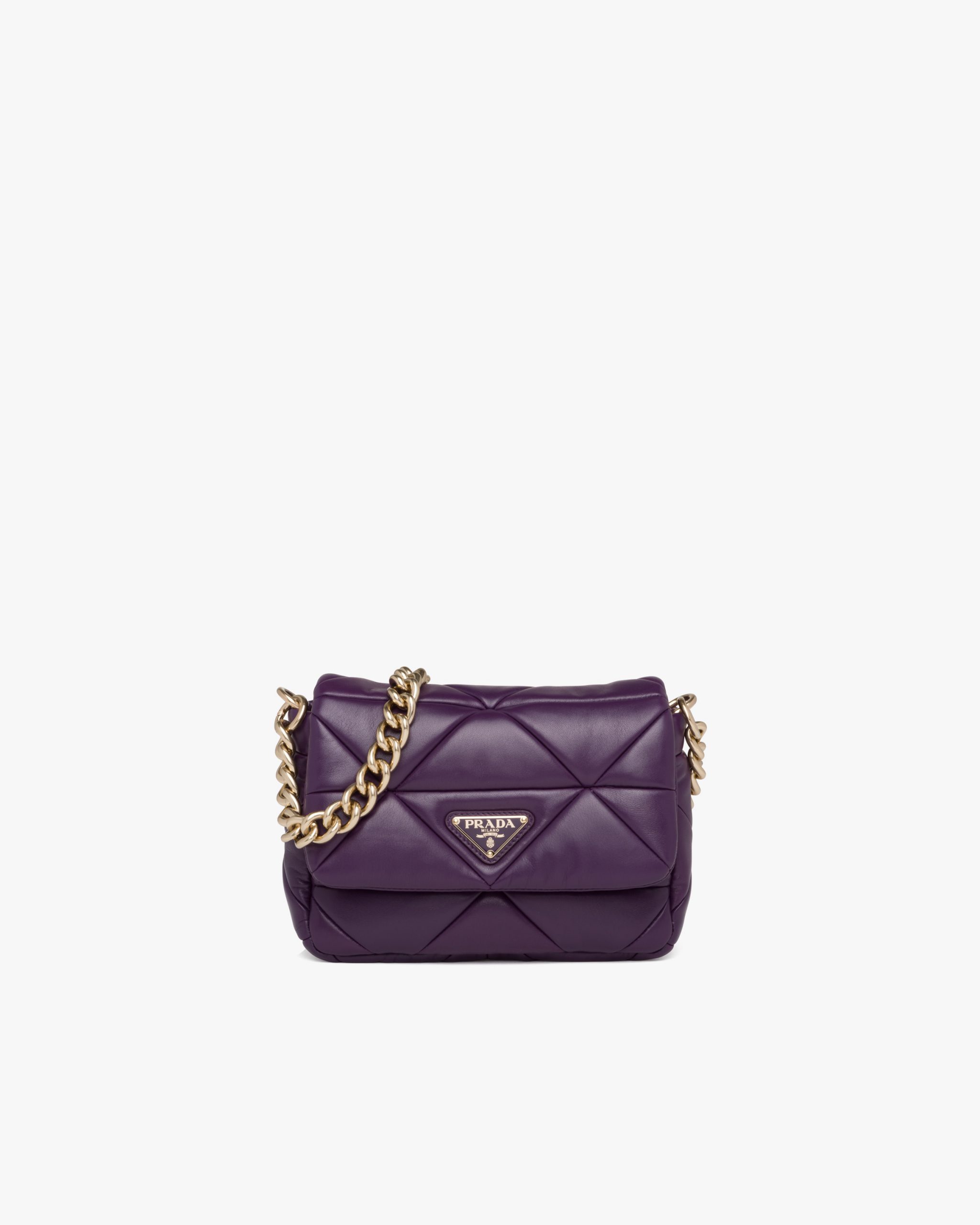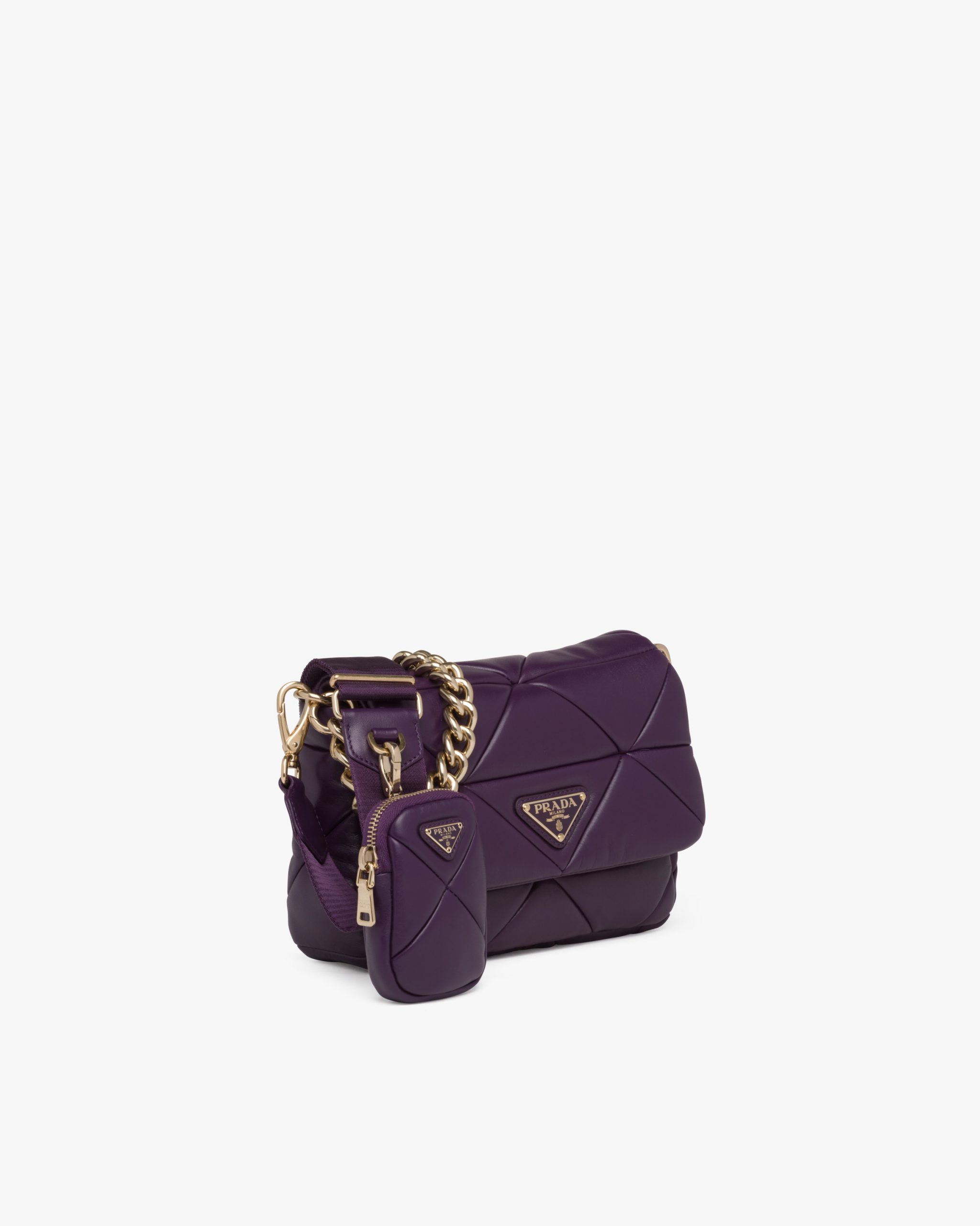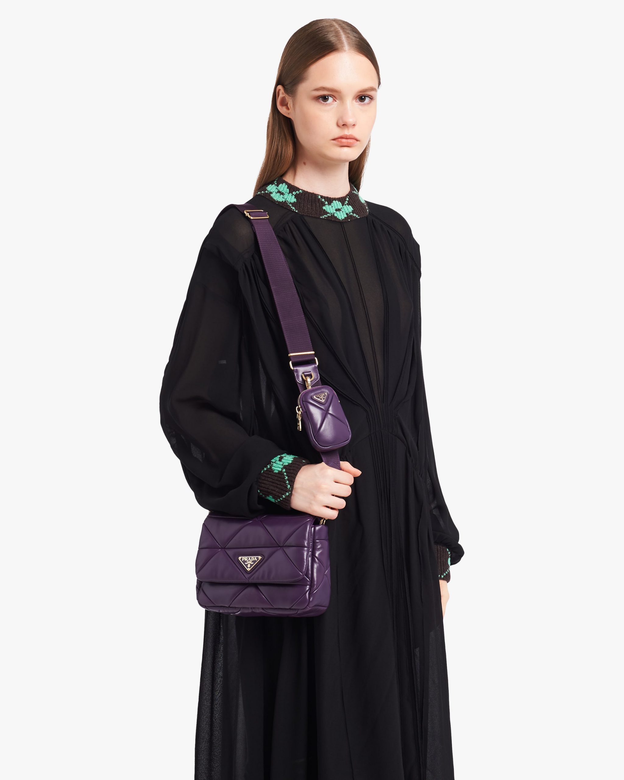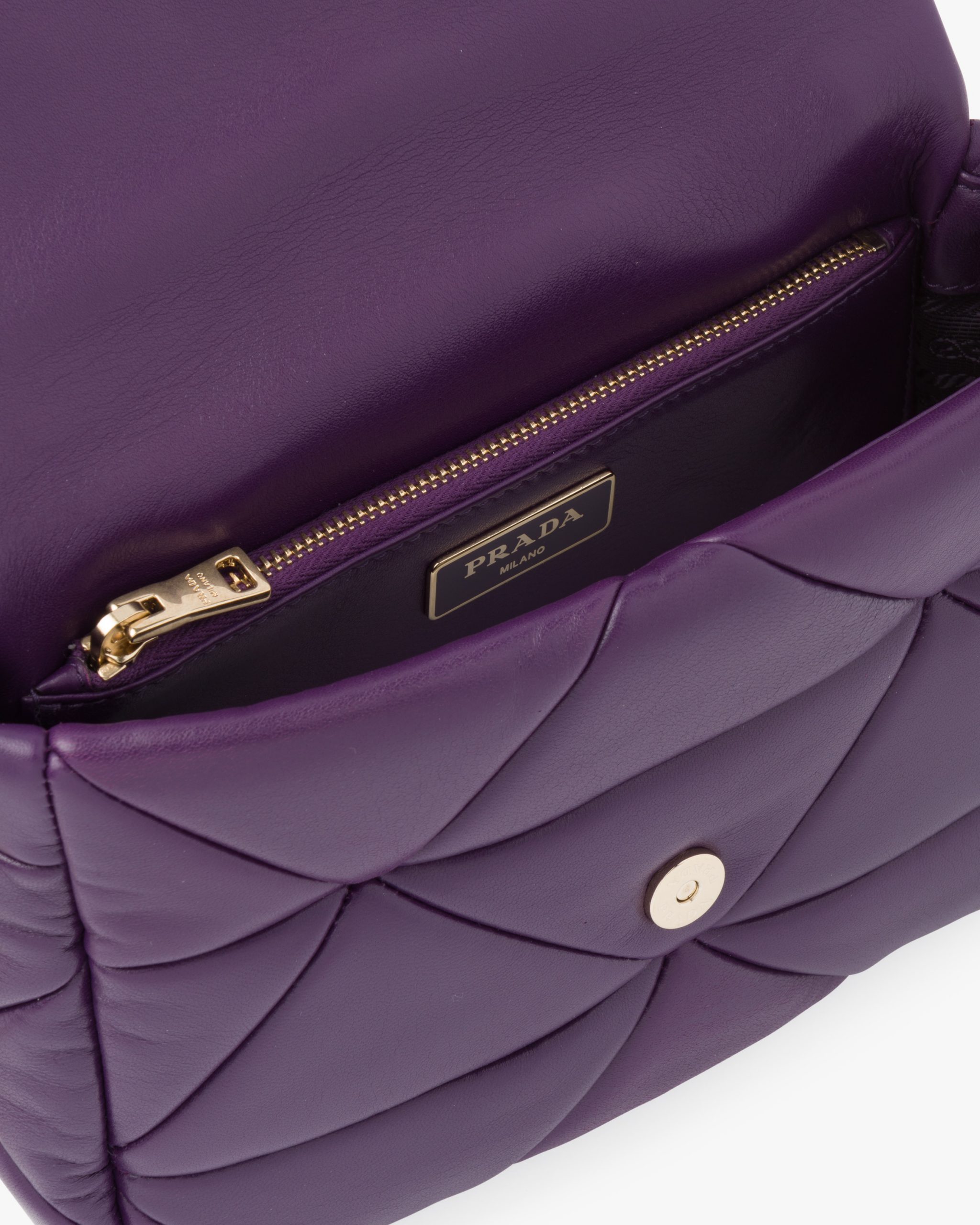 Reinterpreted in always new ways, Prada’s iconic triangle appears in the stitched perforated motif of this shoulder bag in soft leather, creating a patchwork pattern. A removable mini-pouch, a distinctive element among the brand’s accessories, completes the shoulder bag and adds a contemporary, versatile note to the style.