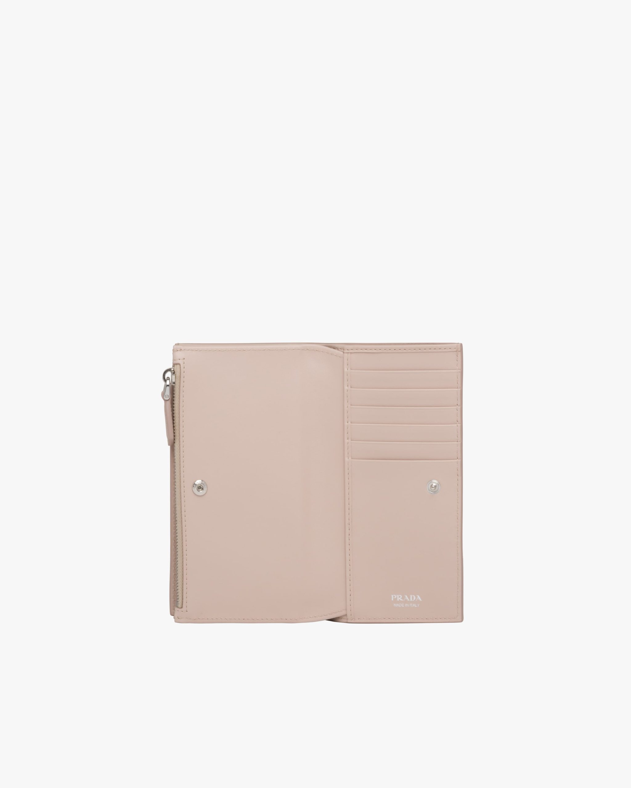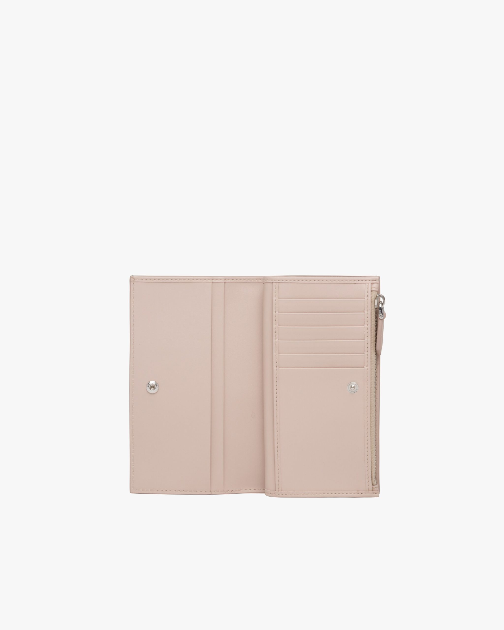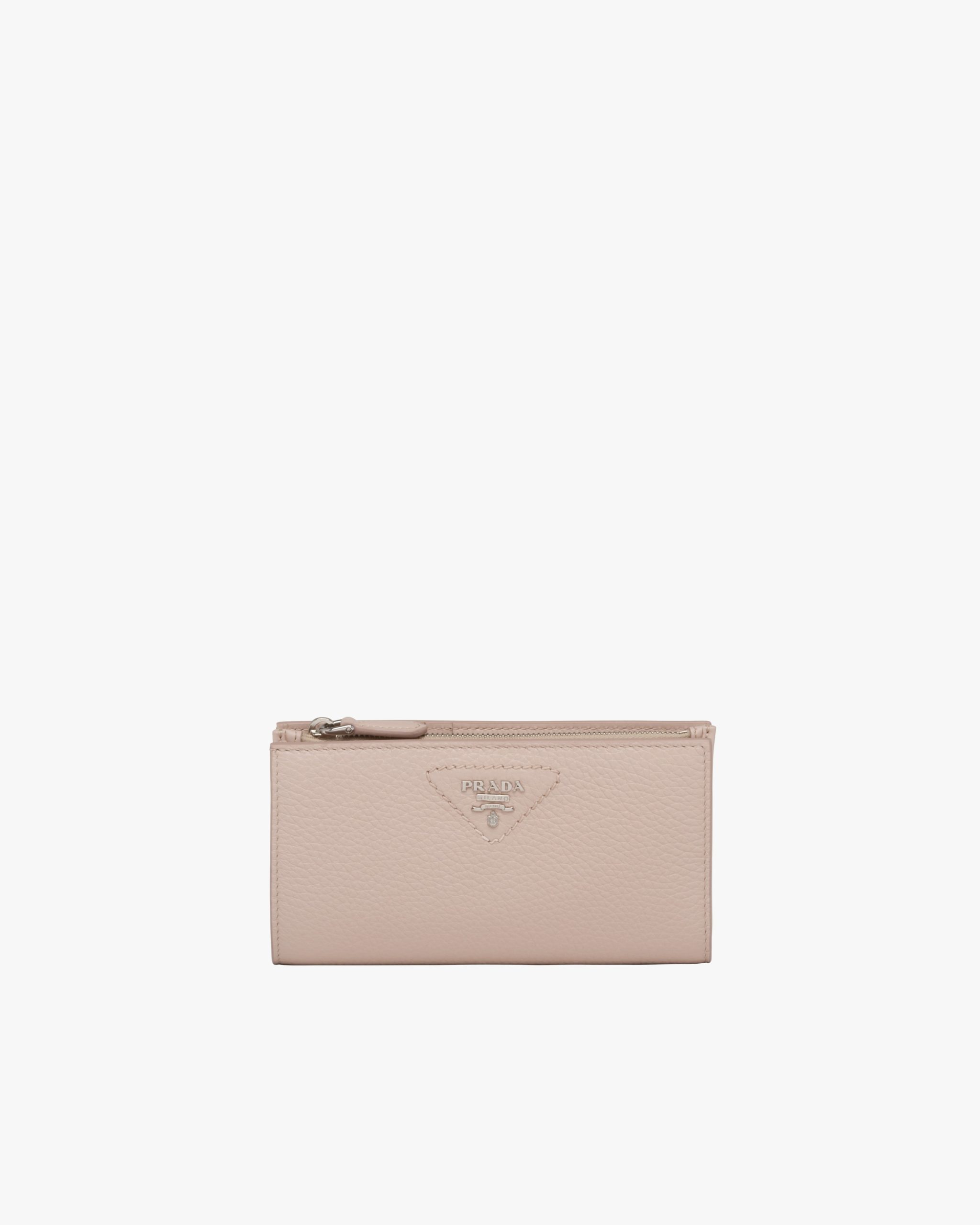 This large leather wallet has several internal pockets and card slots. The accessory is decorated with the metal lettering logo2.