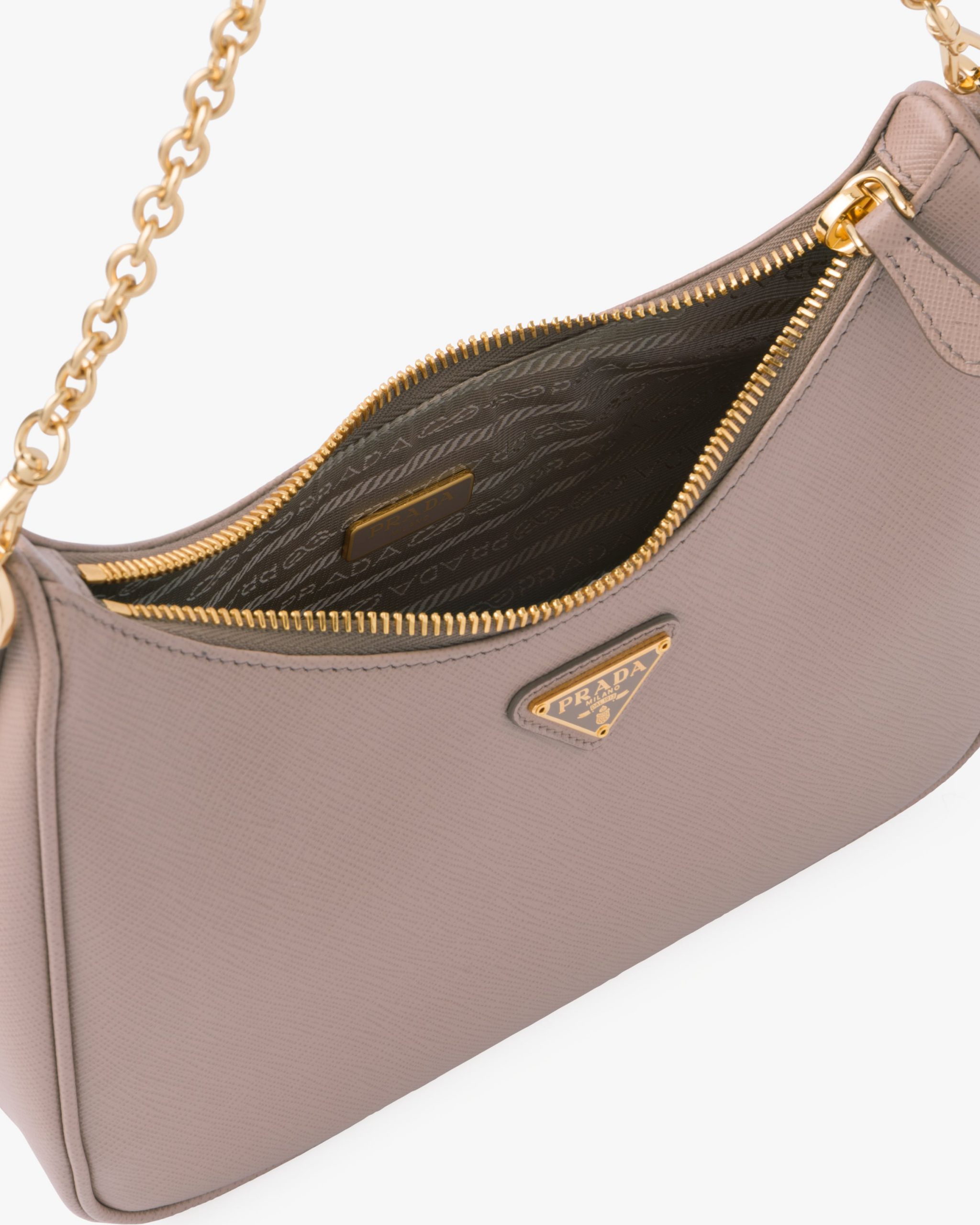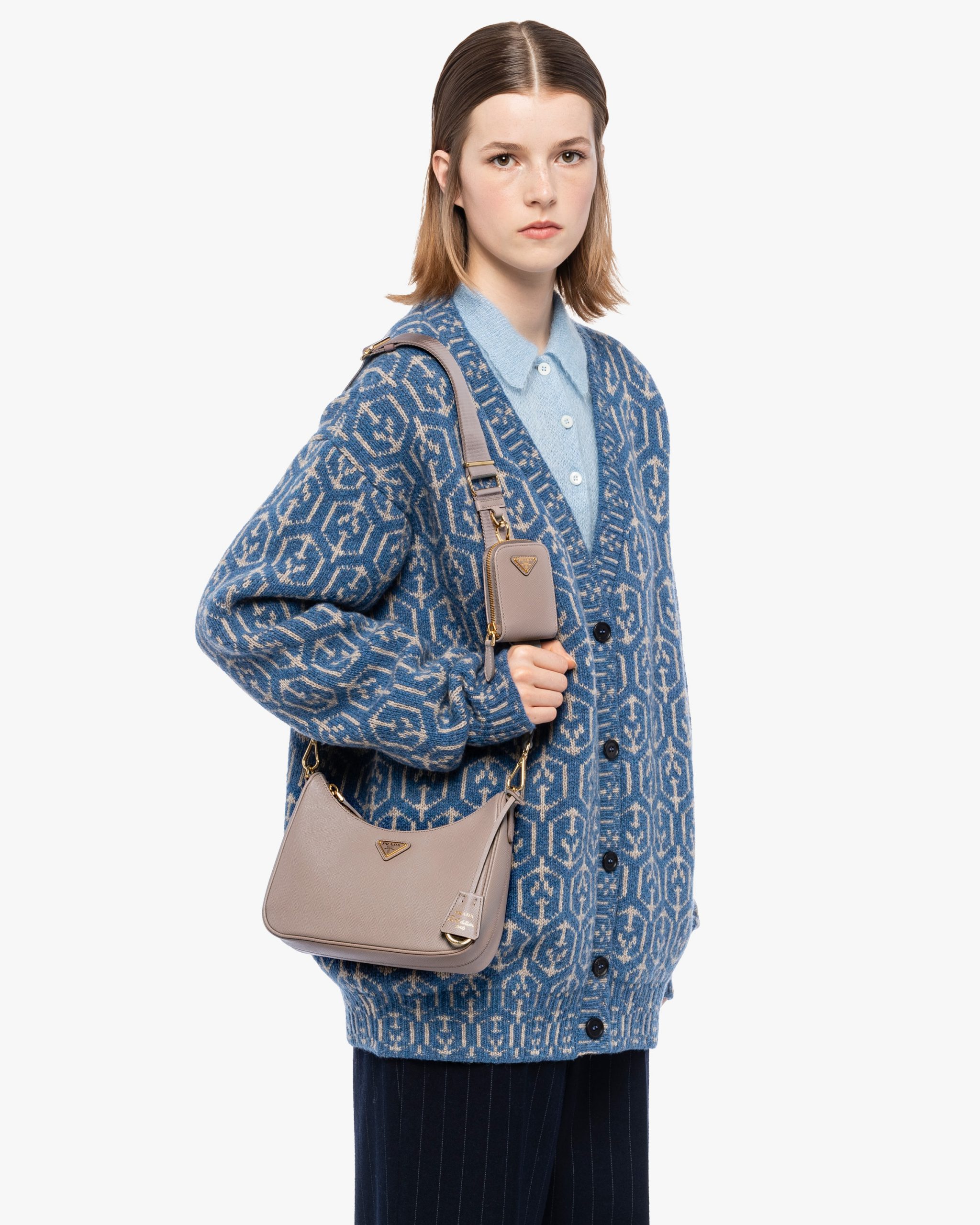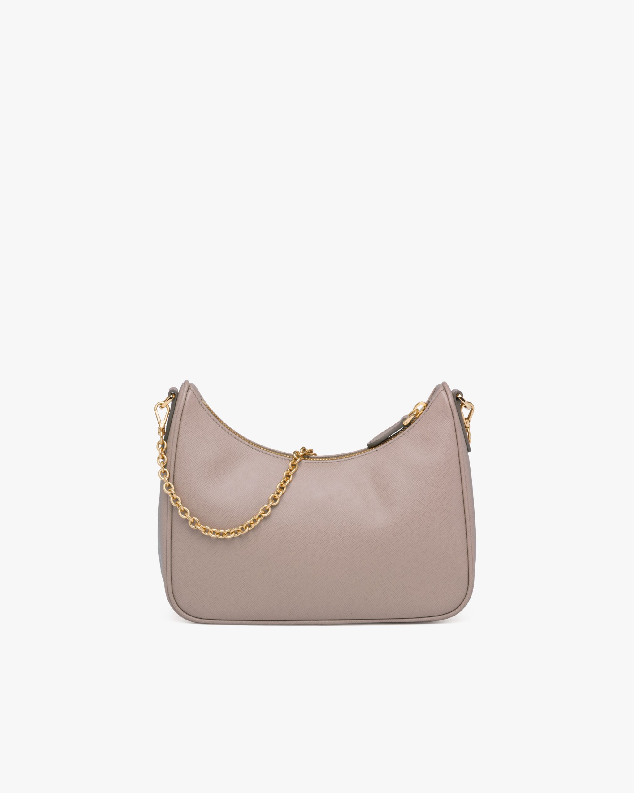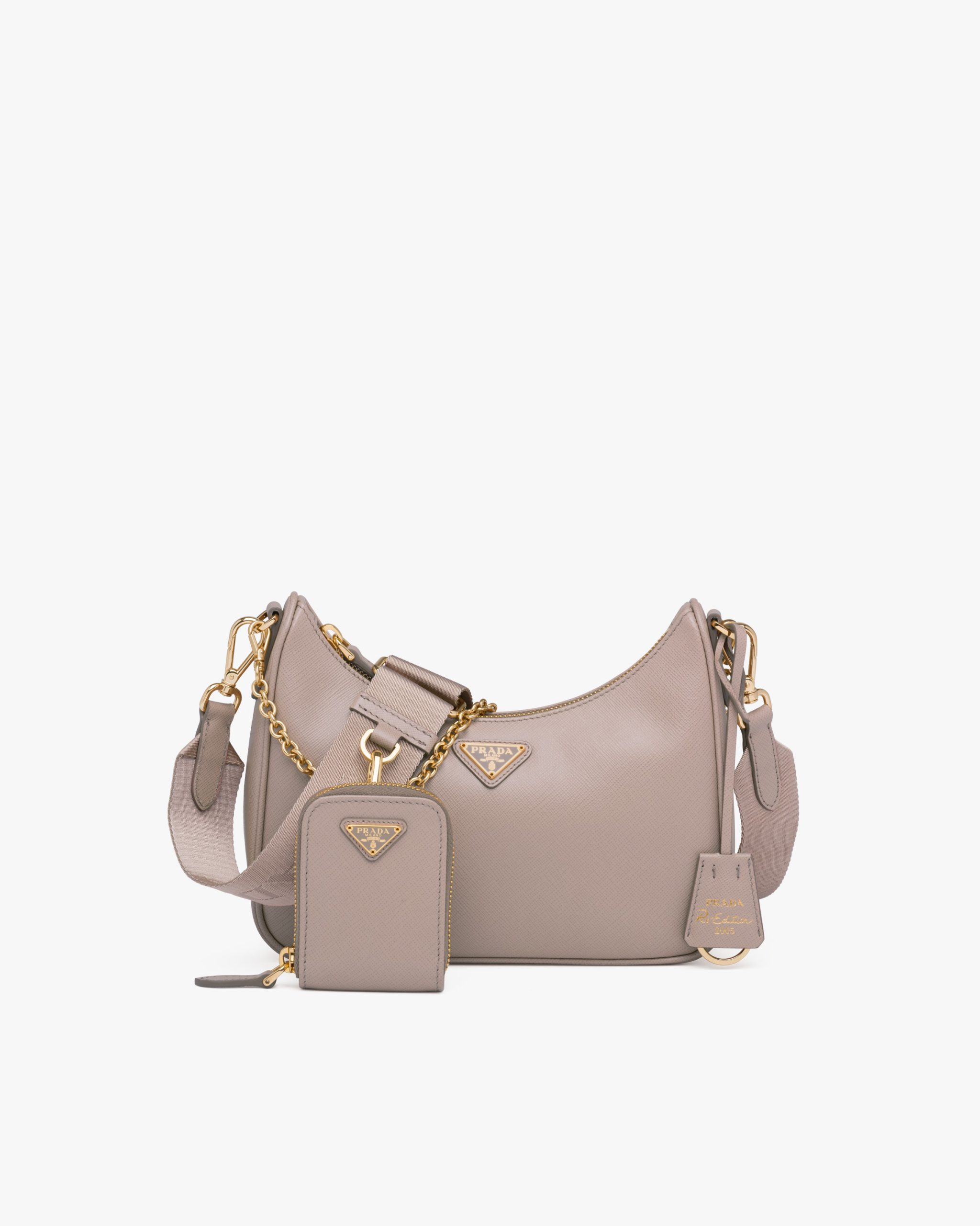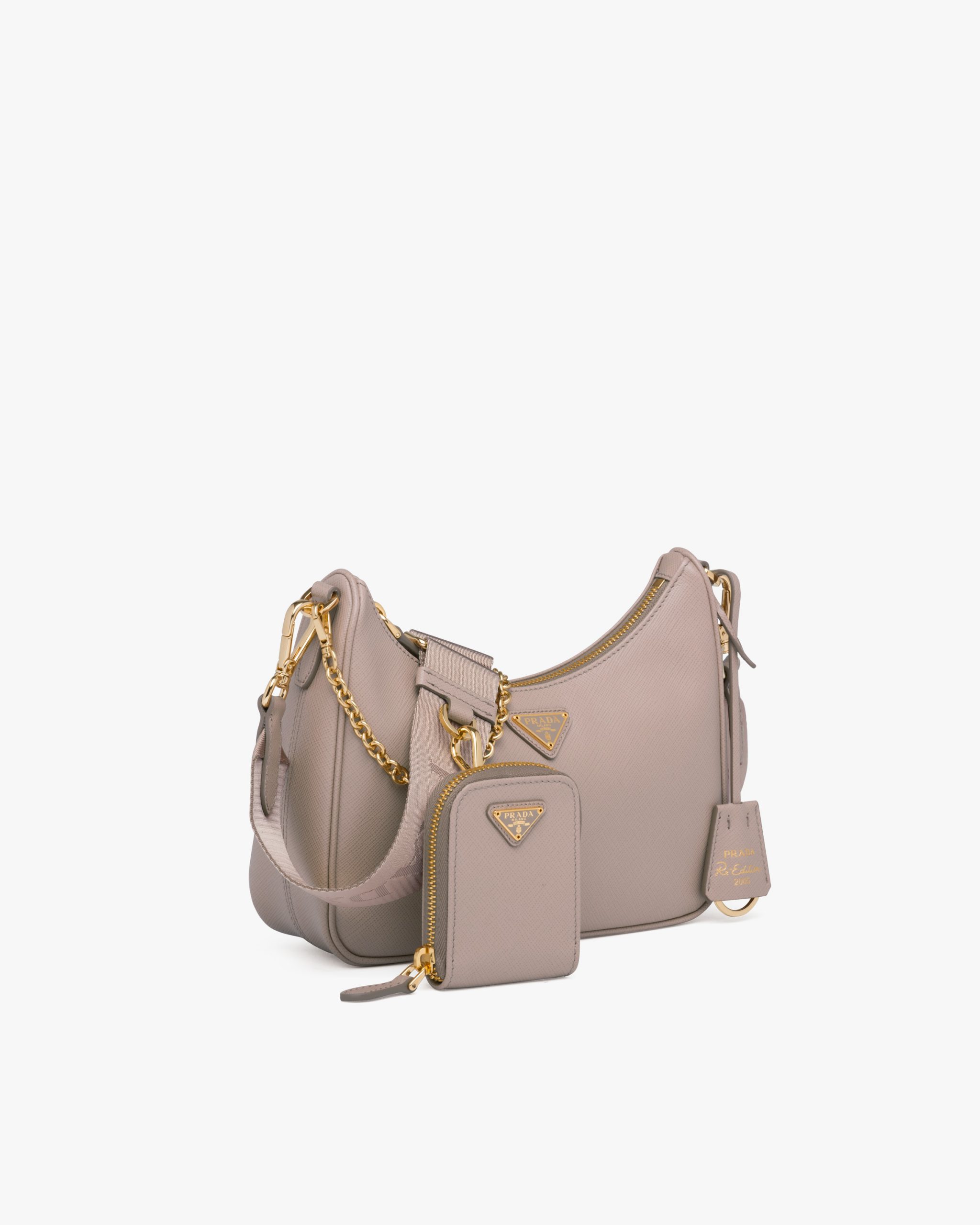 An iconic silhouette with sophisticated details that enhance the design: Prada transforms the classic shoulder bag, reinterpreting it in Saffiano leather with a cross-hatch motif that is a hallmark of the brand. The accessory is completed by a removable leather pouch and Re-Edition keychain, making the bag unique and functional.