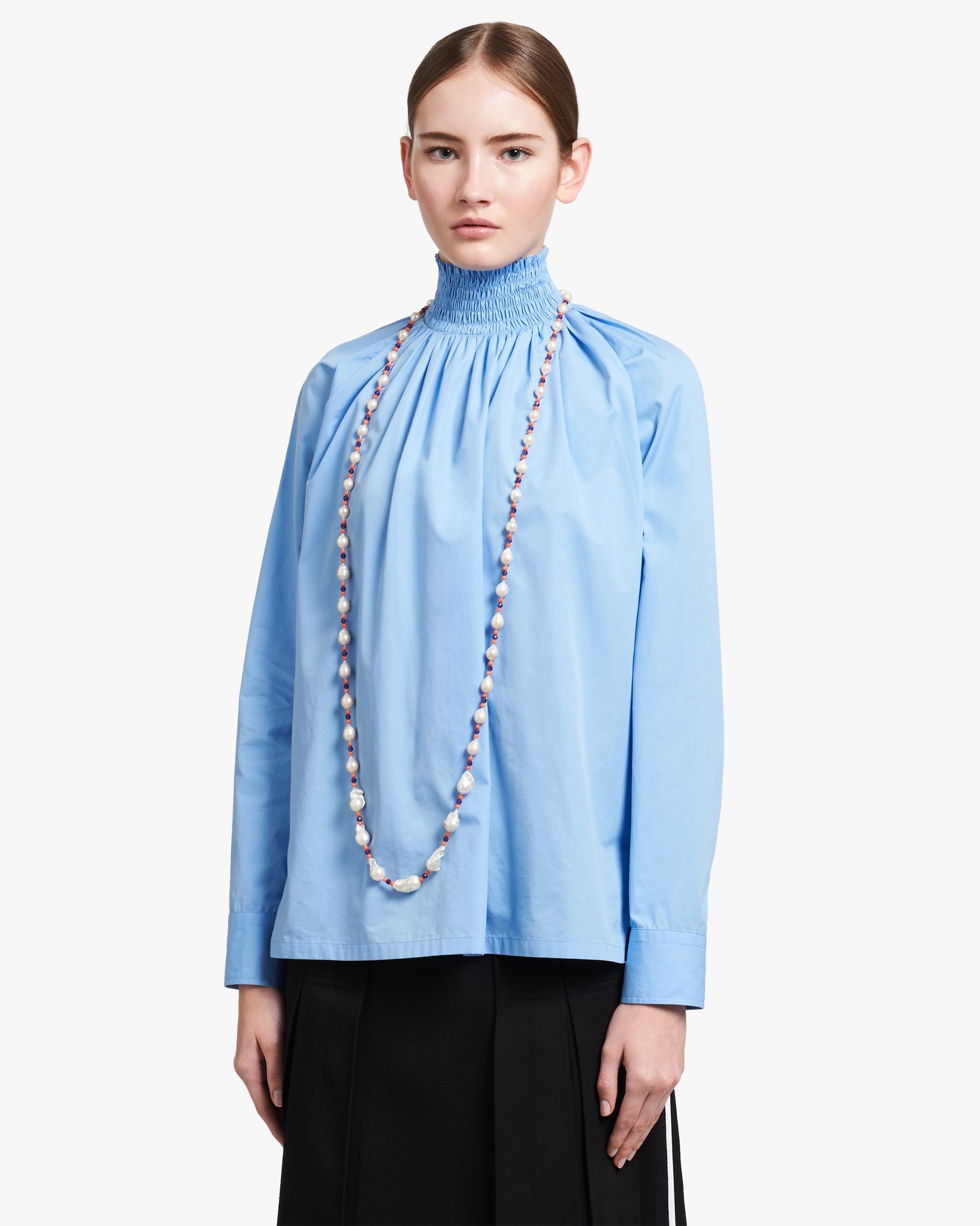 Colored by citrine and sky blue topaz beads, this gold necklace is decorated with baroque pearls.
