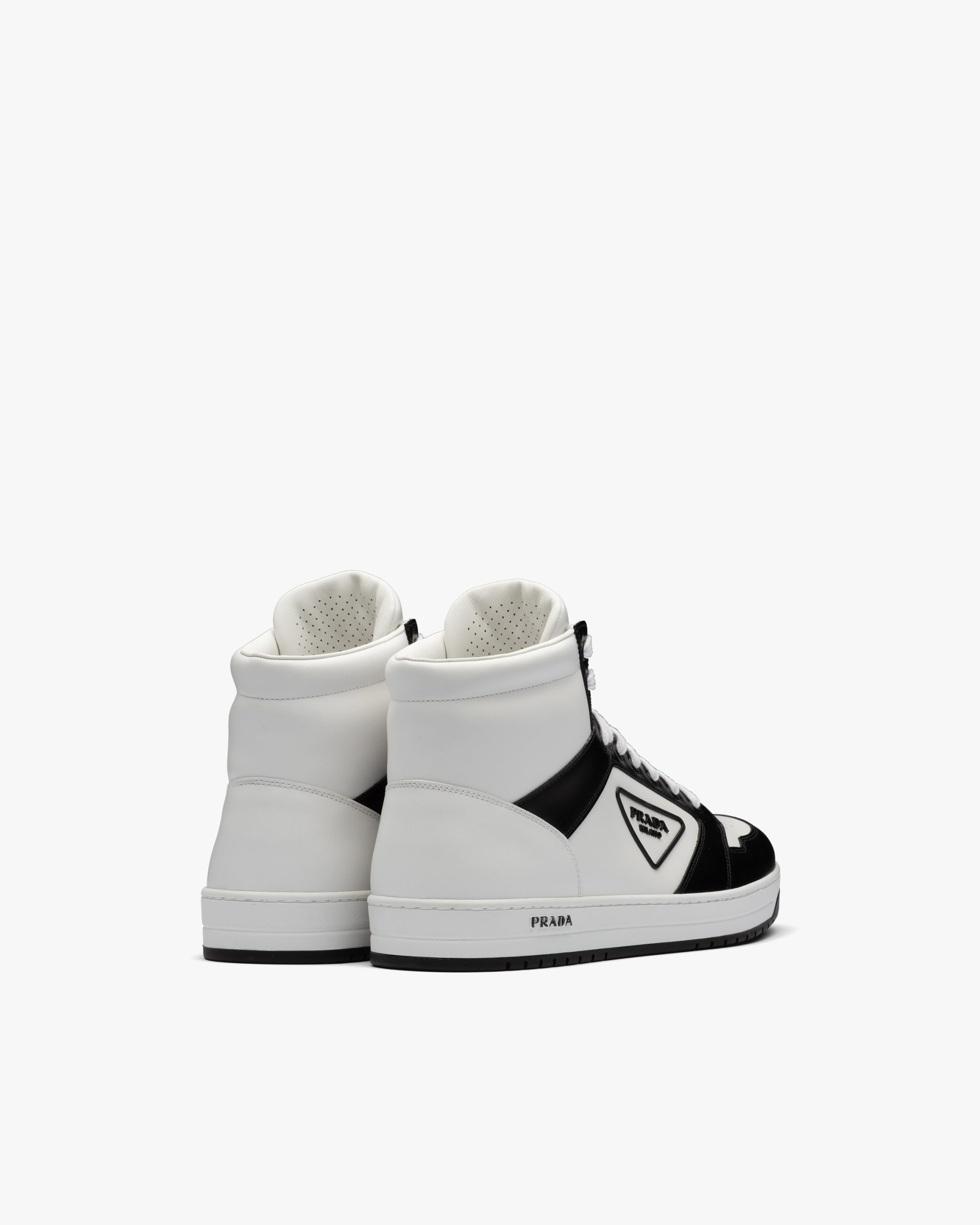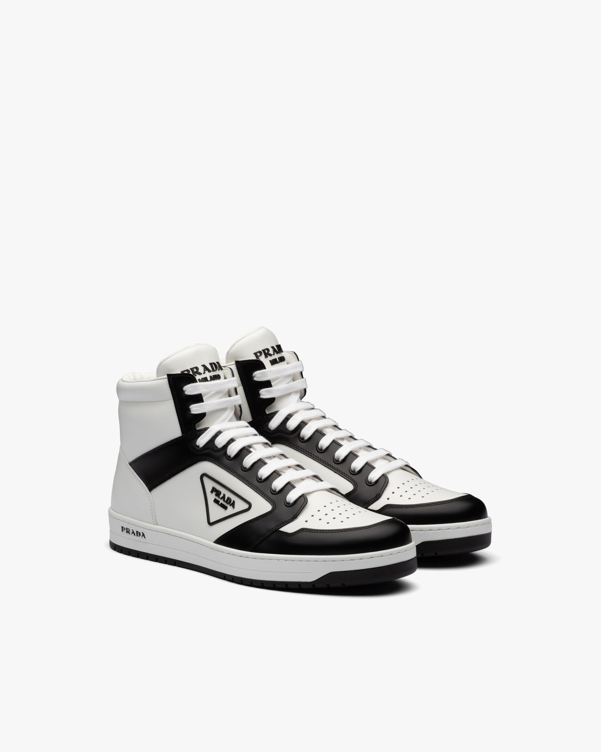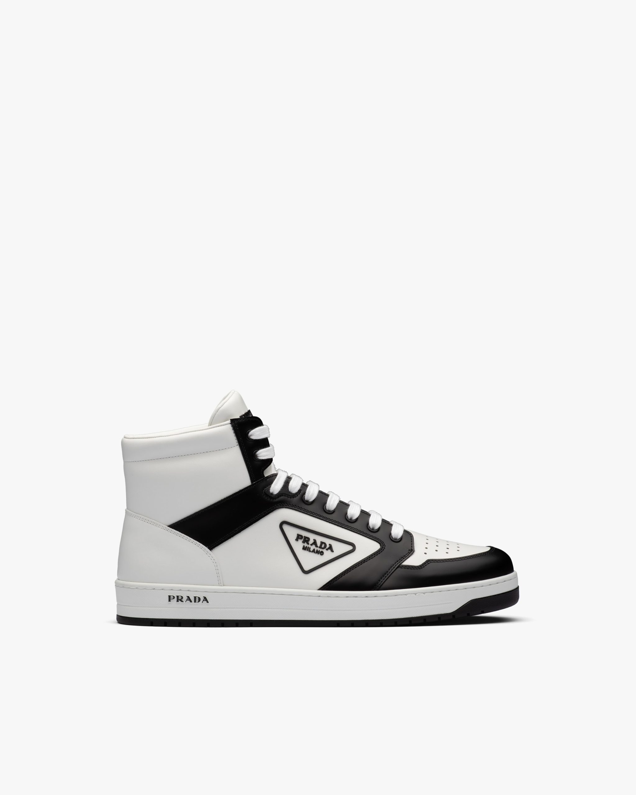 These sporty leather high-top sneakers are accented with different interpretations of the Prada logo2 that appears on the tongue, along the light rubber sole, and as a rubber triangle decorating the side of the ankle.