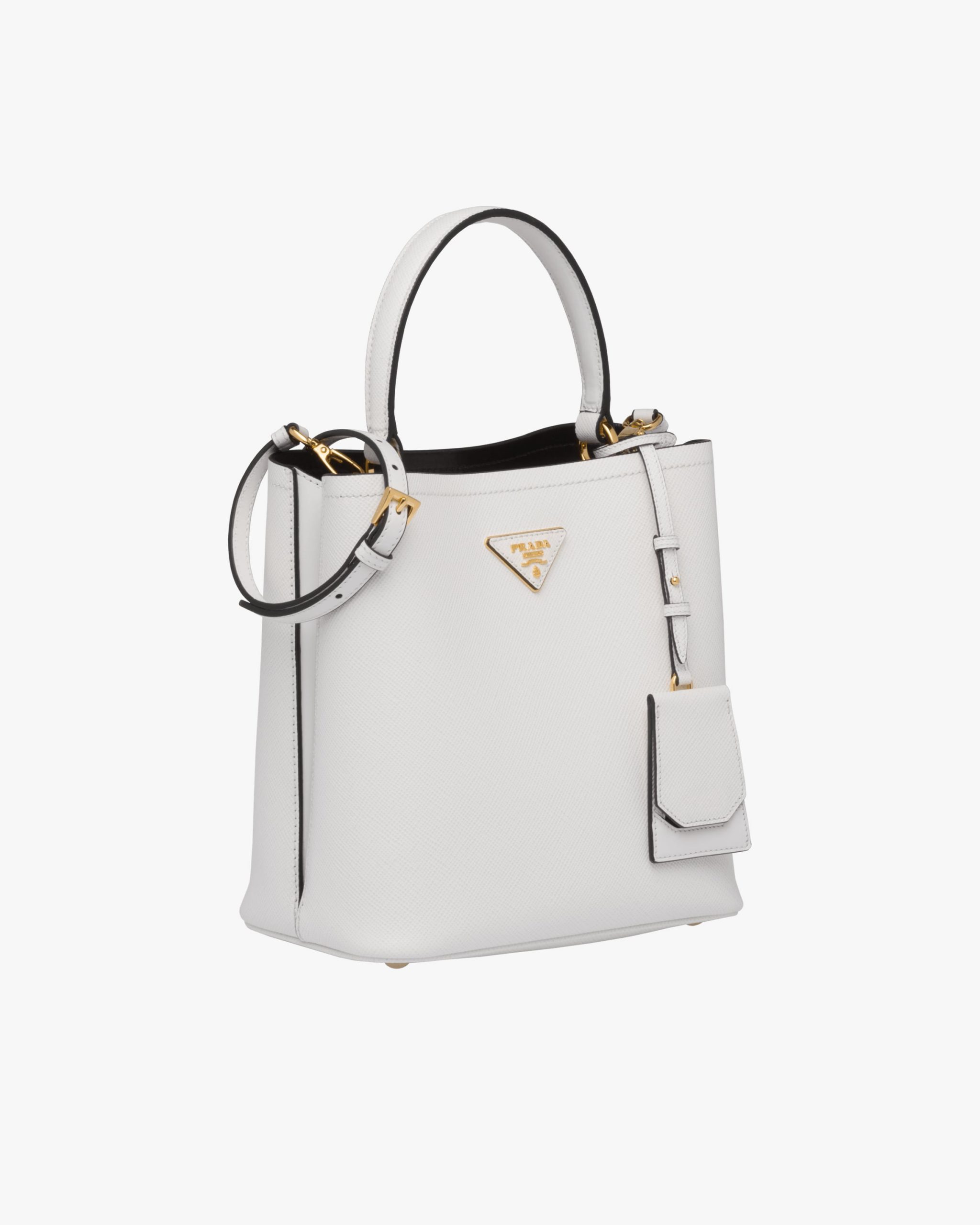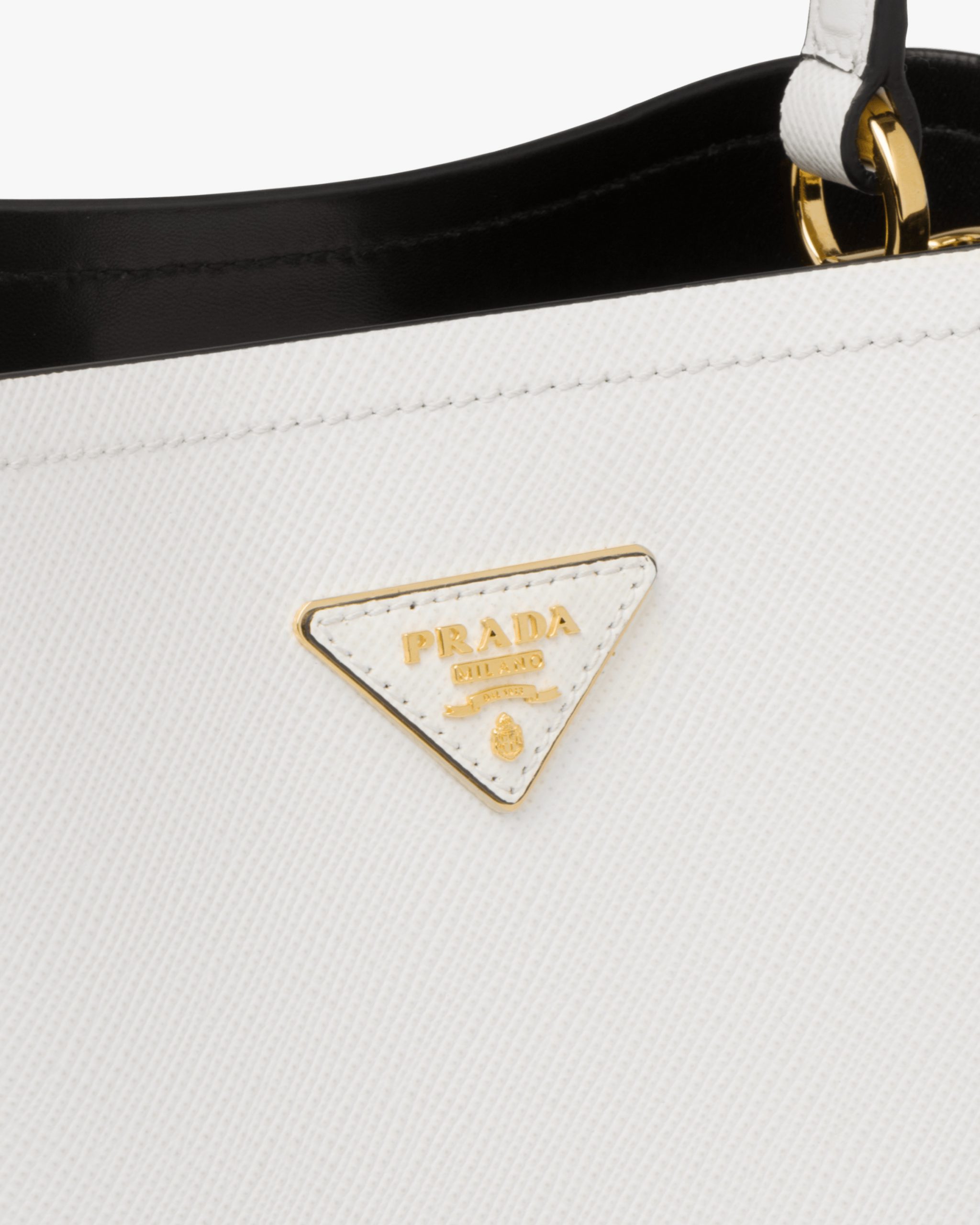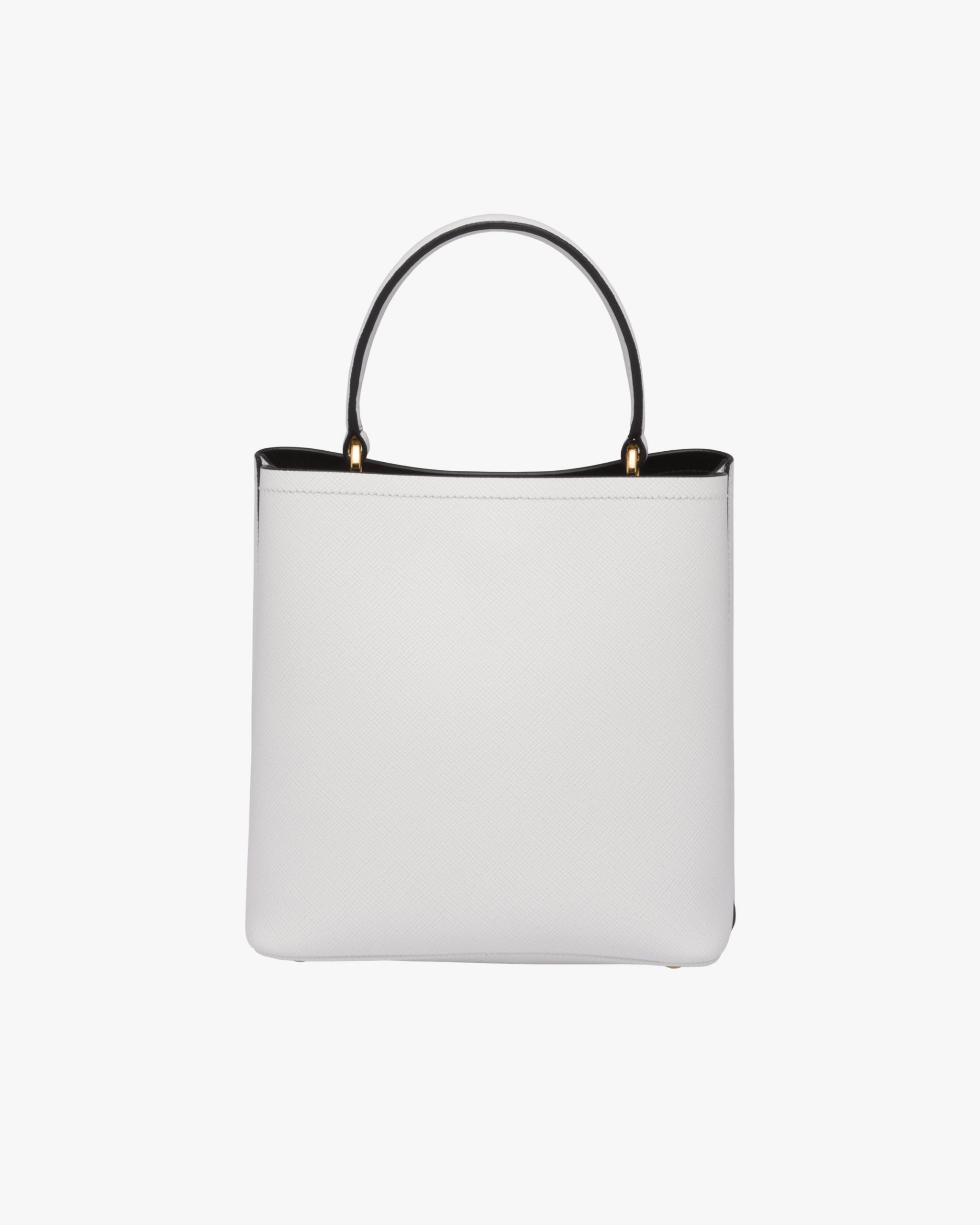 The elegant design of the Prada Panier bag is emphasized by the unmistakable texture of Saffiano leather. The bag has a detachable shoulder strap and an exclusive leather name tag with metal logo2.
