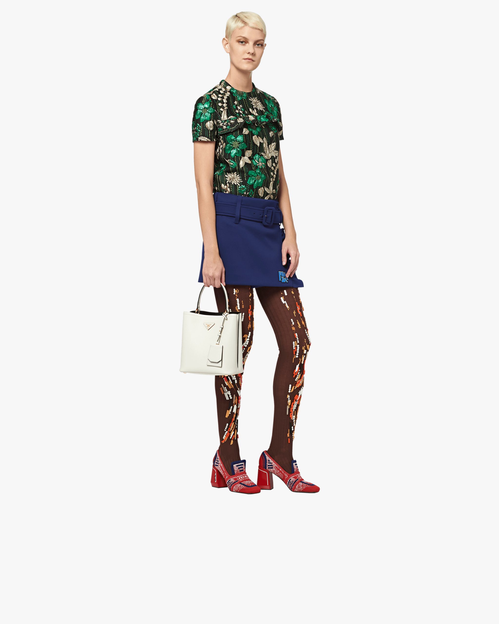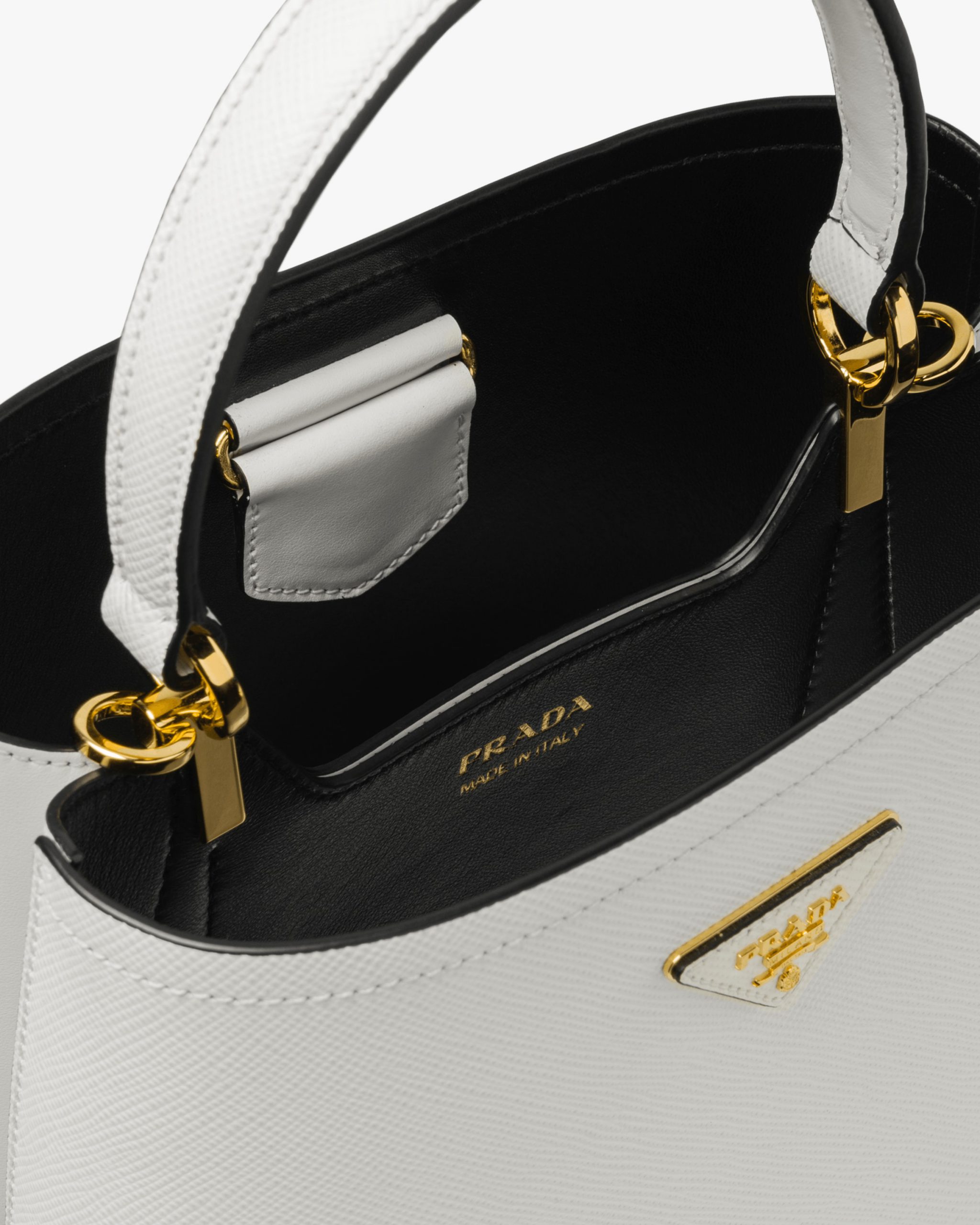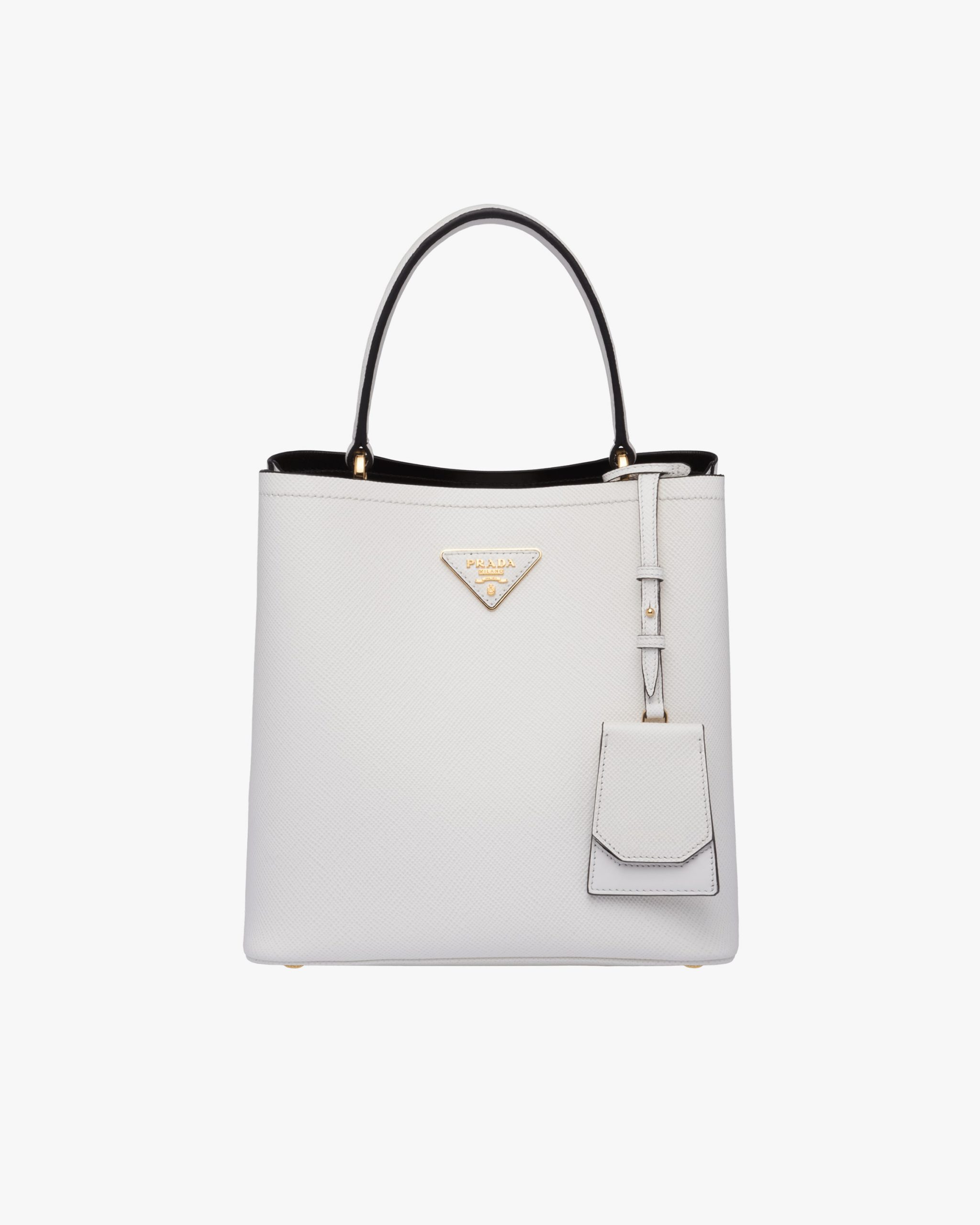 The elegant design of the Prada Panier bag is emphasized by the unmistakable texture of Saffiano leather. The bag has a detachable shoulder strap and an exclusive leather name tag with metal logo2.