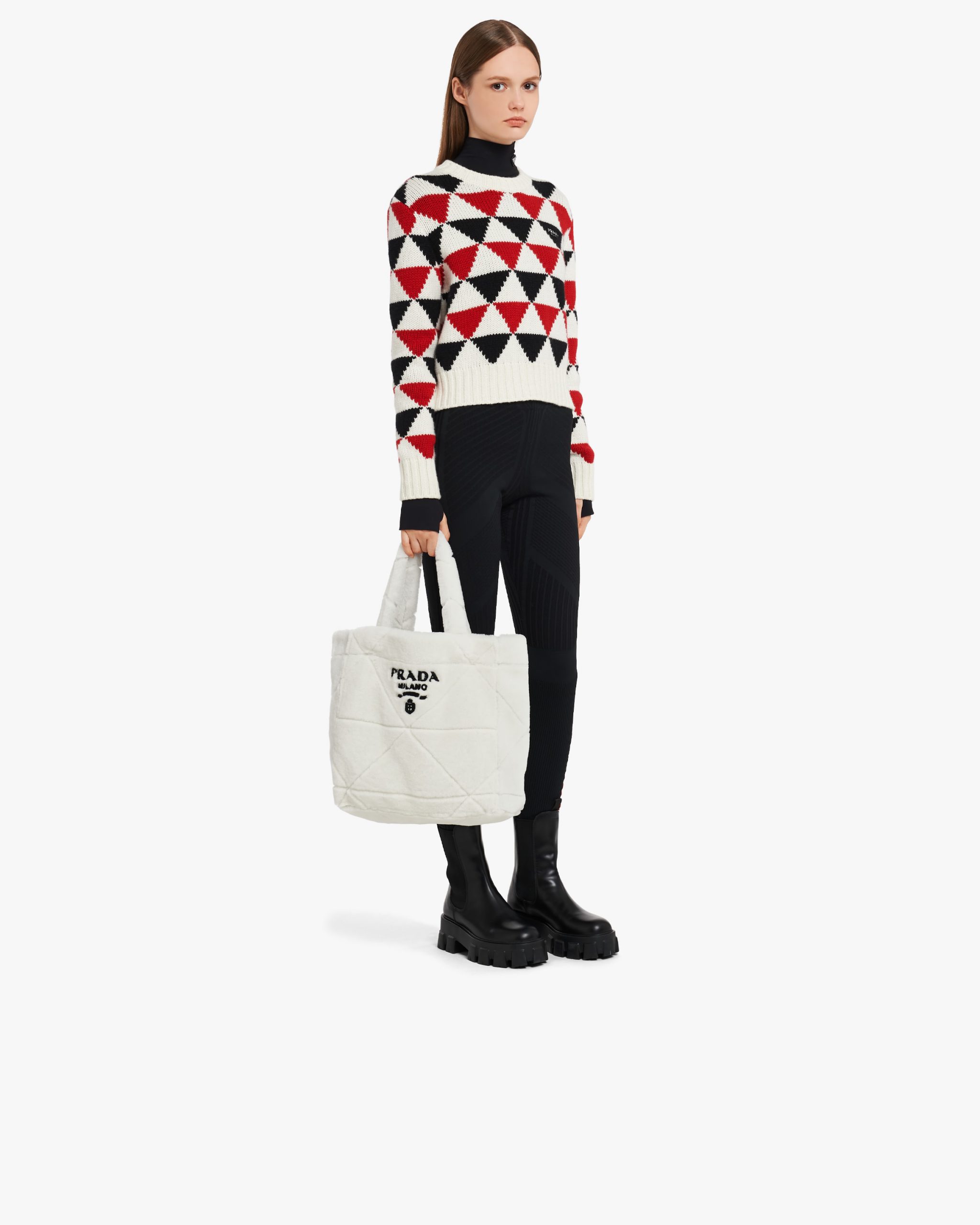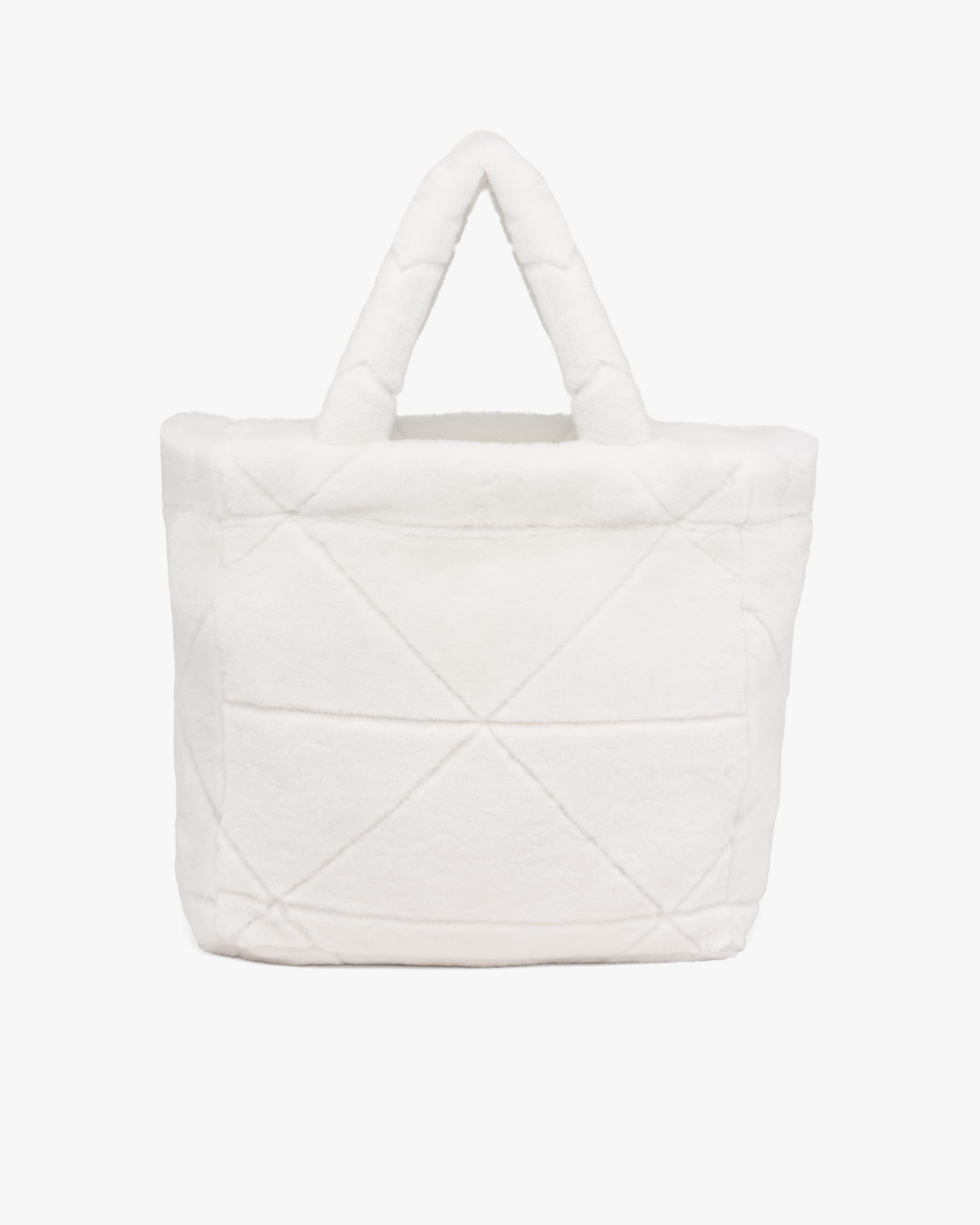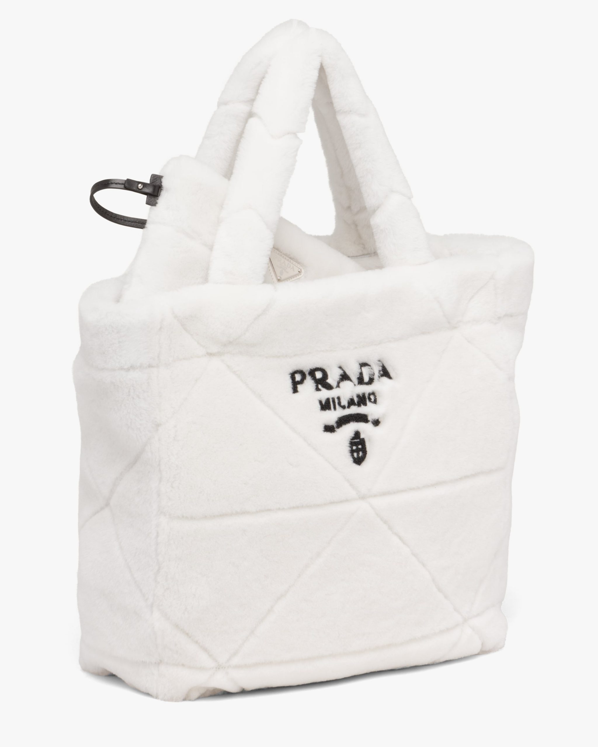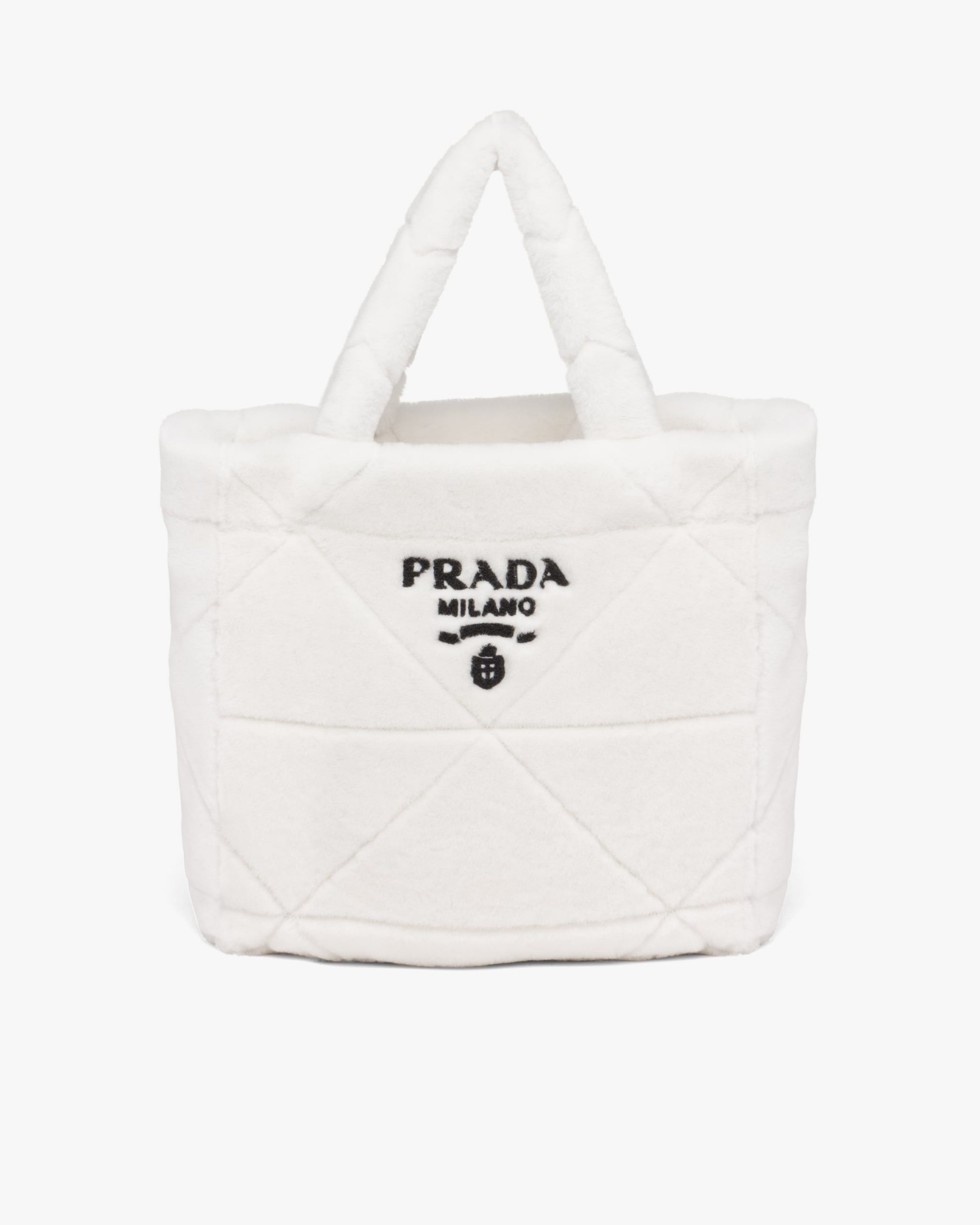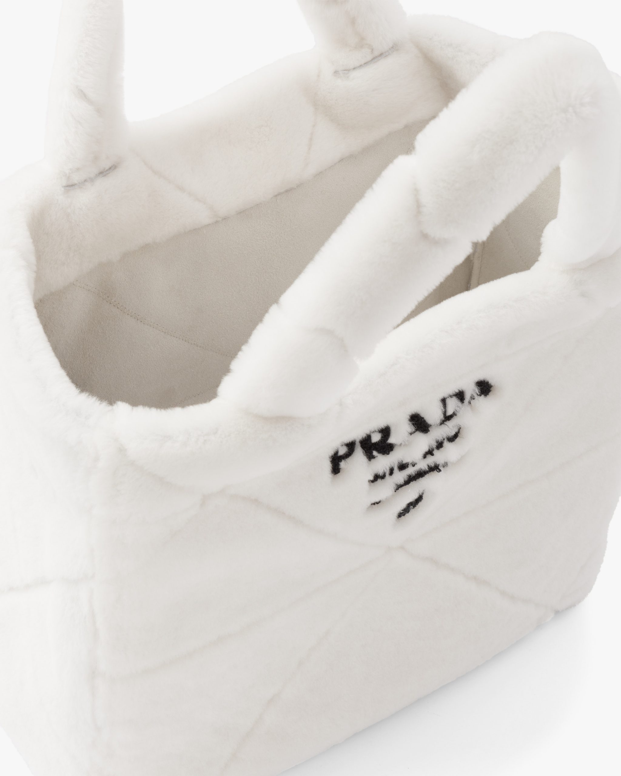 The cushy soft touch of shearling enhances the design with winter allure of this tote bag characterized by the quilted motif that recalls Prada’s iconic triangle. The embroidered lettering logo2 is framed by the triangle at the center, creating a refined three-dimensional effect.