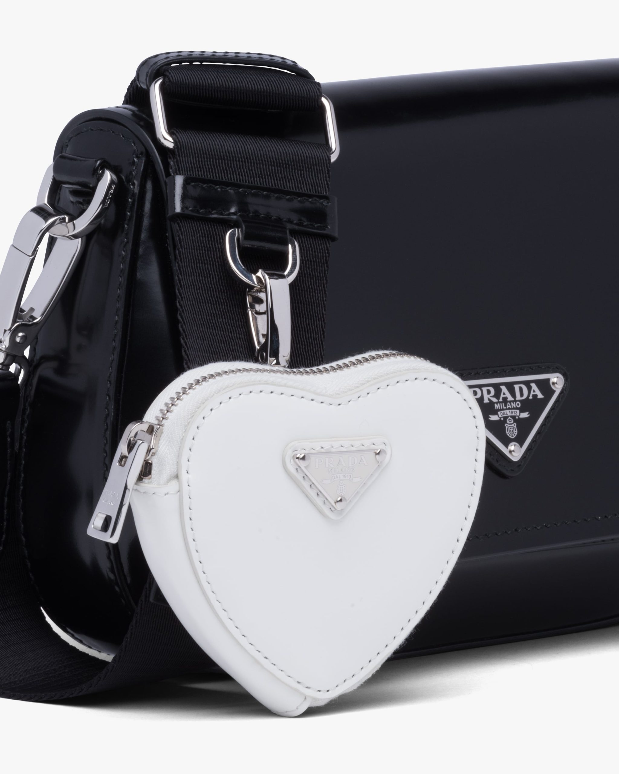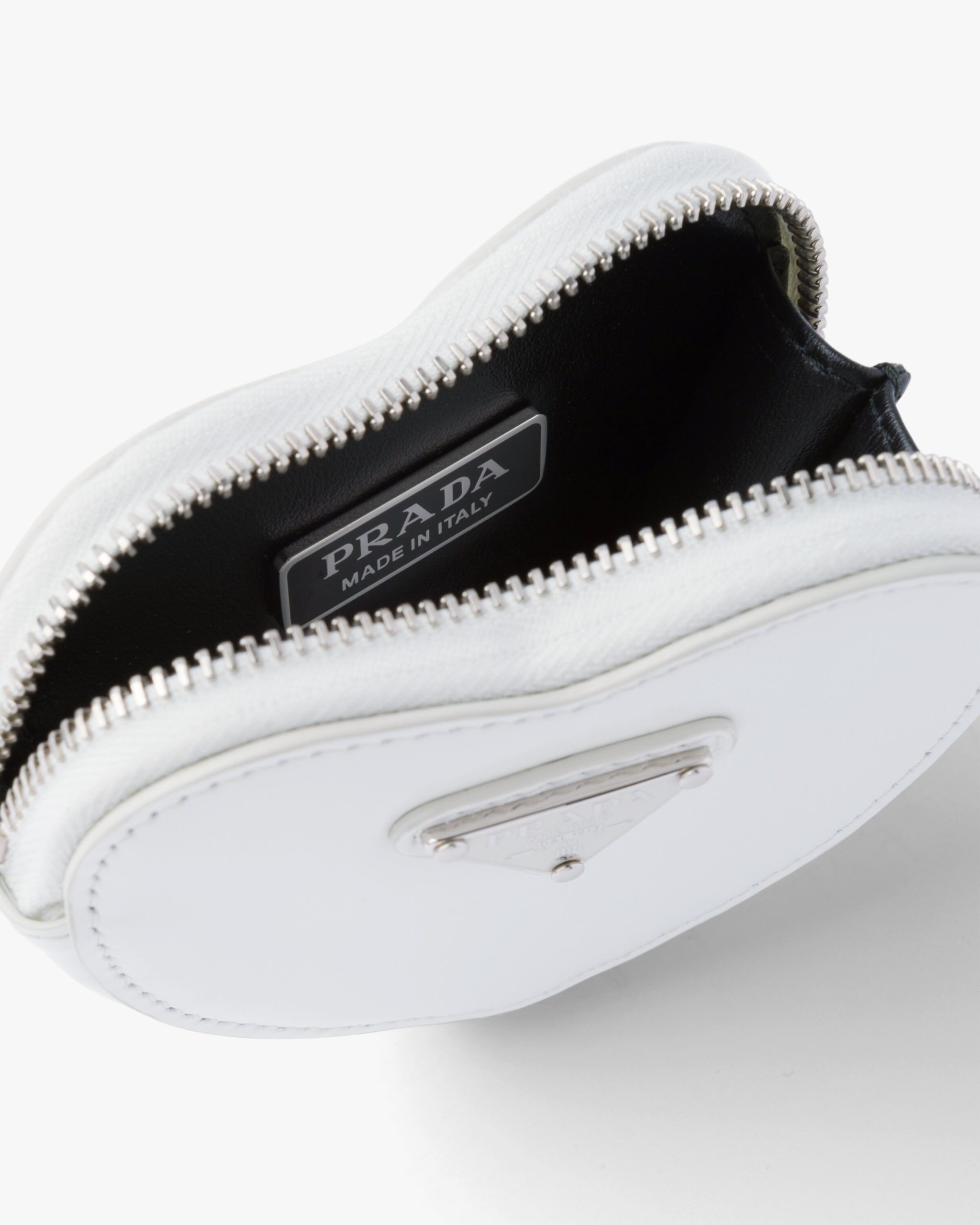This heart-shaped mini pouch is made from brushed leather, an exquisite and classic material that Prada has been reinterpreting in unusual designs since the nineties, creating a hybrid result that reflects the dual nature of the brand. The enameled metal triangle logo2 adorns the accessory.