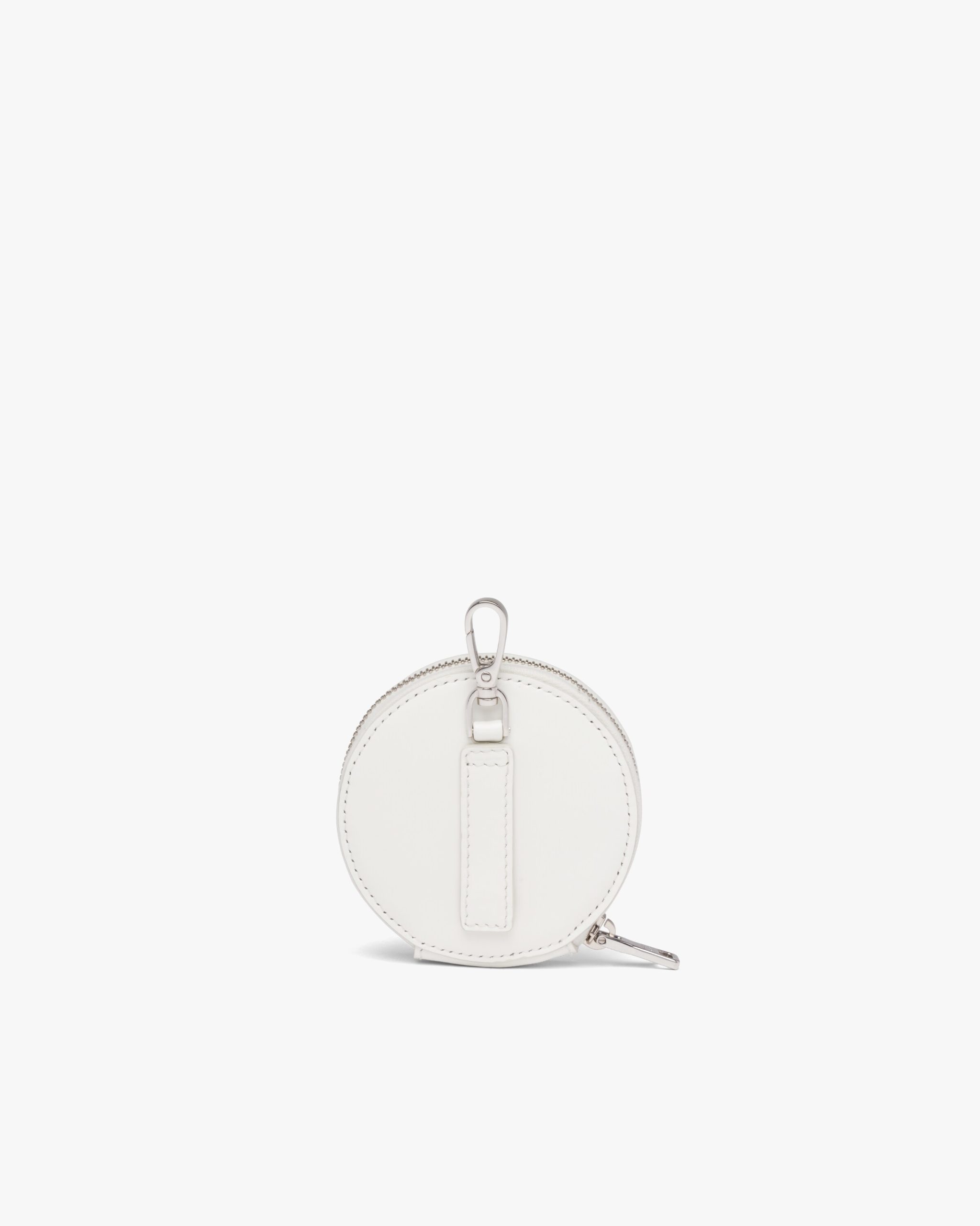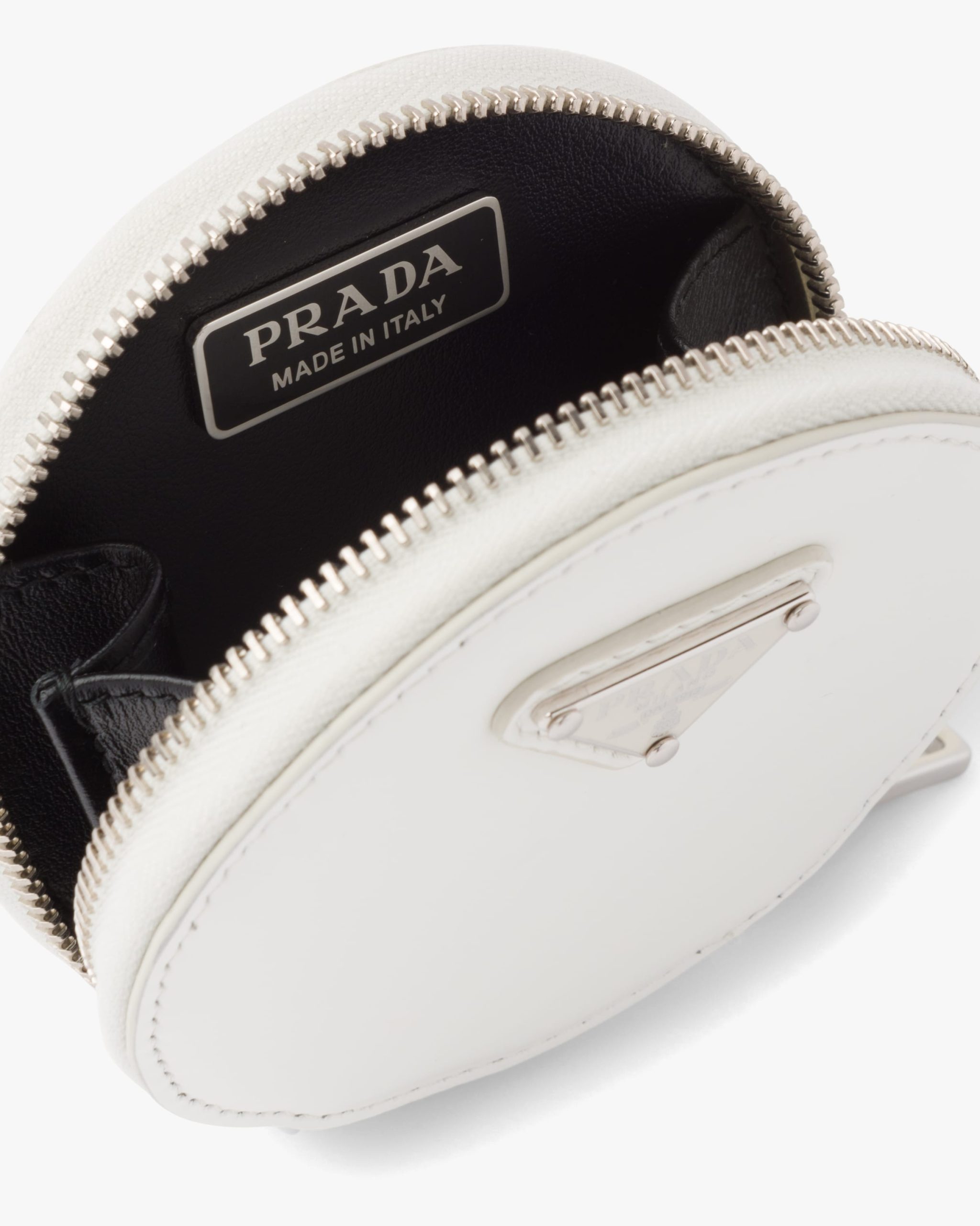 This round mini pouch is made from brushed leather, an exquisite and classic material that Prada has been reinterpreting in unusual designs since the nineties, creating a hybrid result that reflects the dual nature of the brand. The enameled metal triangle logo2 adorns the accessory.