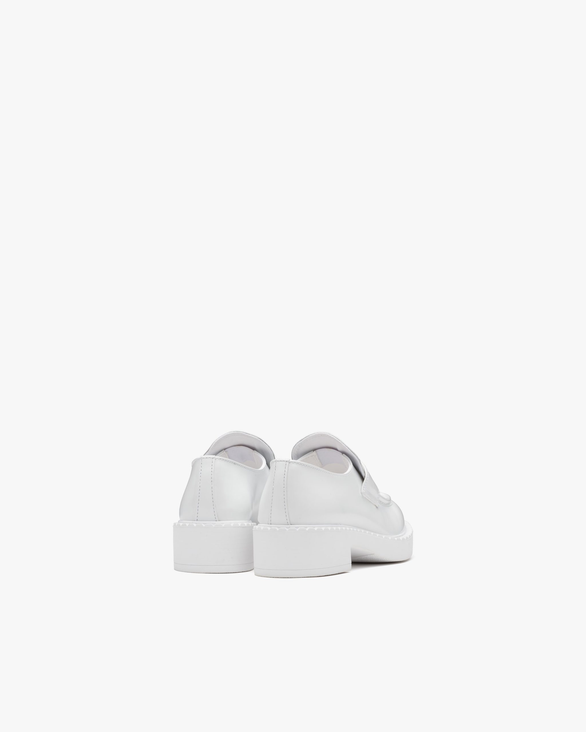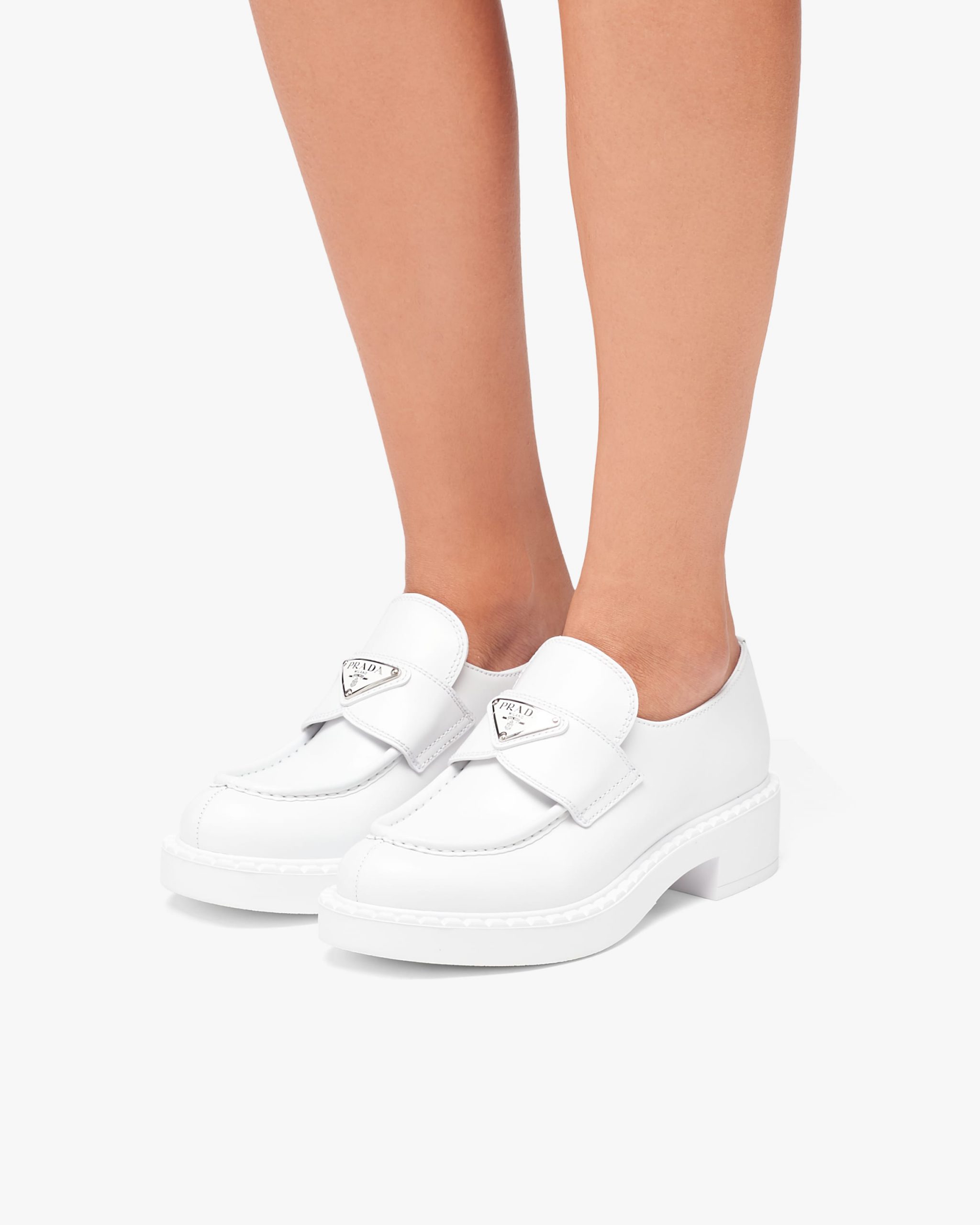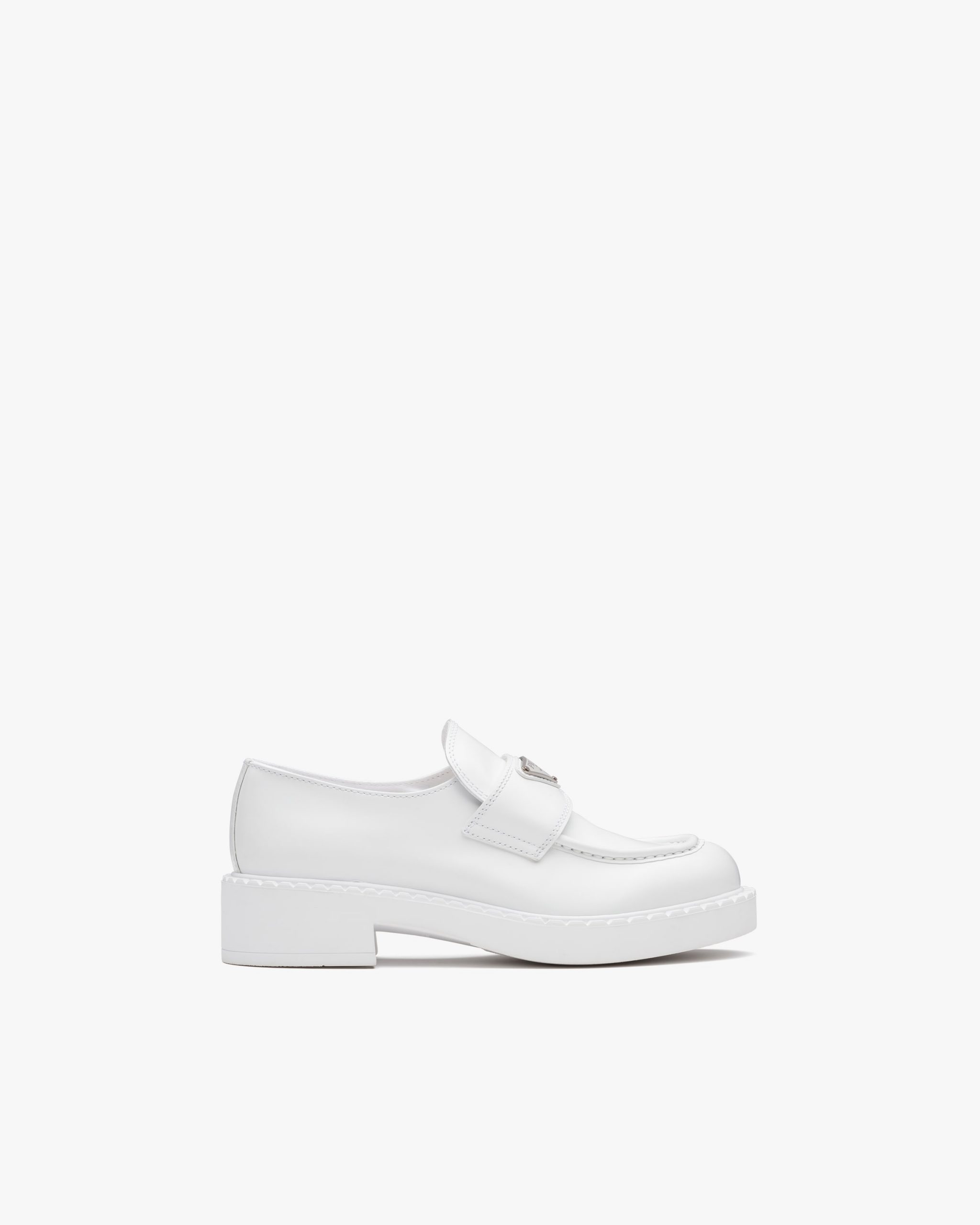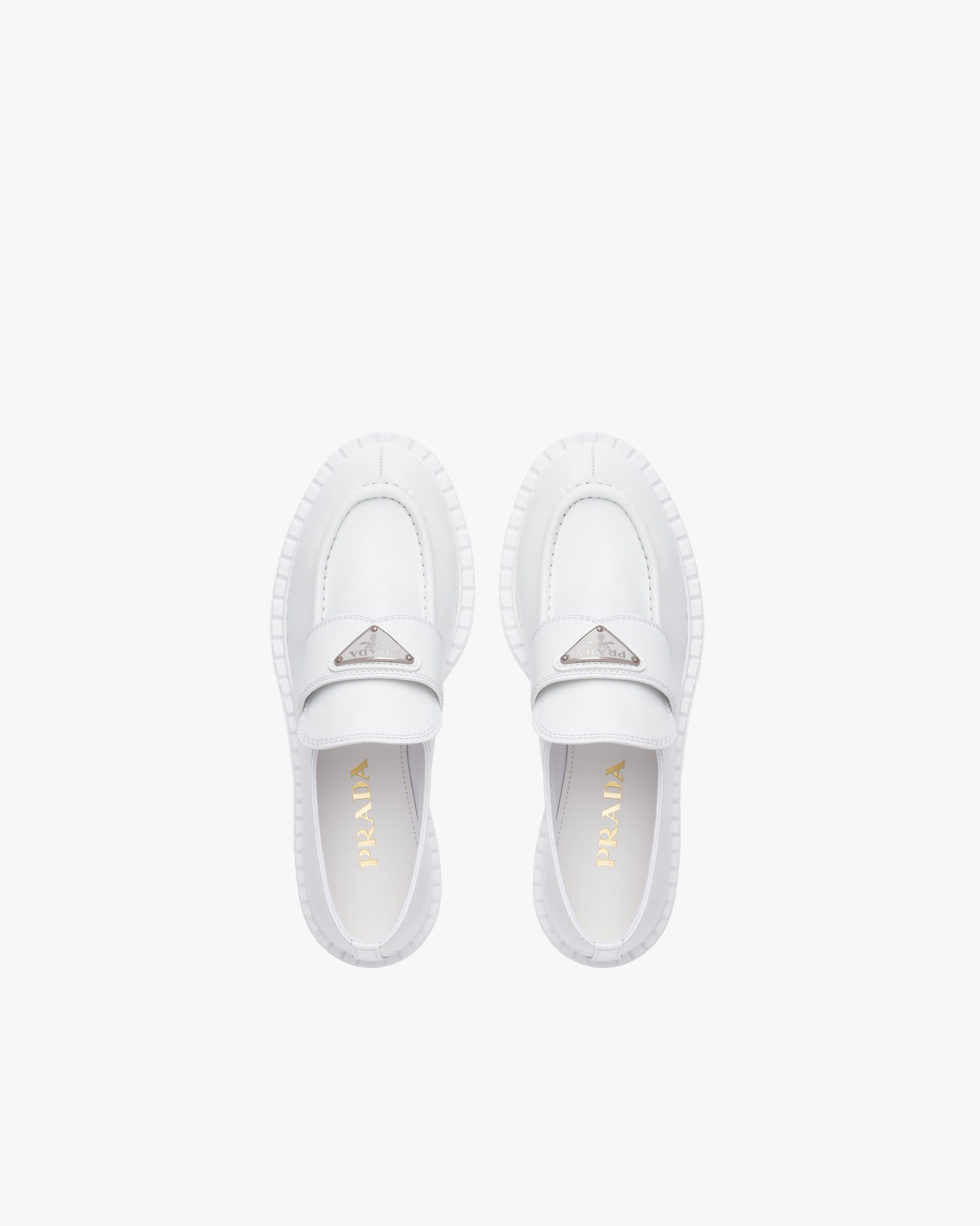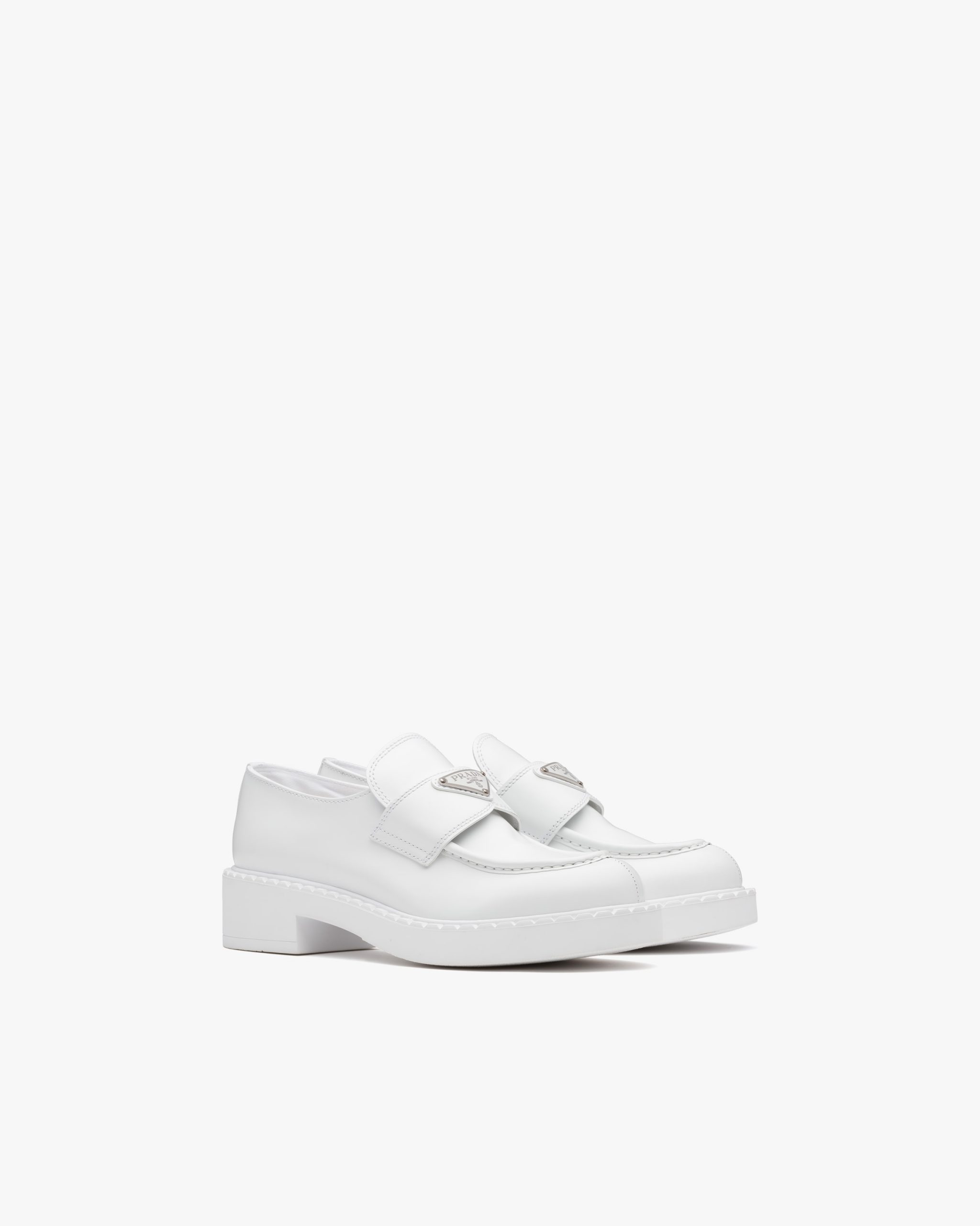 Emphasized by the iconic enameled triangle logo2, these retro-inspired loafers are made of brushed leather, traditionally used in classic fine footwear and reinterpreted in Prada collectsions on unexpected designs for a hybrid result that reflects the duality of the brand. The notched effect of the welt around the shoe gives it a handcrafted touch.
