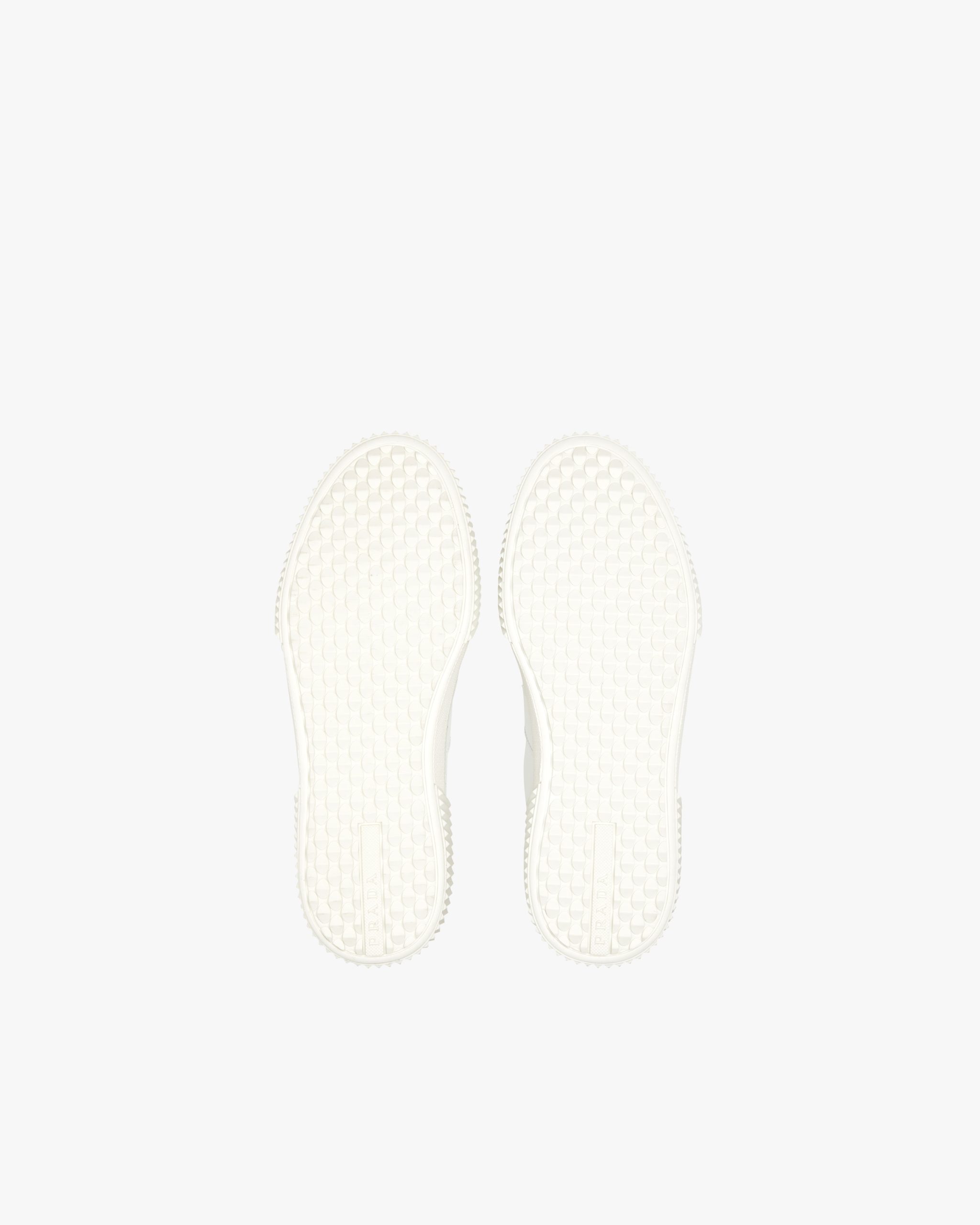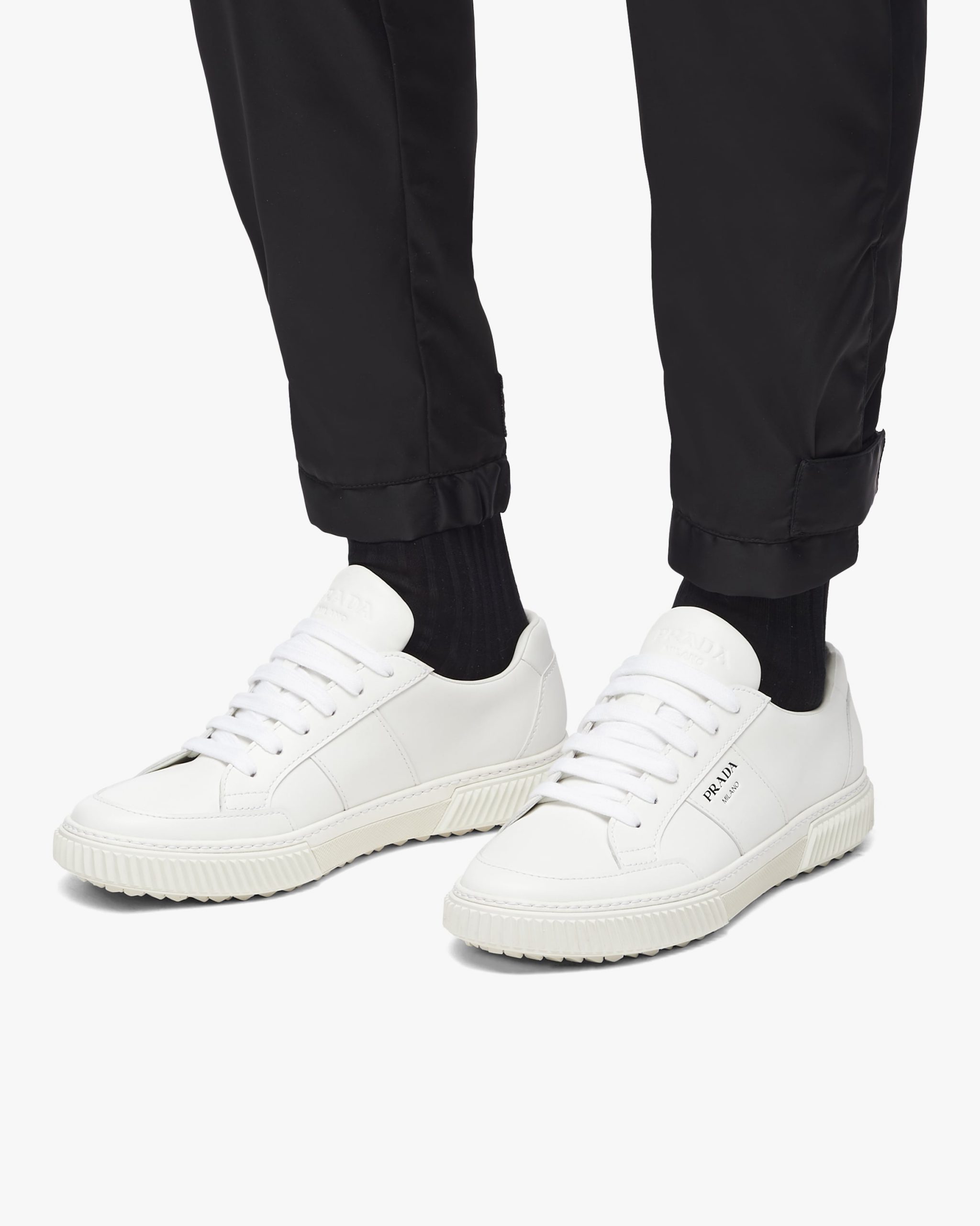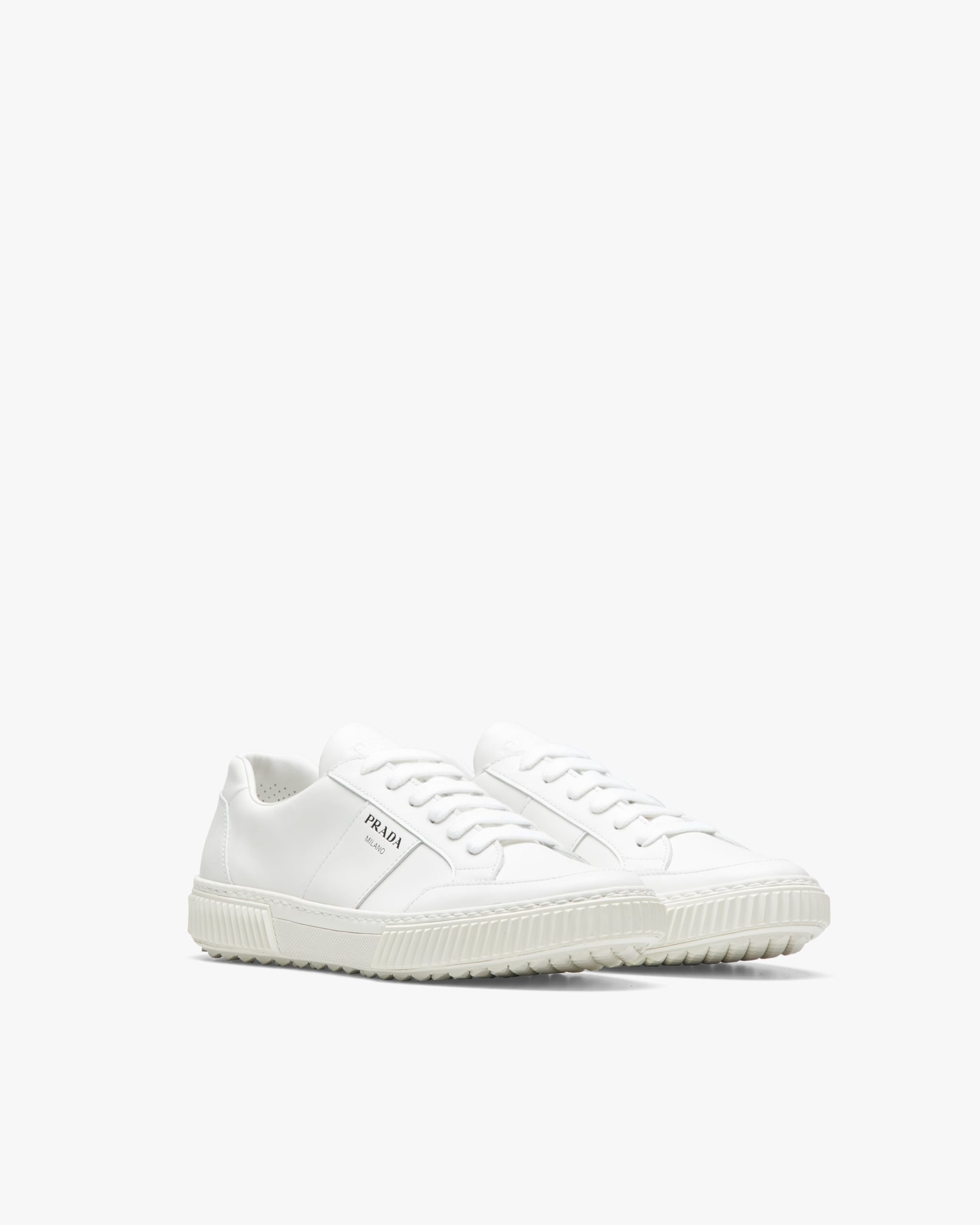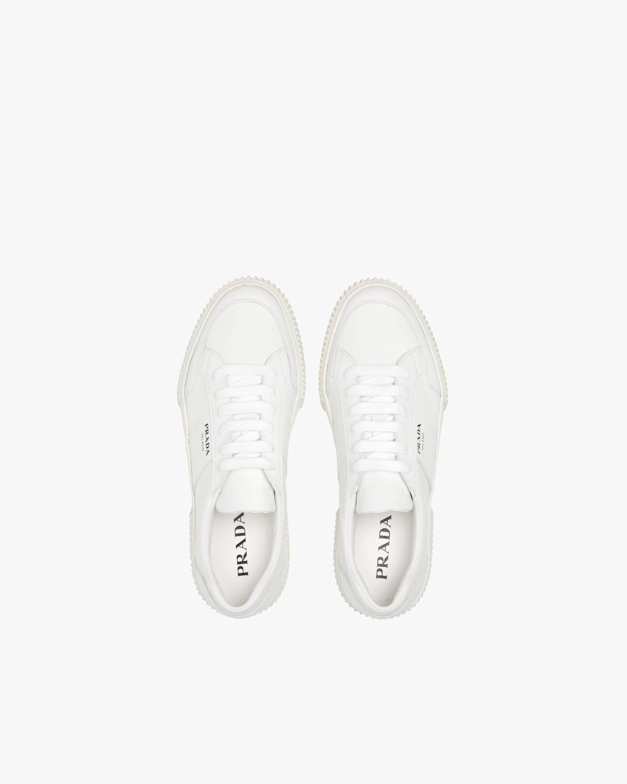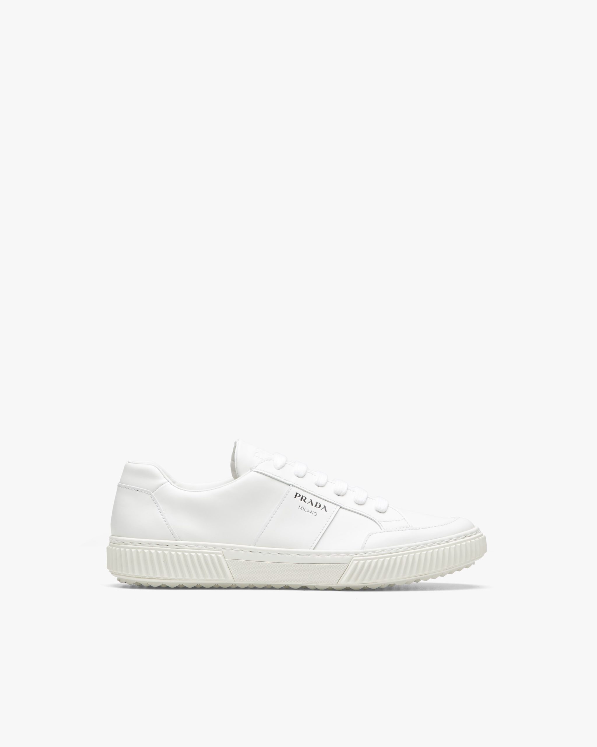 These leather laced sneakers are accented by the screen-printed Prada logo2 on the side. The removable leather-covered insole rests on a sole with rubber inserts.