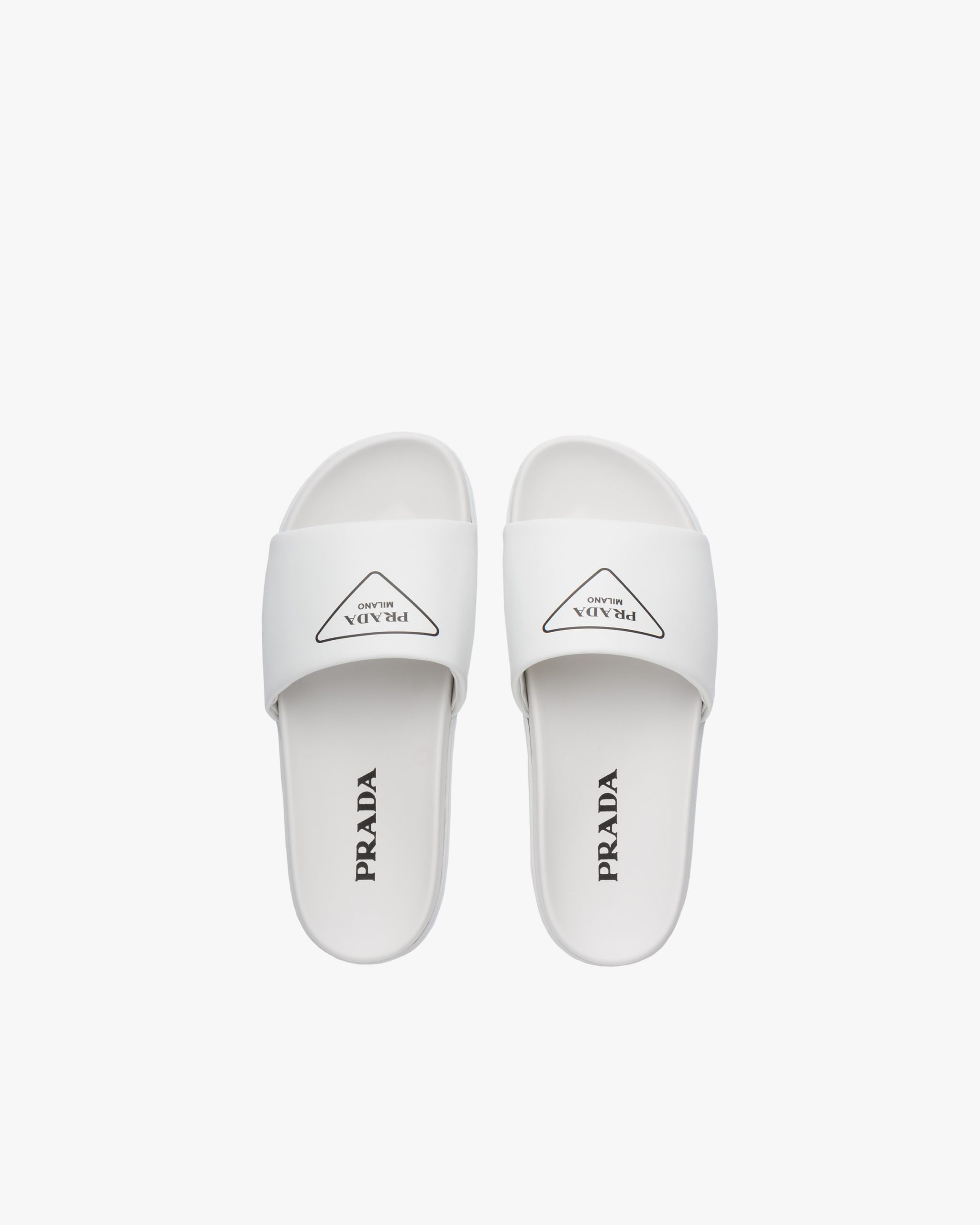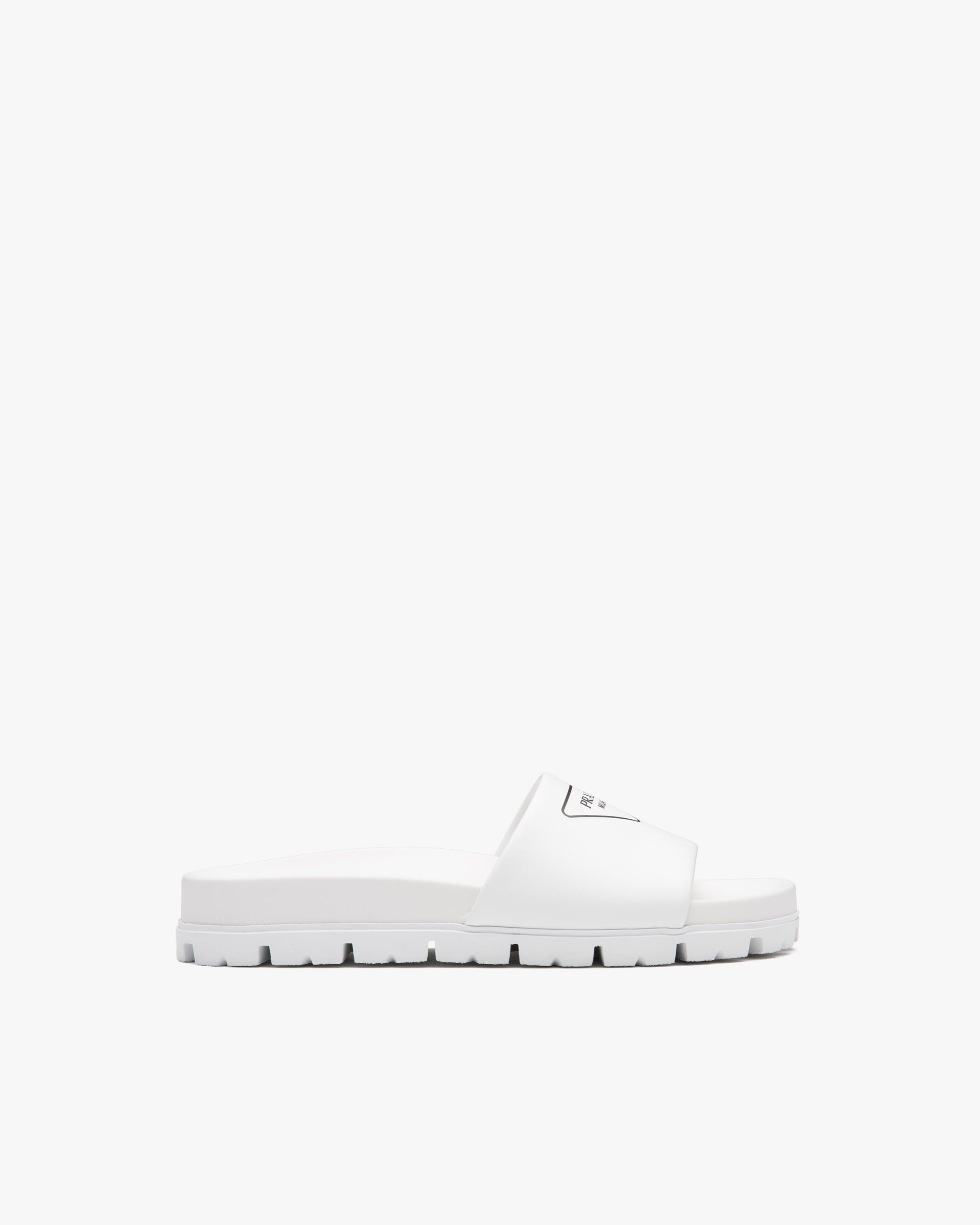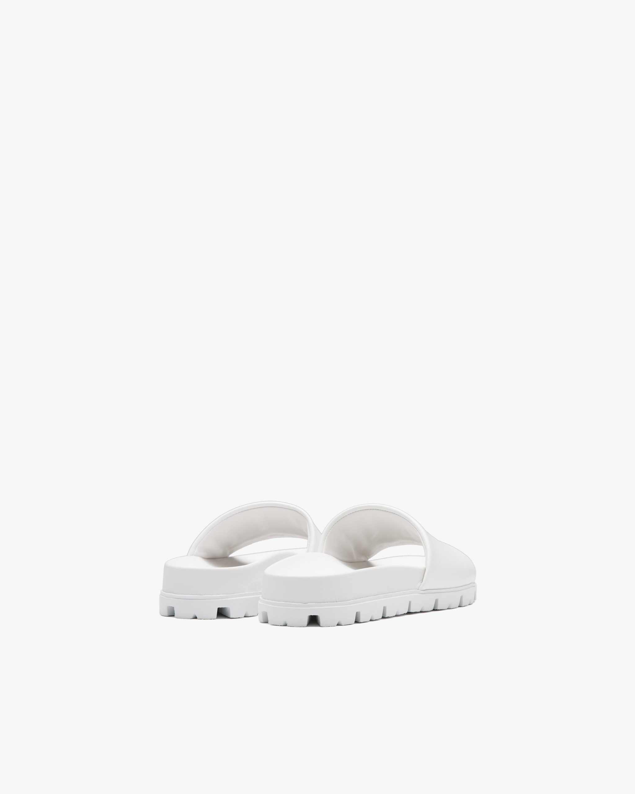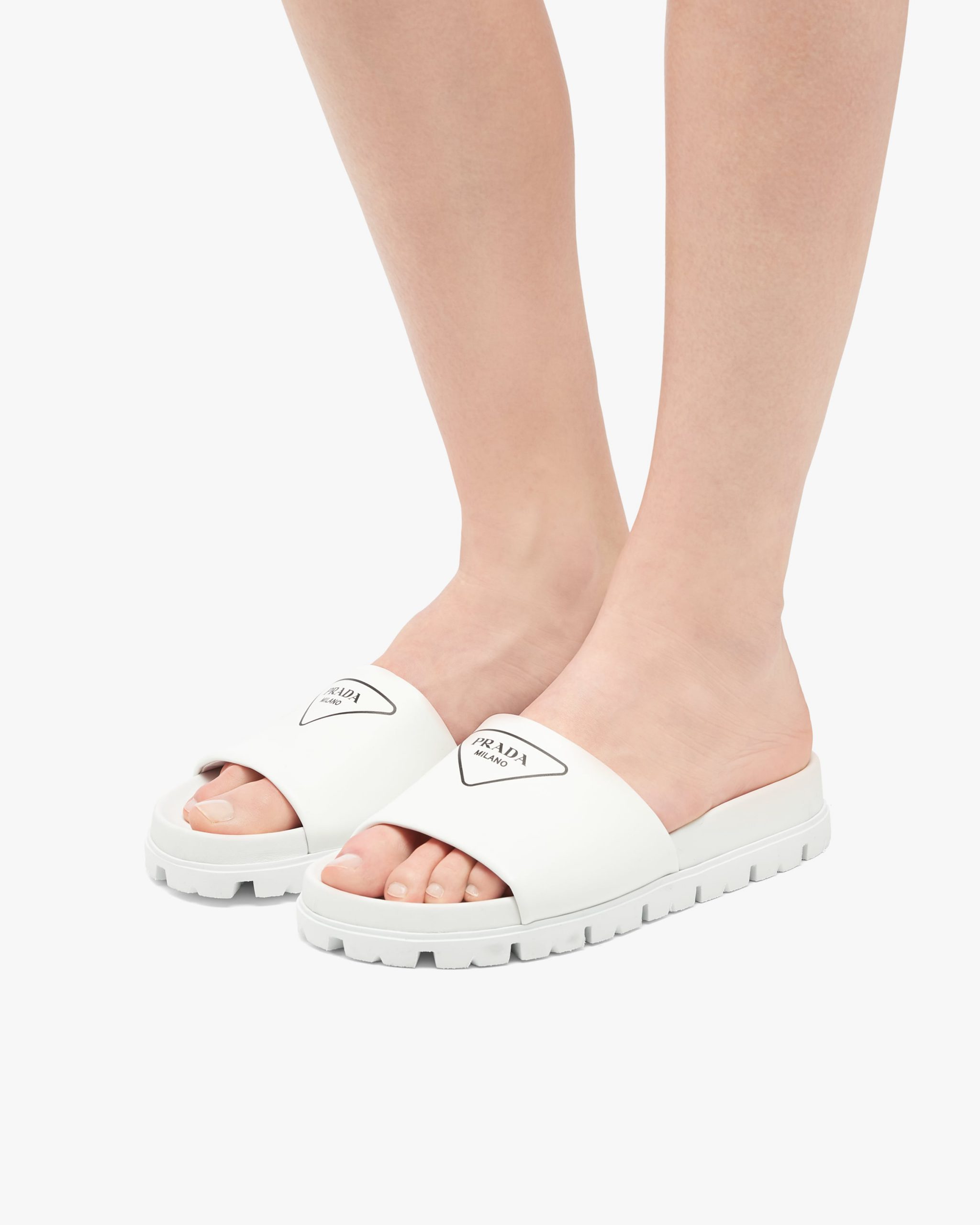 The screen-printed triangle logo2 decorates these leather slides completed by a rubber lug sole for a contemporary look.