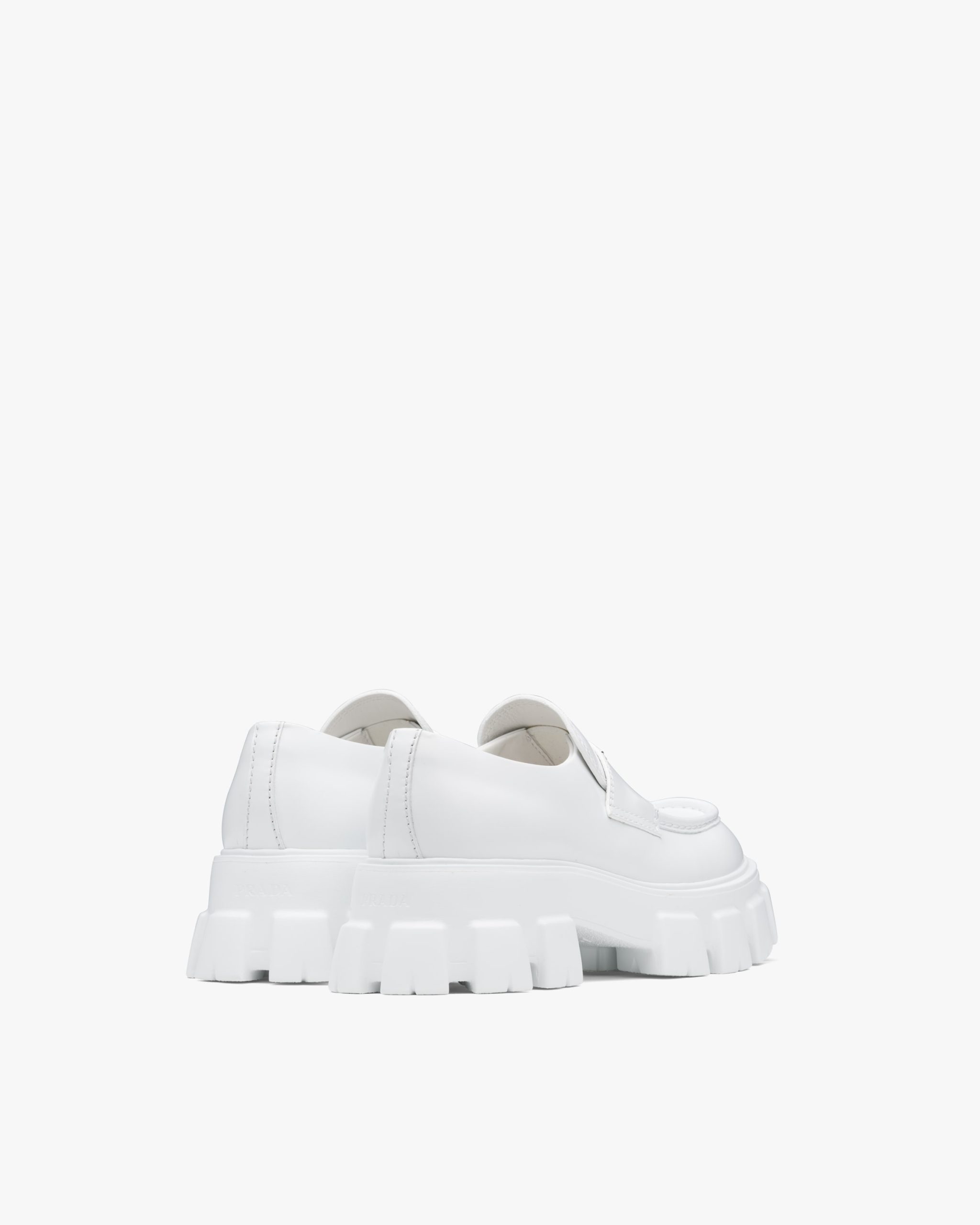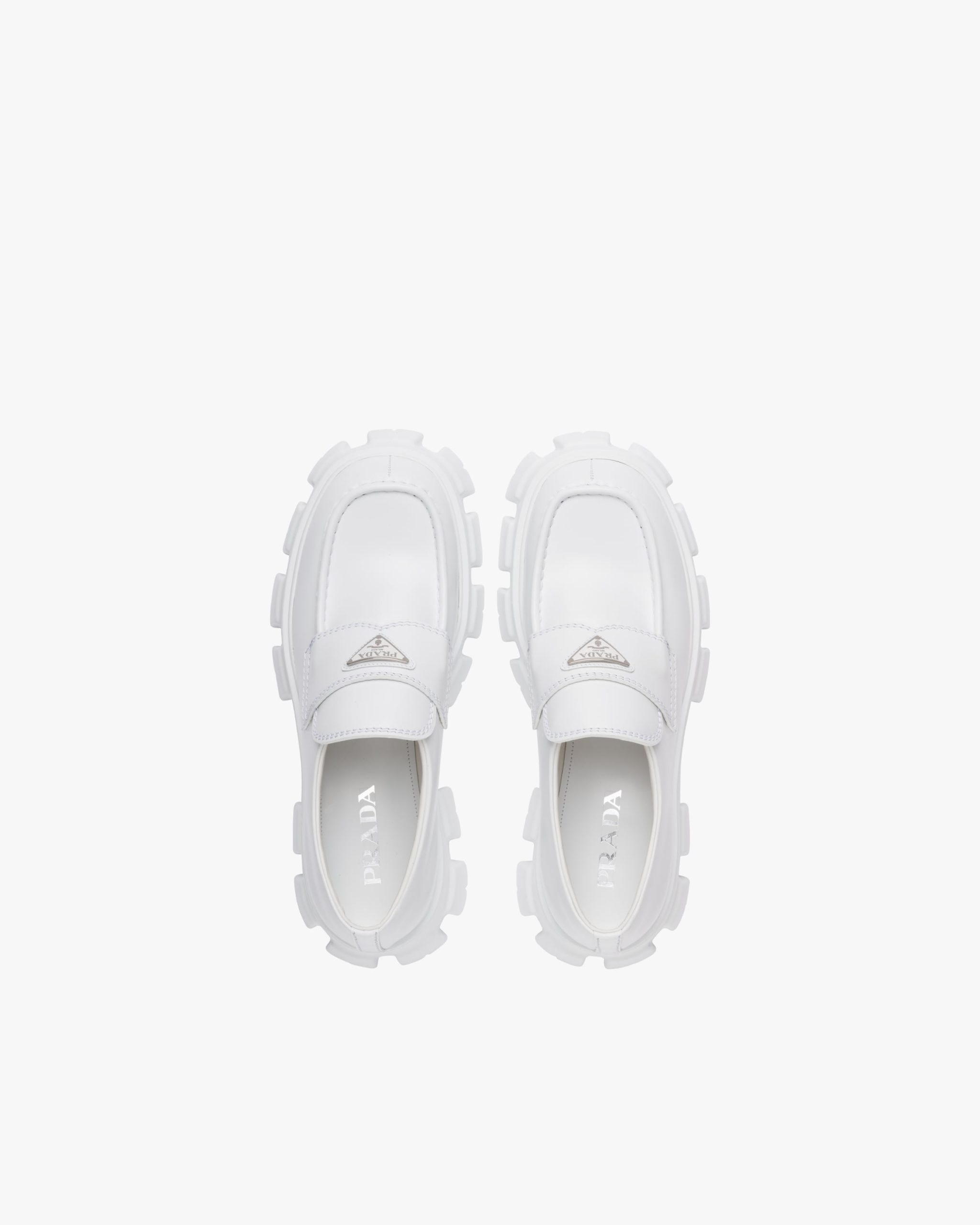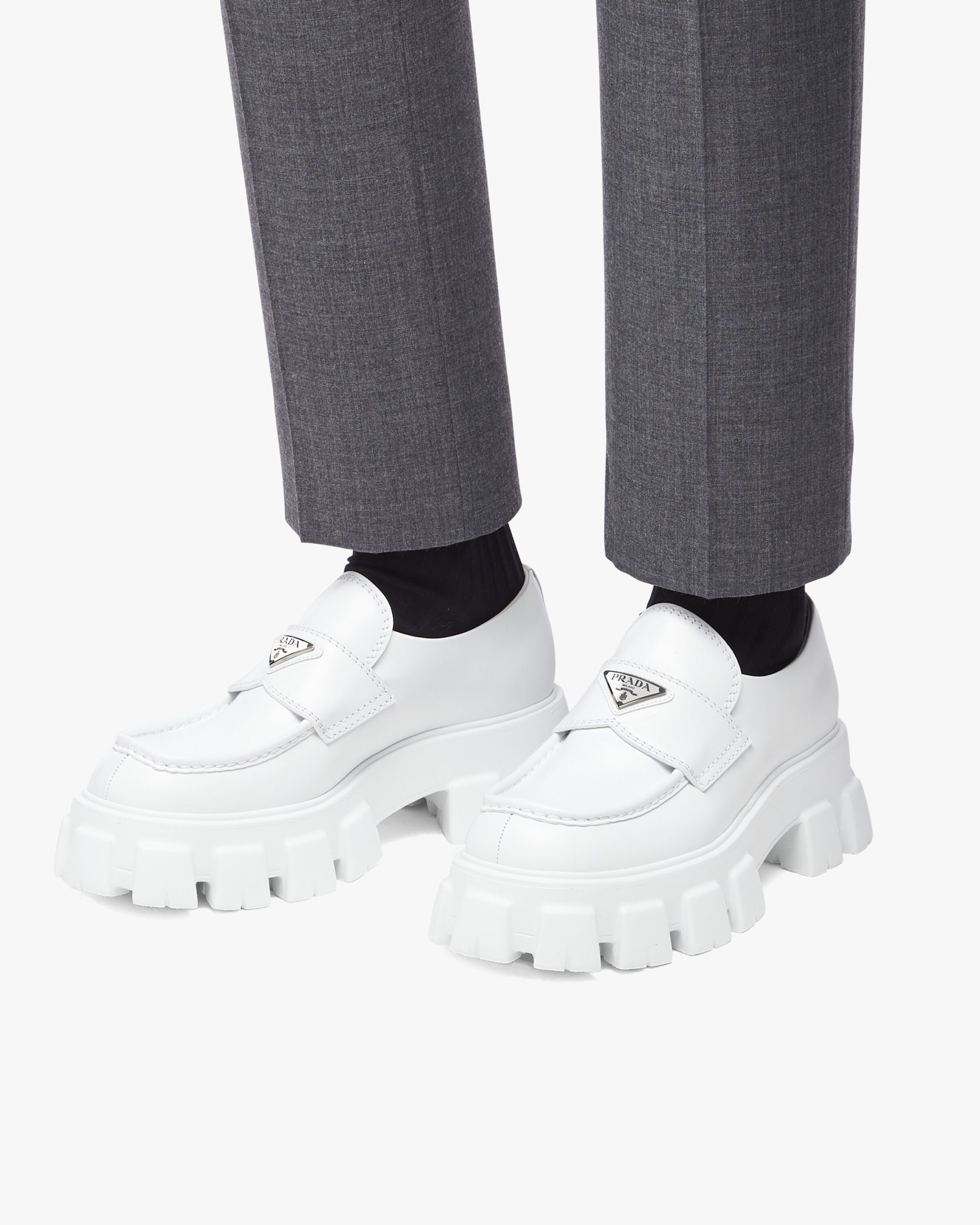 Unique and bold, this shoe emphasizes the concept of duality, which is essential in the aesthetics of the brand. The modernist maxi sole with a unique monolithic design creates a dialog with the brushed leather upper featuring a rigorous look and polished finish. A hybrid yet harmonious soul characterizes the Monolith line that combines diametrically opposed images to create a timeless silhouette. The loafers are decorated with the iconic enameled metal triangle logo2.