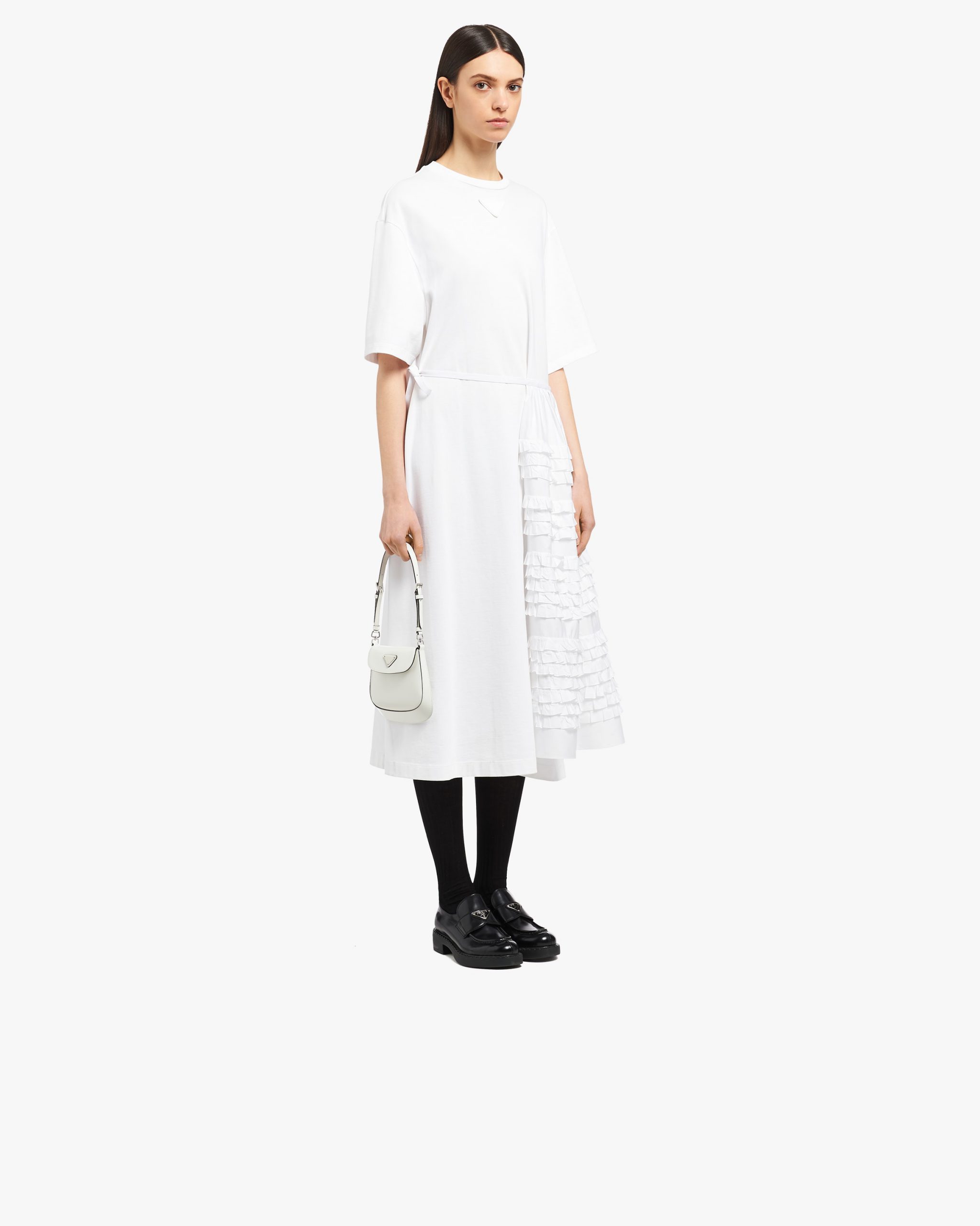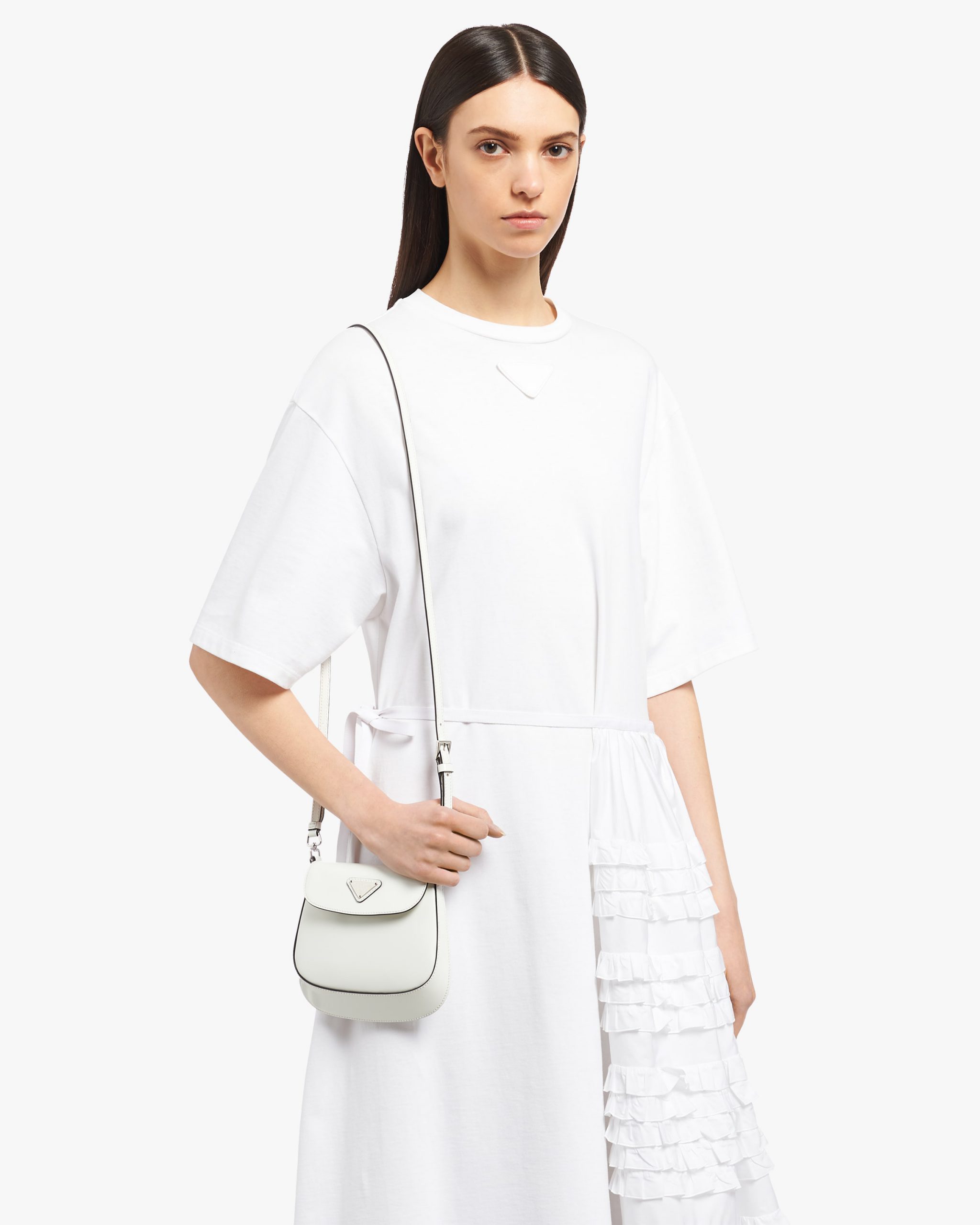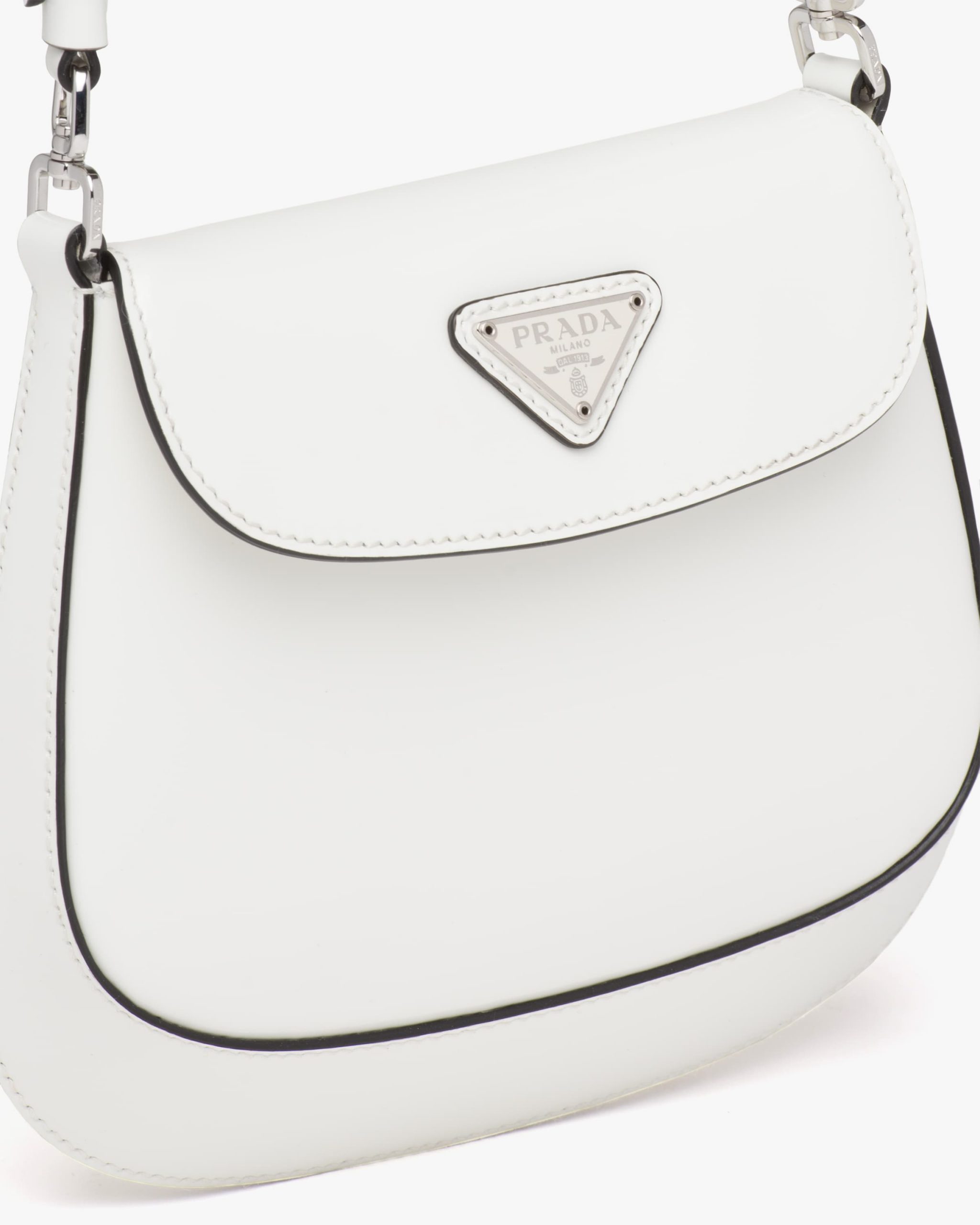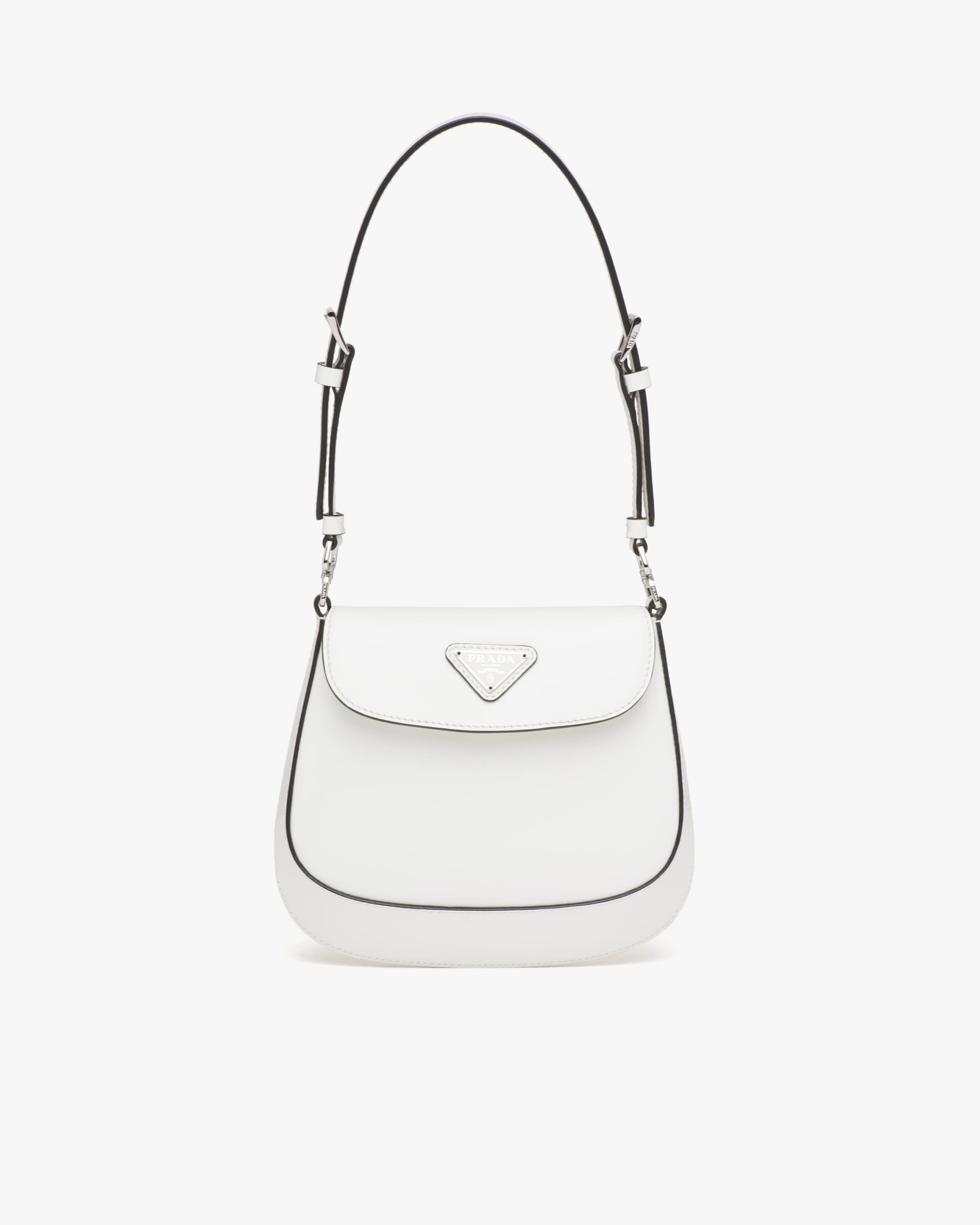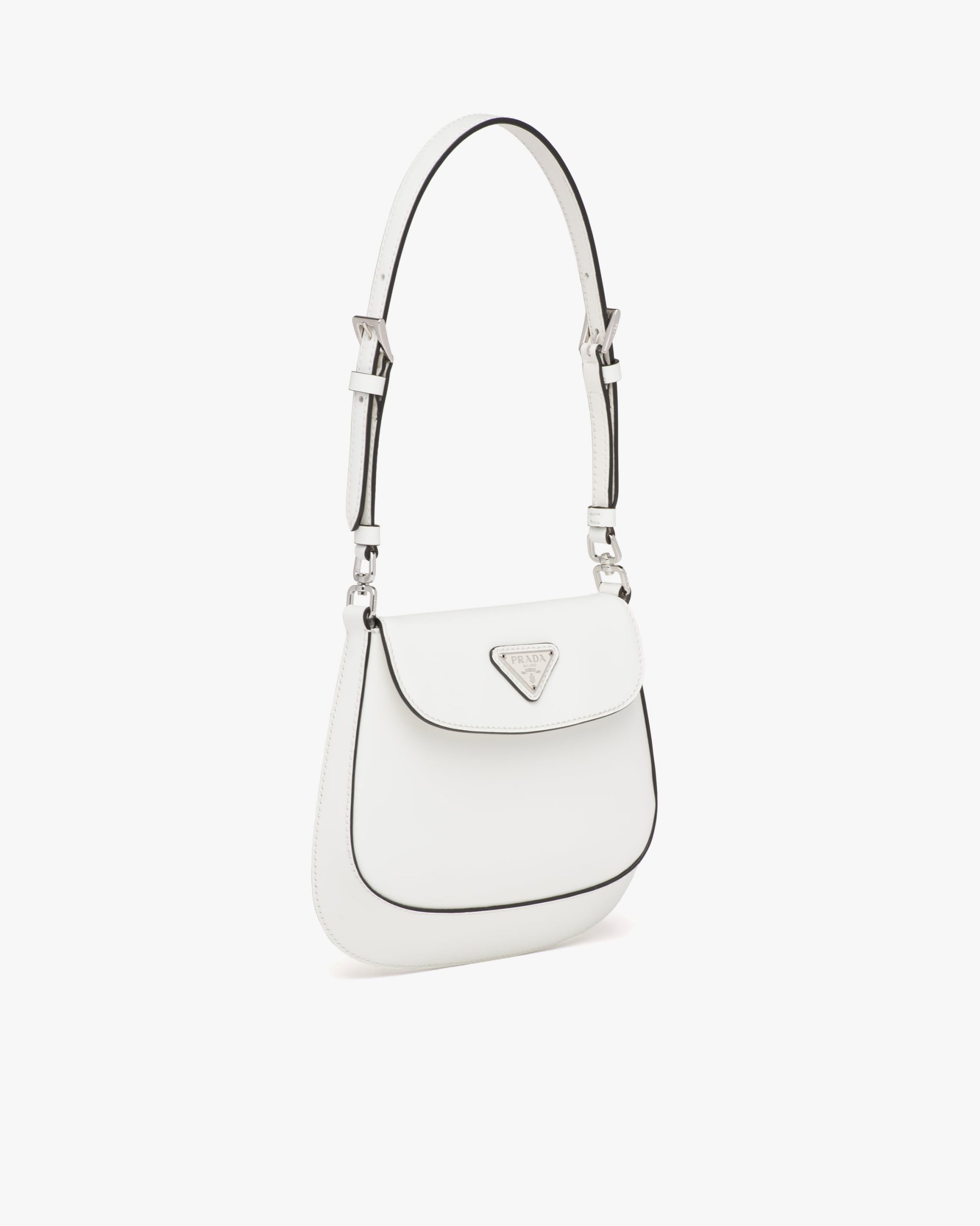 A perfect synthesis of classicism and futurism, the Prada Cleo bag reinterprets an iconic design from the brand’s archives. Sleek, curved lines emphasized by the particular sloping construction on the bottom and sides give this flap bag sophisticated allure, while the handle with extension makes the accessory functional and allows it to be worn as a shoulder bag or handbag. Brushed leather, a distinctive material of Prada collectsions, is a modern, chameleonic material that is perfect for always new combinations and contrasts. The enameled triangle logo2 completes the silhouette.