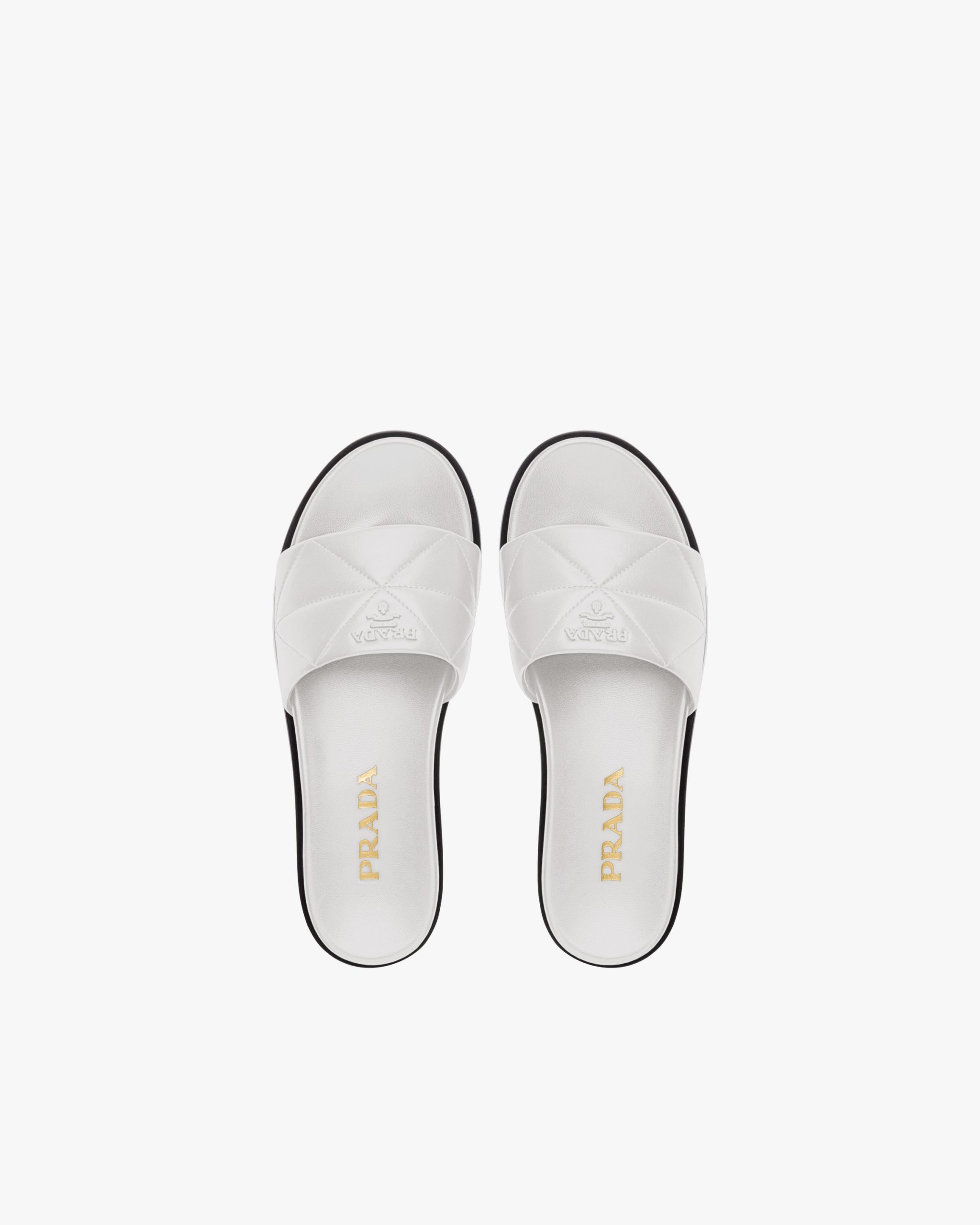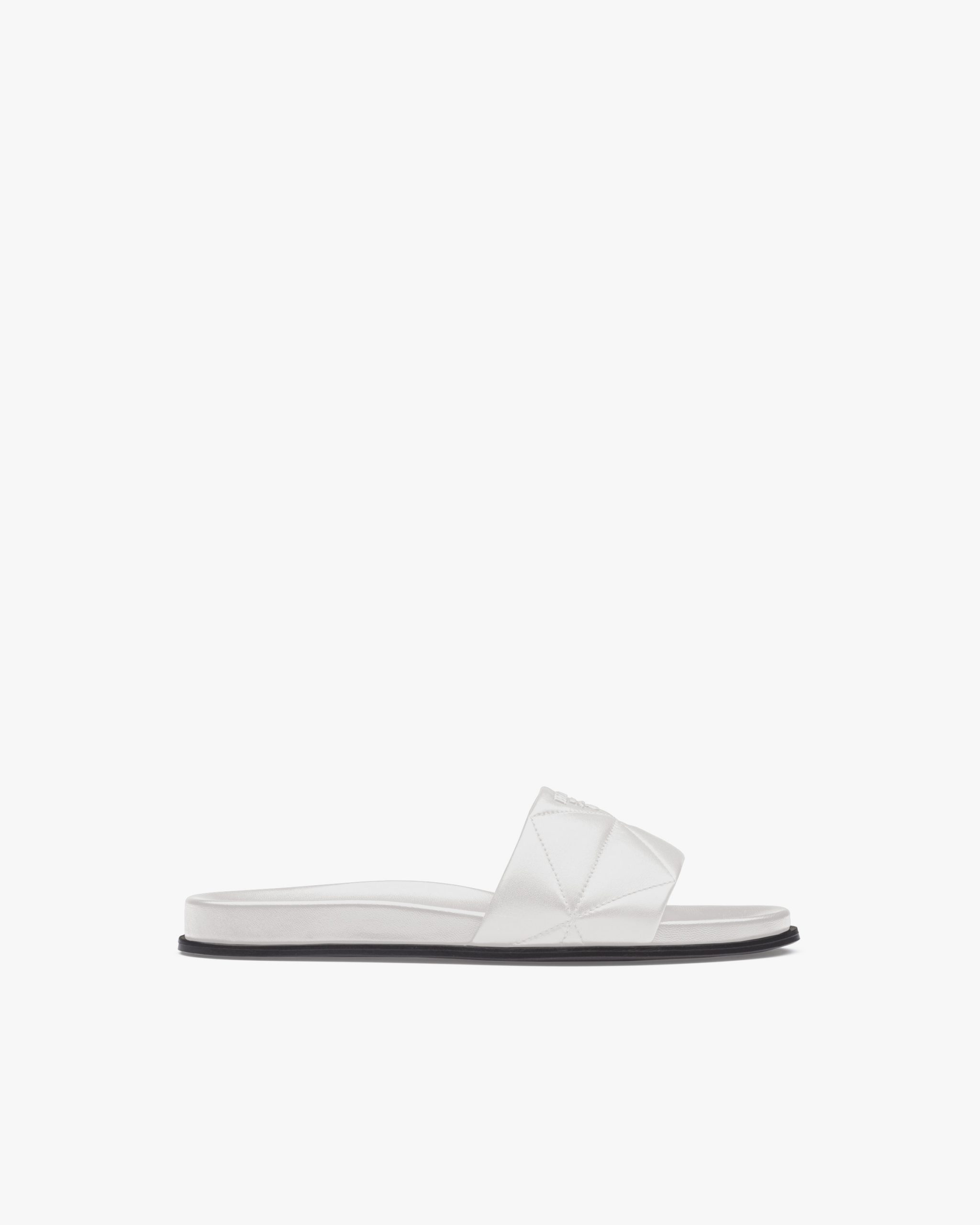 These slides for the new season are redesigned in nappa leather and defined by the band stitched with a geometric motif The Prada logo2 in relief decorates the sandal.