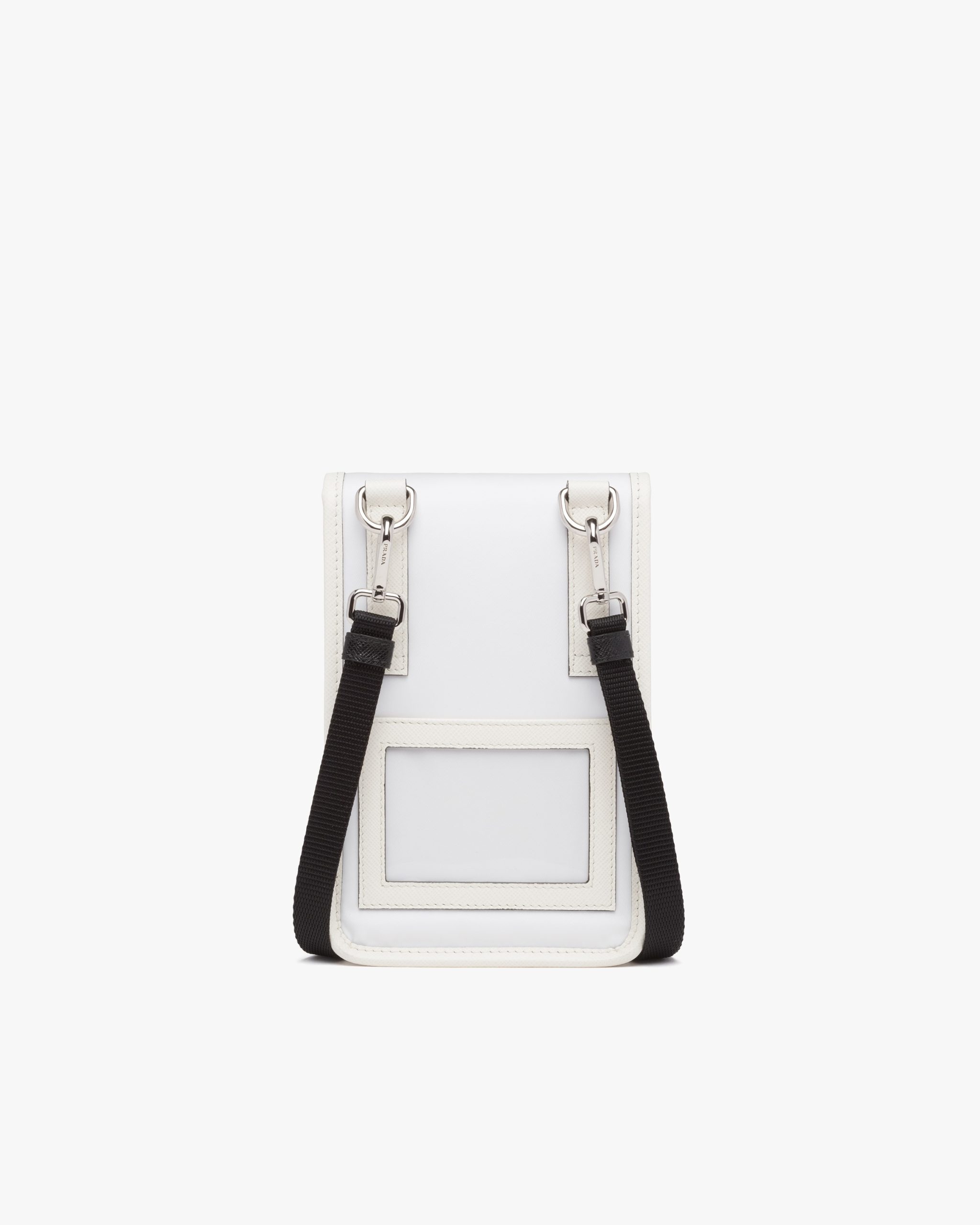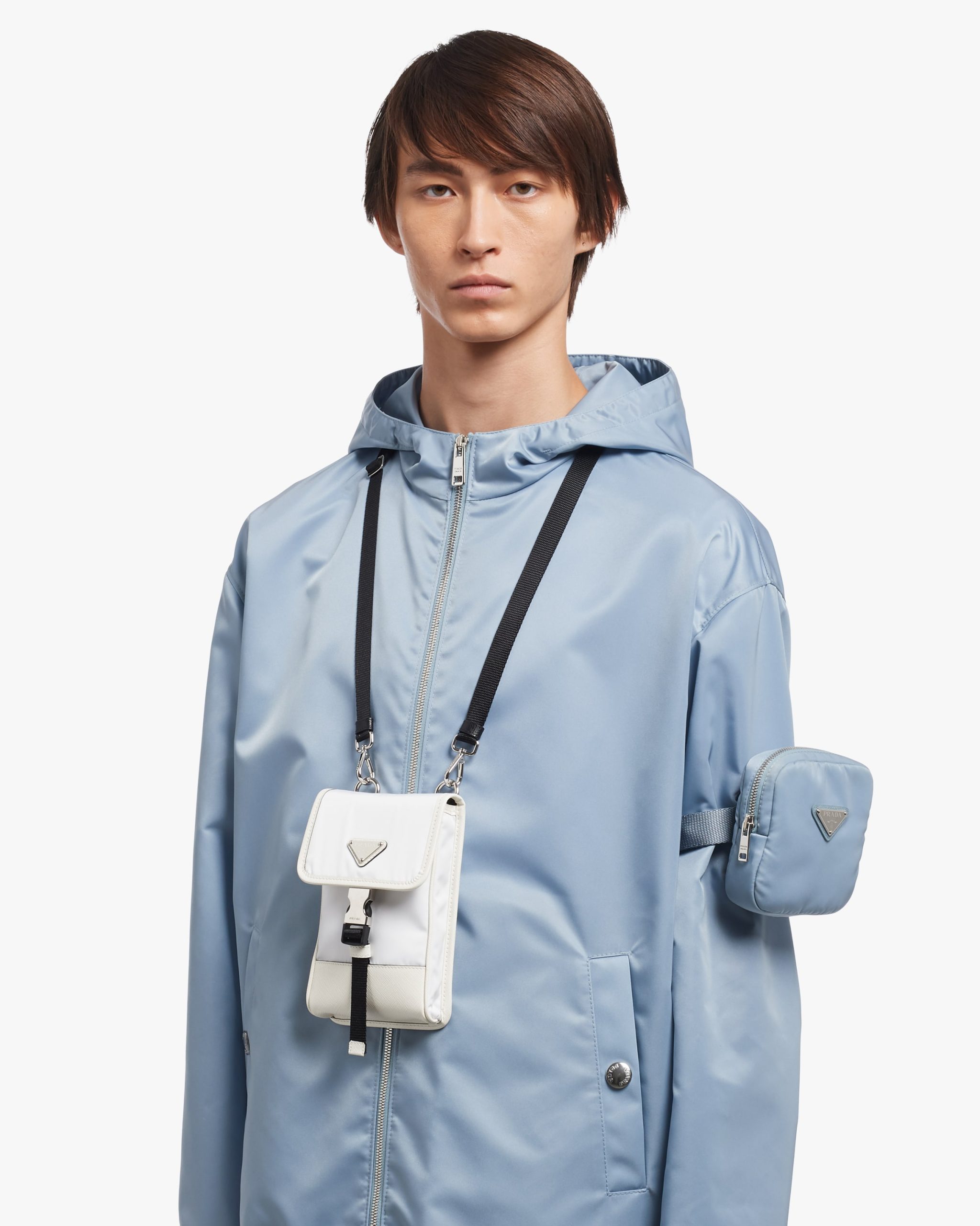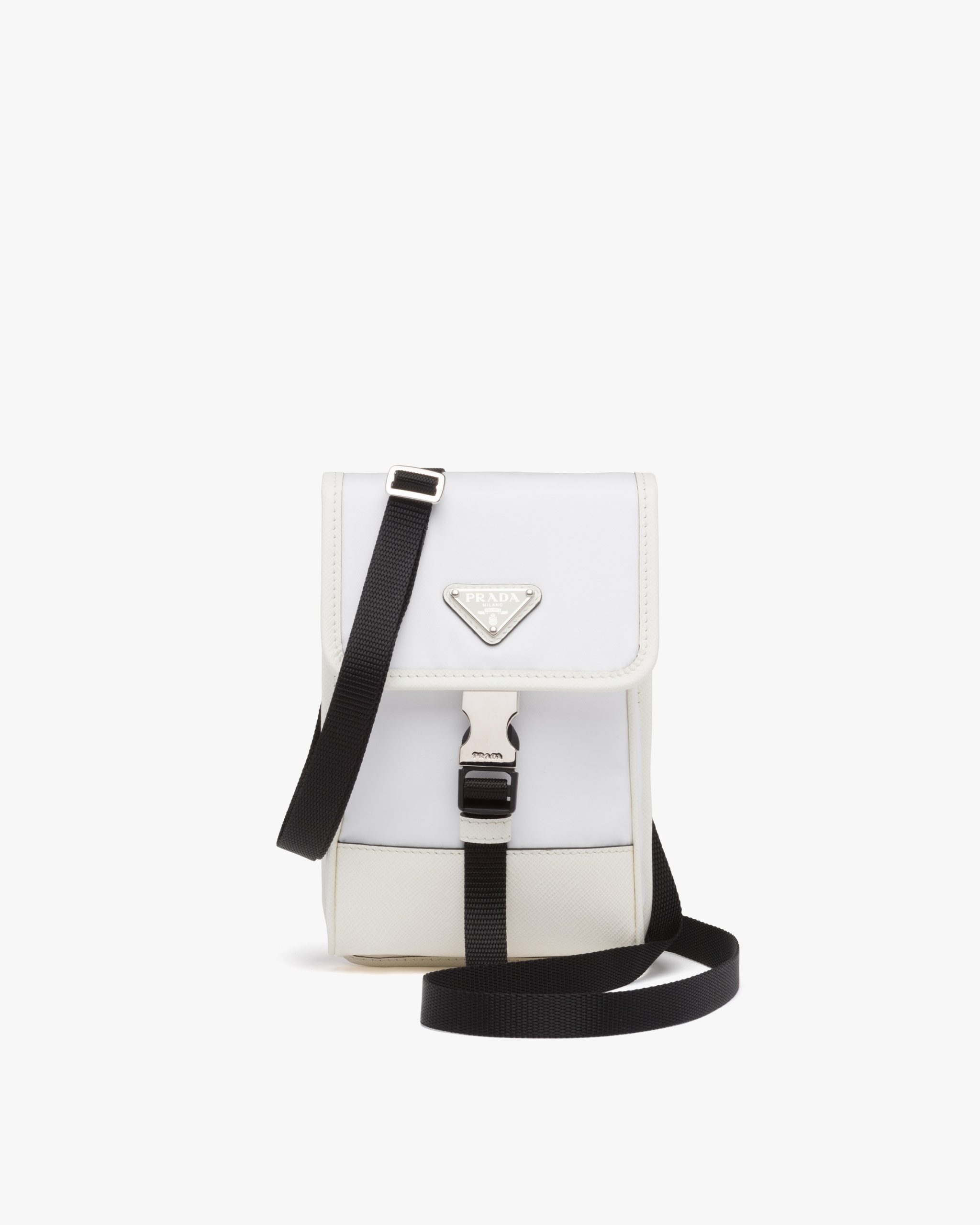 This nylon mobile phone case with detachable shoulder strap has Saffiano leather trim. The design of the accessory is completed by the metal side-release buckle and enameled triangle logo2.