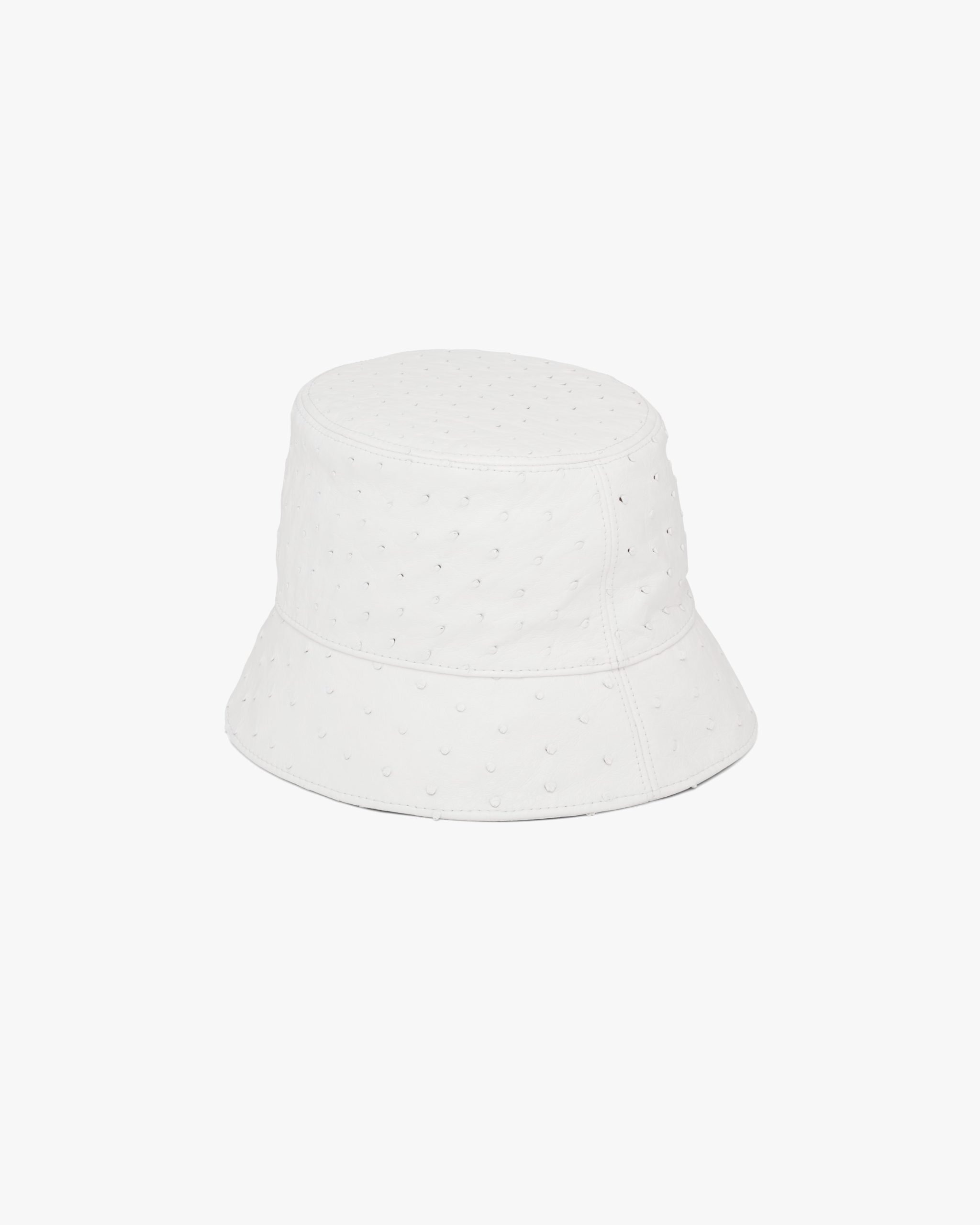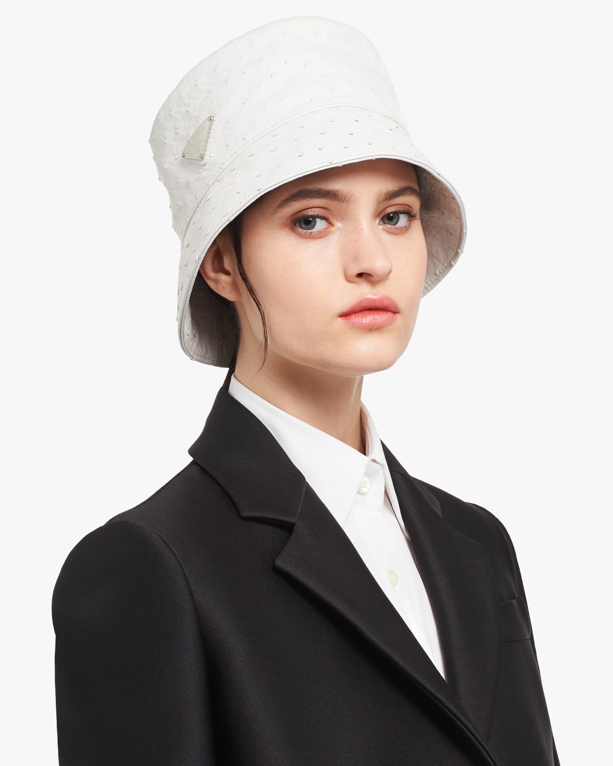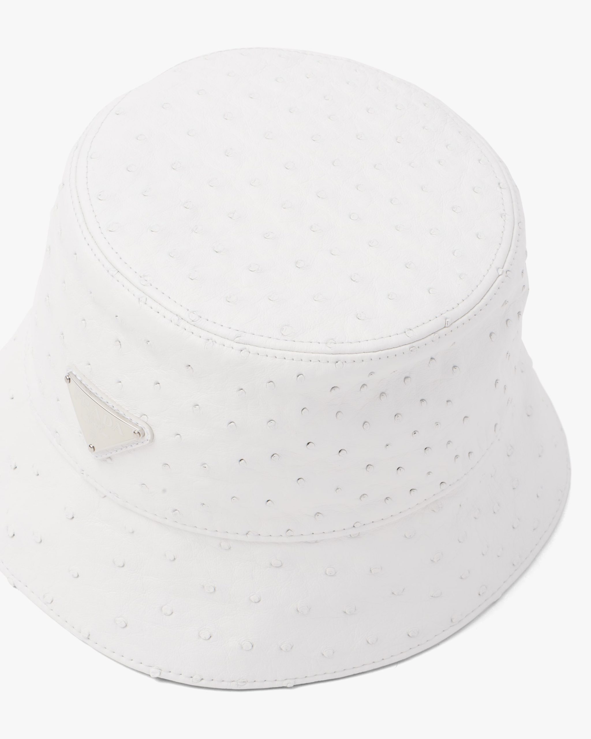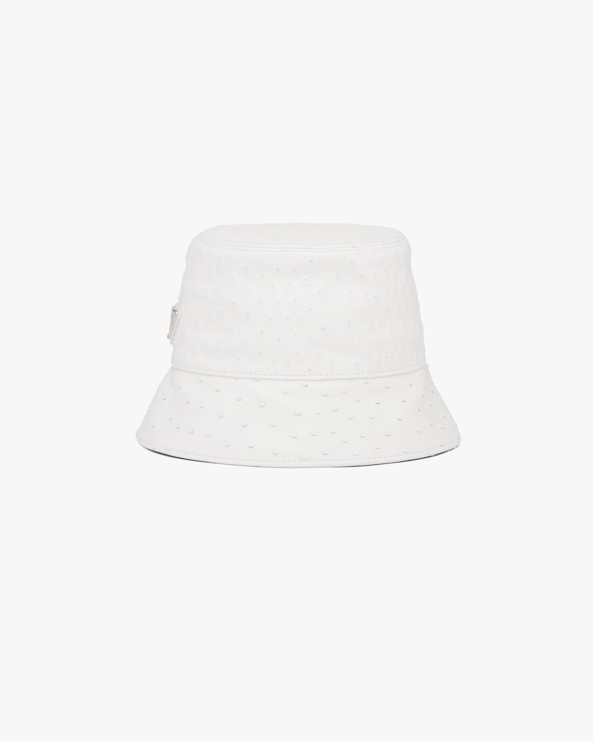 The classic bucket hat is restyled in this version with sophisticated, urban charm. Made of ostrich leather, it is decorated with the enameled metal triangle logo2.