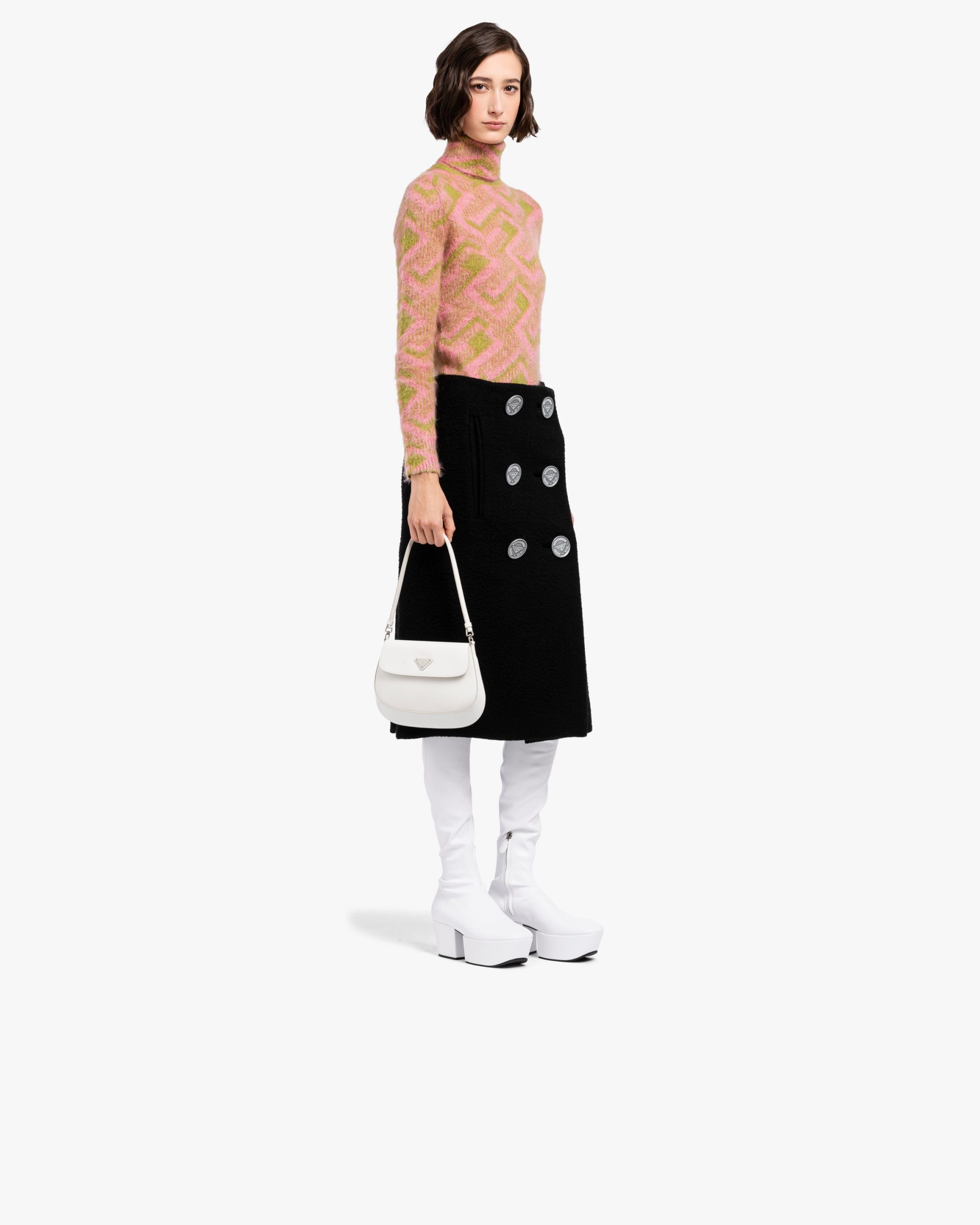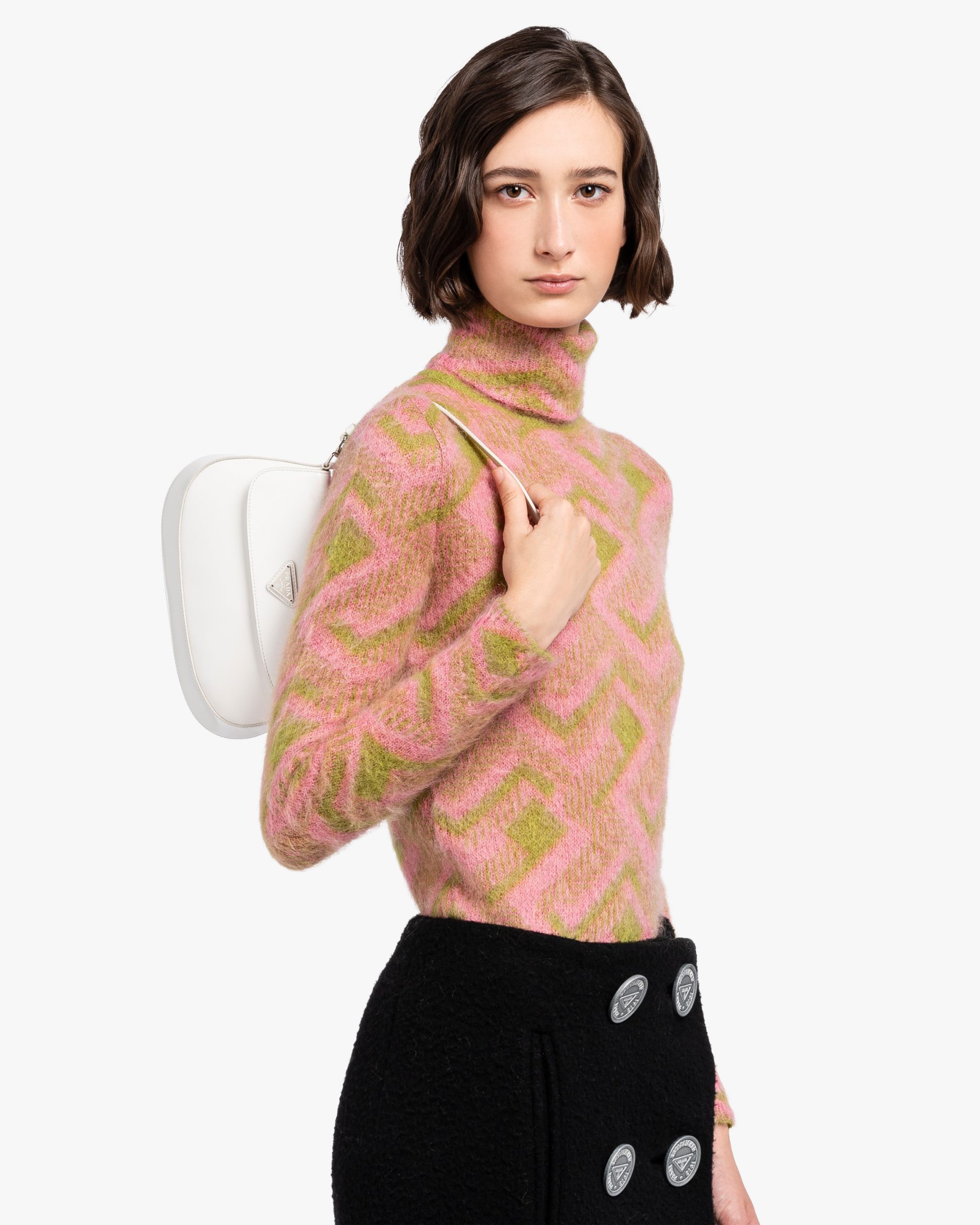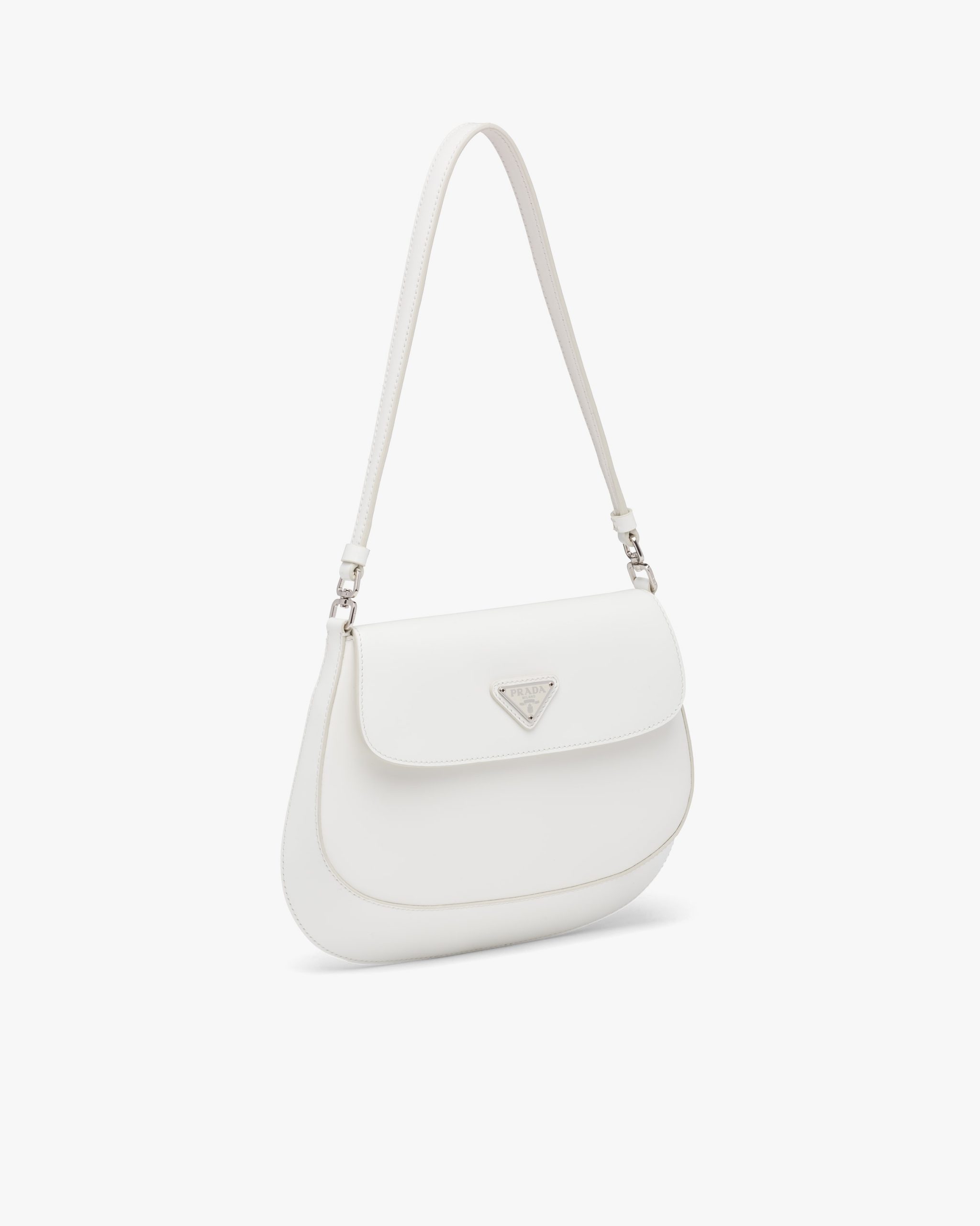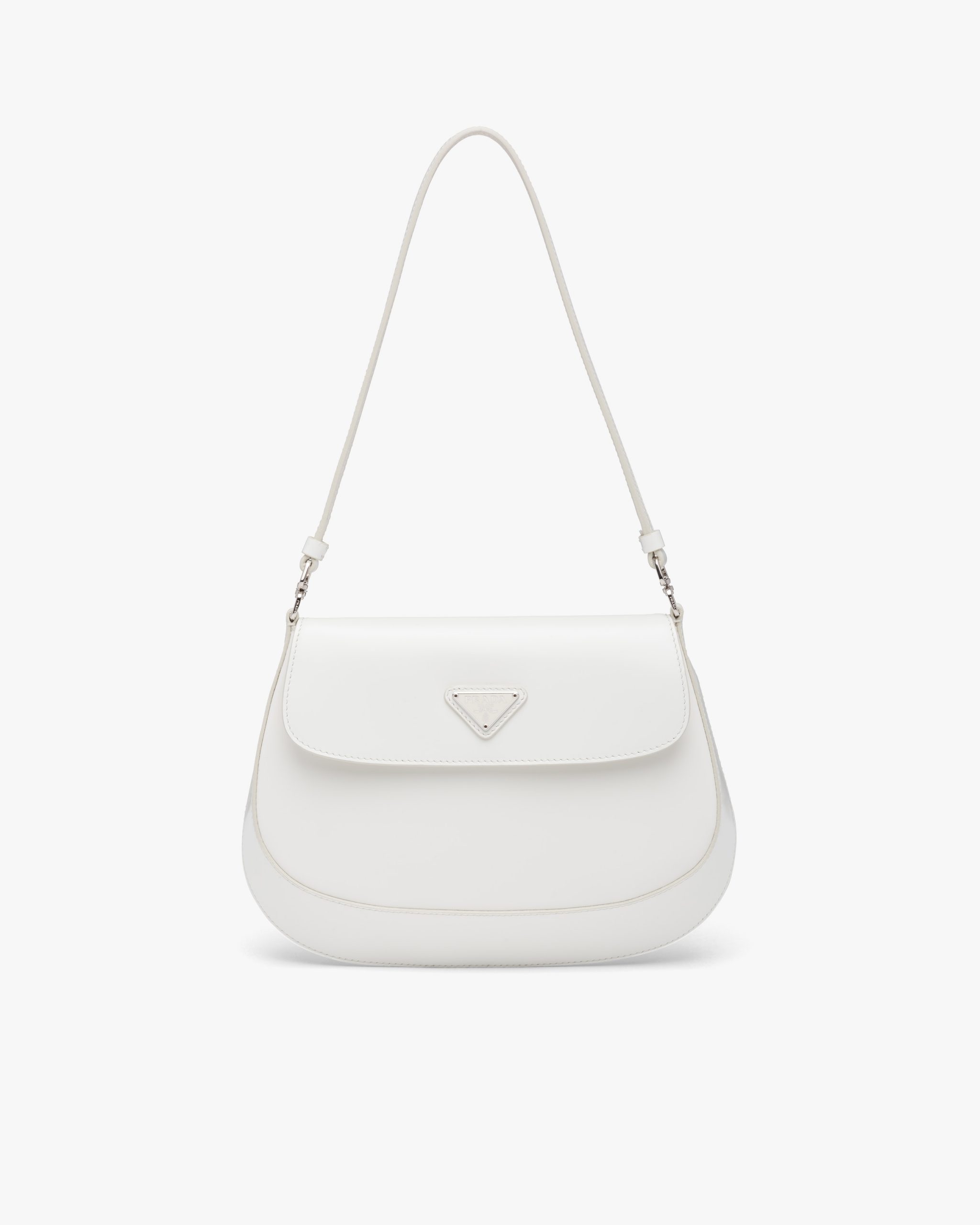 The Prada Cleo bag with sophisticated allure reinterprets an iconic design of the brand from the 1990’s. Sleek curved lines emphasized by the particular construction rounded on the bottom and sides give this flap bag a soft, light look. Brushed leather, a modern and versatile material that is distinctive in Prada collectsions, is ideal for creating always new combinations and contrasts. The enamel triangle logo2 decorates the silhouette.