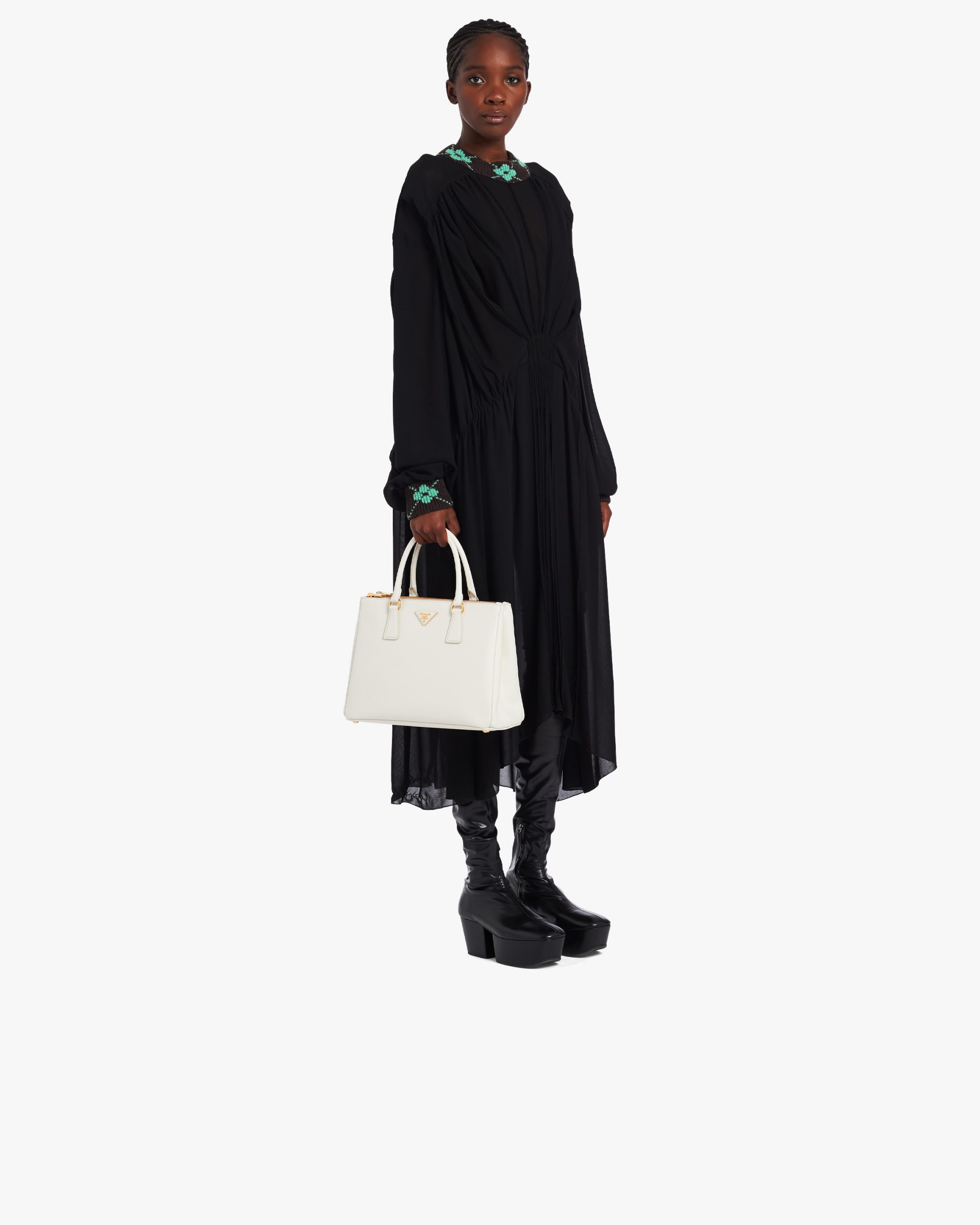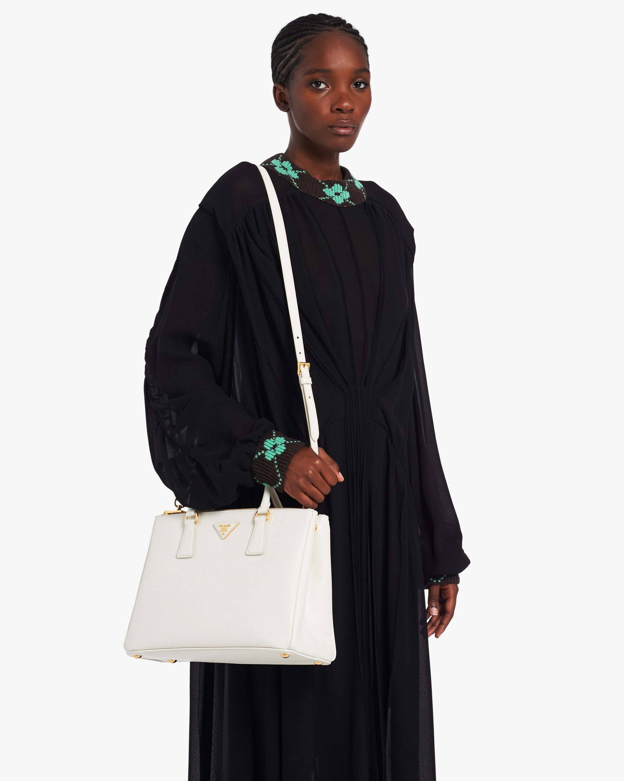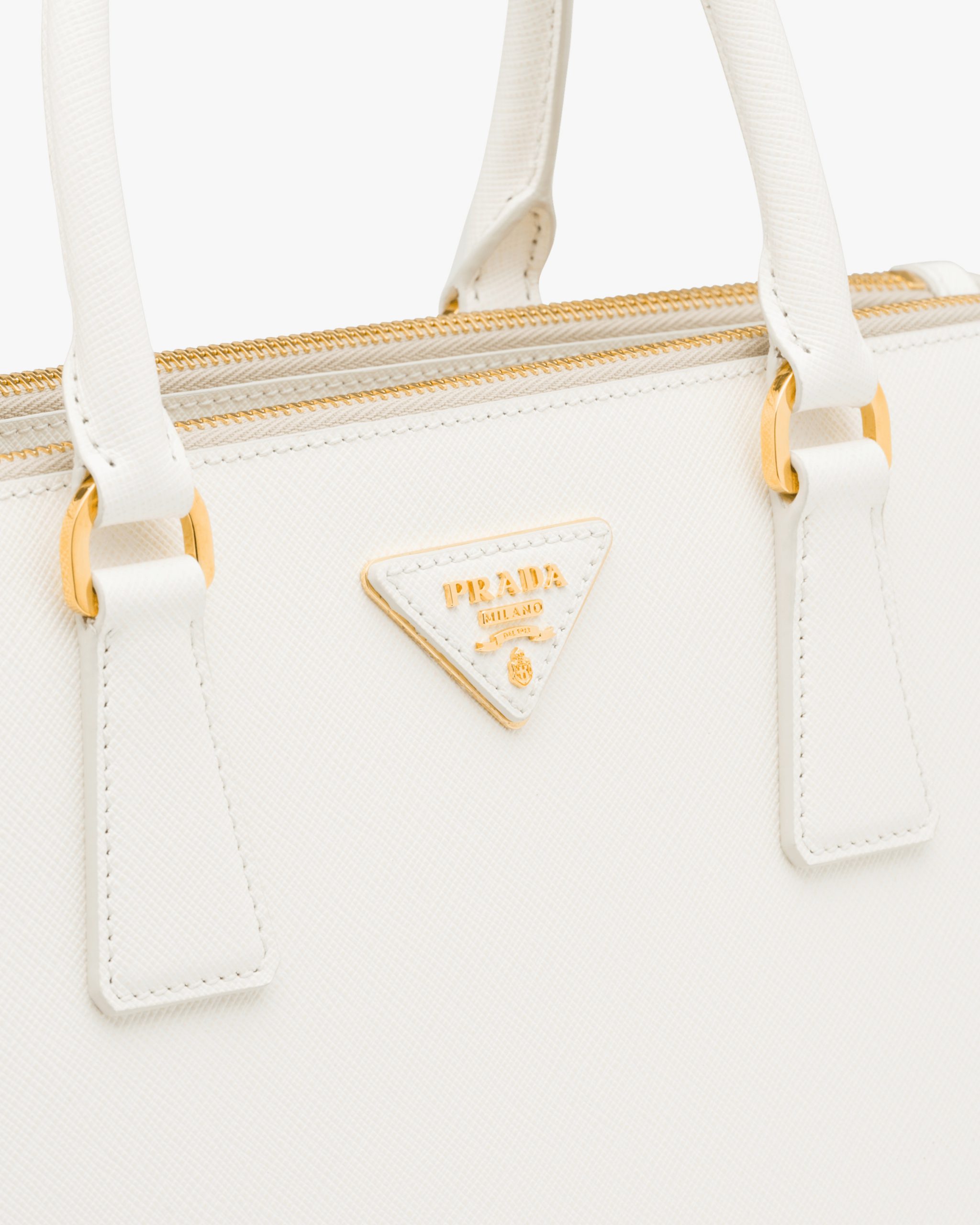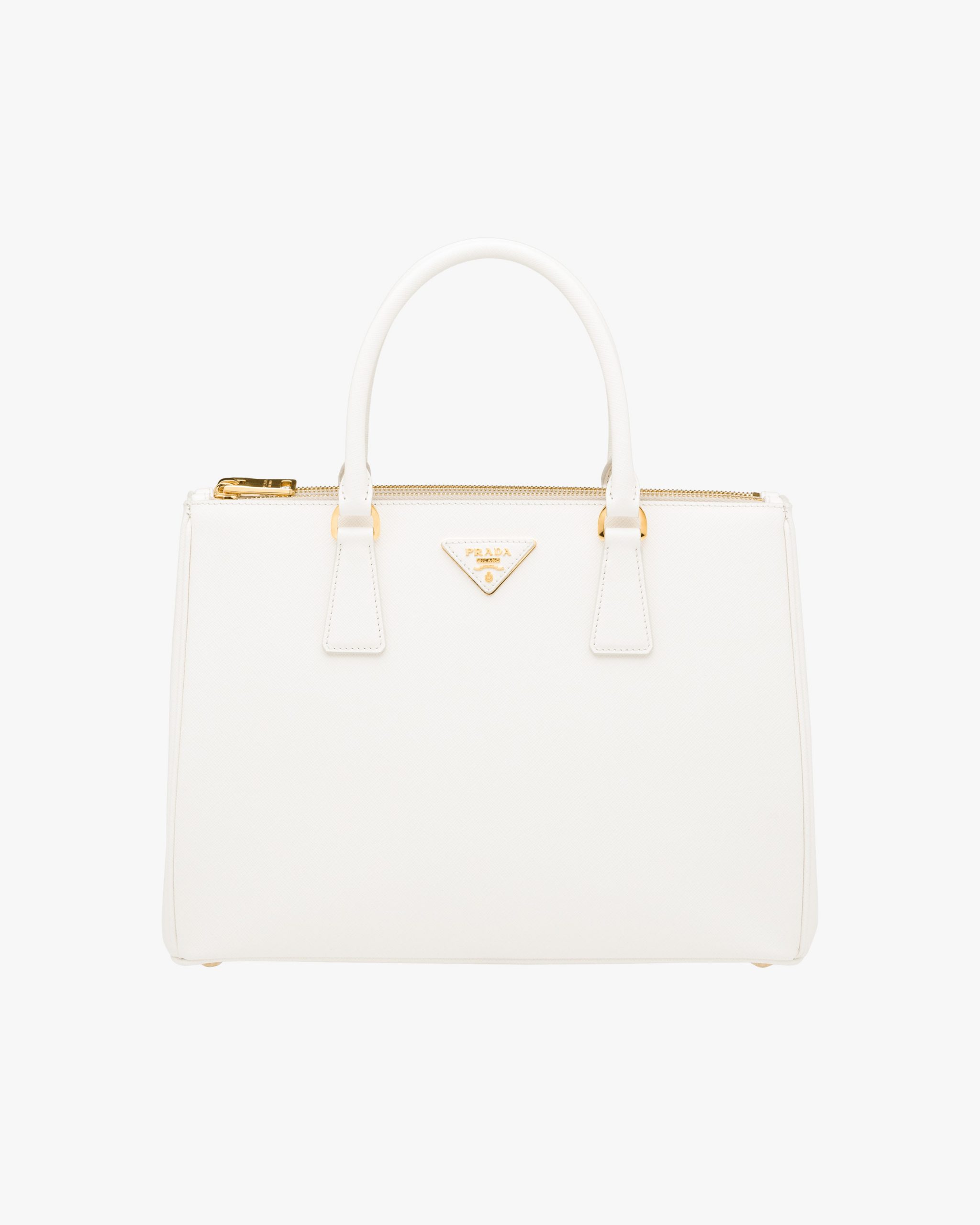 The Prada Galleria bag made of iconic Saffiano leather with a crosshatch texture is characterized by its sophisticated simplicity. The double handle and detachable shoulder strap allow the accessory to be worn as a crossbody bag or handbag. Decorated with the logo2 on a leather triangle and gold-tone metal hardware, the accessory is the quintessence of timeless elegance, bearing the name of the historic Prada store that Mario Prada opened back in 1913 in Galleria Vittorio Emanuele II in Milan.