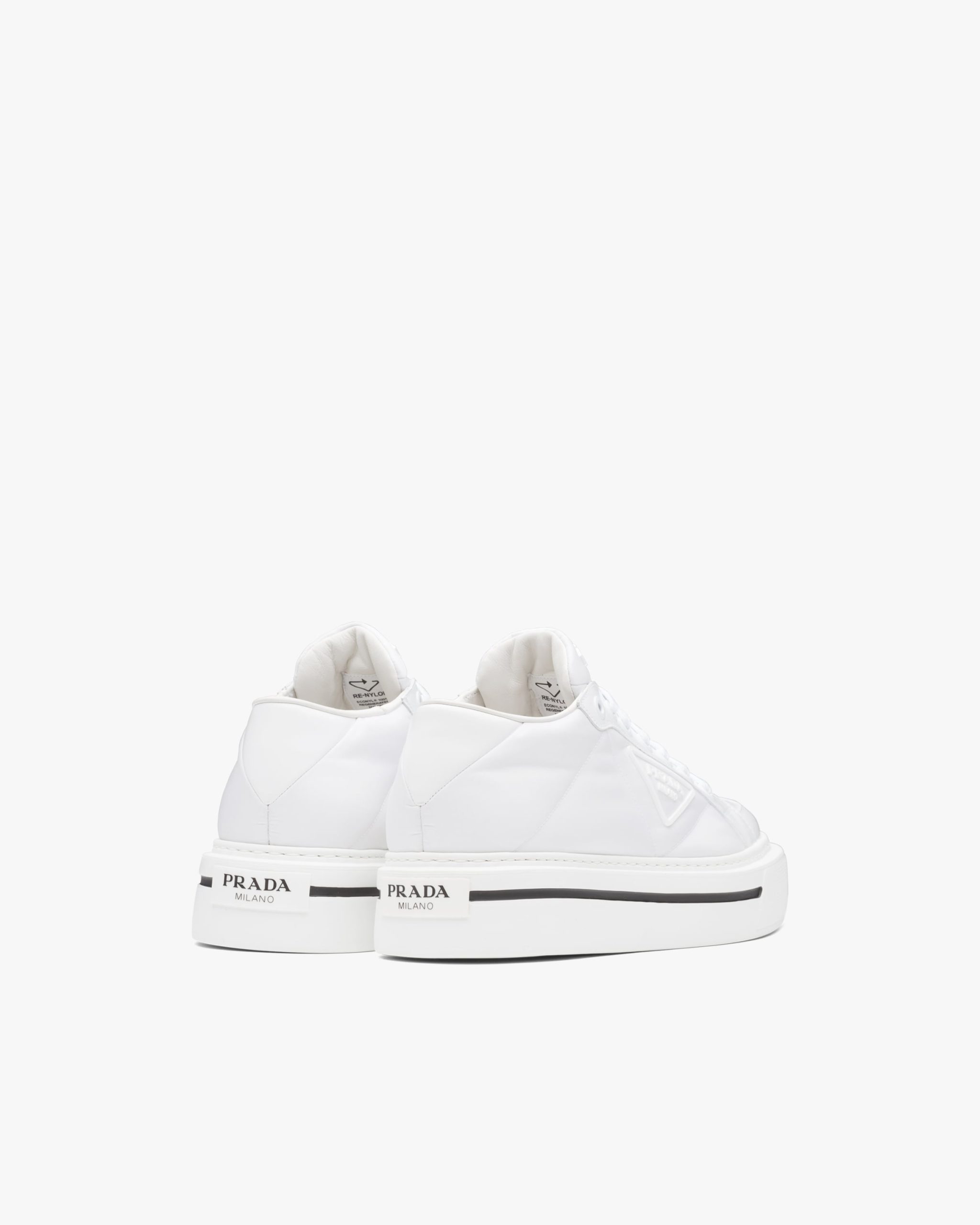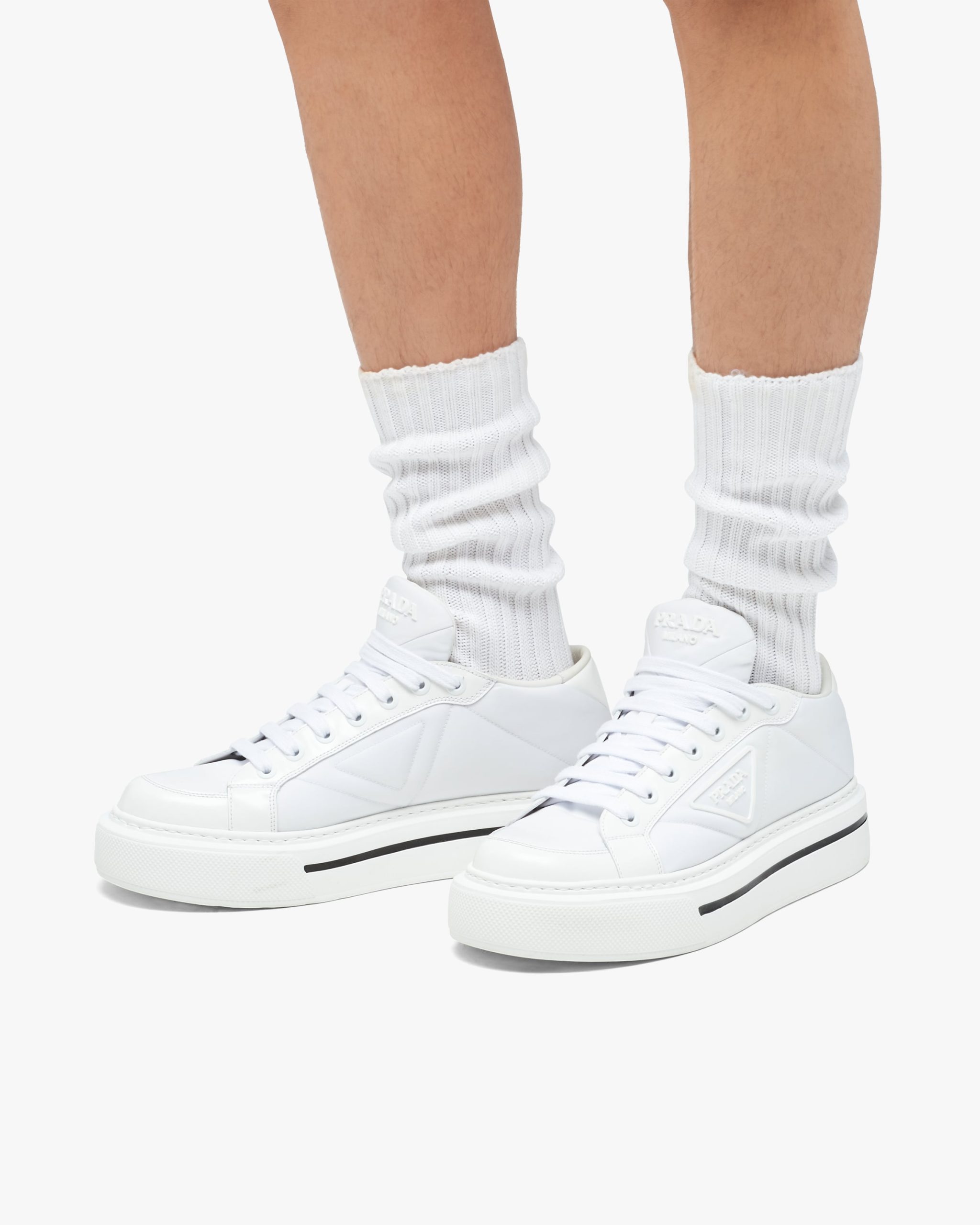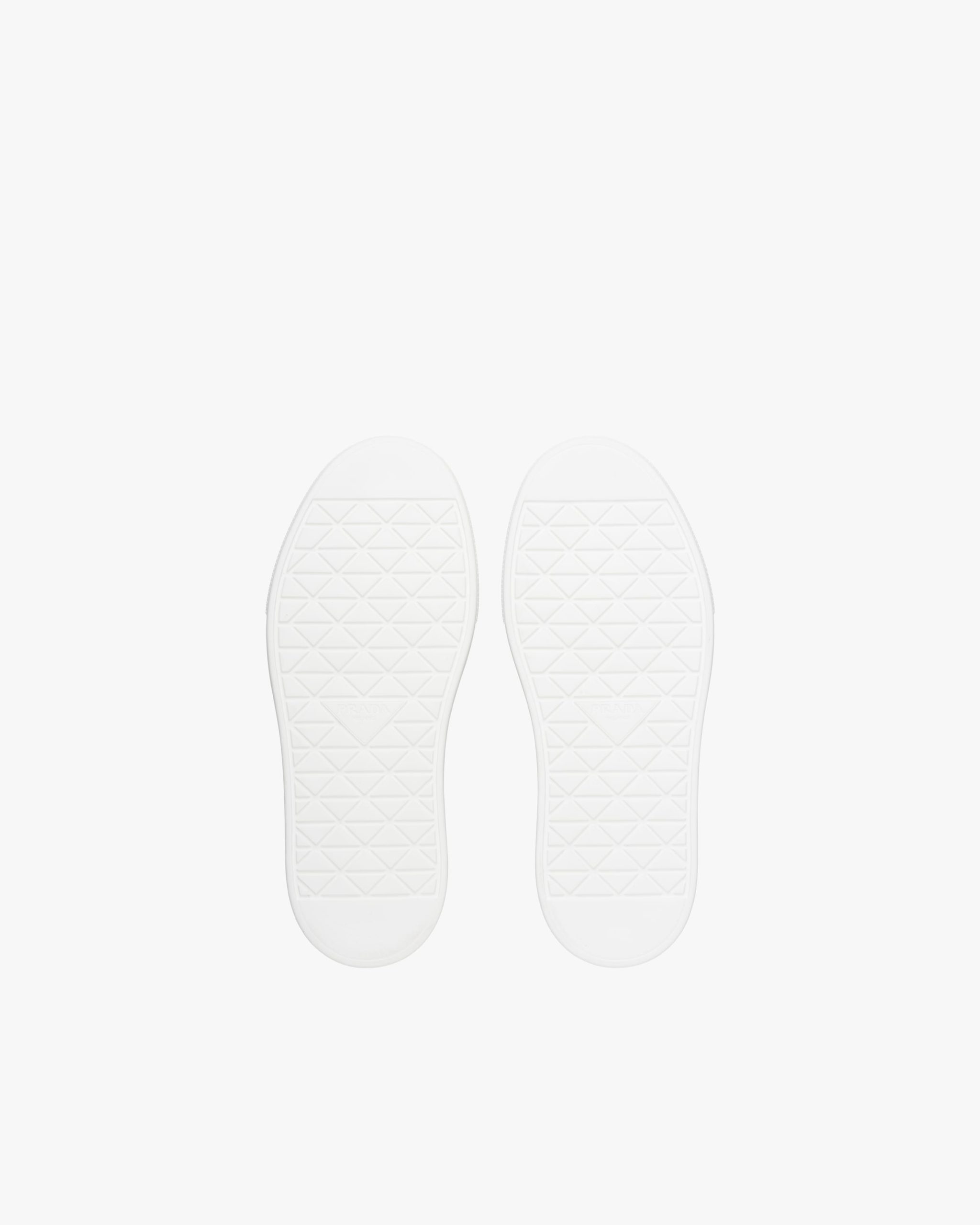 Defined by a design with a lightweight sole and rubber triangle logo2, these high-top sneakers are characterized by a mix of iconic Prada materials: brushed leather and Re-Nylon, made from recycled and purified plastic trash collectsed in oceans, fishing nets and textile waste fibers.