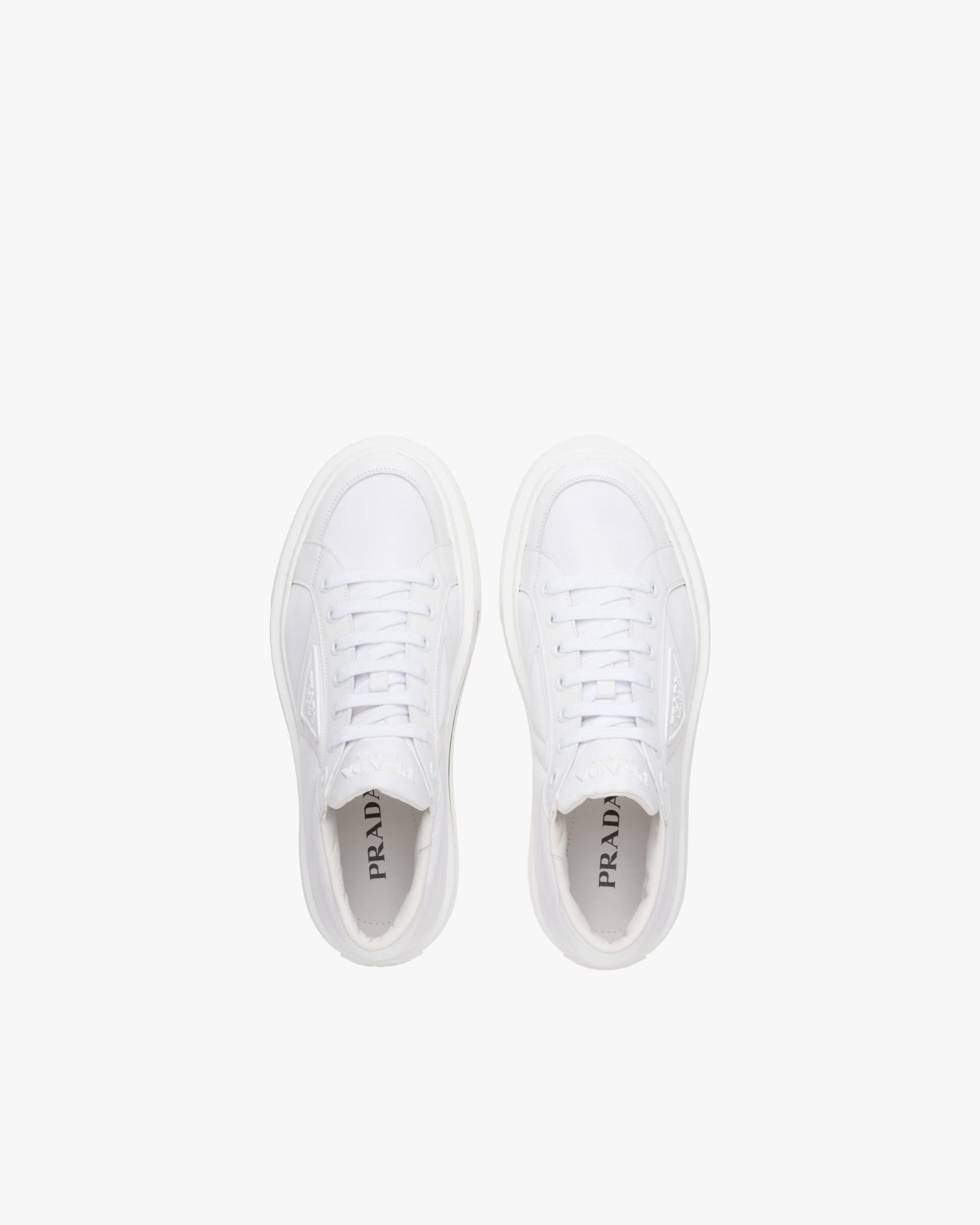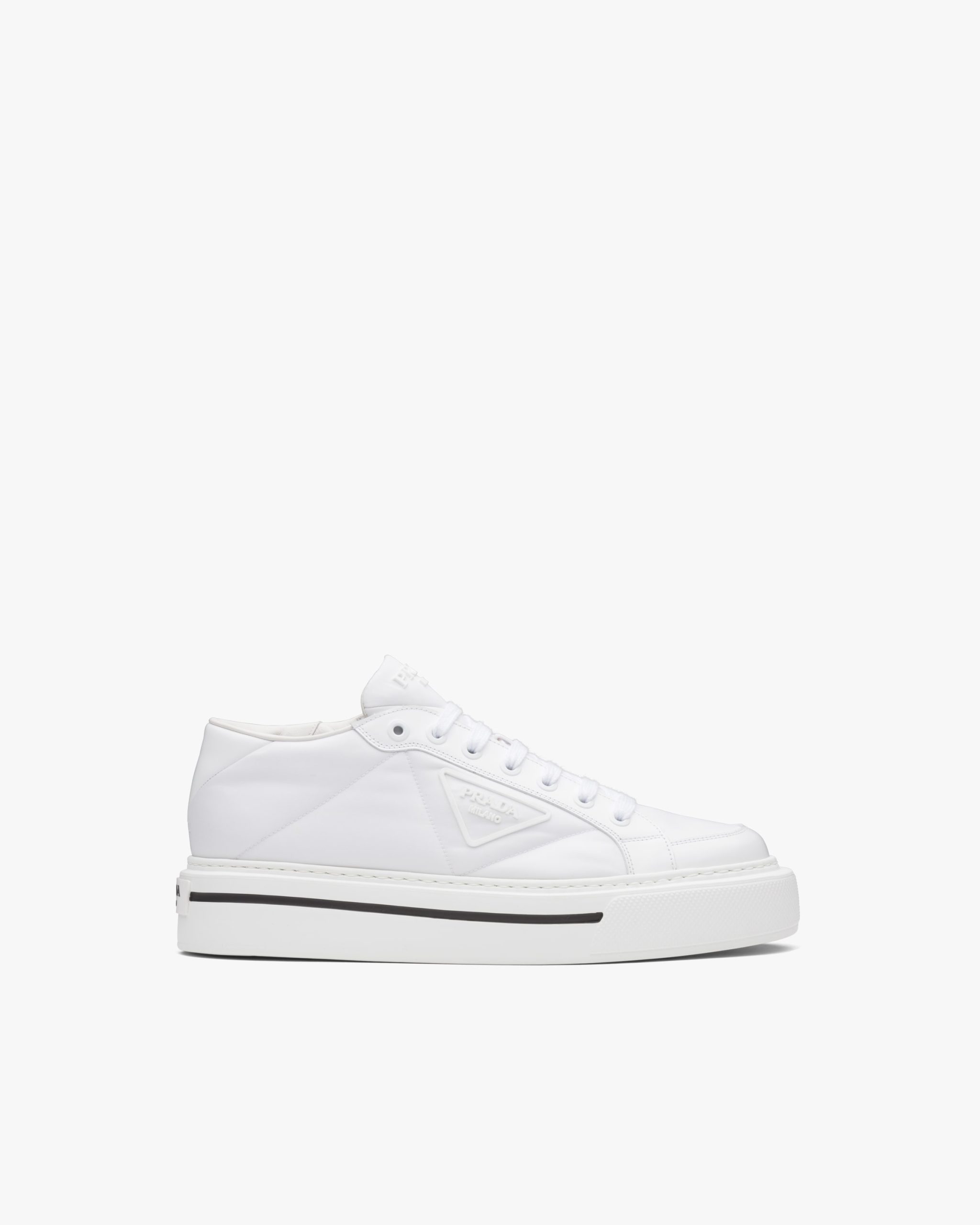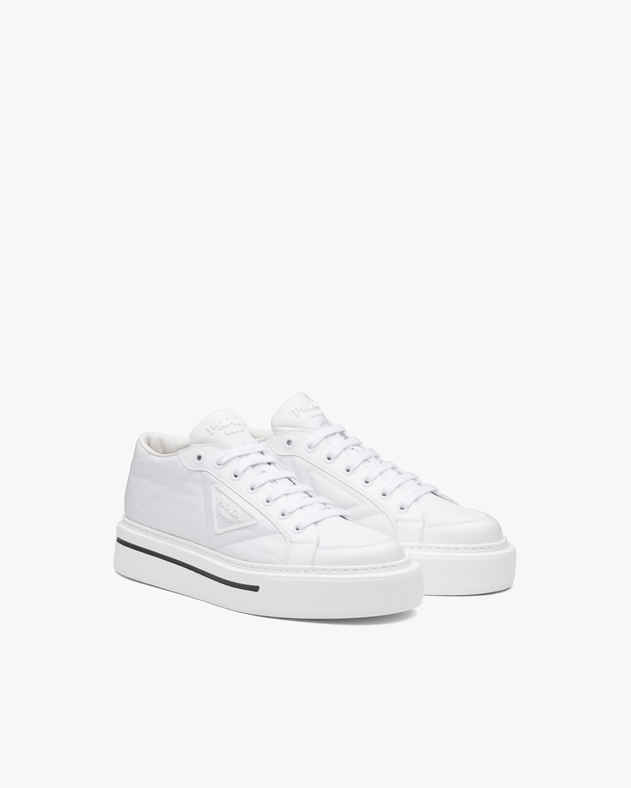 Defined by a design with a lightweight sole and rubber triangle logo2, these high-top sneakers are characterized by a mix of iconic Prada materials: brushed leather and Re-Nylon, made from recycled and purified plastic trash collectsed in oceans, fishing nets and textile waste fibers.