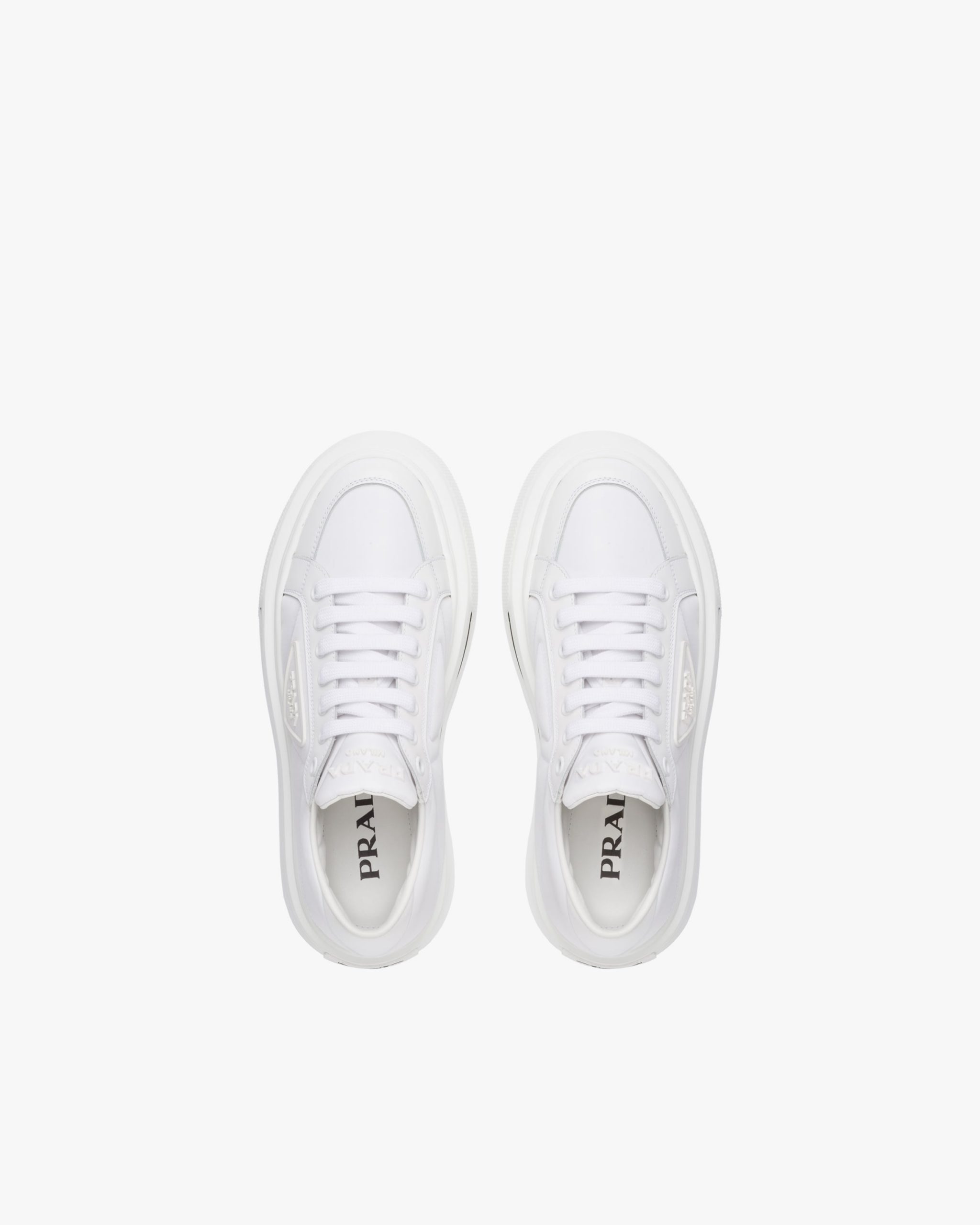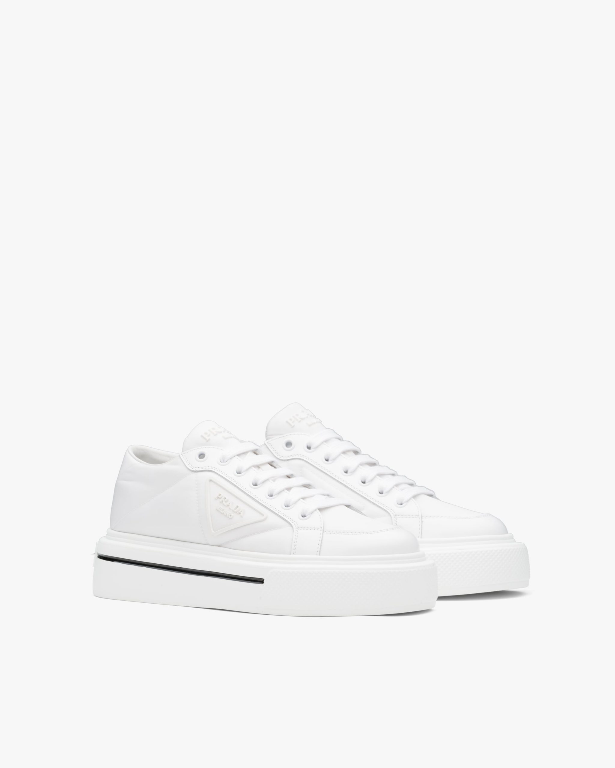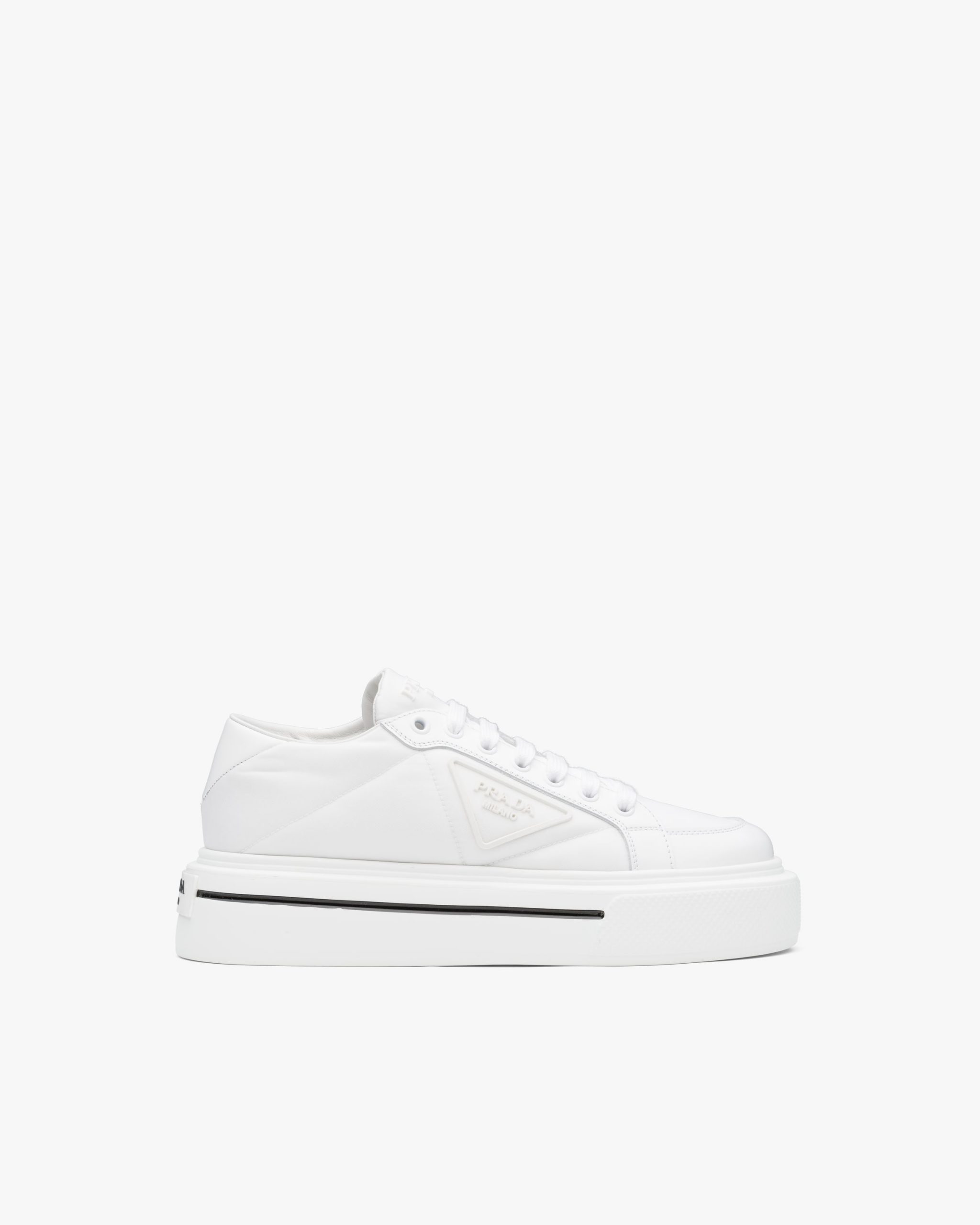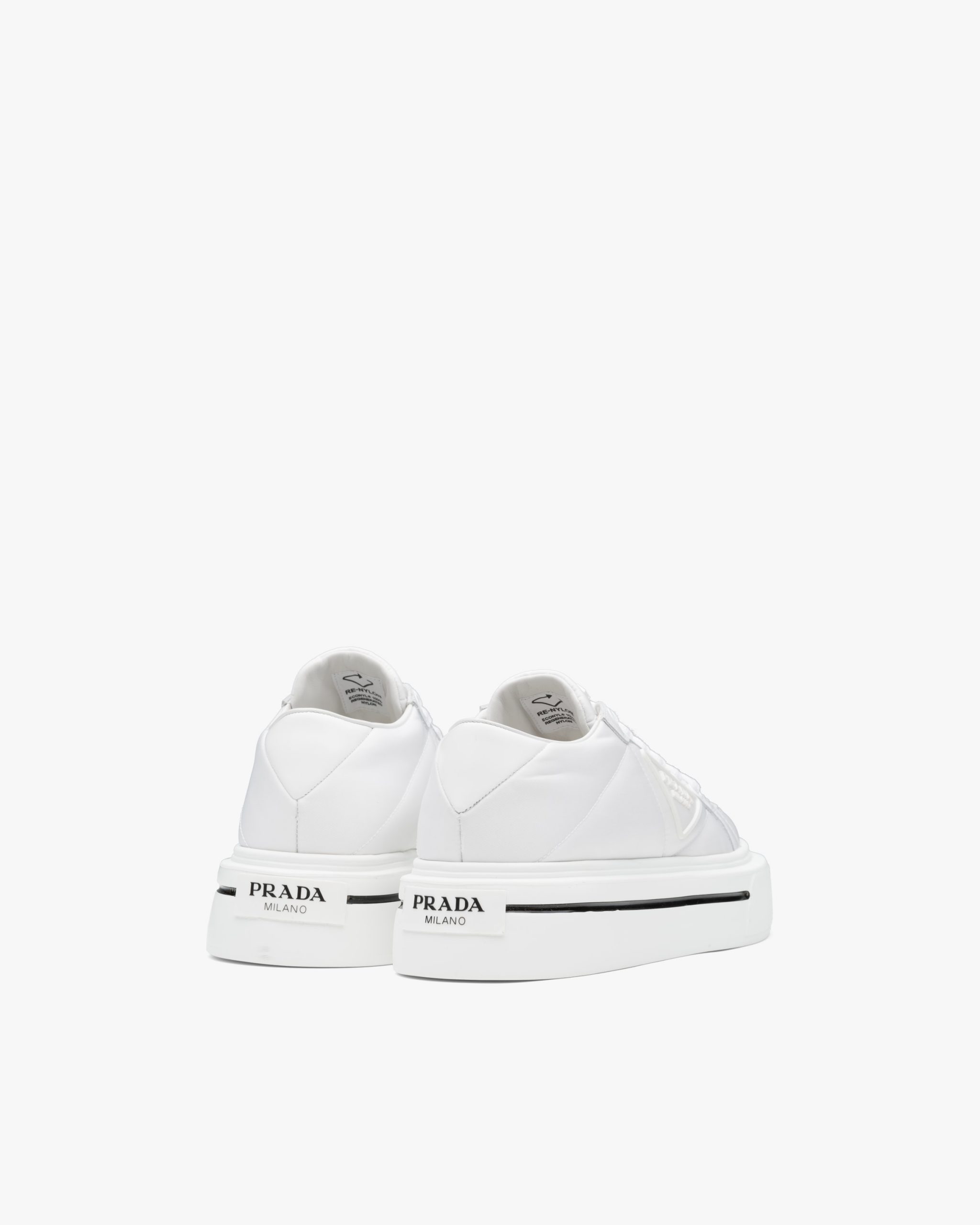 Defined by their thick platform sole, these sneakers combine brushed leather and Re-Nylon: a regenerated nylon yarn (ECONYL?)produced from recycled, purified plastic trash collectsed in the ocean, fishing nets and textile waste fibers.